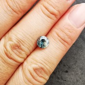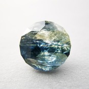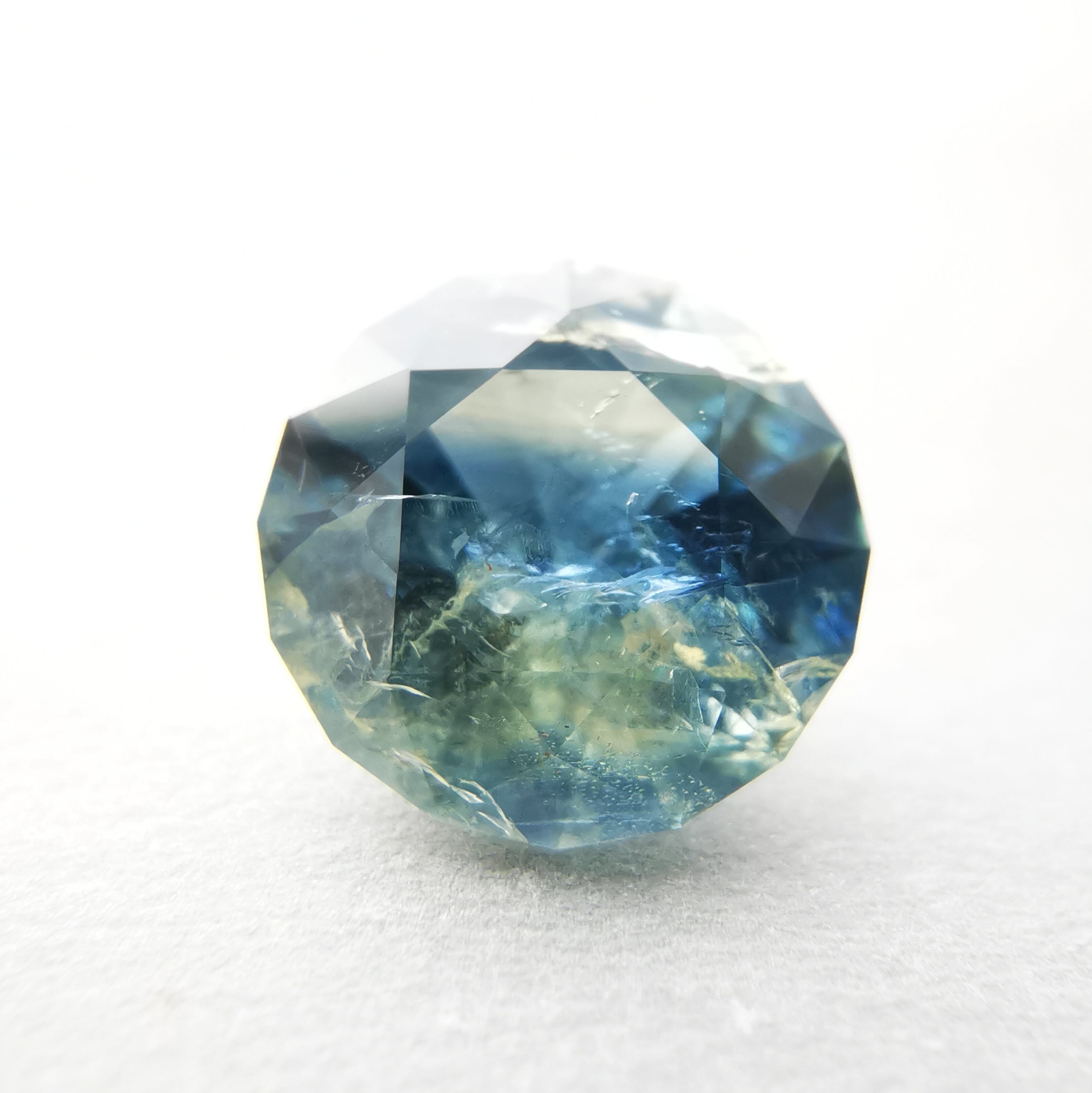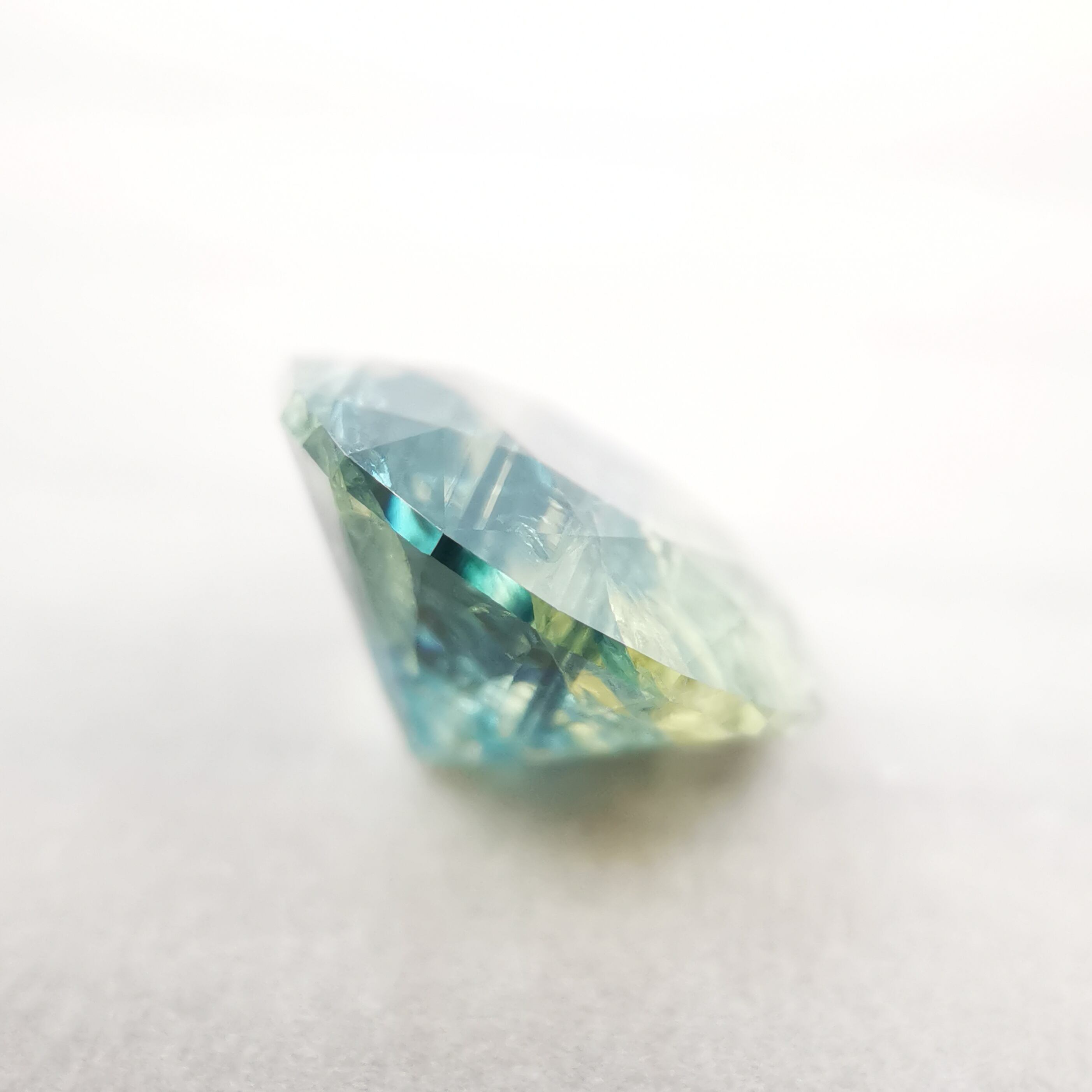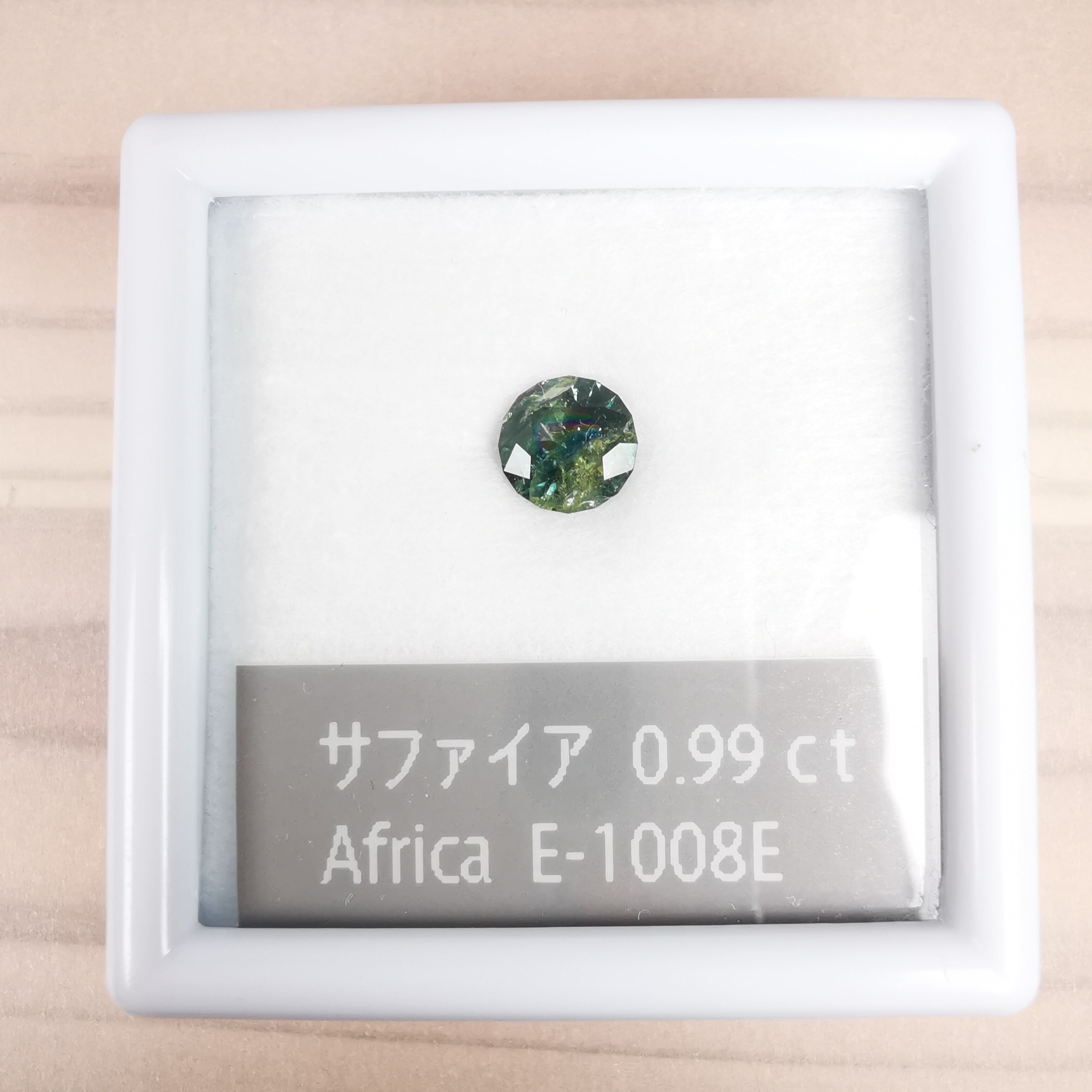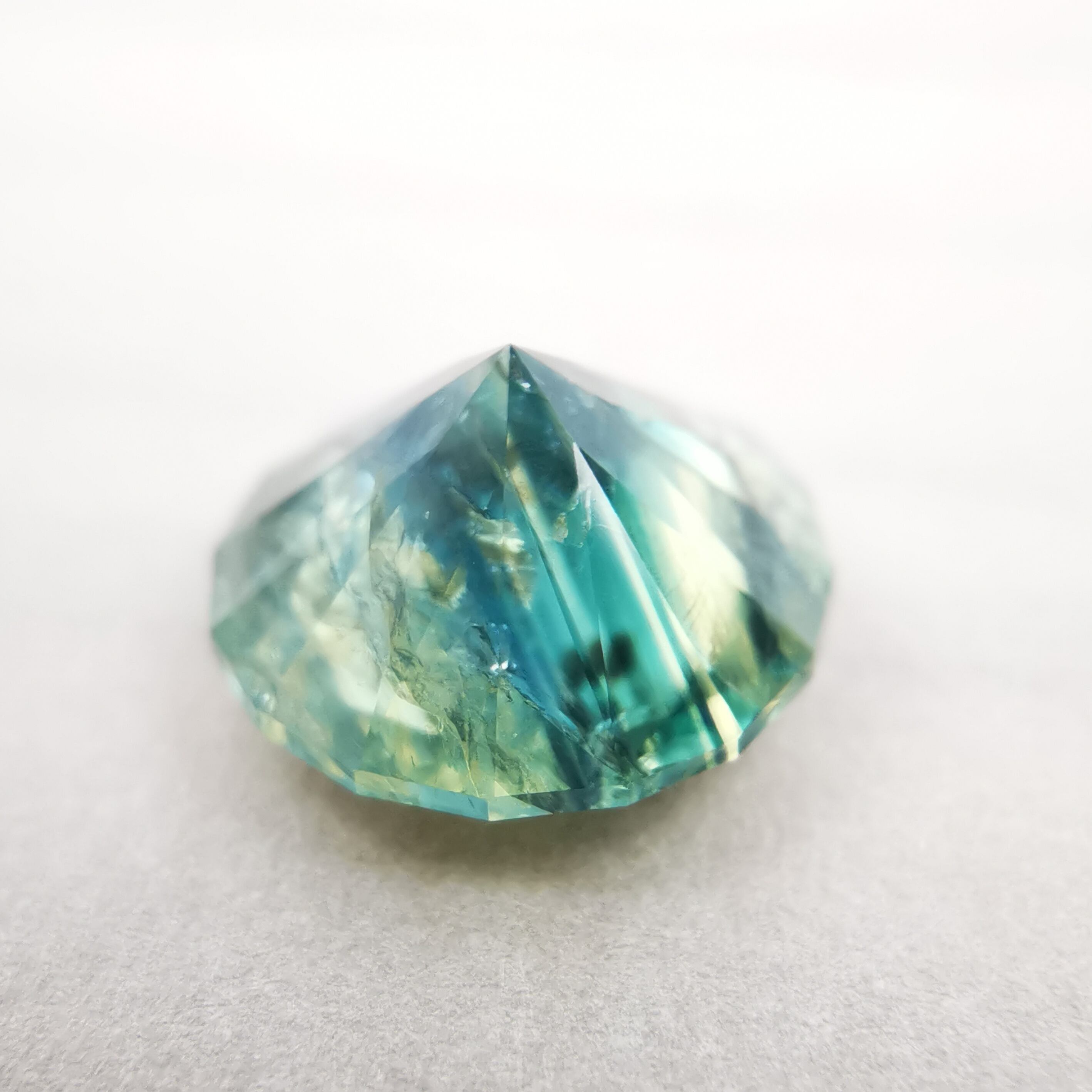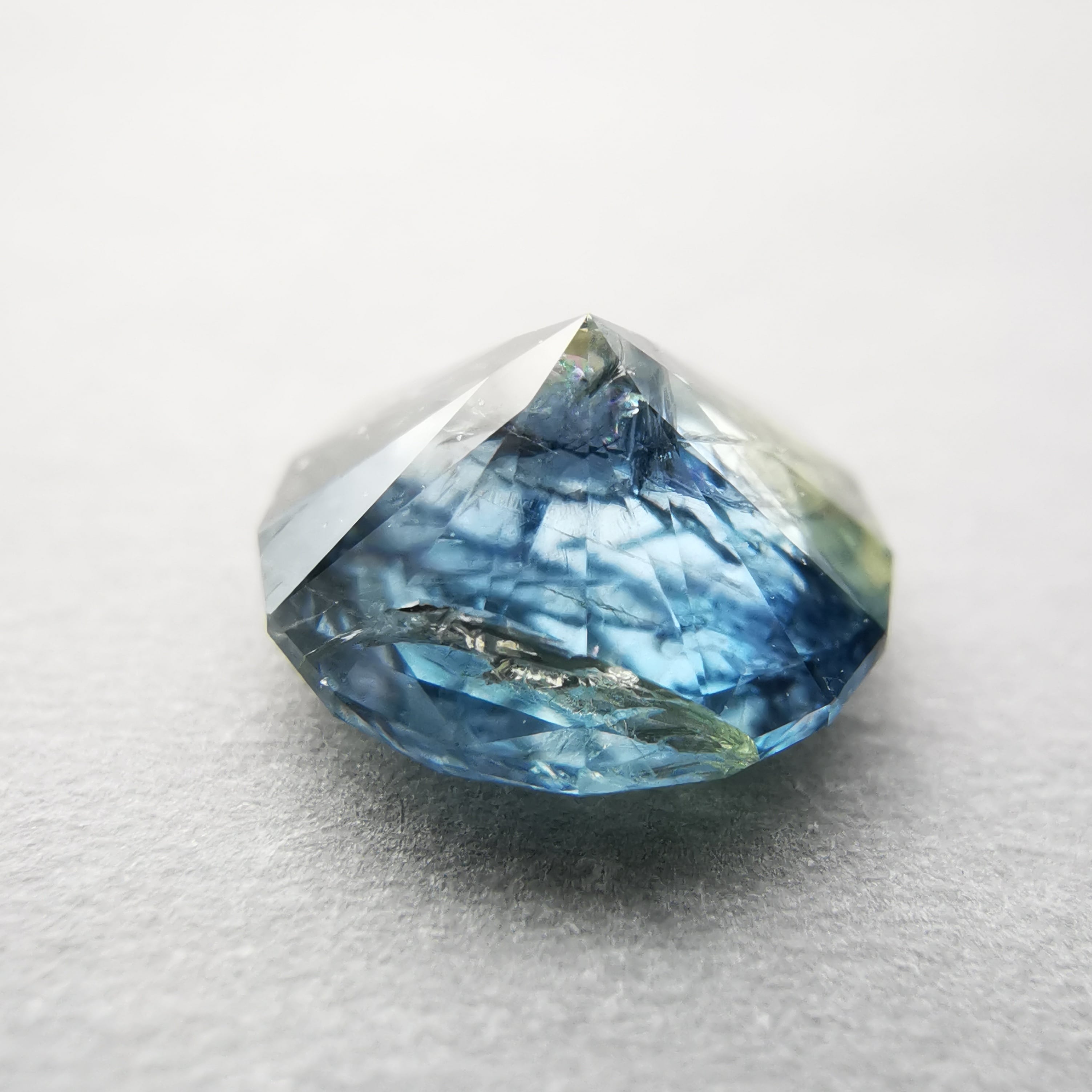 様々なインクルージョンがたっぷりと入った淡いイエローのサファイアに、ざざざっと大きくブルーグリーンのカラーバンドが入りました。