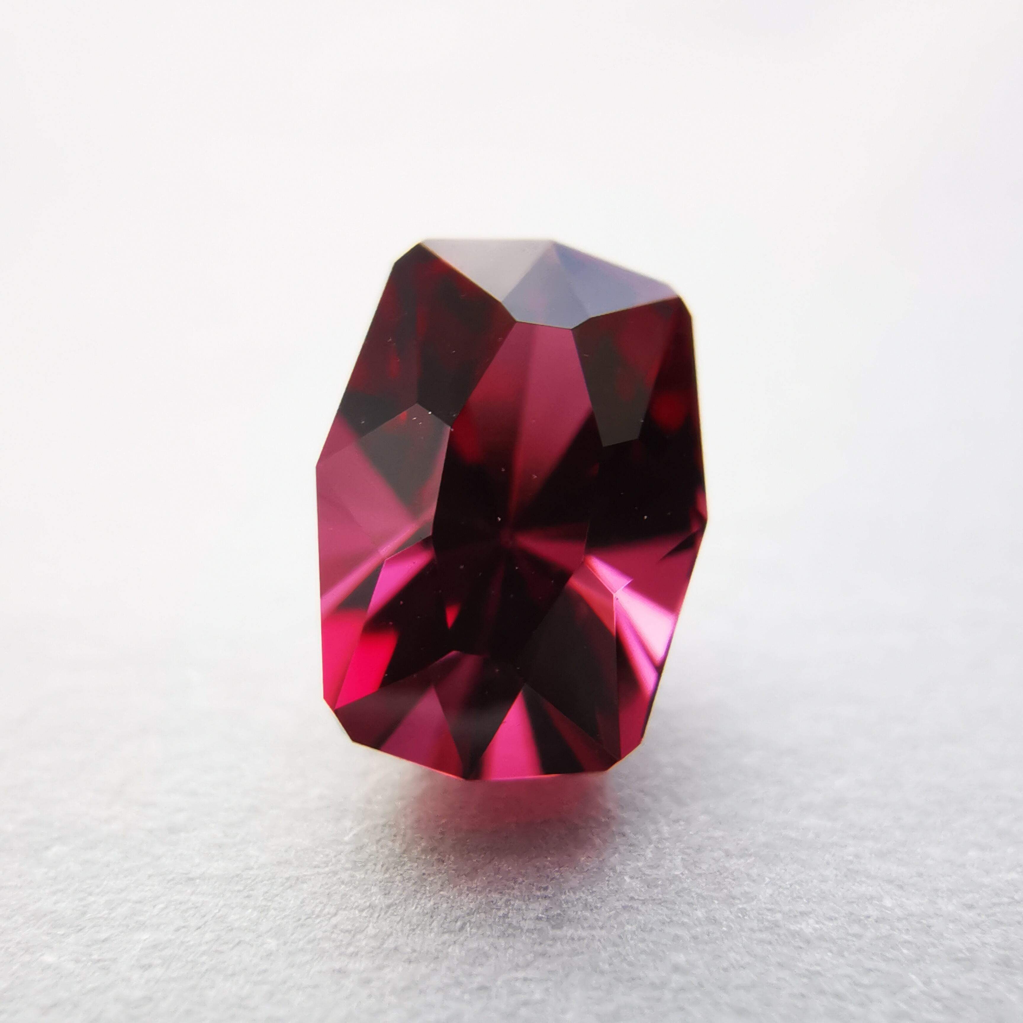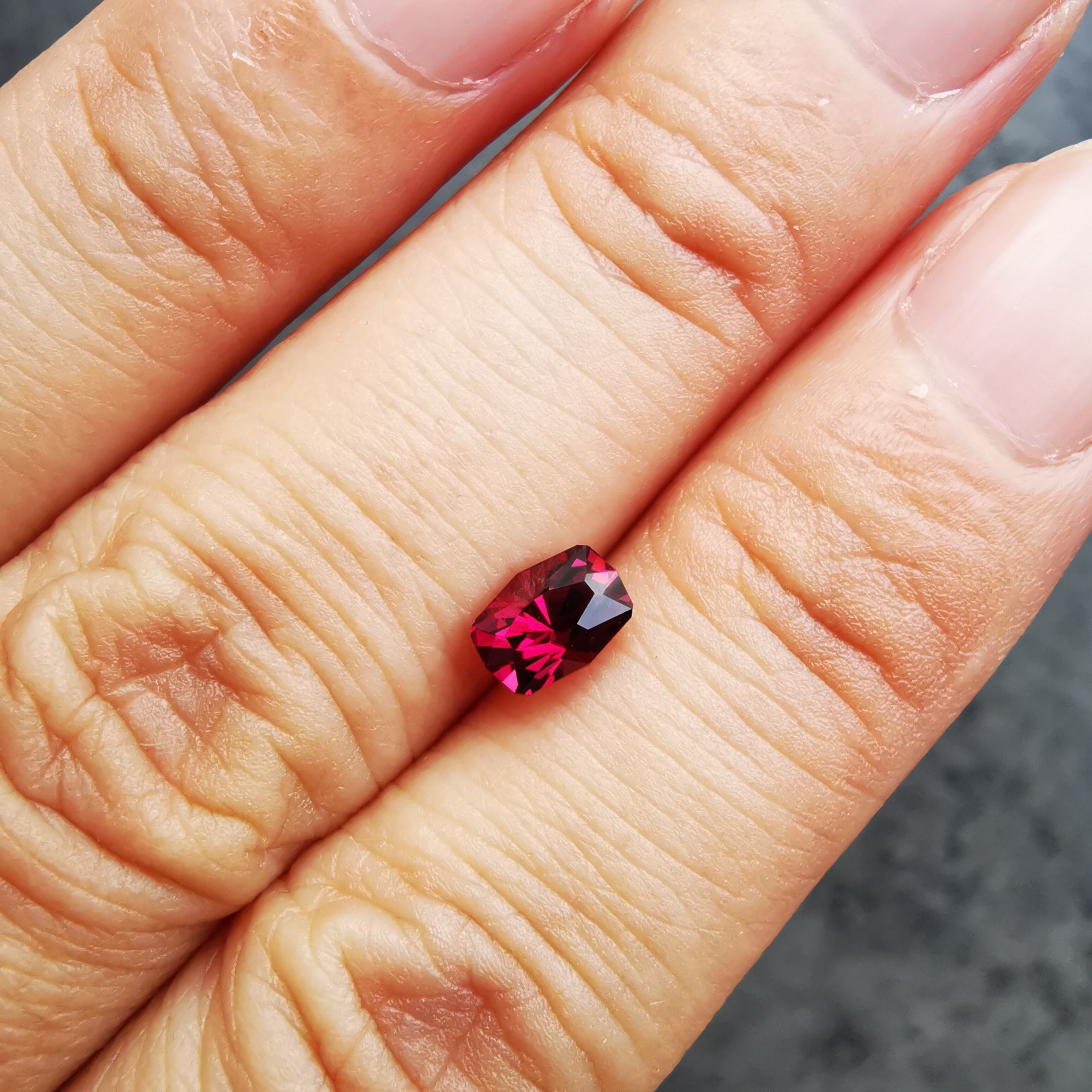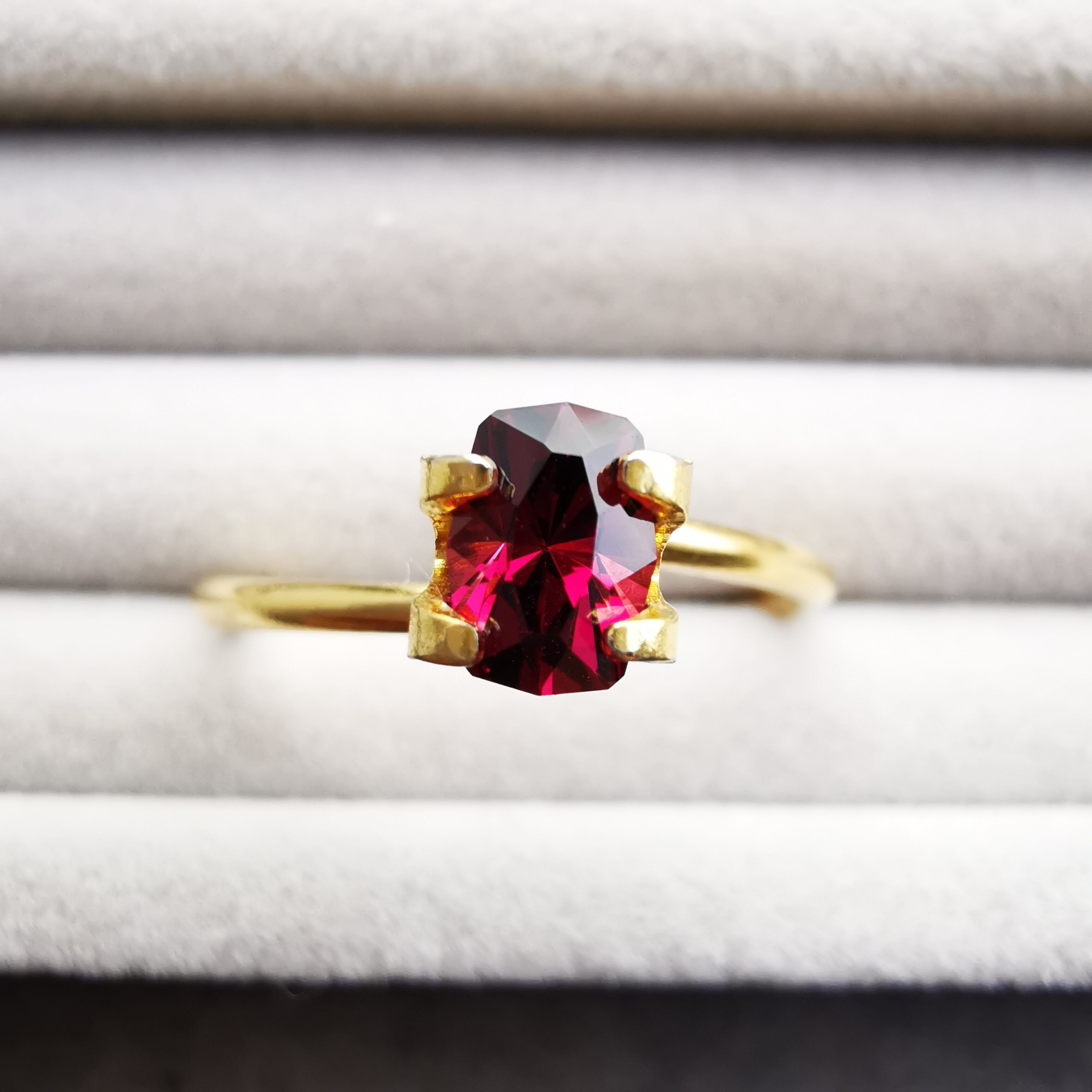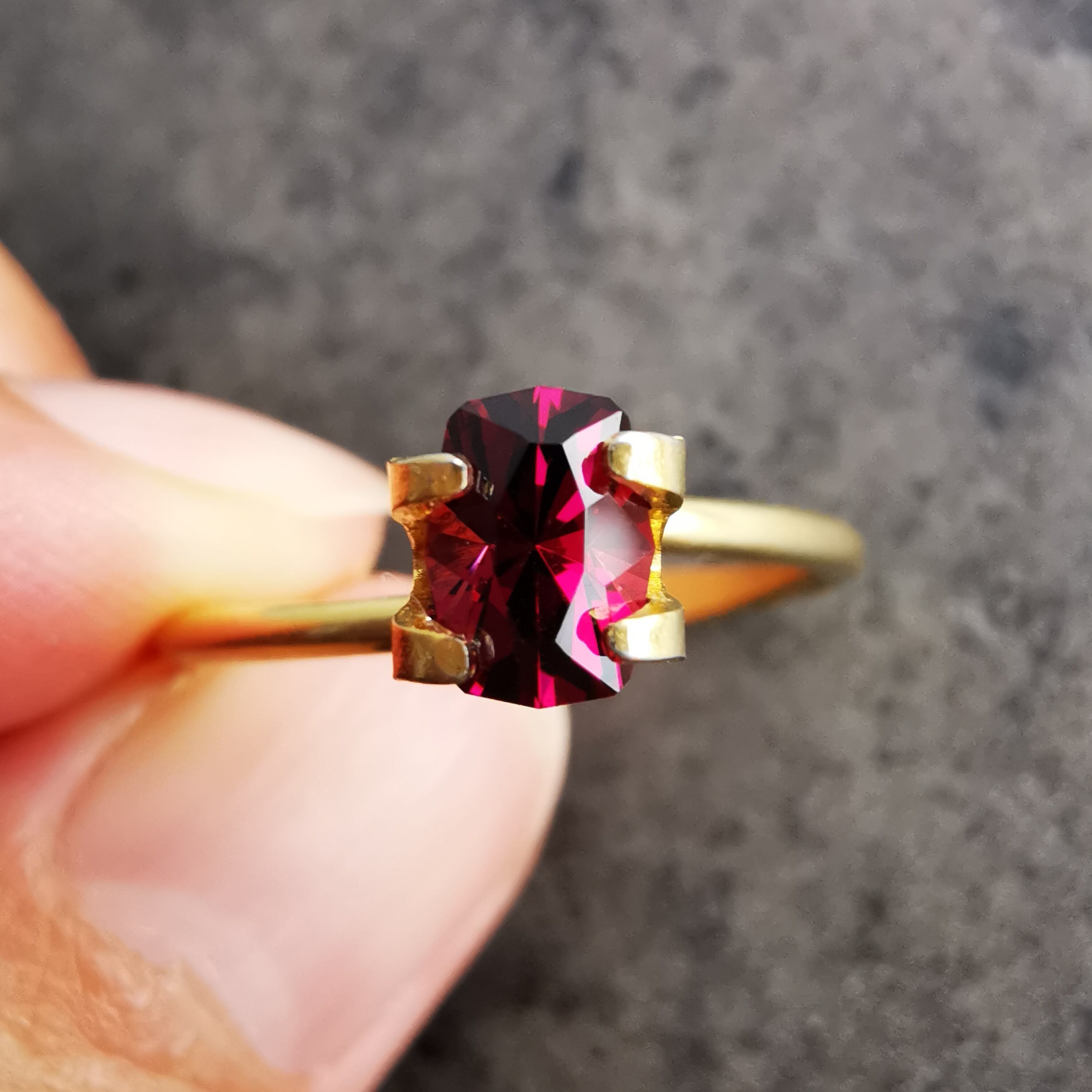 きらめくローズレッドが暗めの石の中から湧き上がるロードライトガーネットです。
