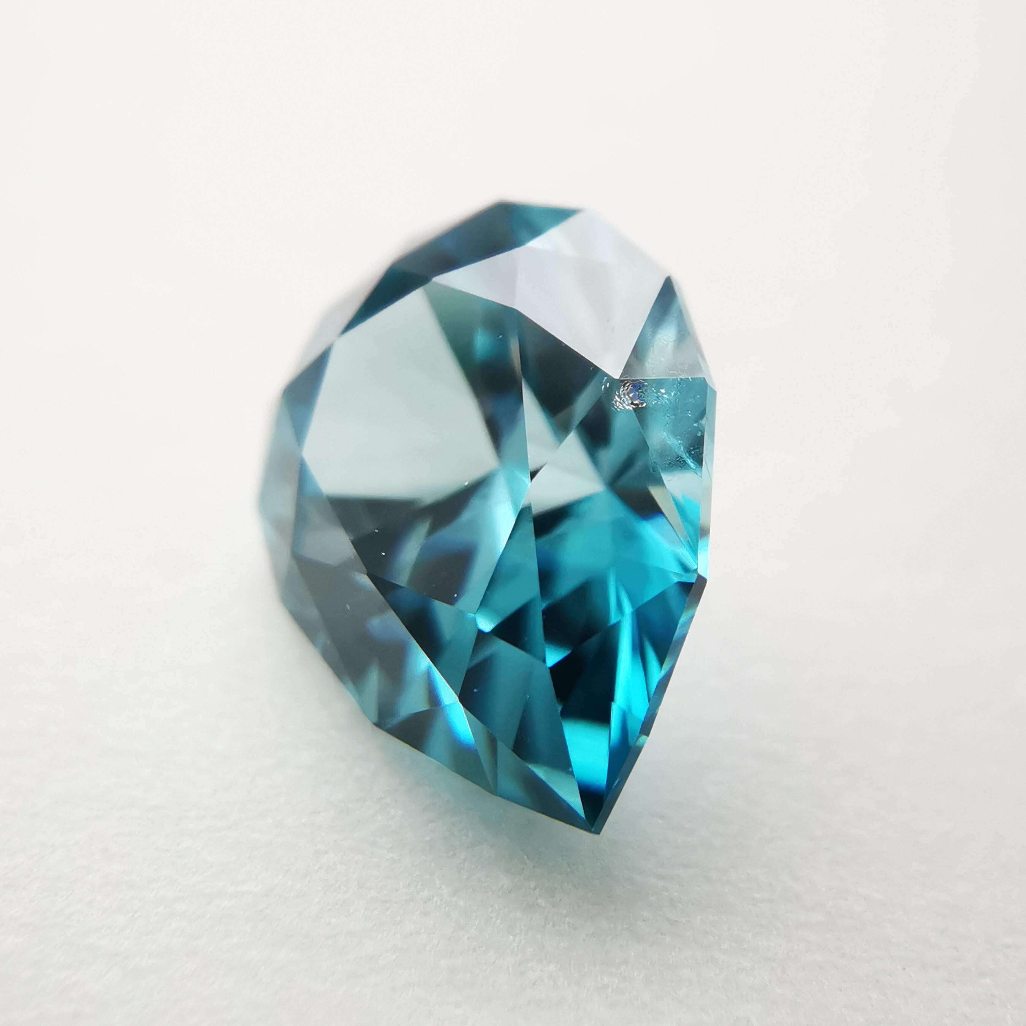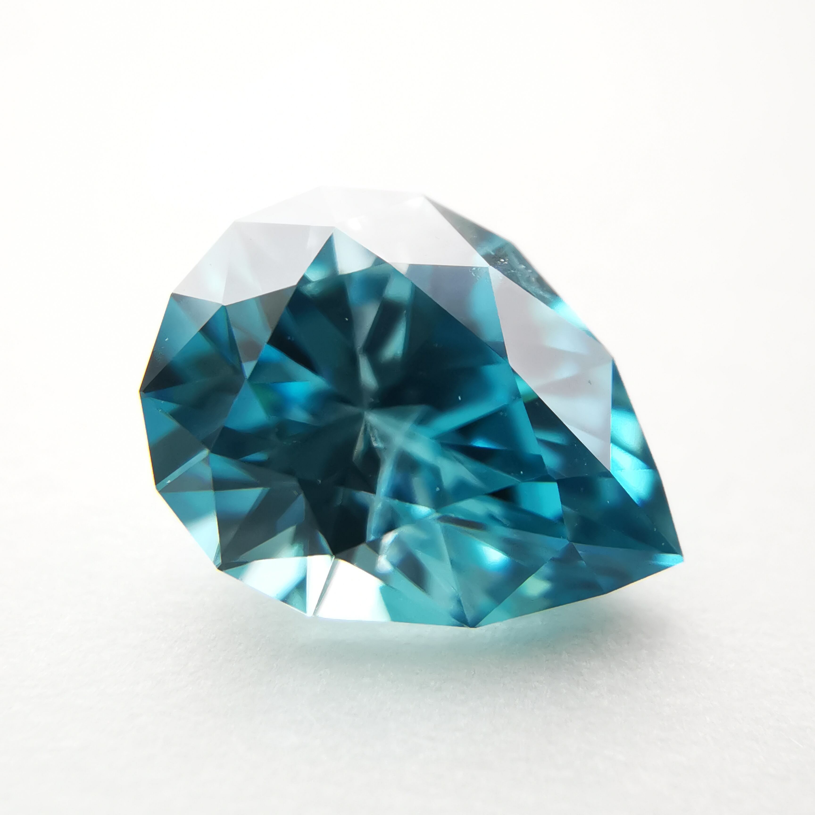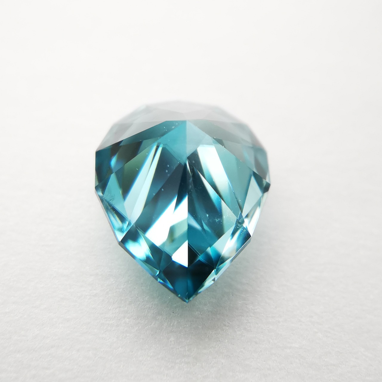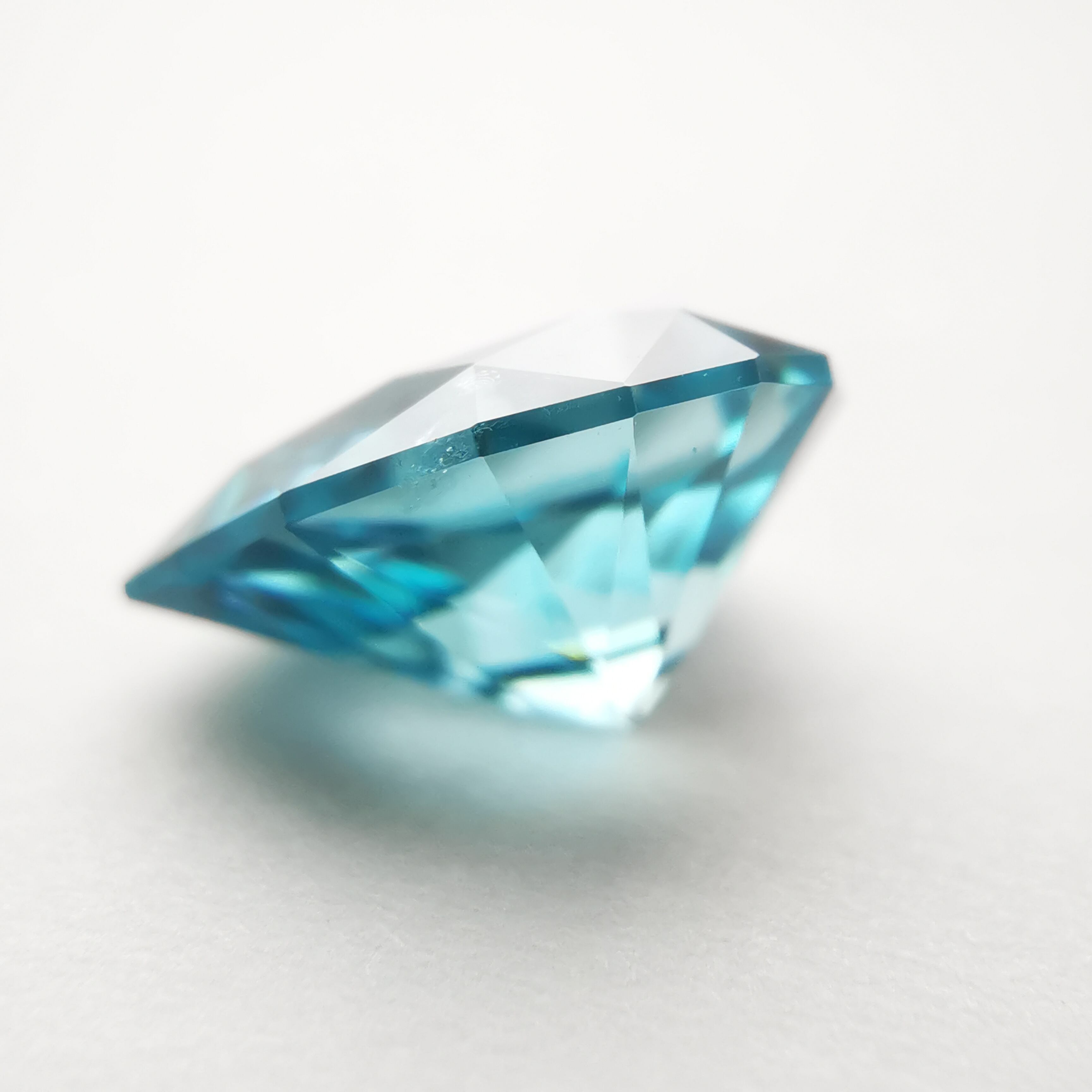 ジルコンらしい南国の海の色、ペアシェイプの先端とおしりの右側に色だまりがあります。