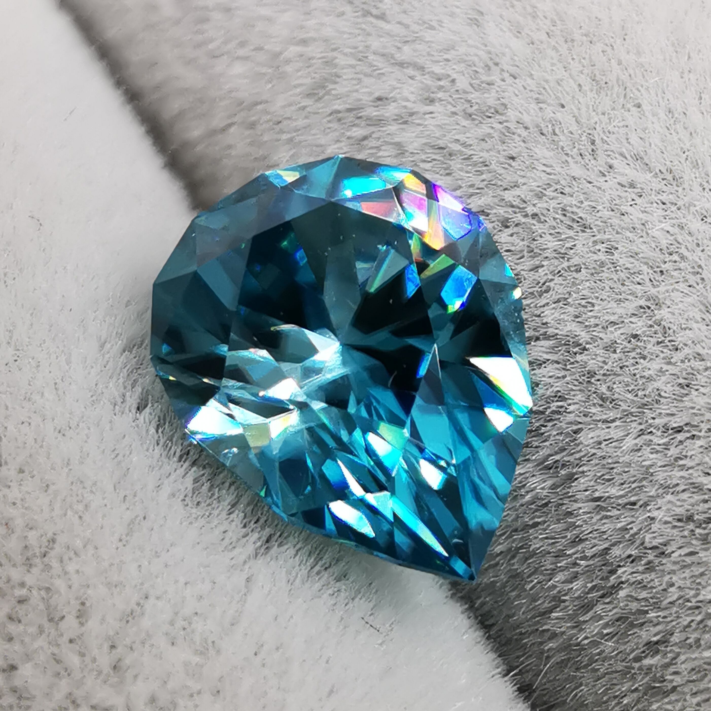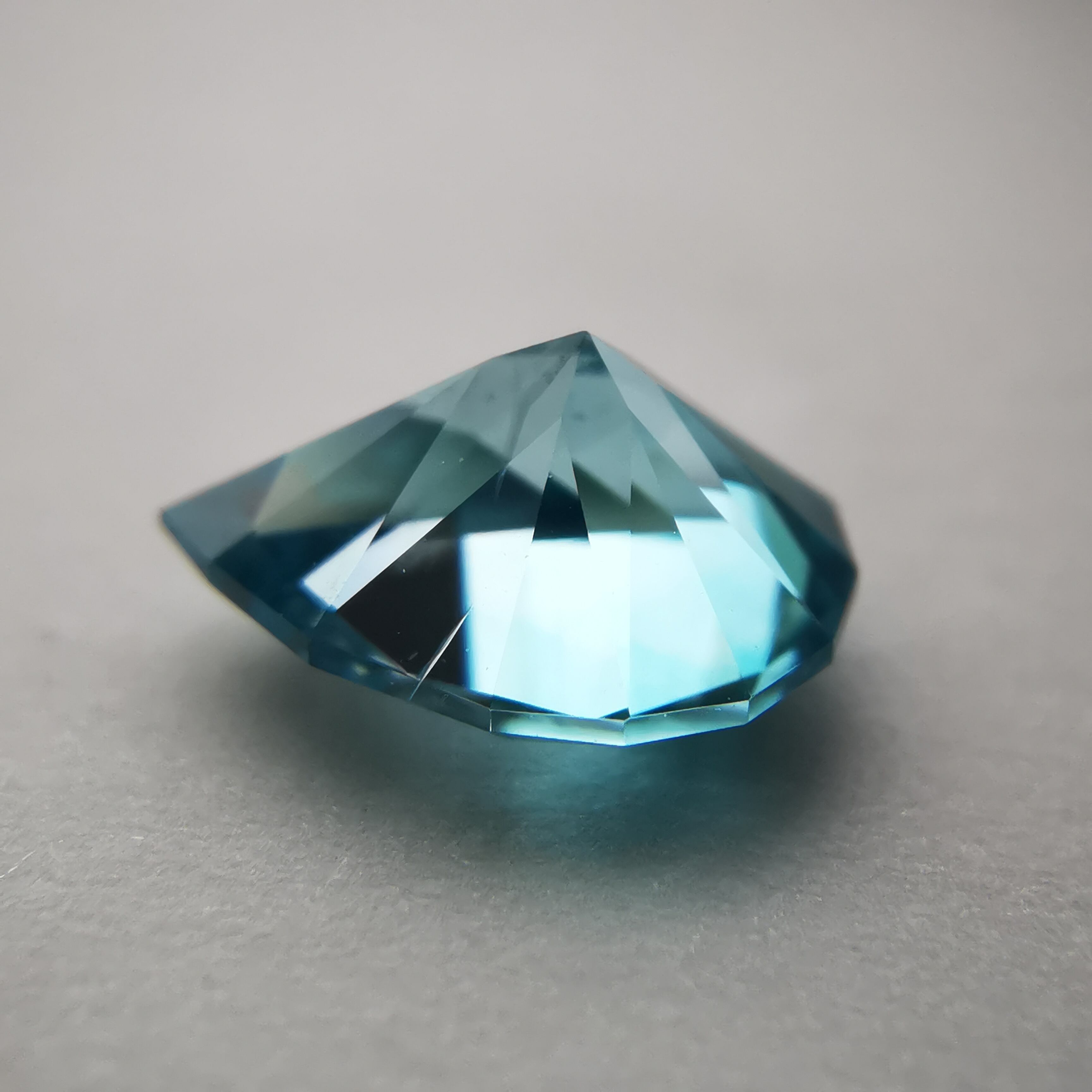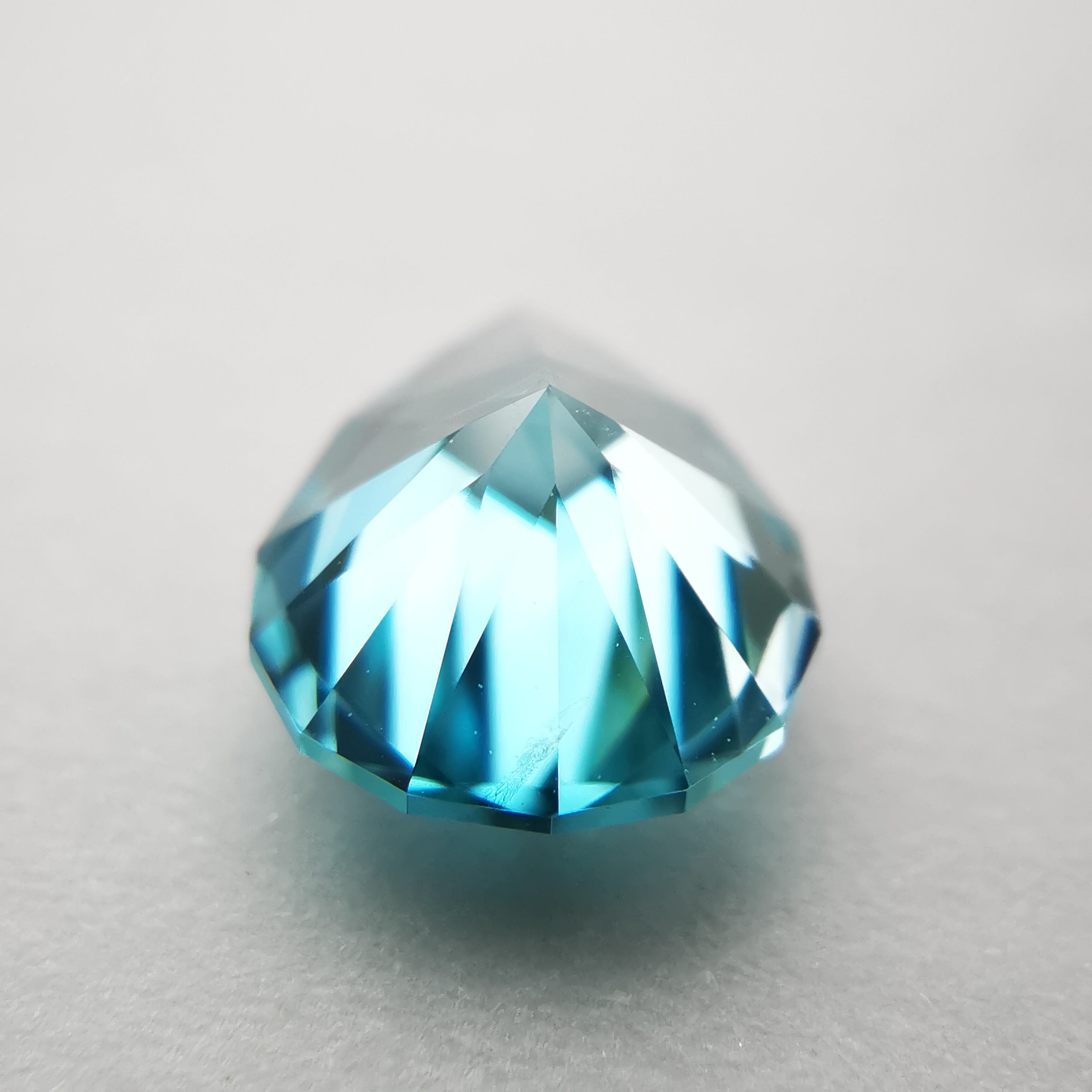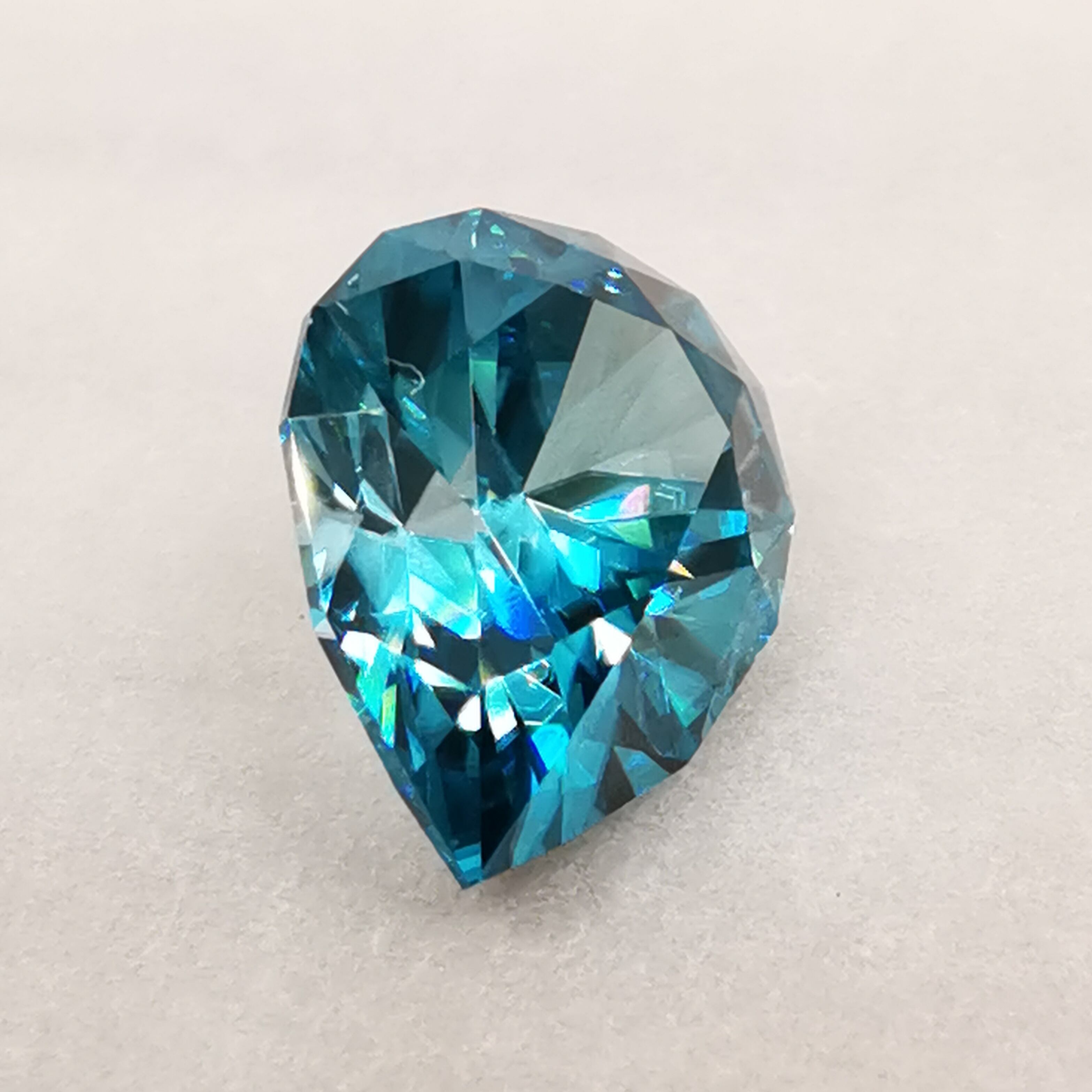 ジルコンらしい南国の海の色、ペアシェイプの先端とおしりの右側に色だまりがあります。