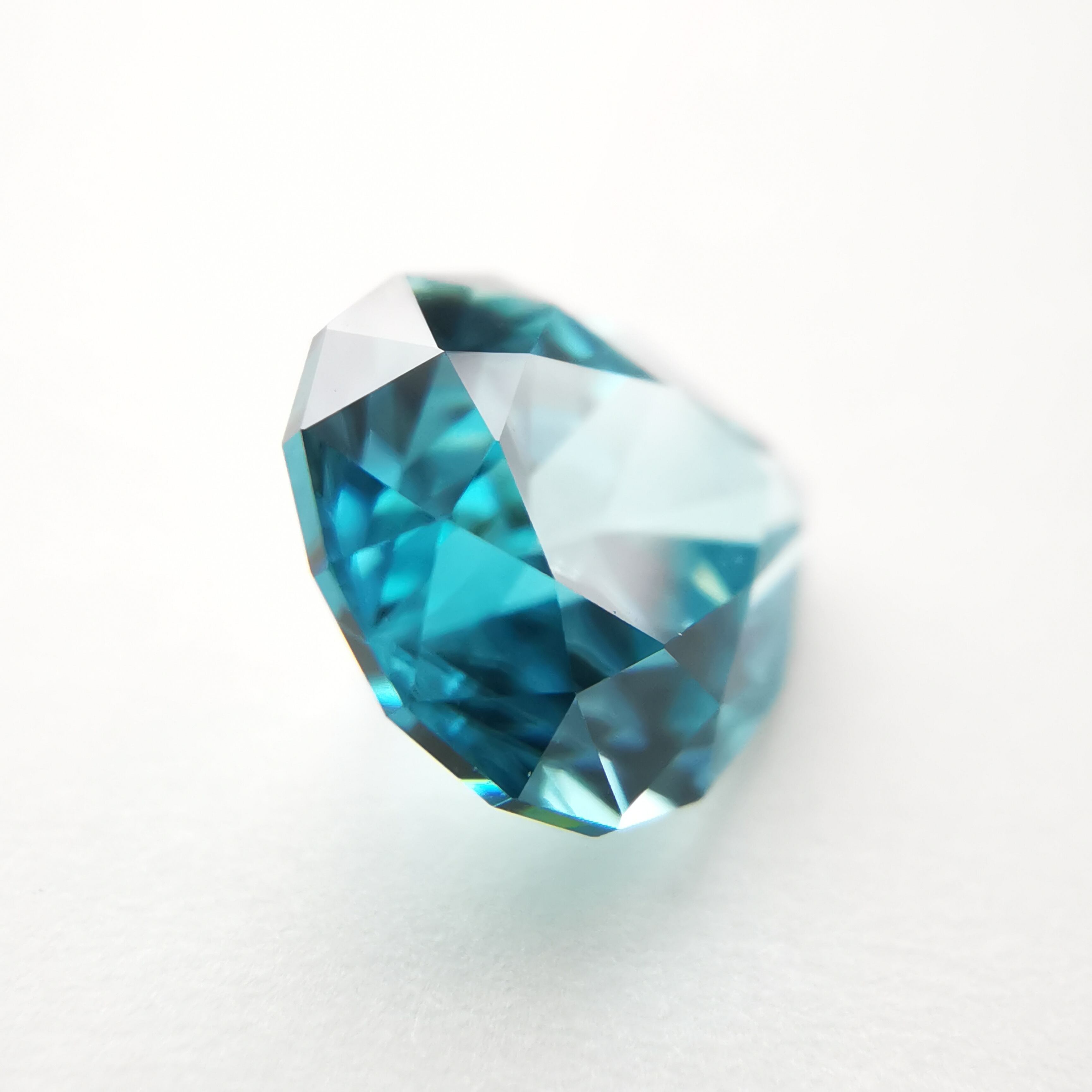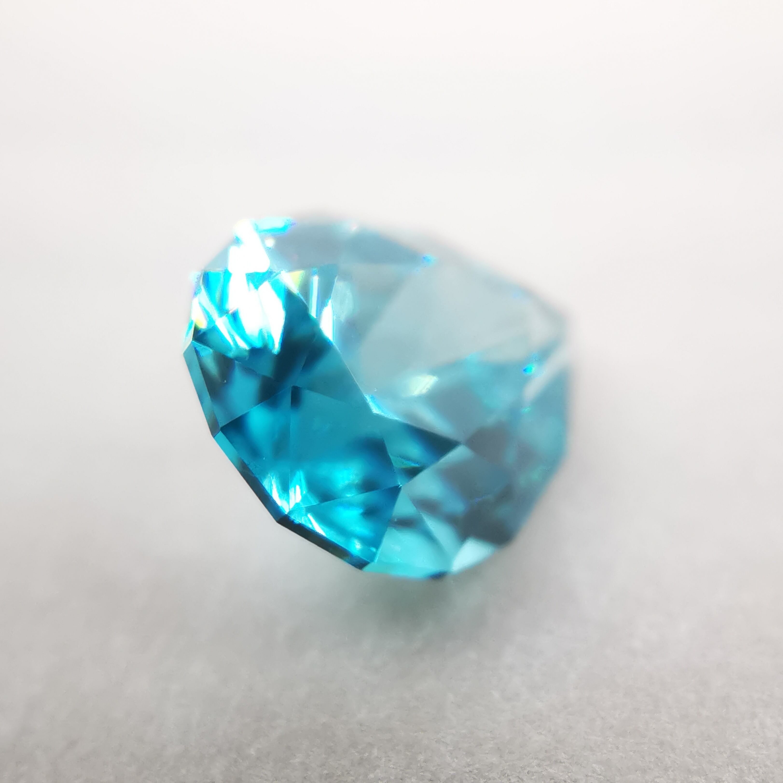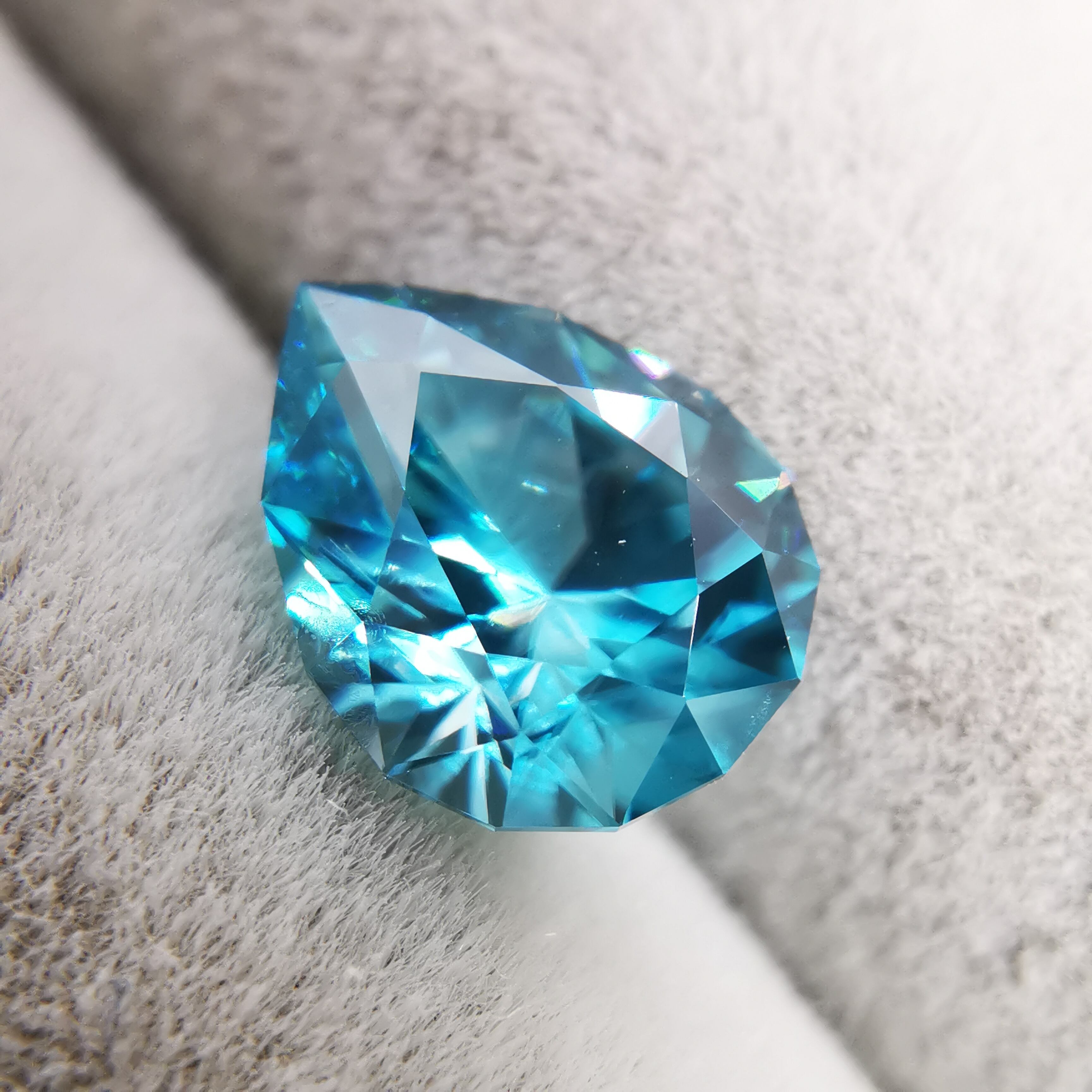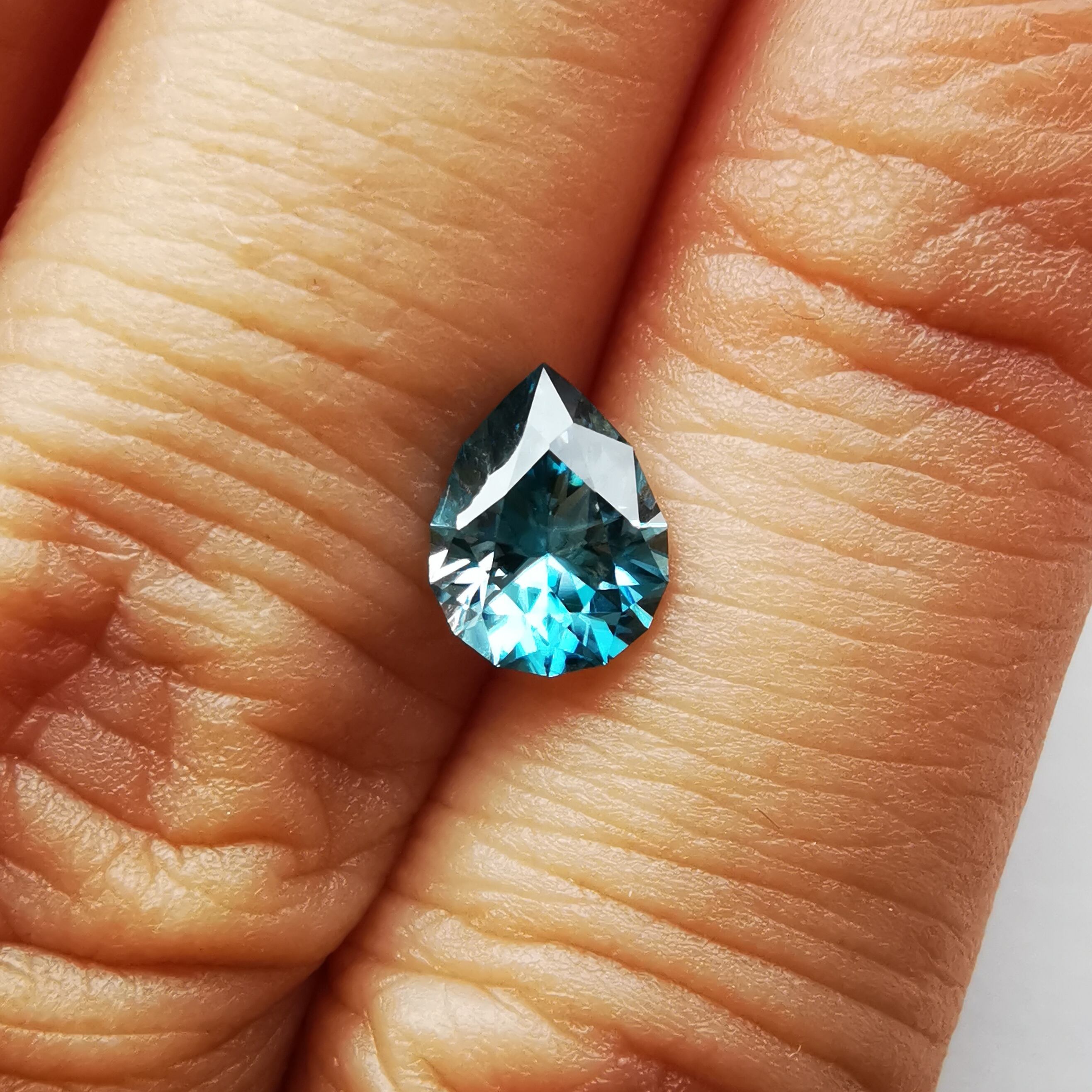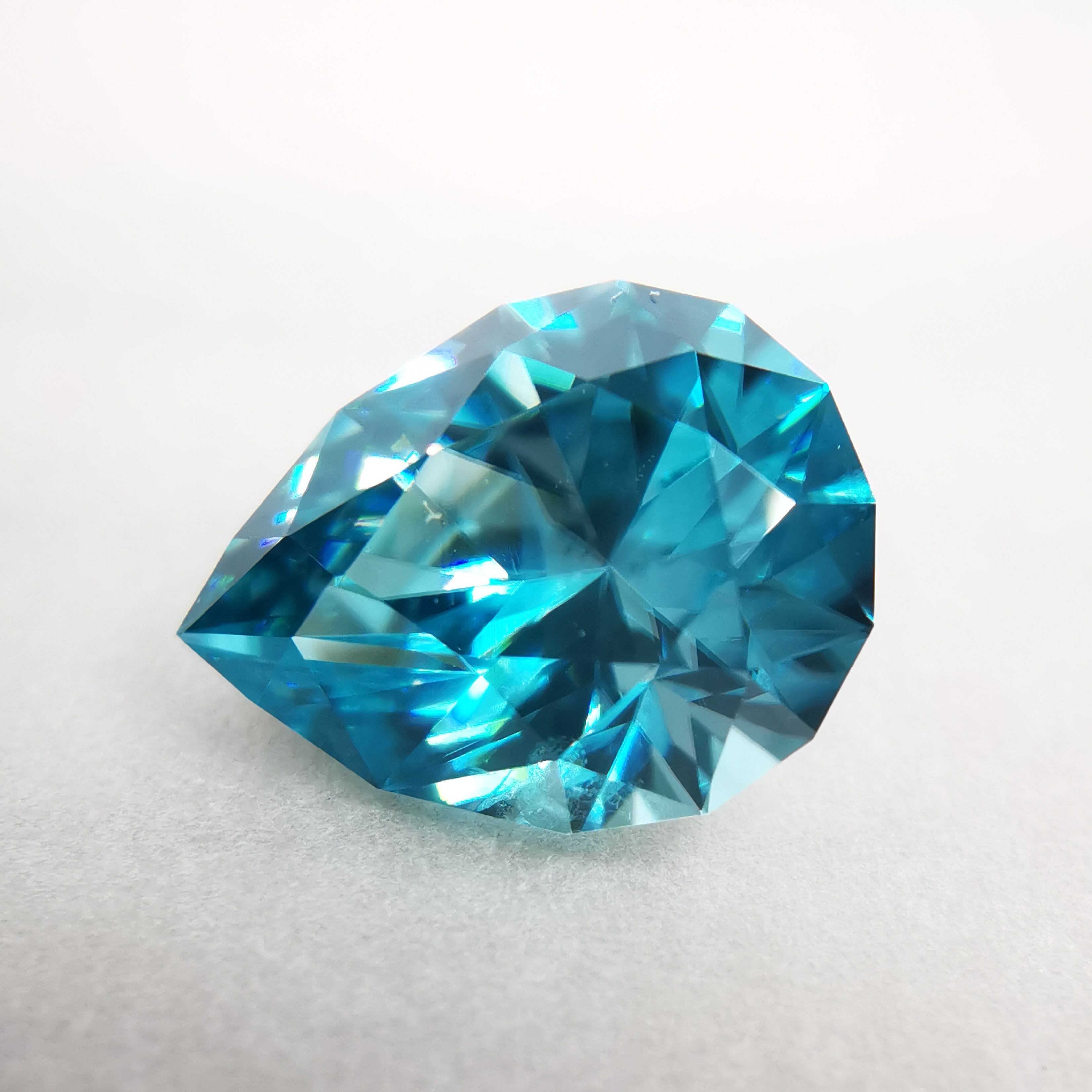 ジルコンらしい南国の海の色、ペアシェイプの先端とおしりの右側に色だまりがあります。