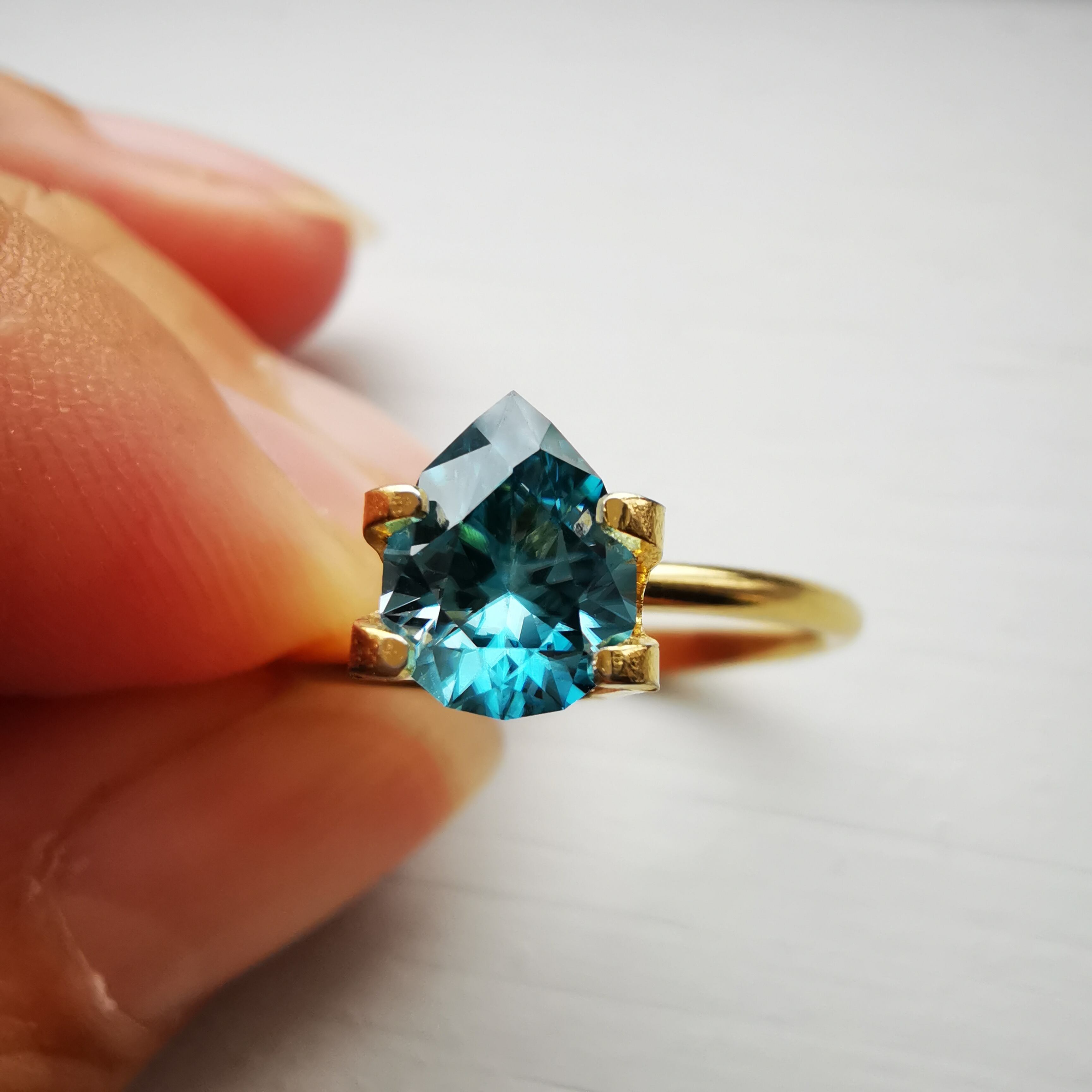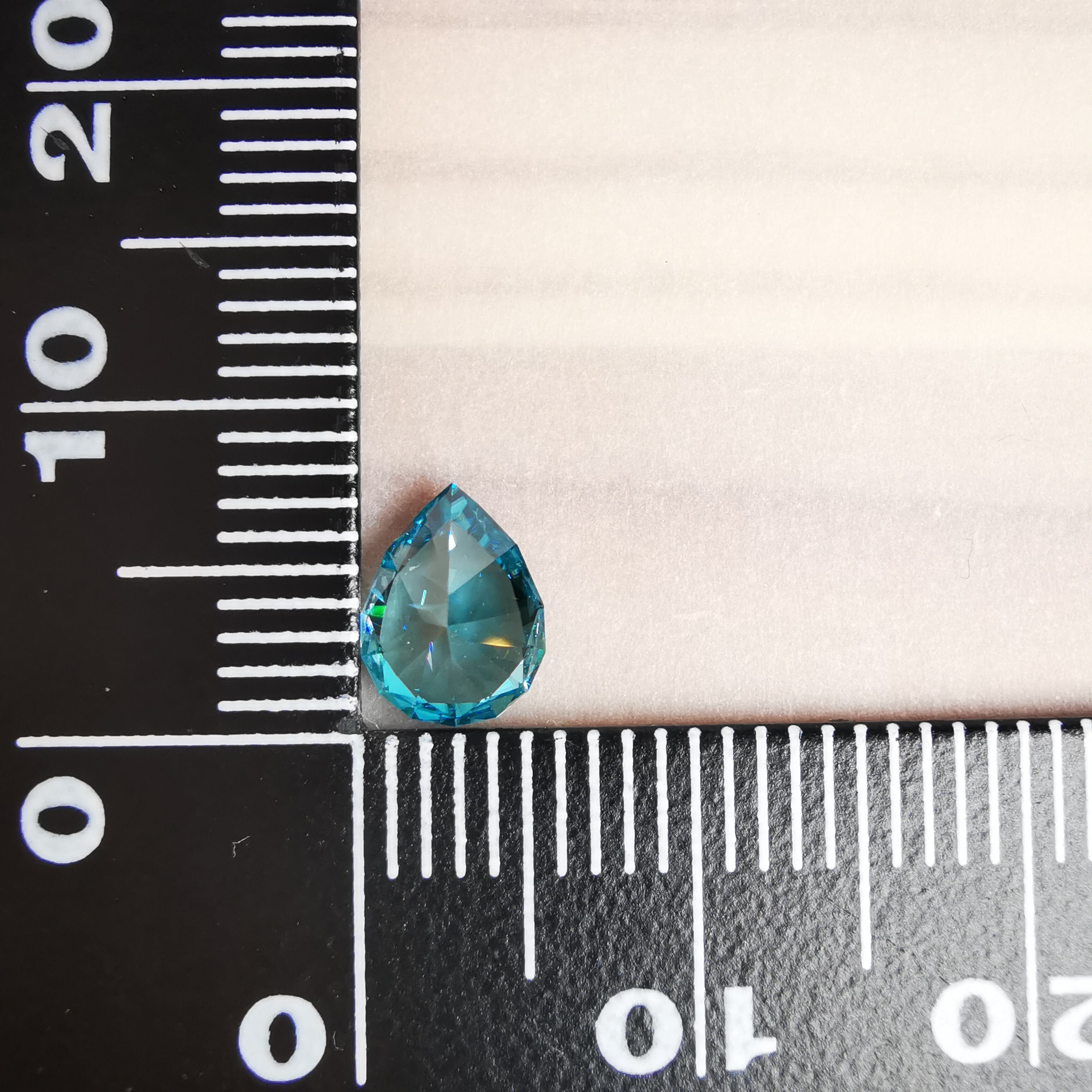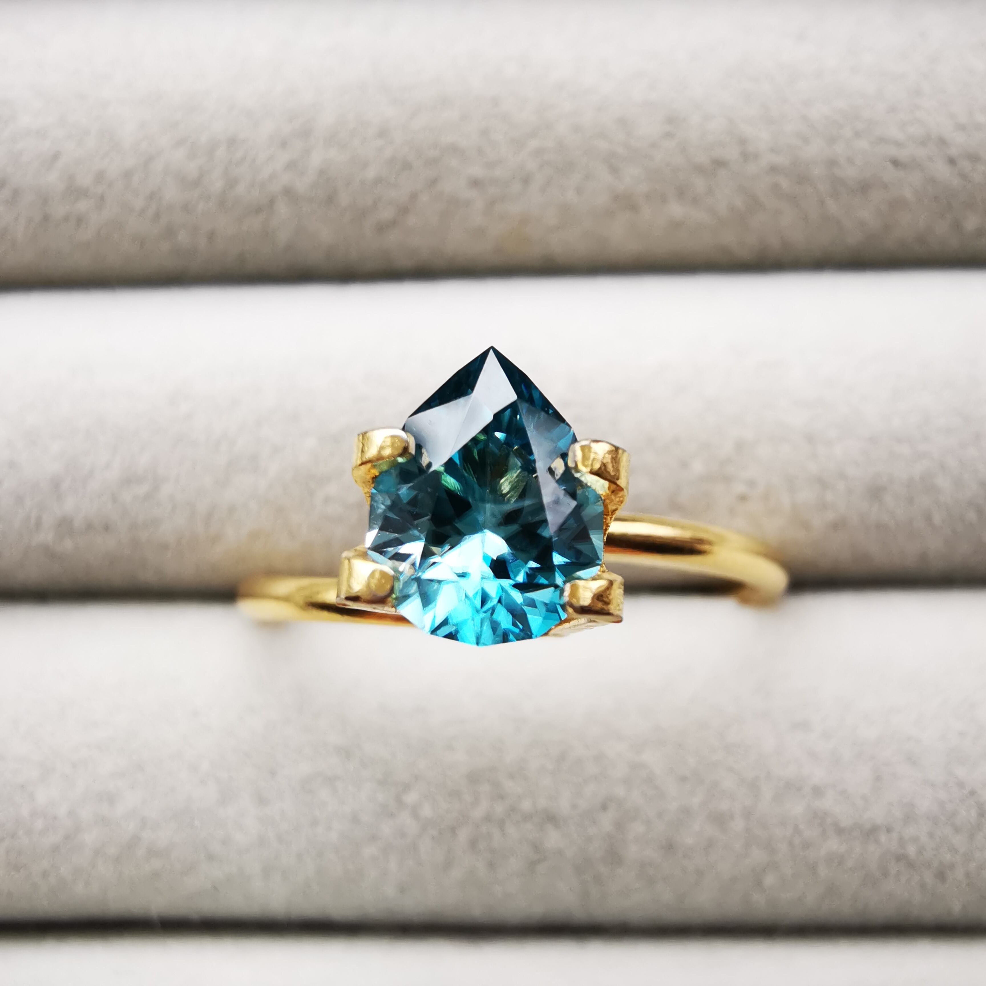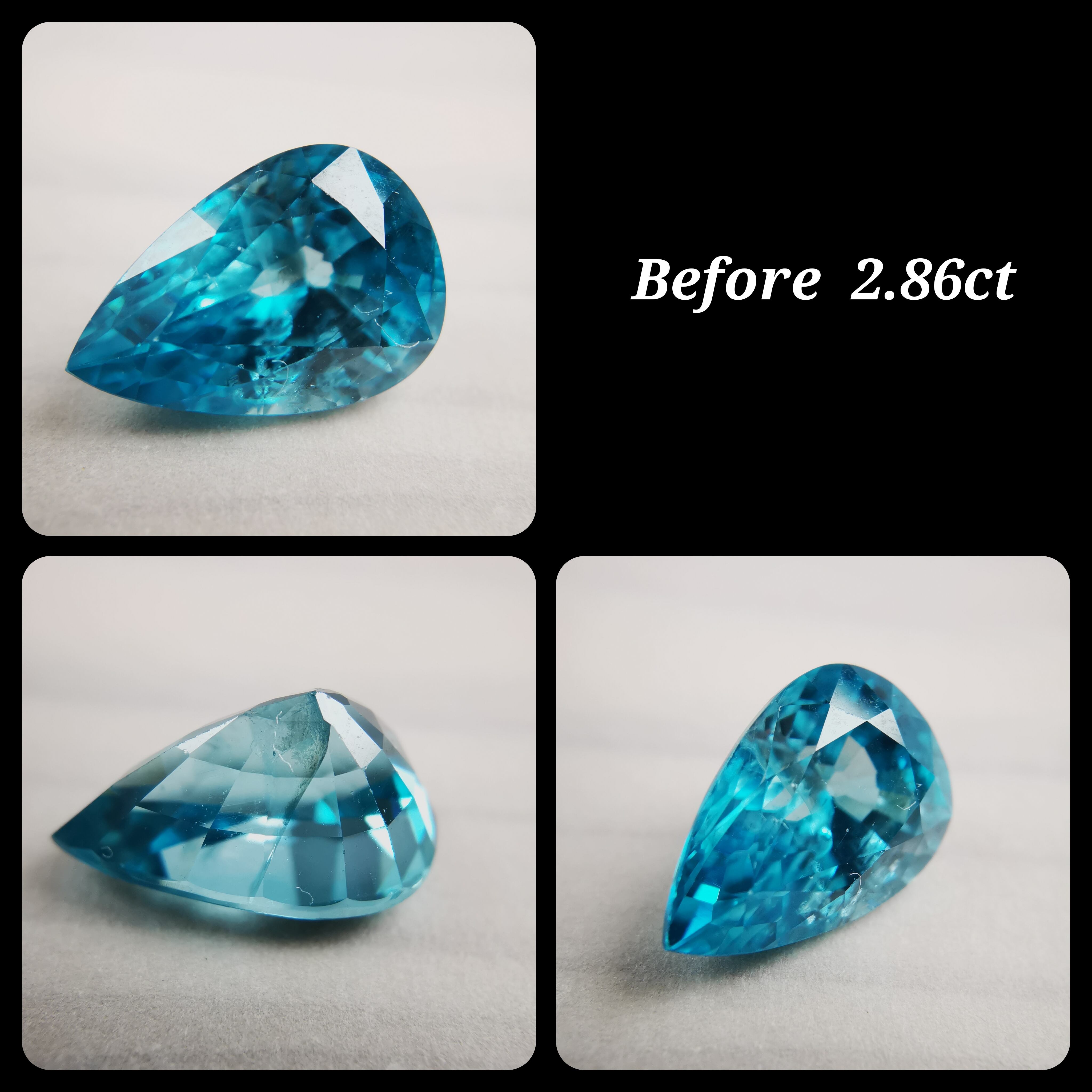 ジルコンらしい南国の海の色、ペアシェイプの先端とおしりの右側に色だまりがあります。
