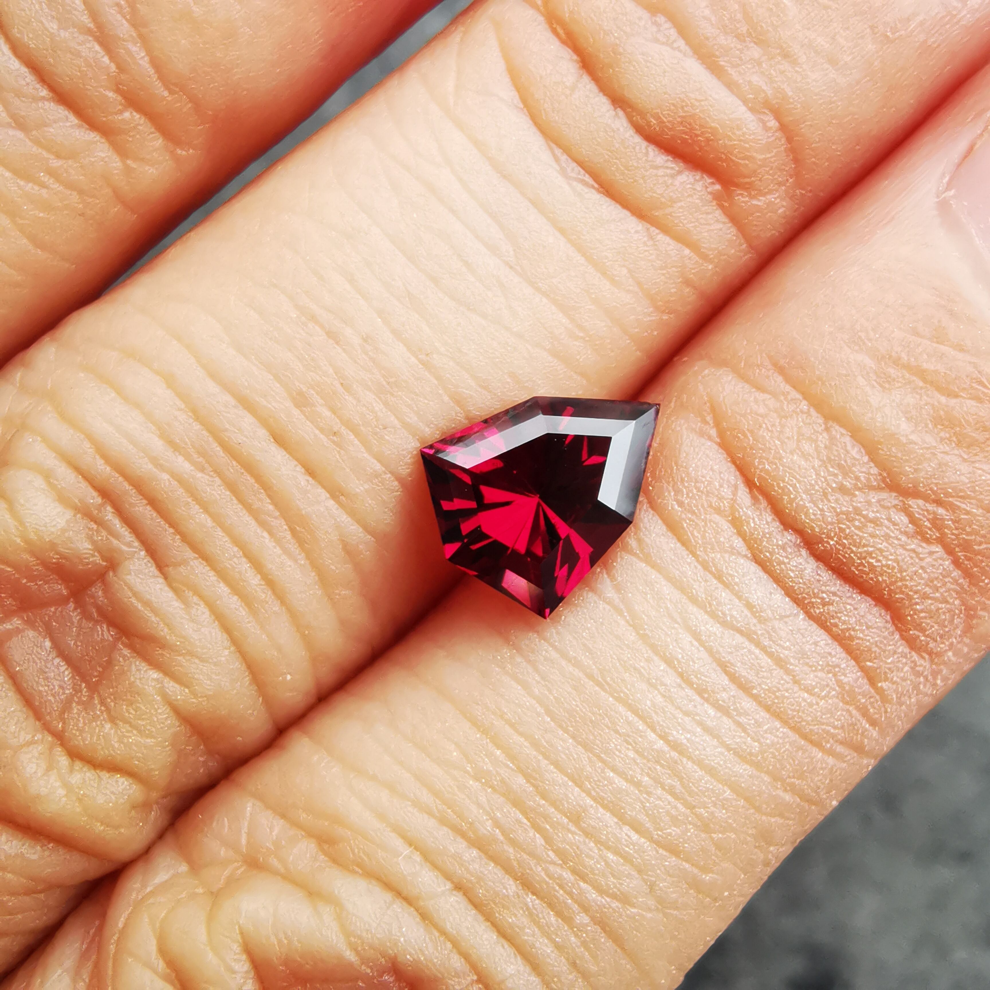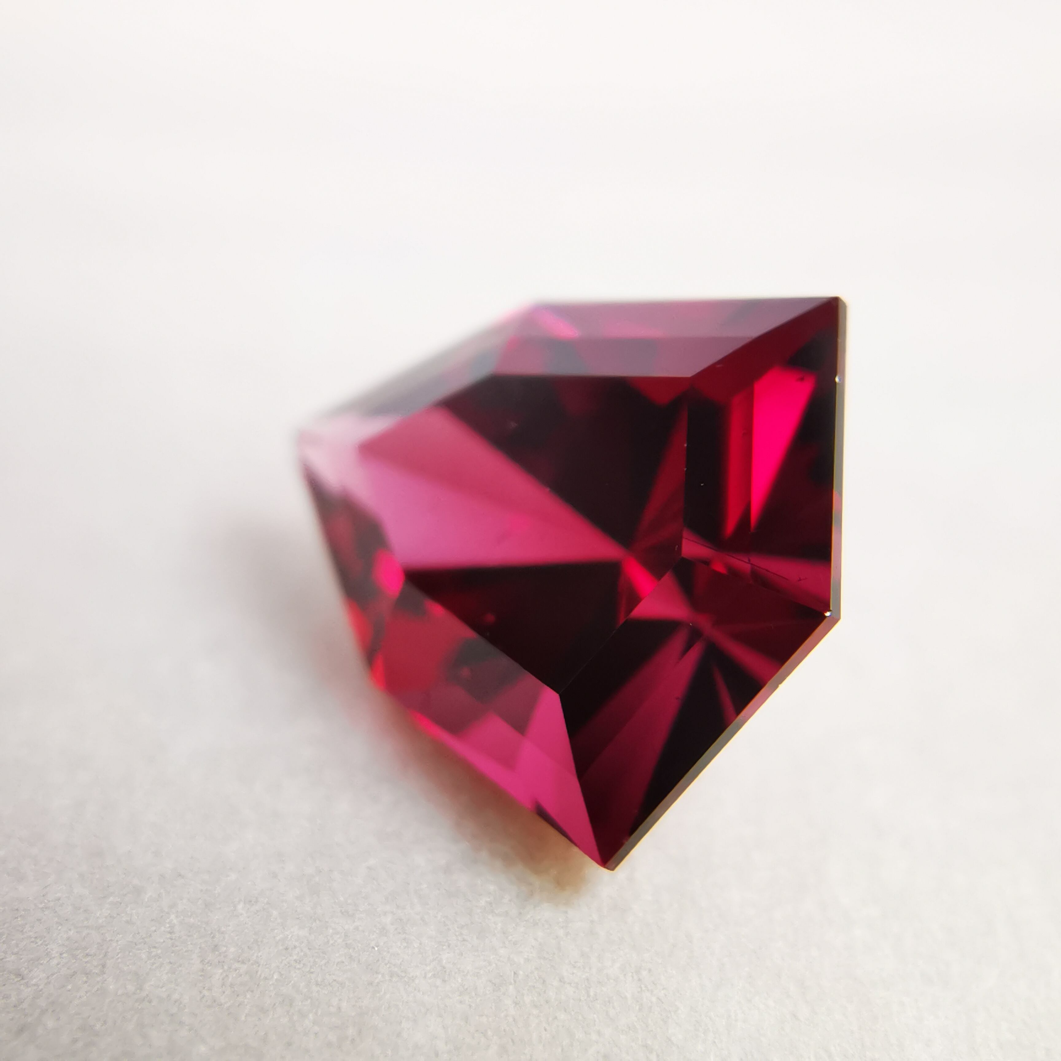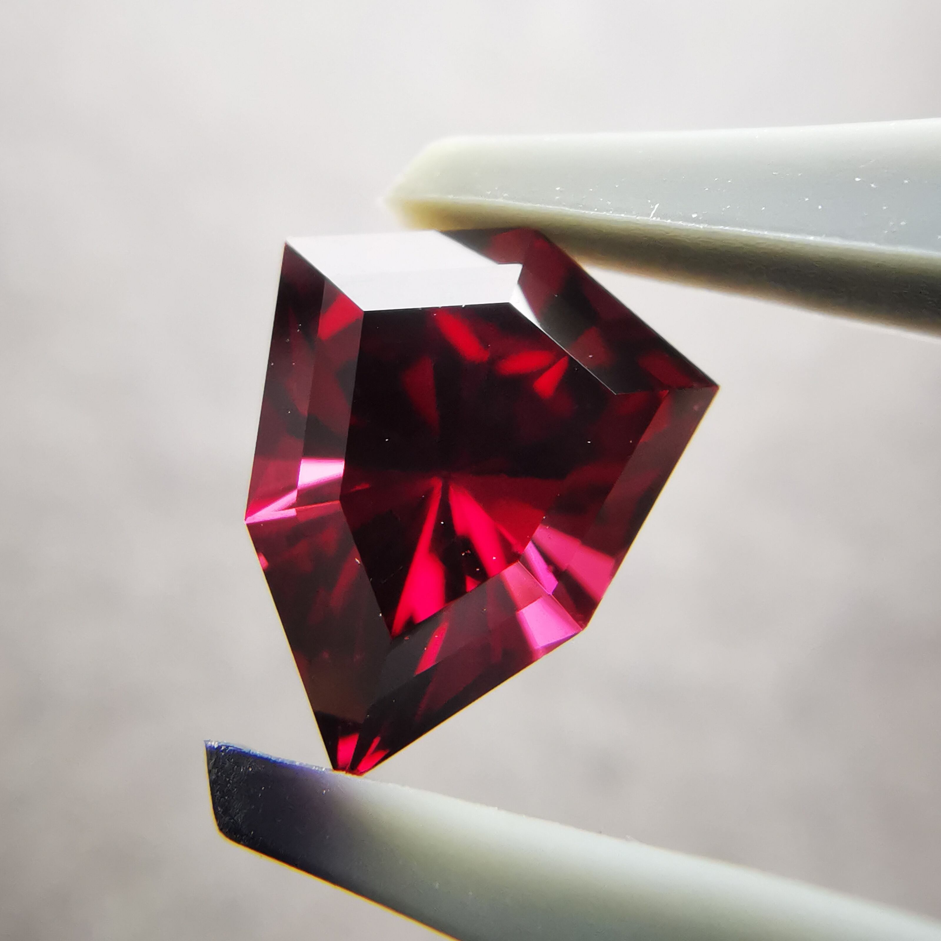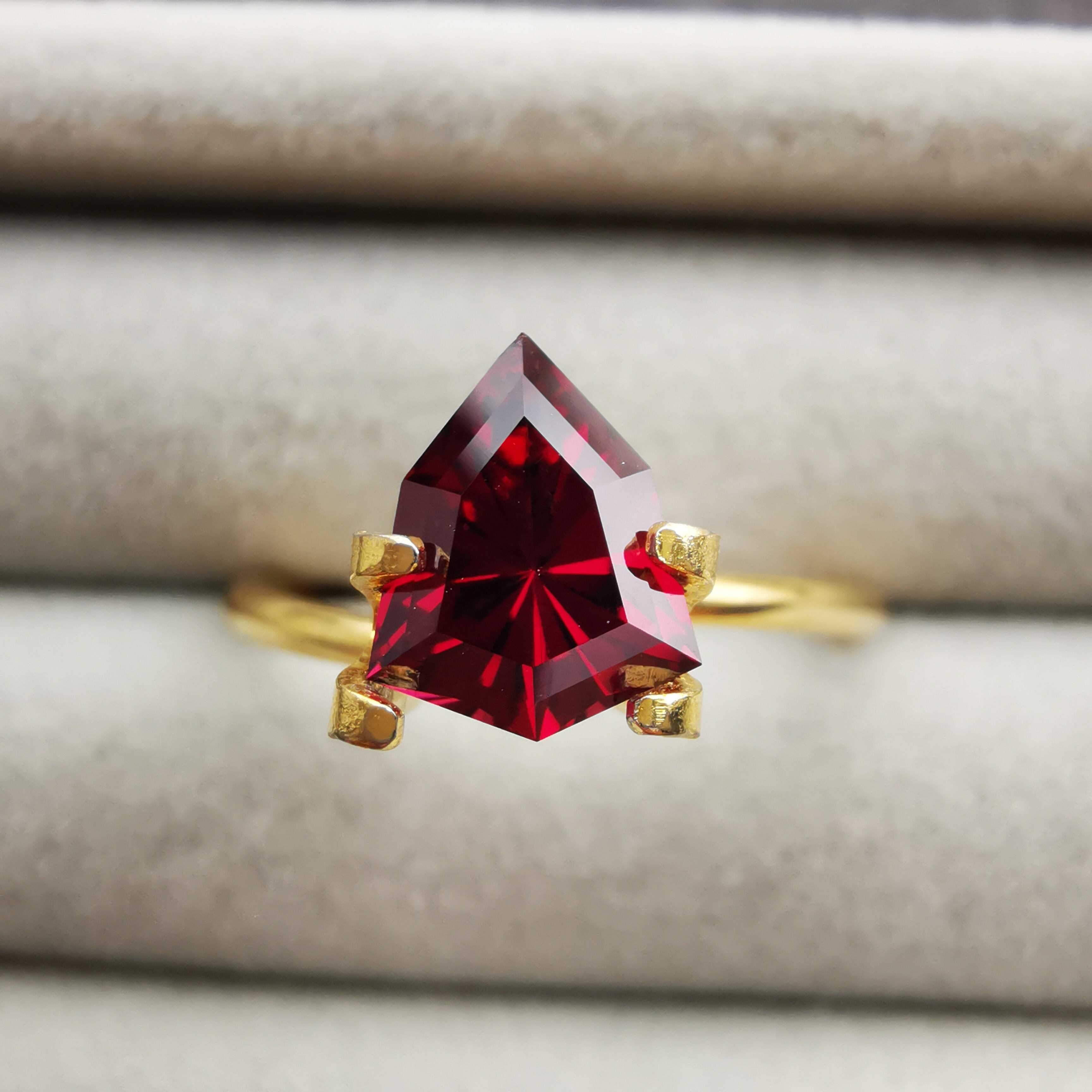 暗い石の中から、ローズレッドの華やかなきらめきが溢れるように輝く、ロードライトガーネットです。