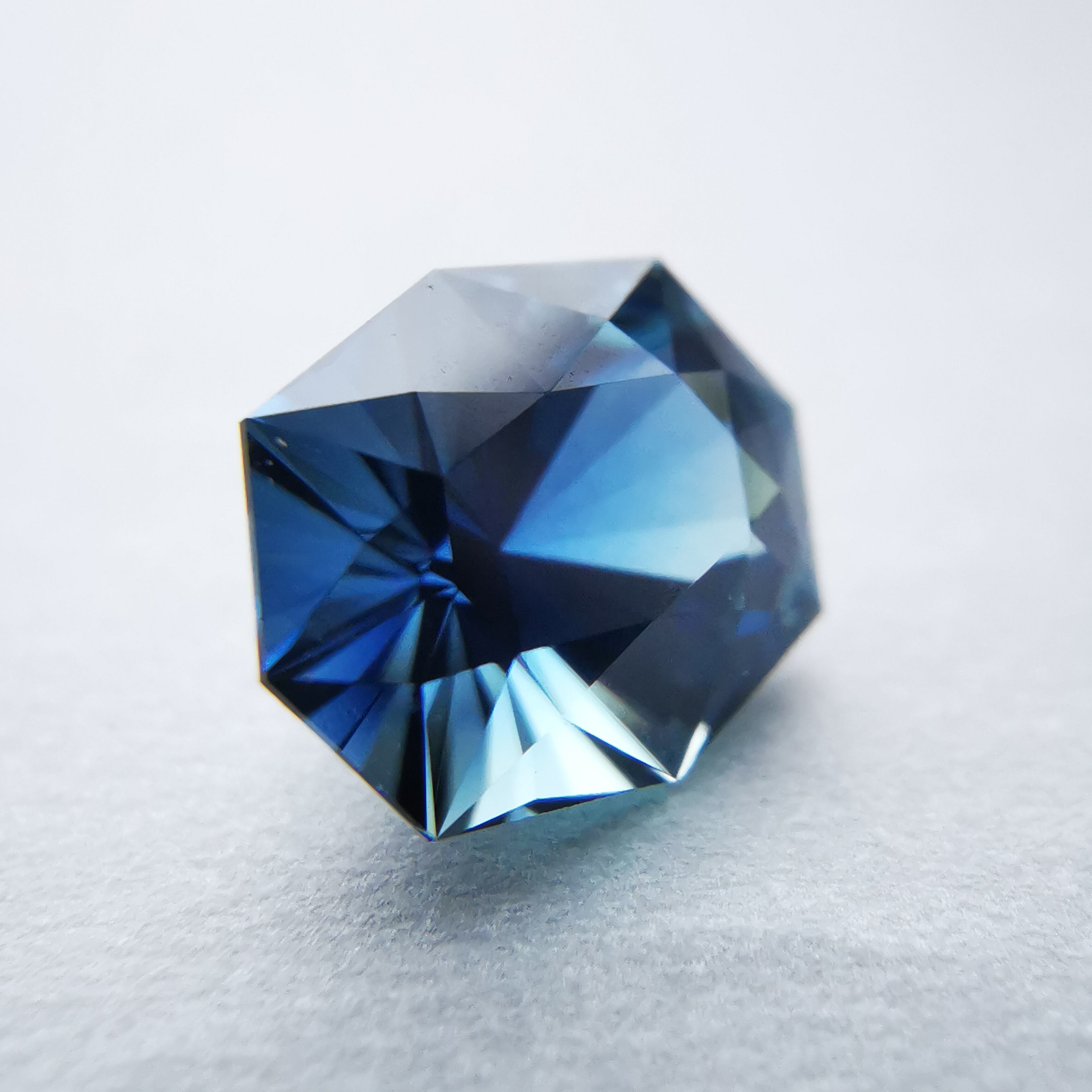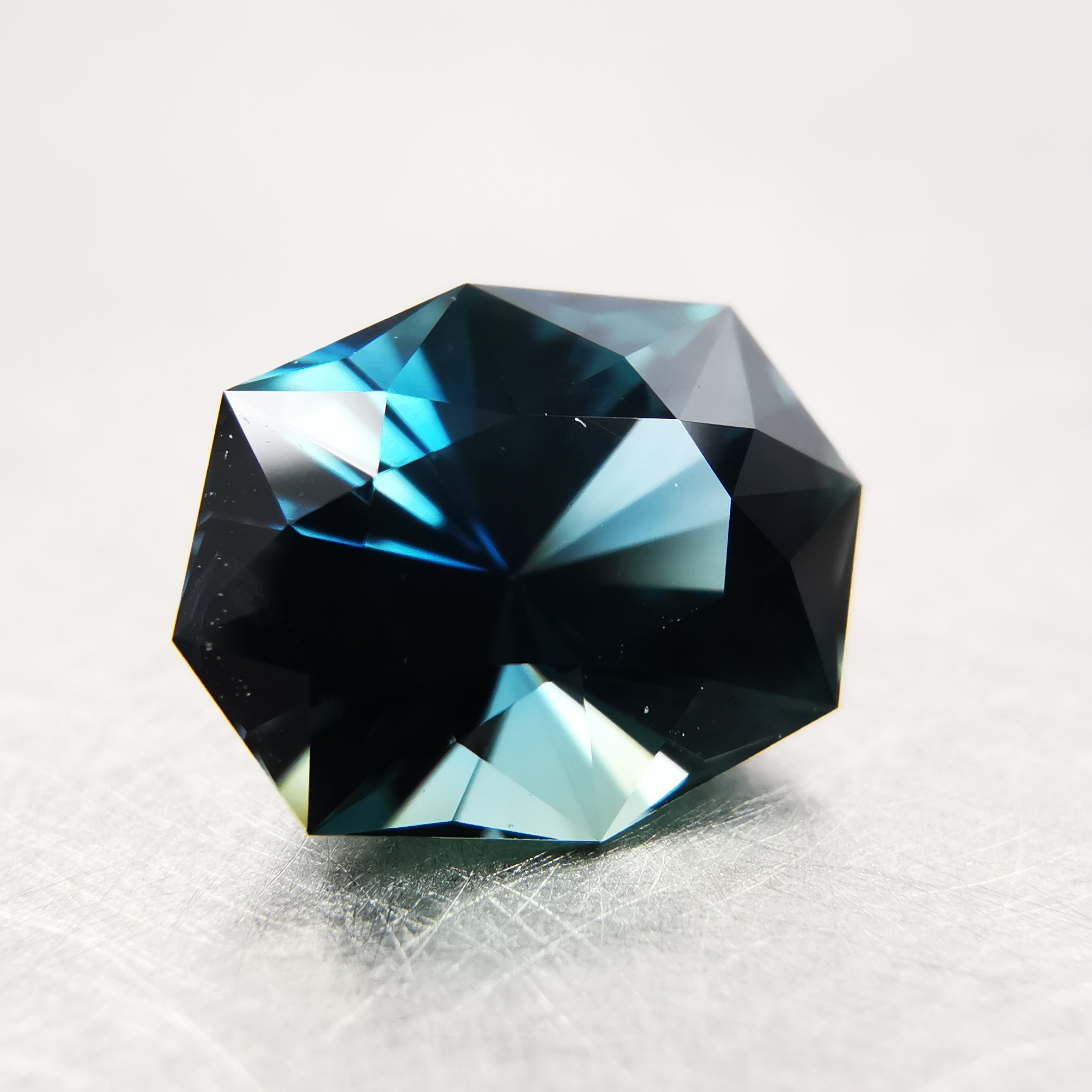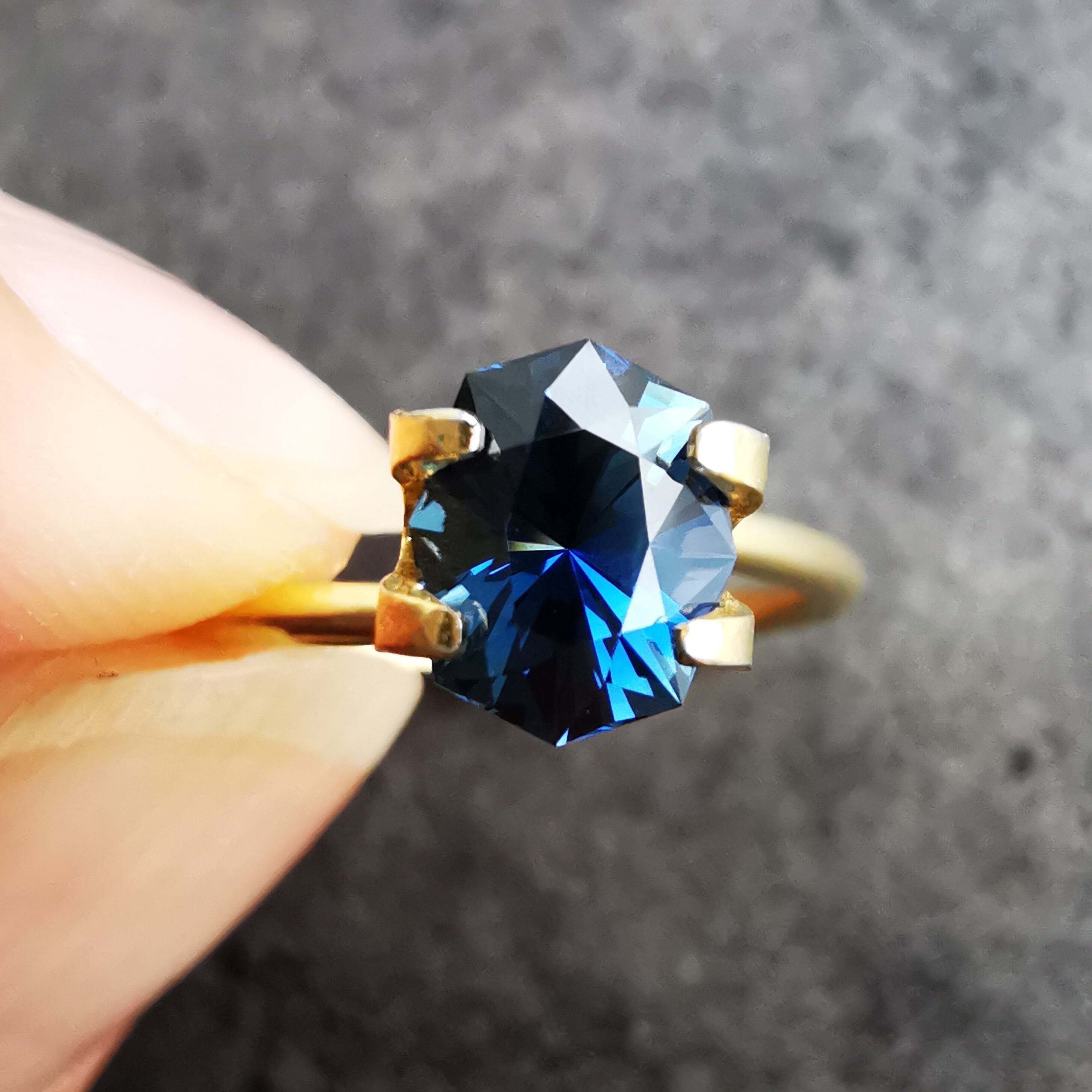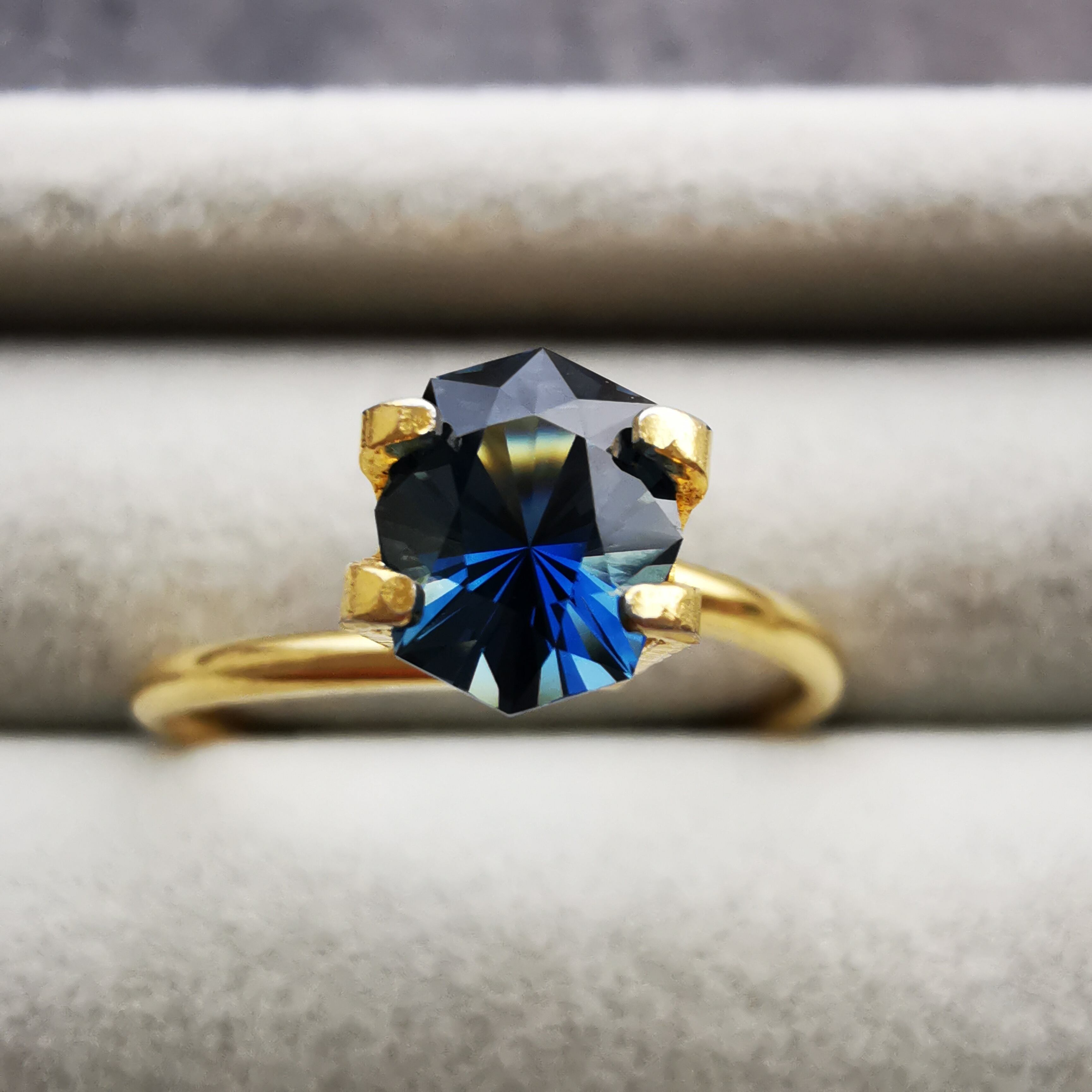 ティールカラーのきらめきが、動かすたびに暗い石の中からキラキラと輝くサファイアです。