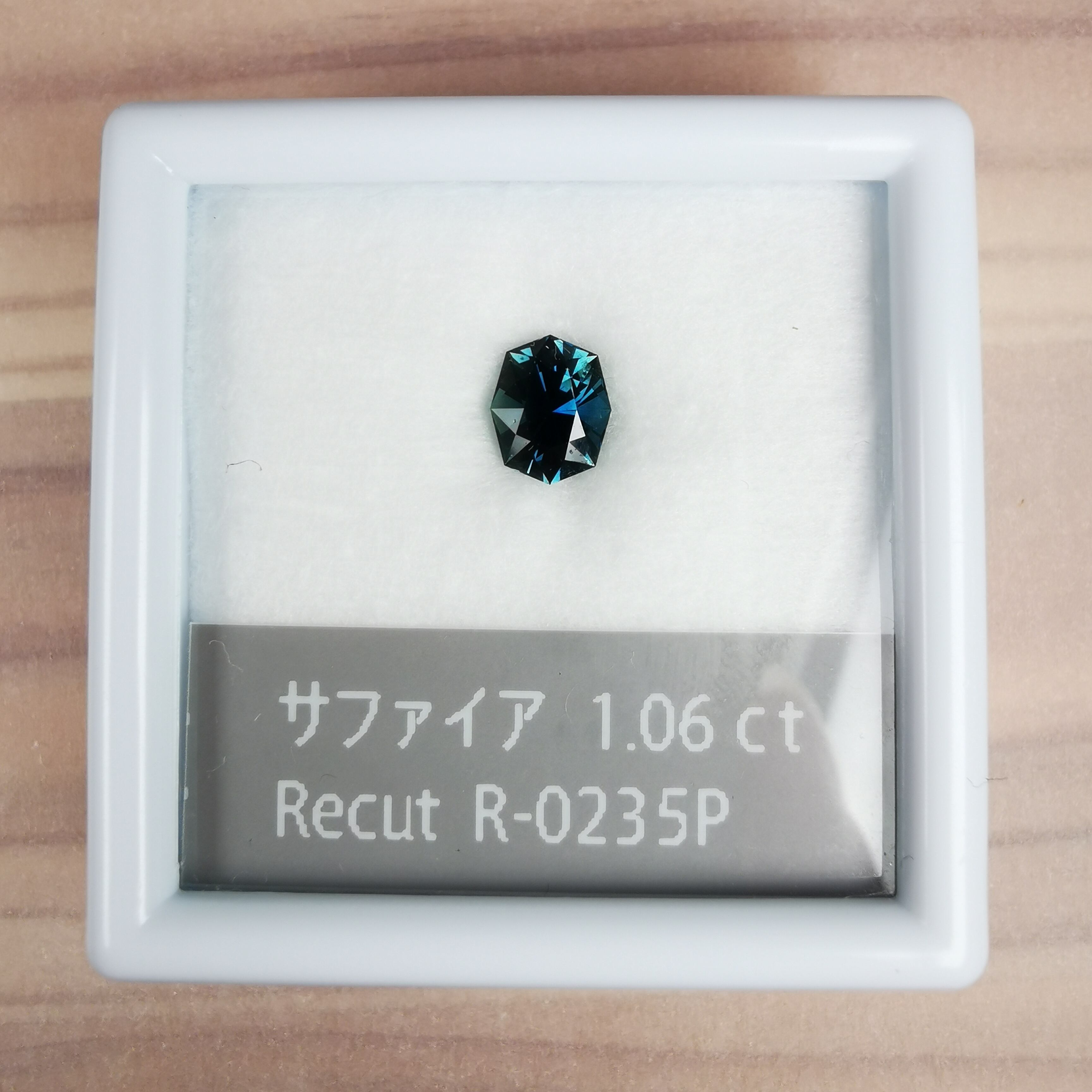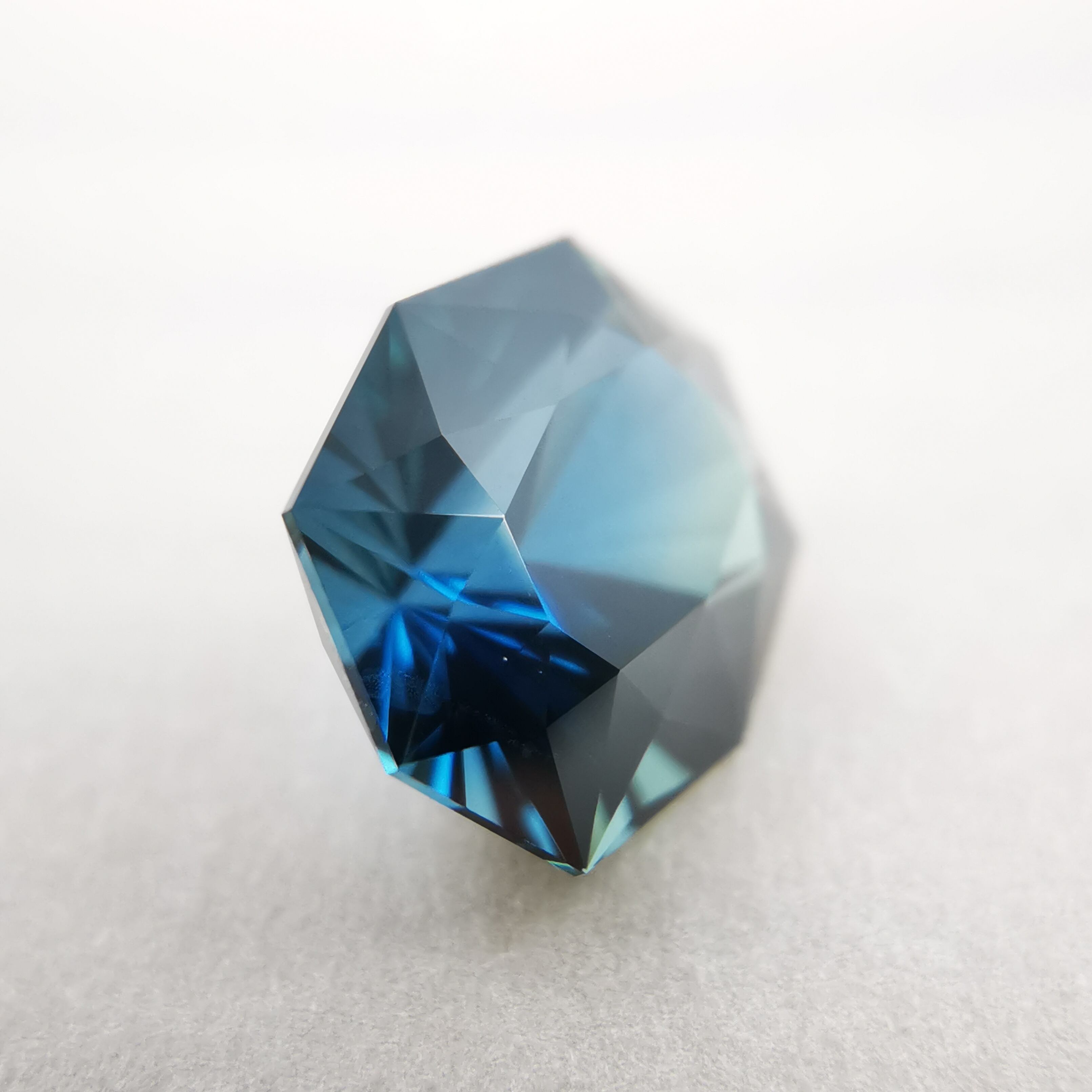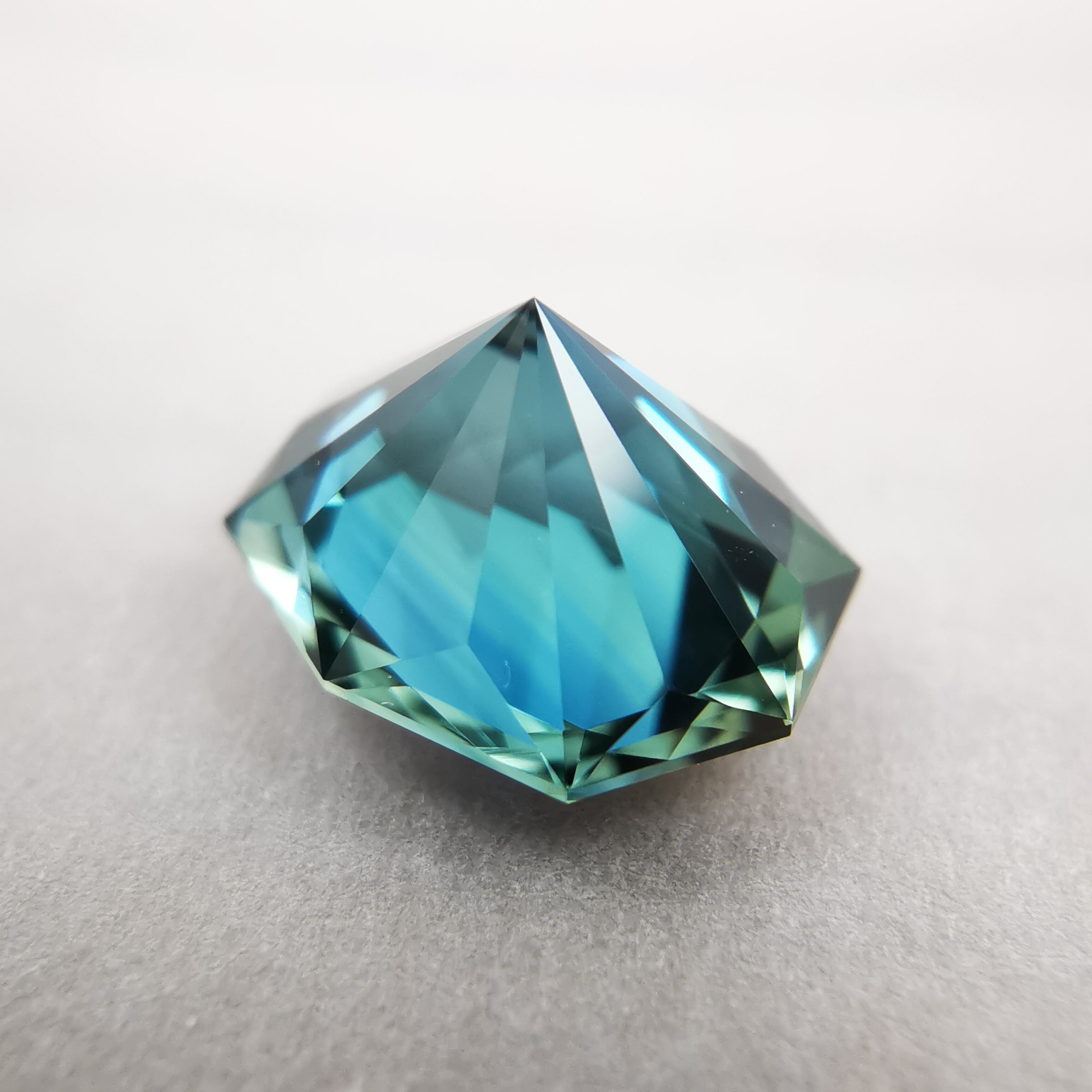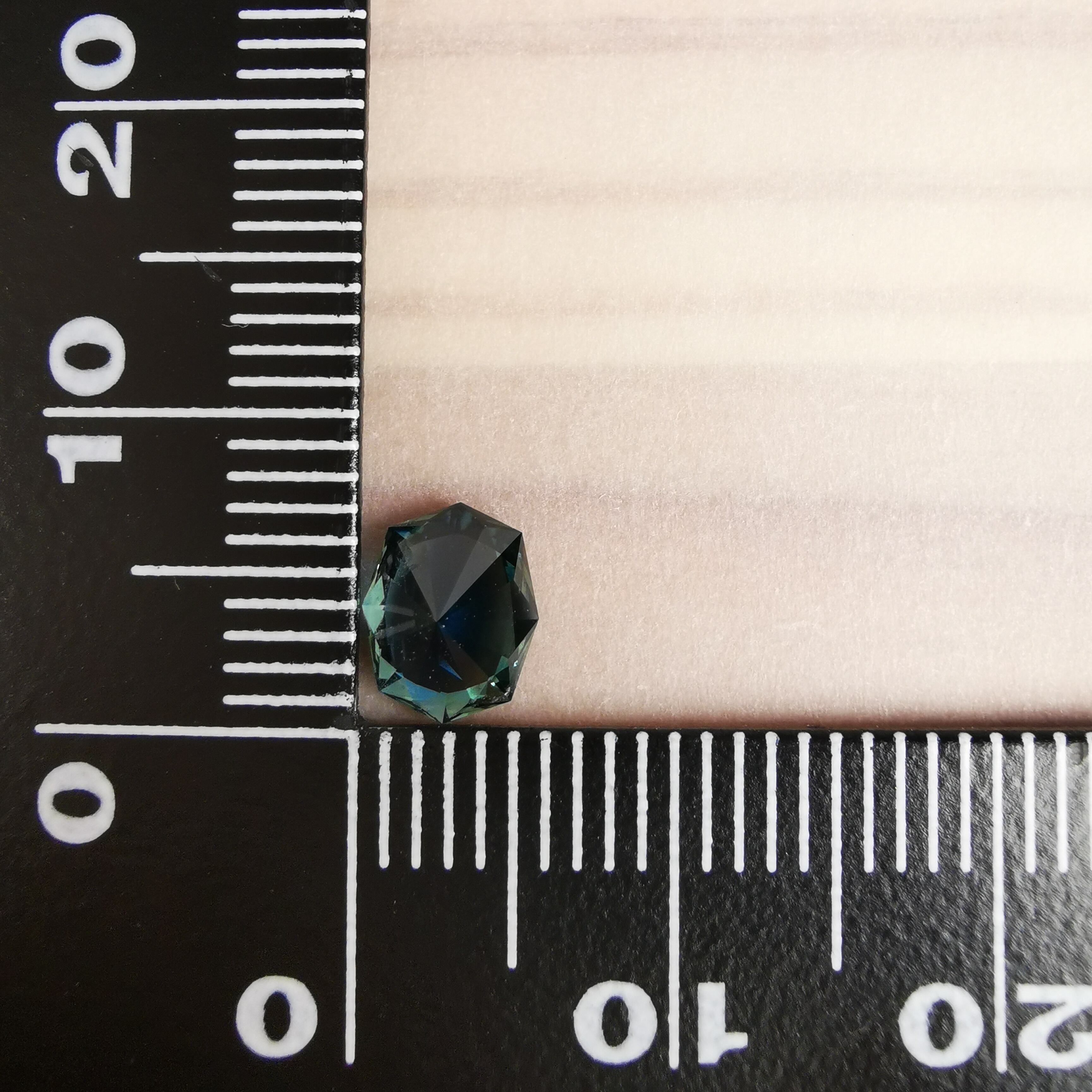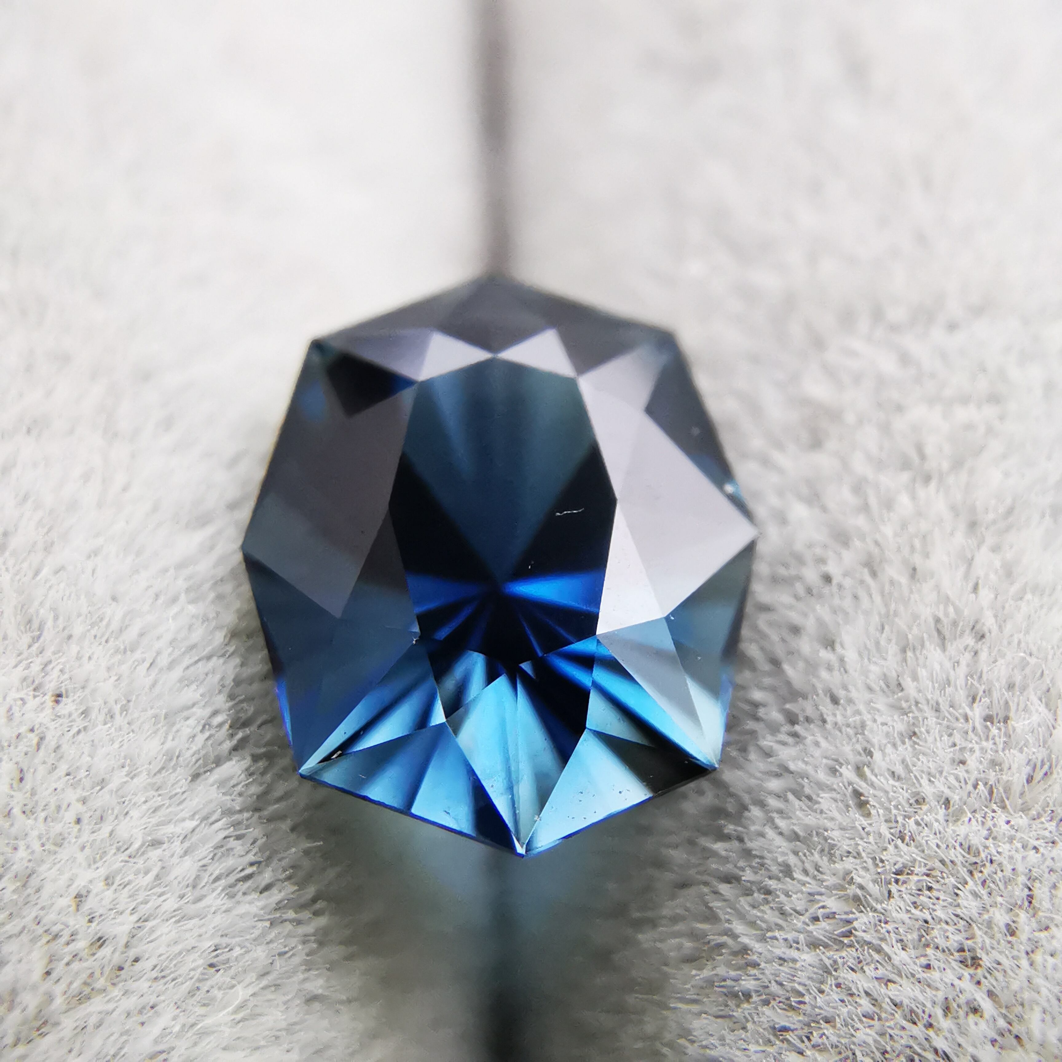 ティールカラーのきらめきが、動かすたびに暗い石の中からキラキラと輝くサファイアです。