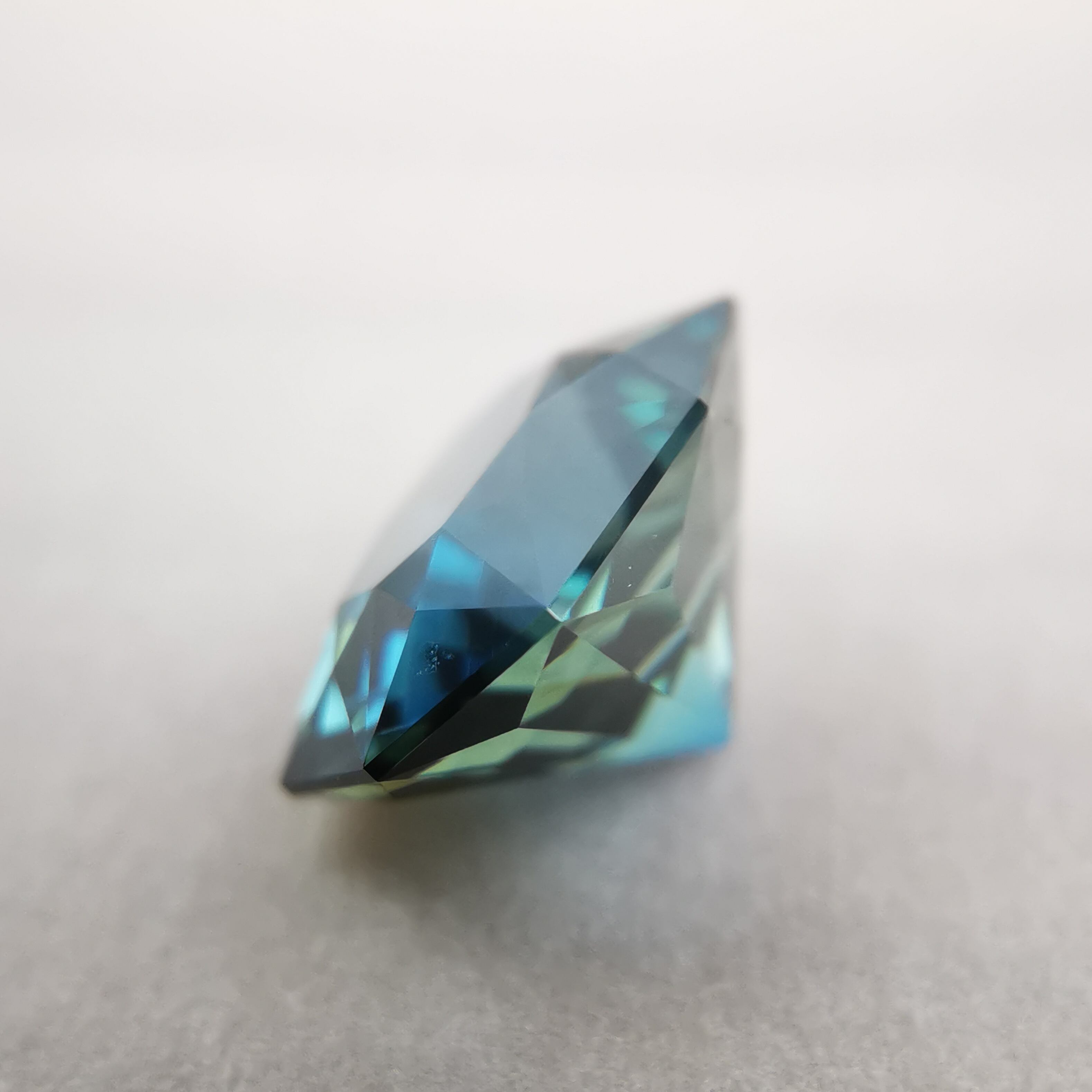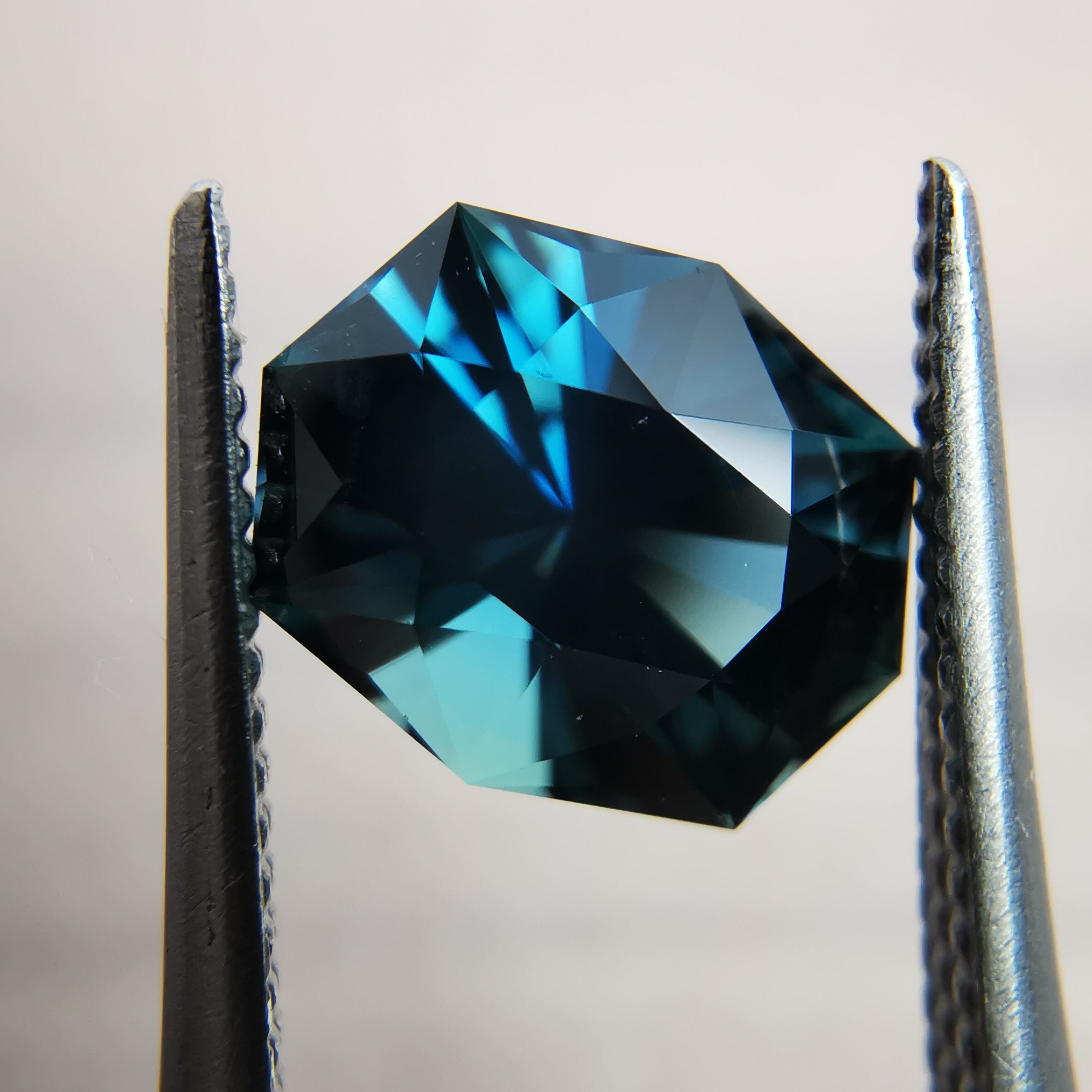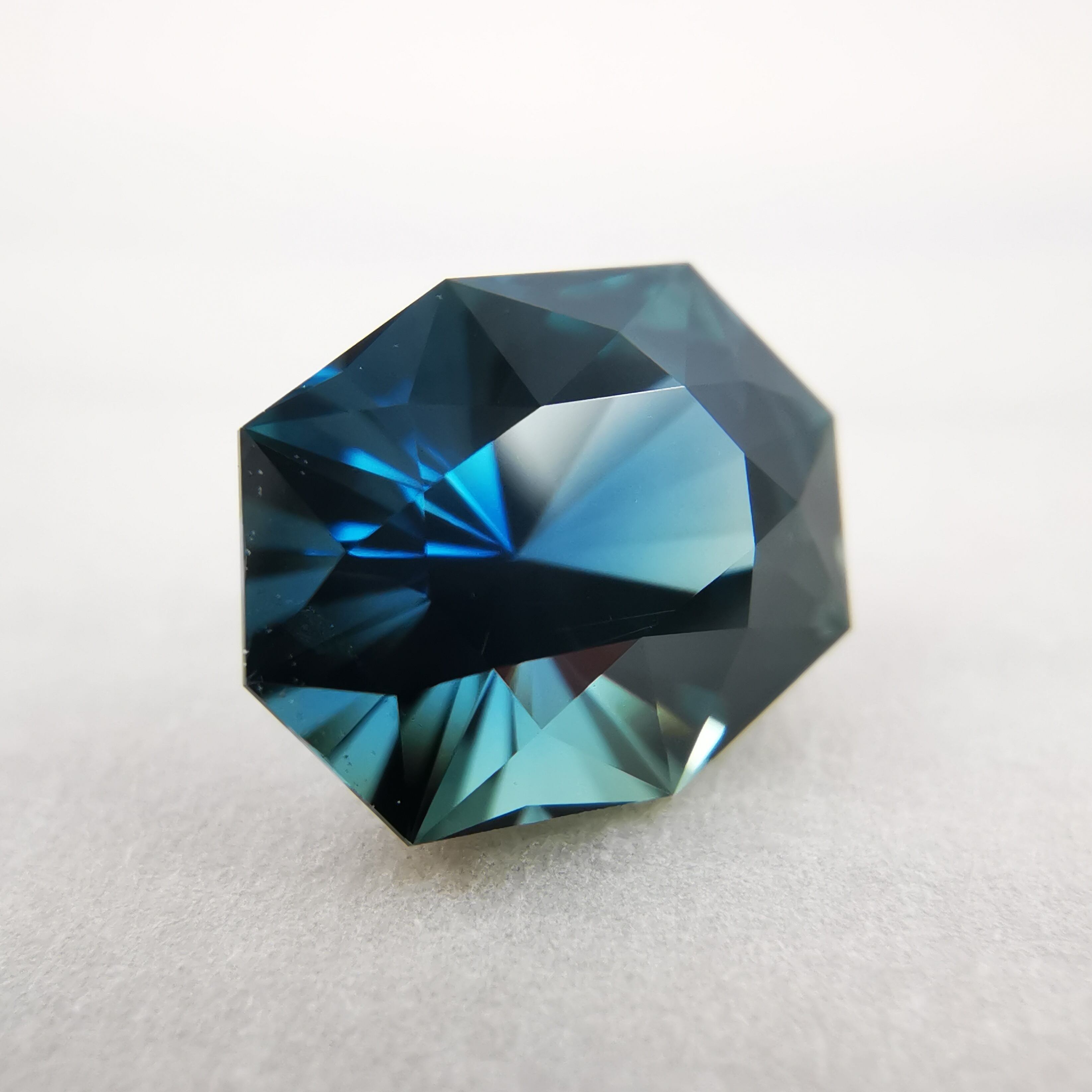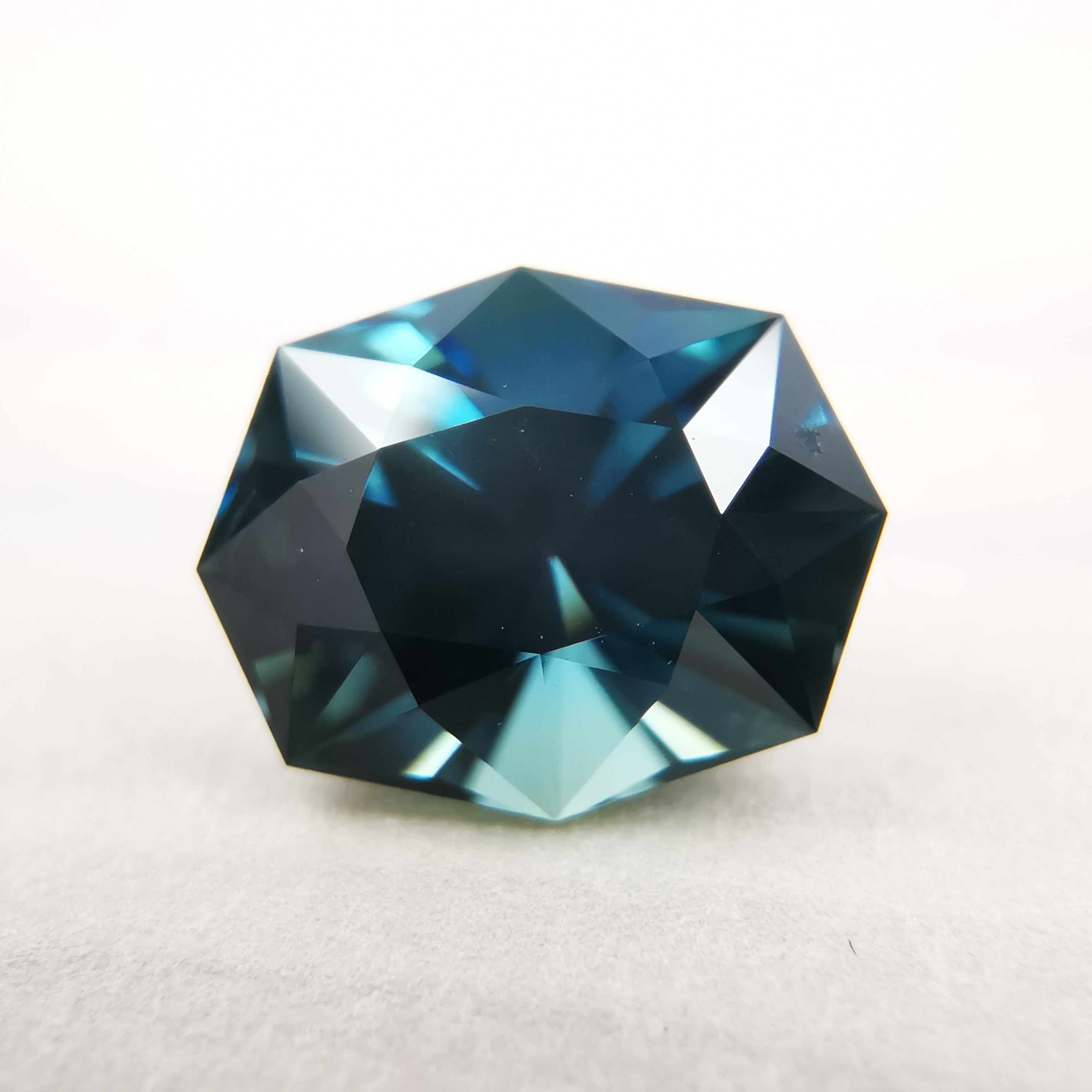 ティールカラーのきらめきが、動かすたびに暗い石の中からキラキラと輝くサファイアです。