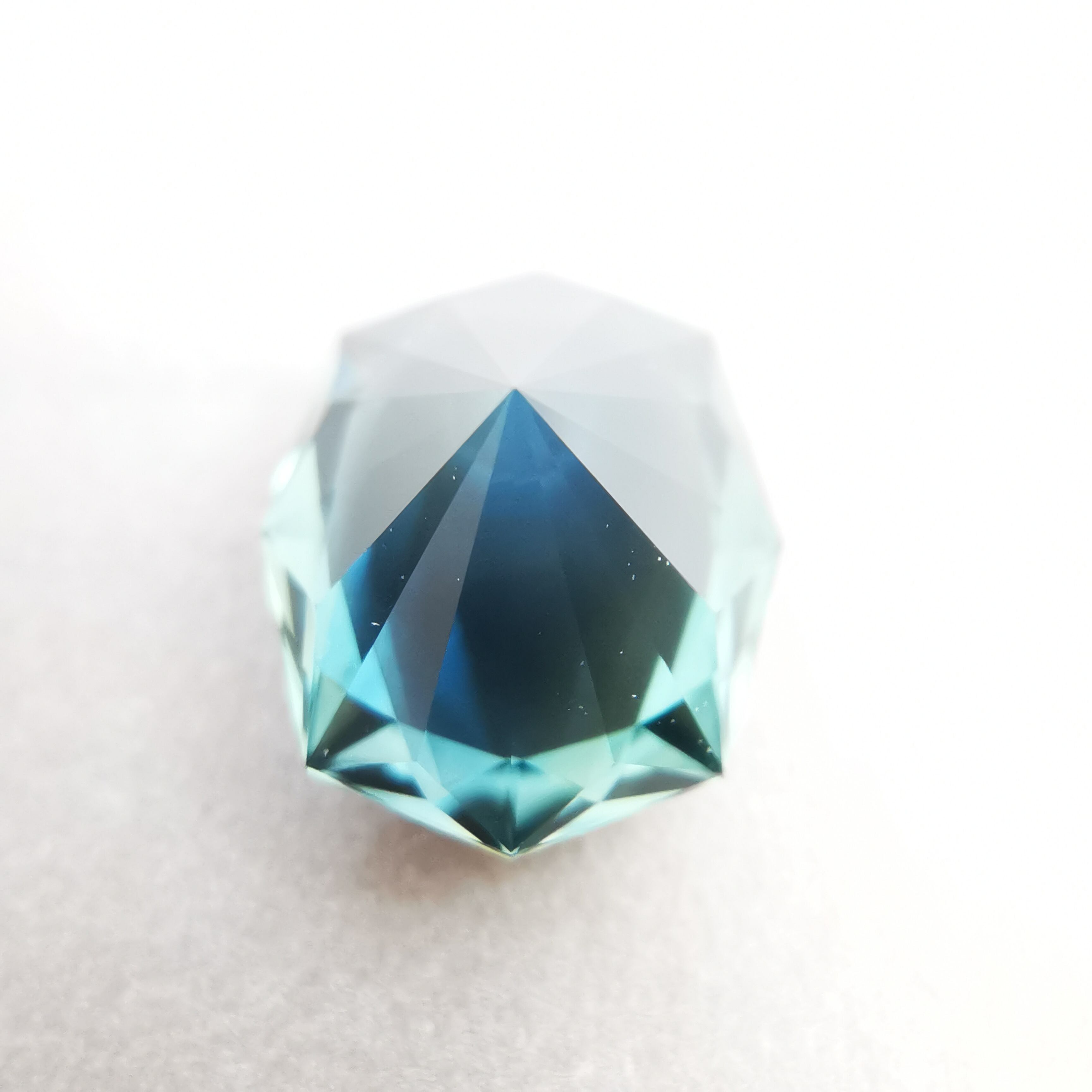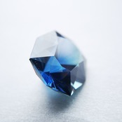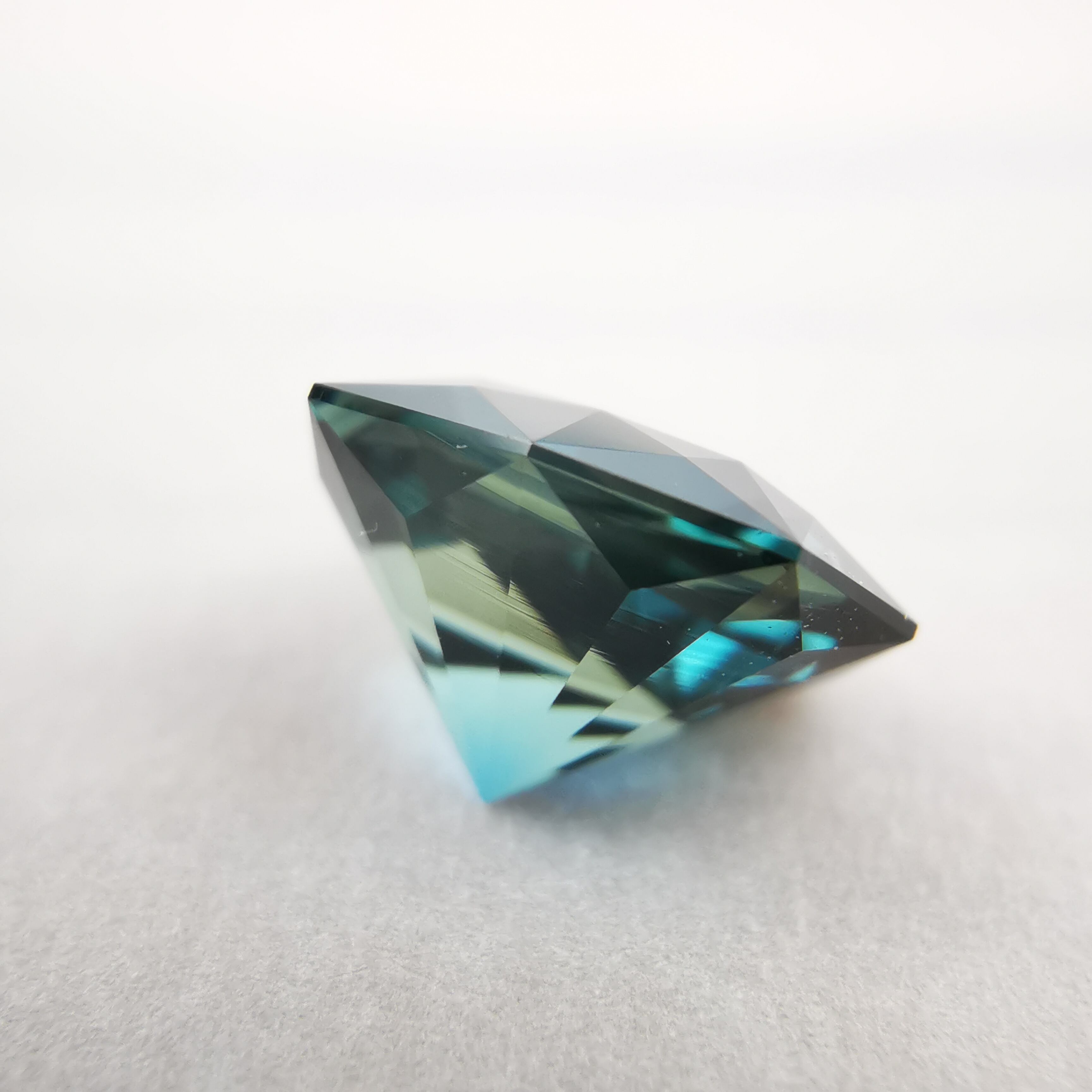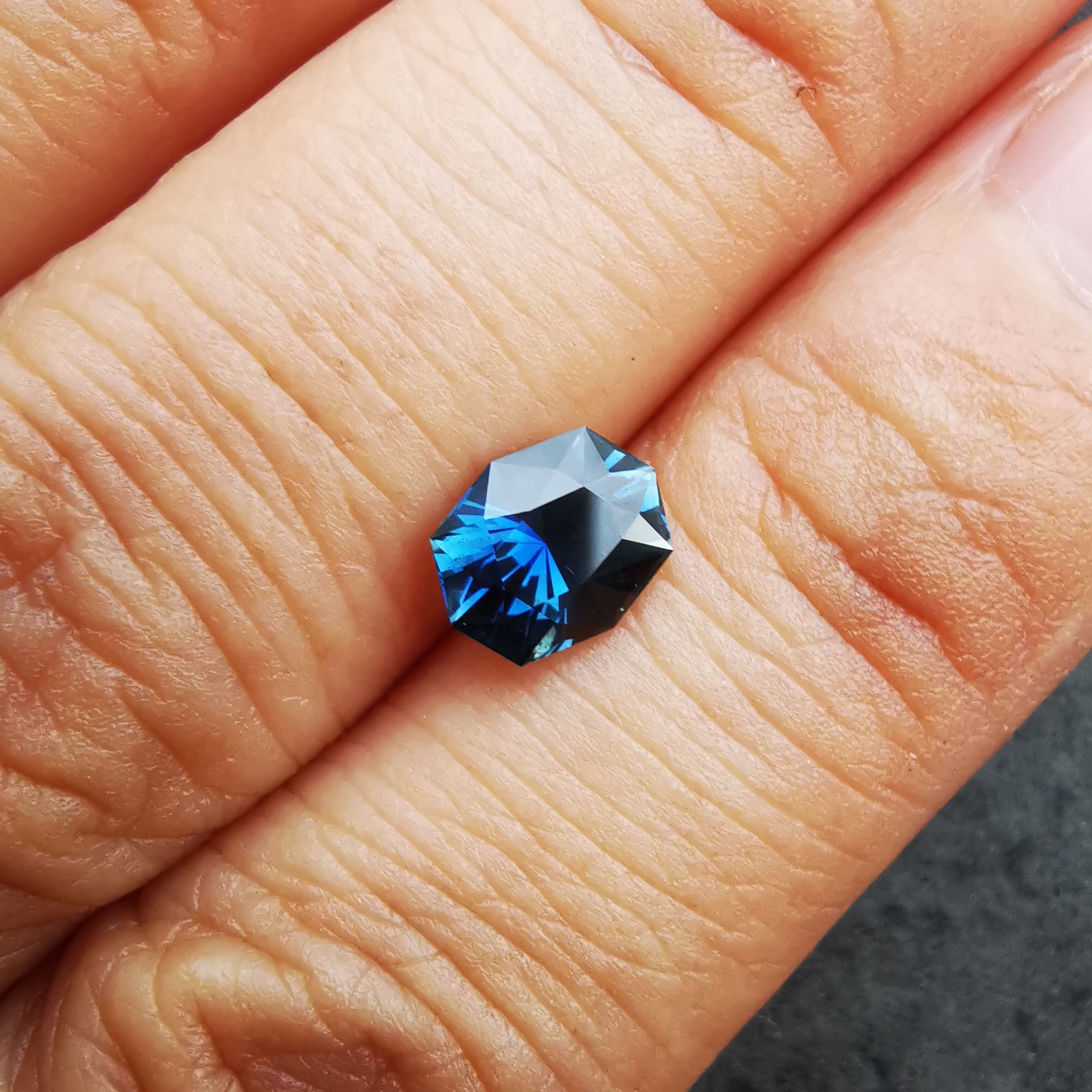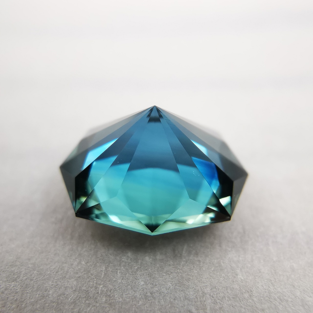 ティールカラーのきらめきが、動かすたびに暗い石の中からキラキラと輝くサファイアです。