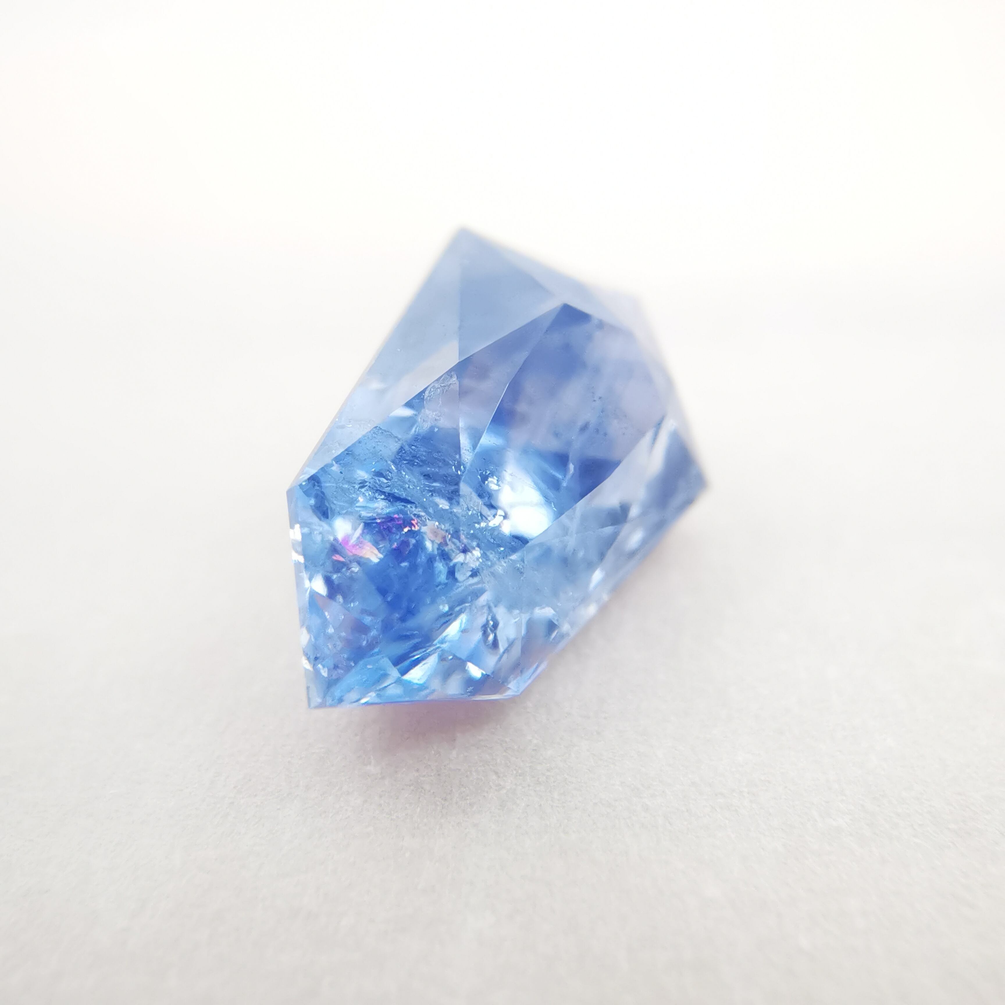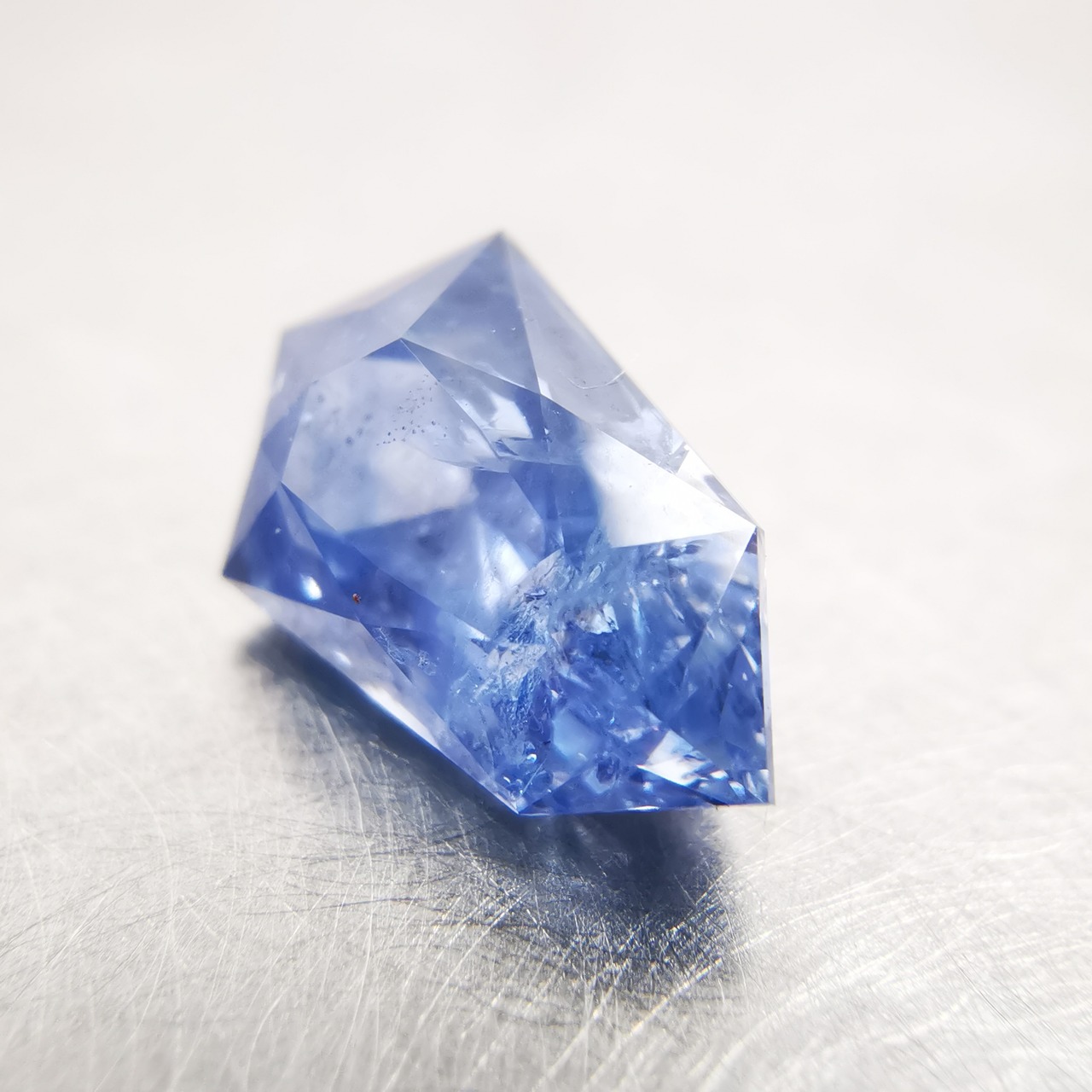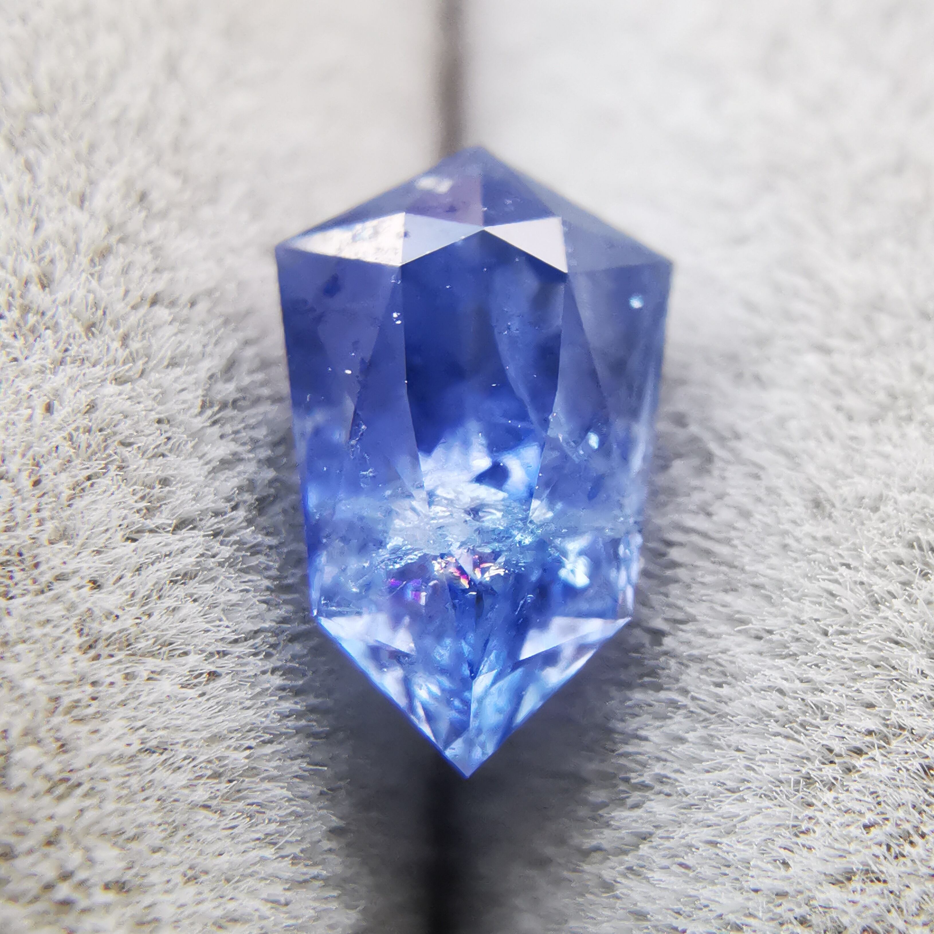 シールドカットの先端にかけて、内包物やクラックが多数あり、シュワシュワとした光の中に時折、虹が見えます。