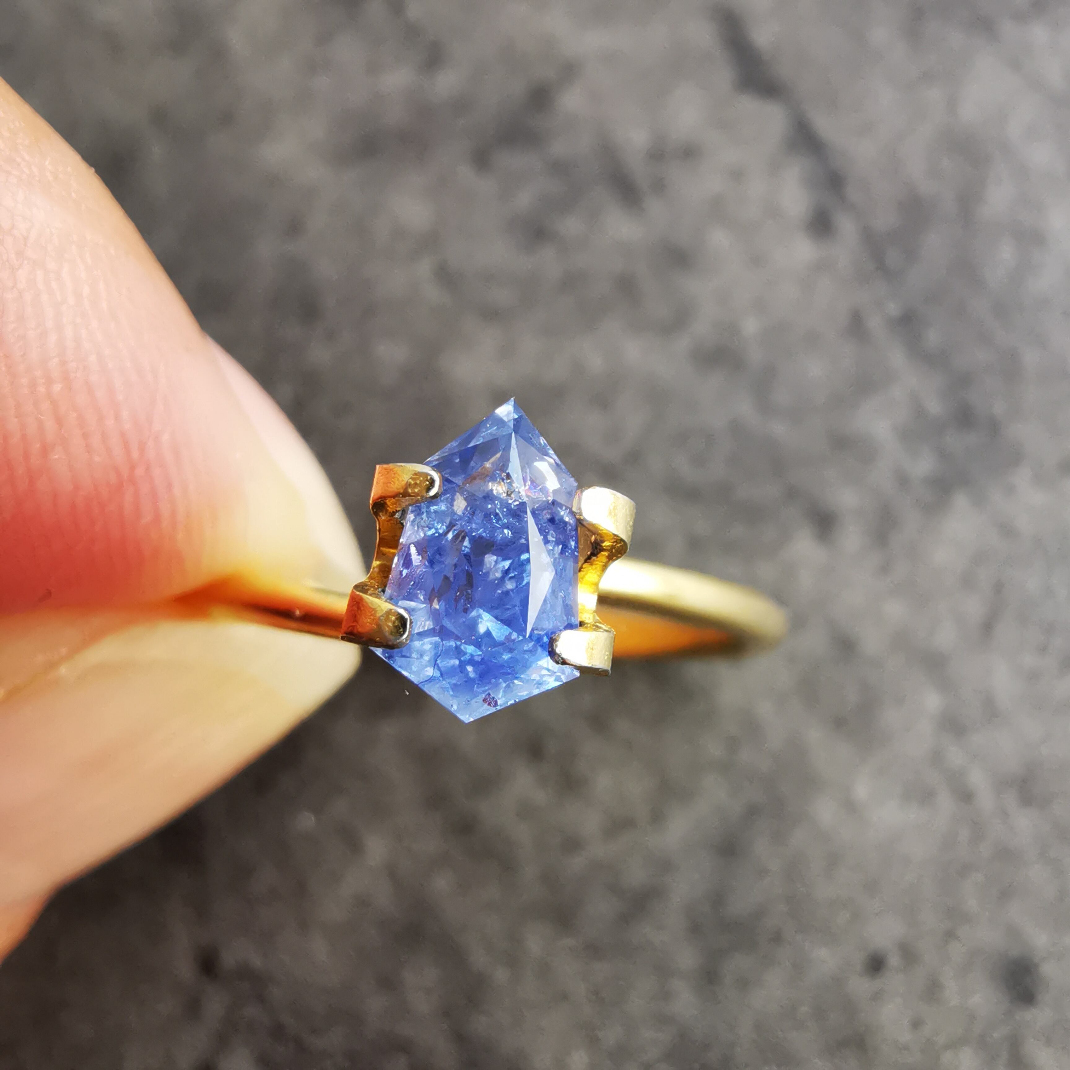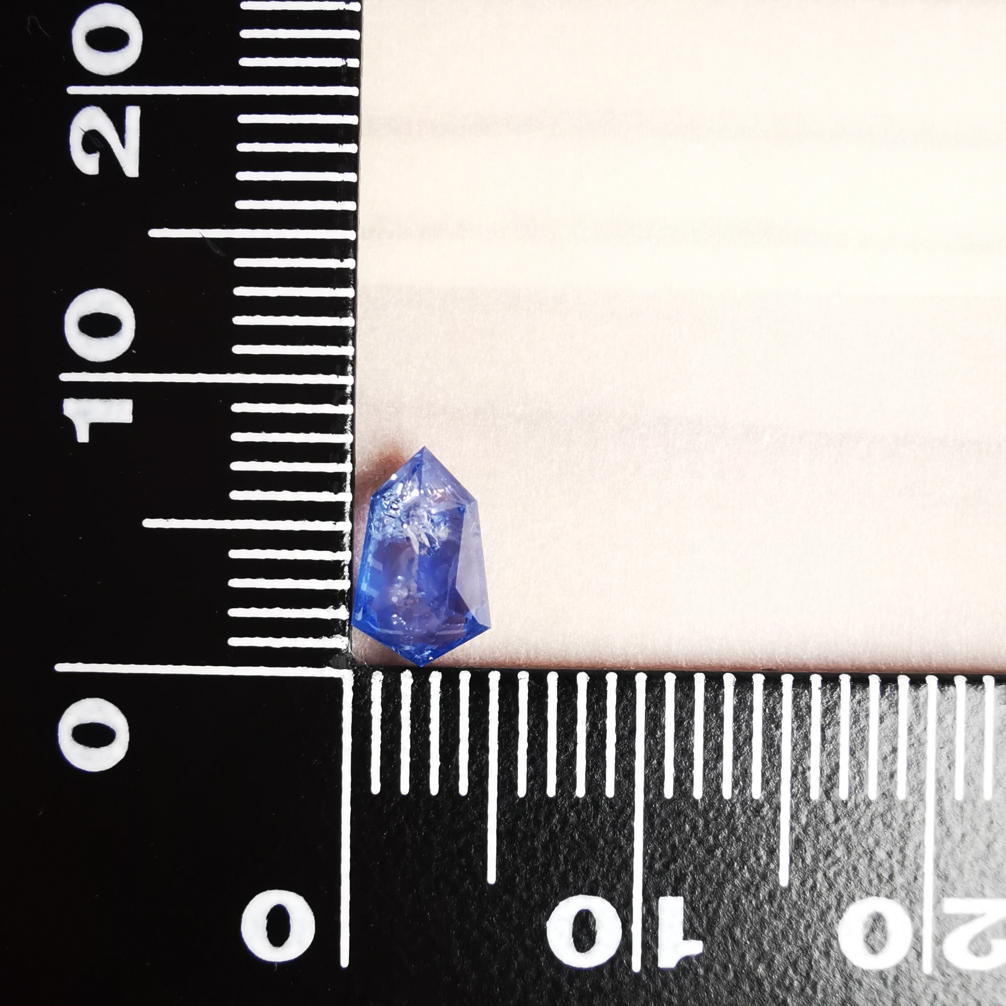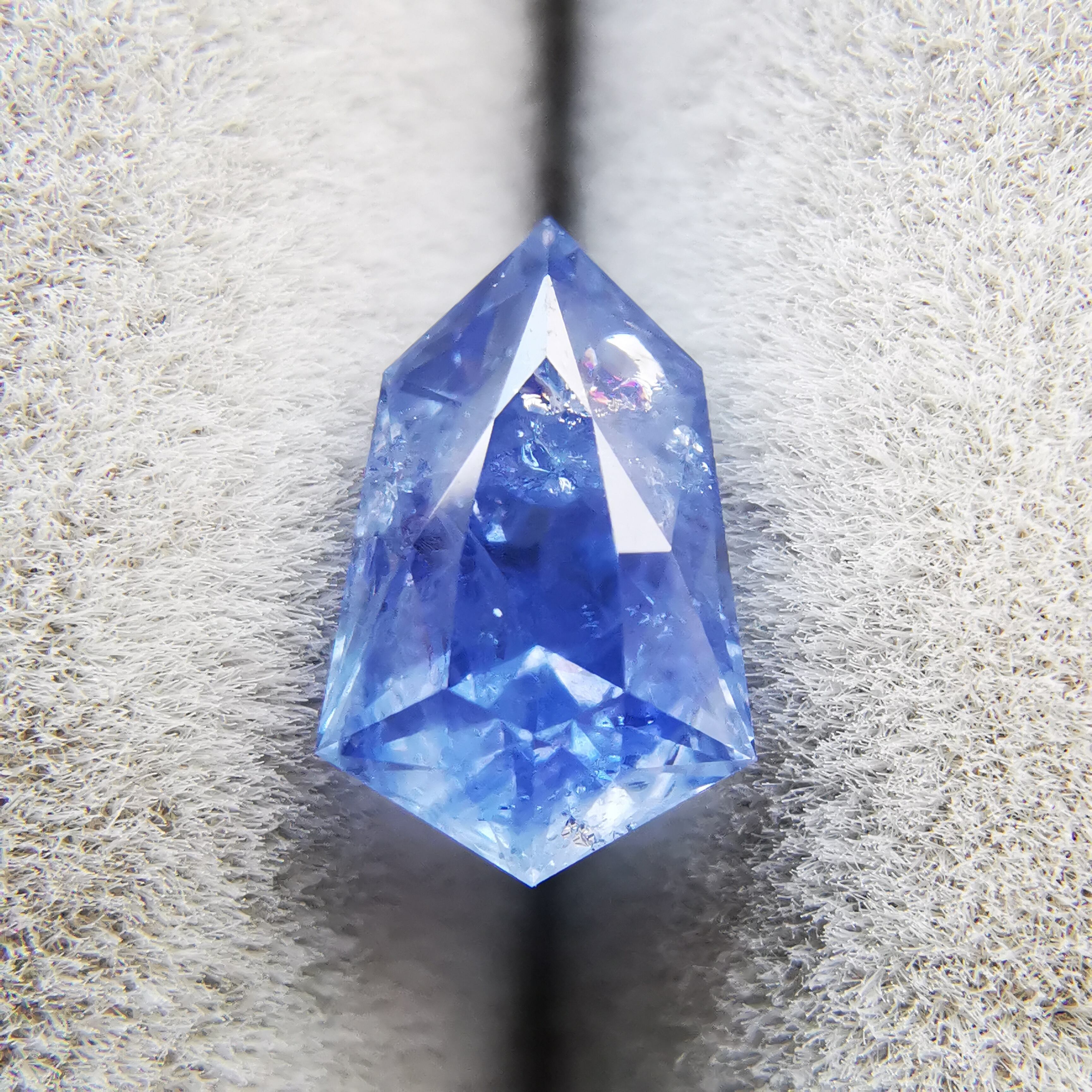 シールドカットの先端にかけて、内包物やクラックが多数あり、シュワシュワとした光の中に時折、虹が見えます。