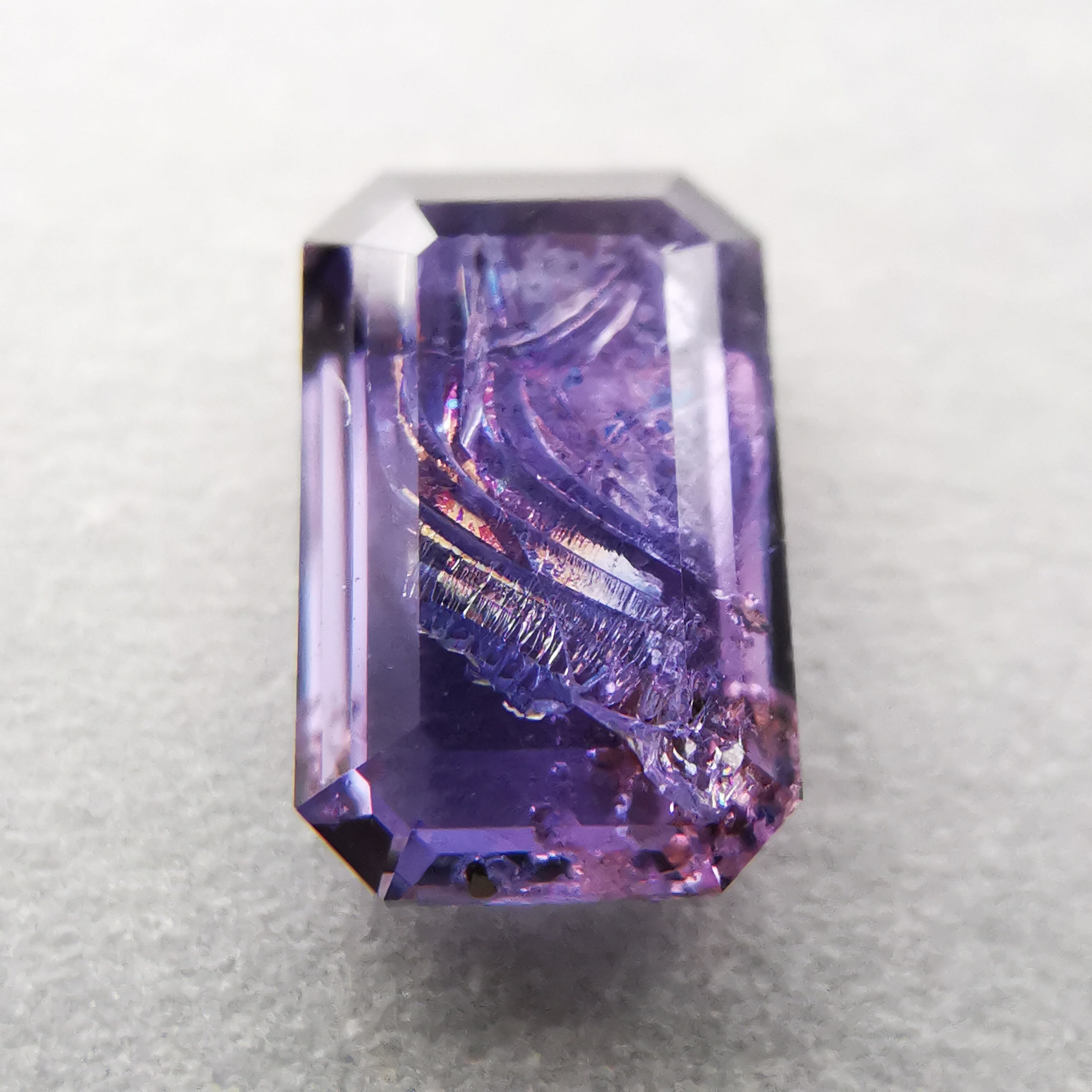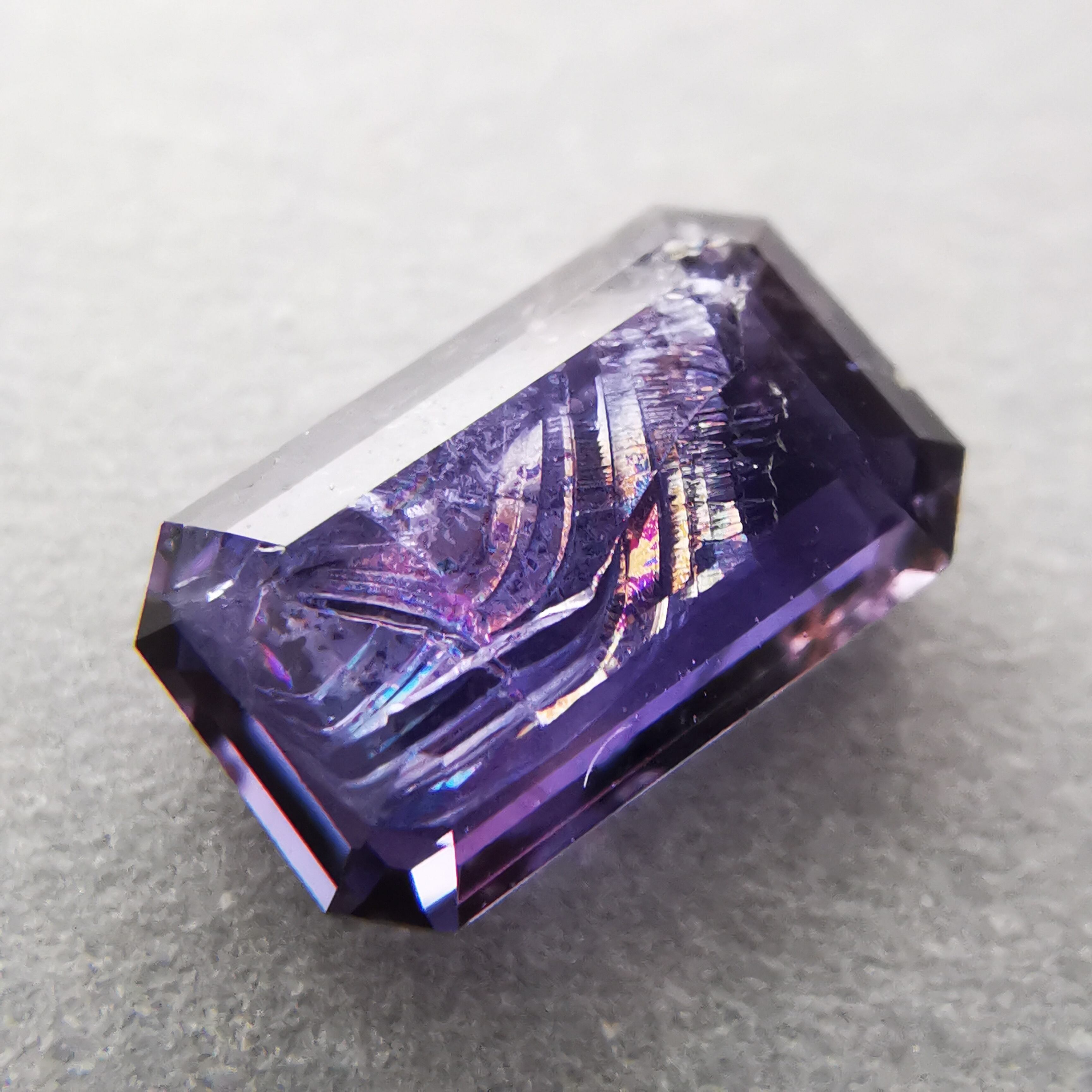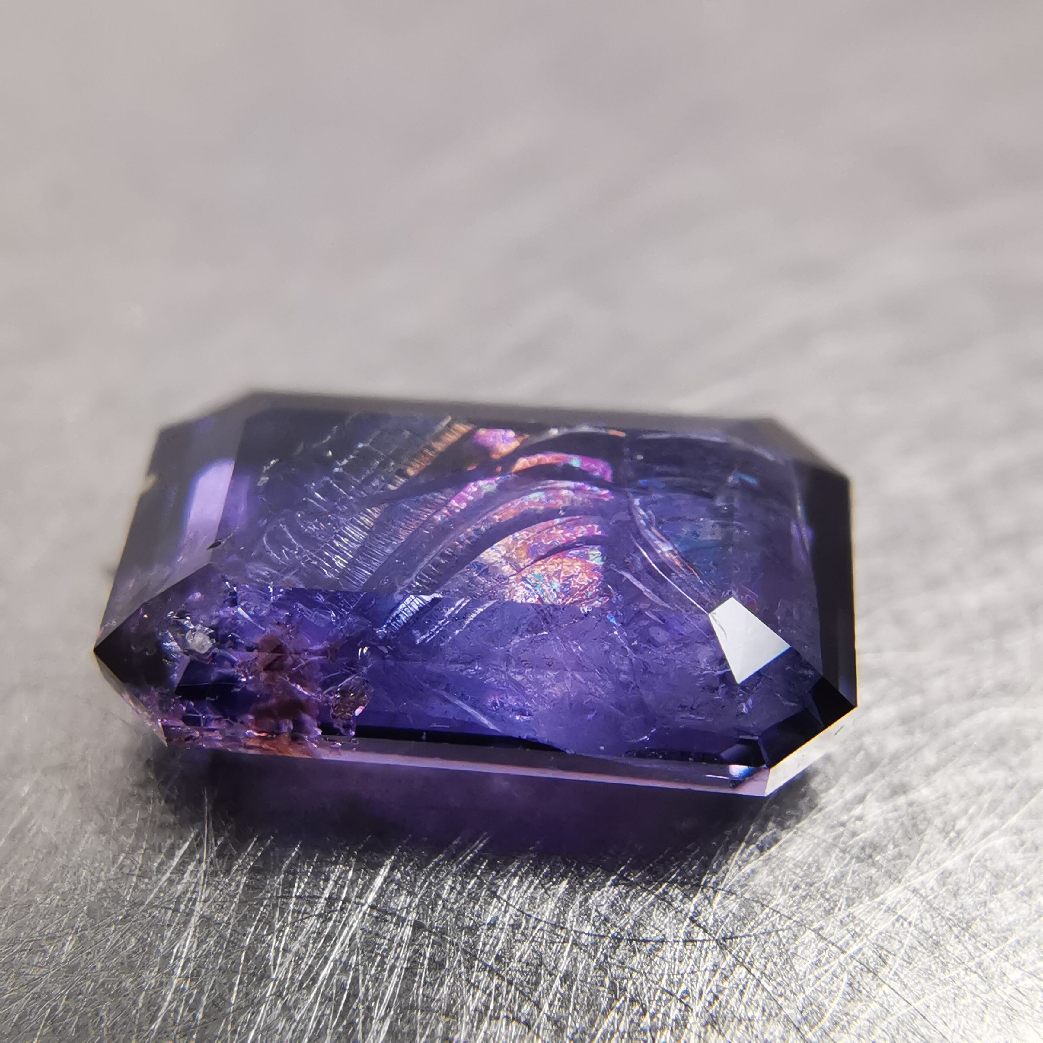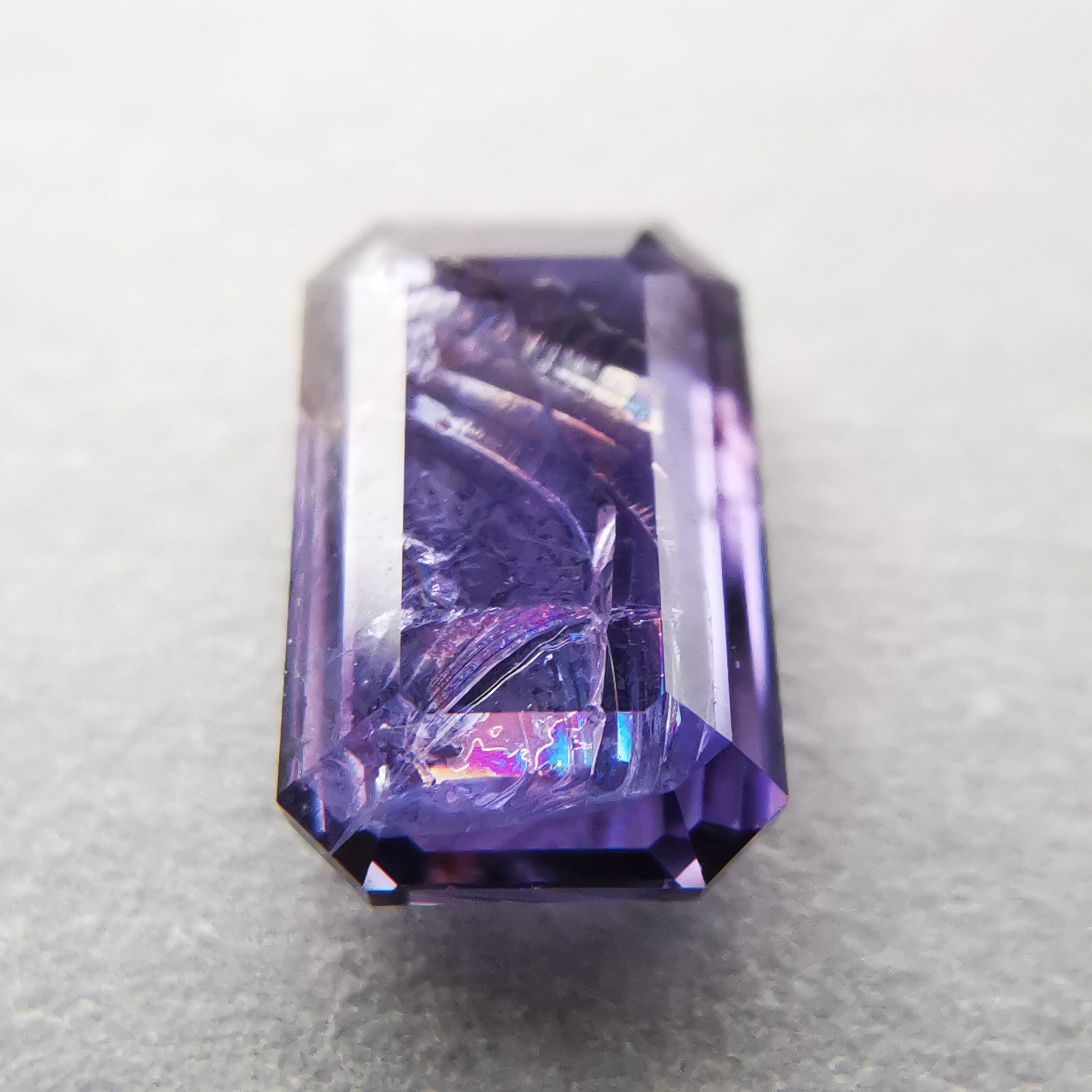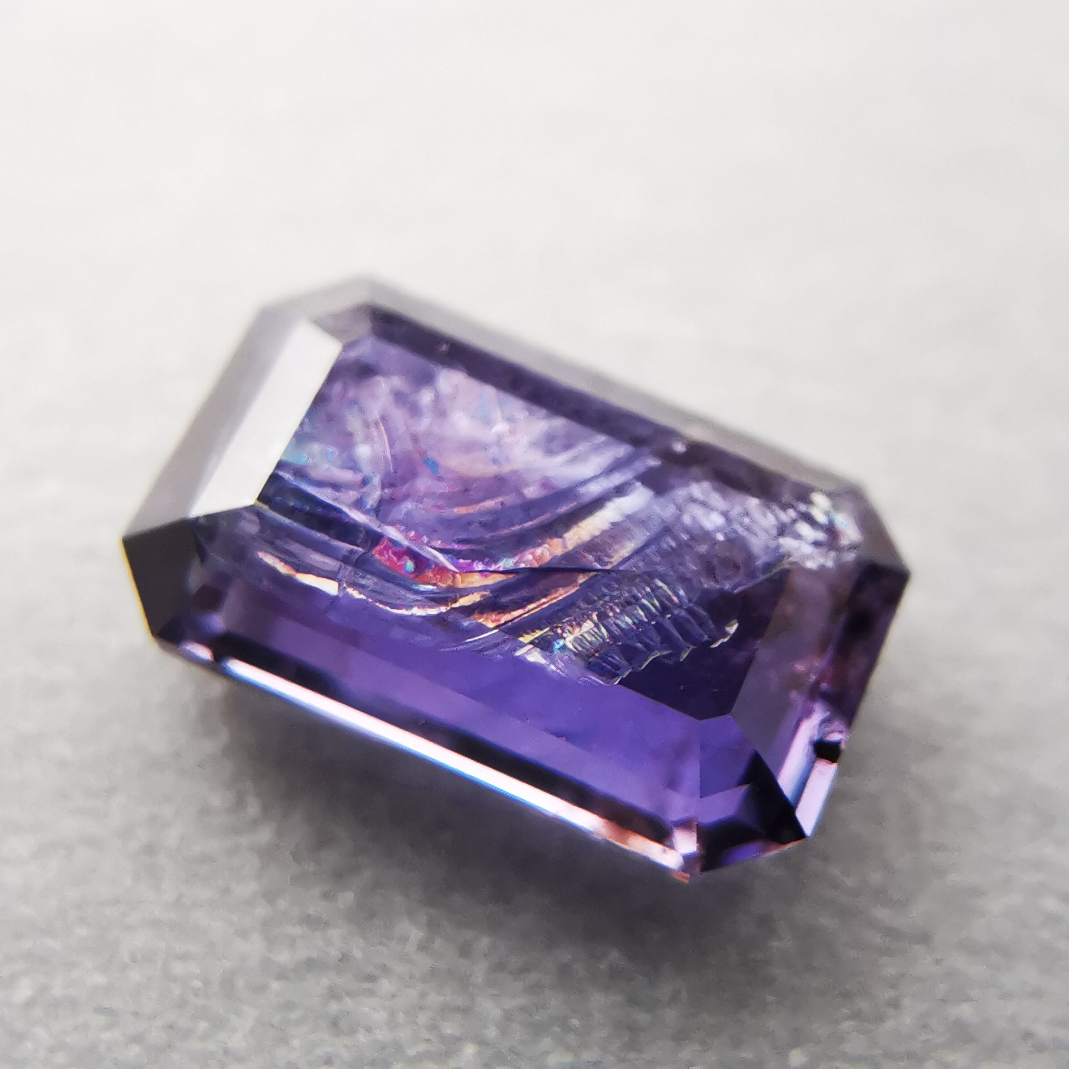 落ち着いたバイオレットカラーのサファイアが虹で満たされています。