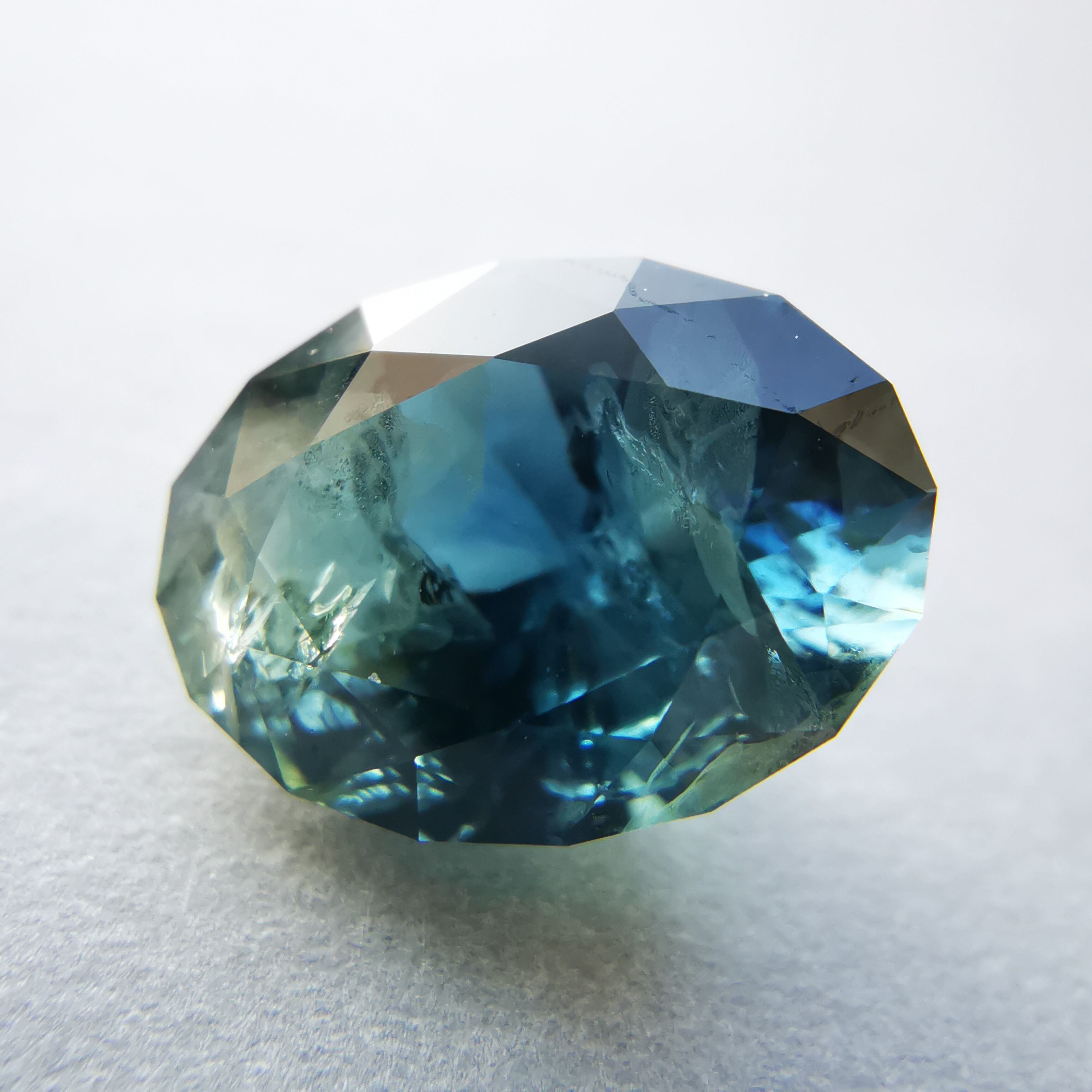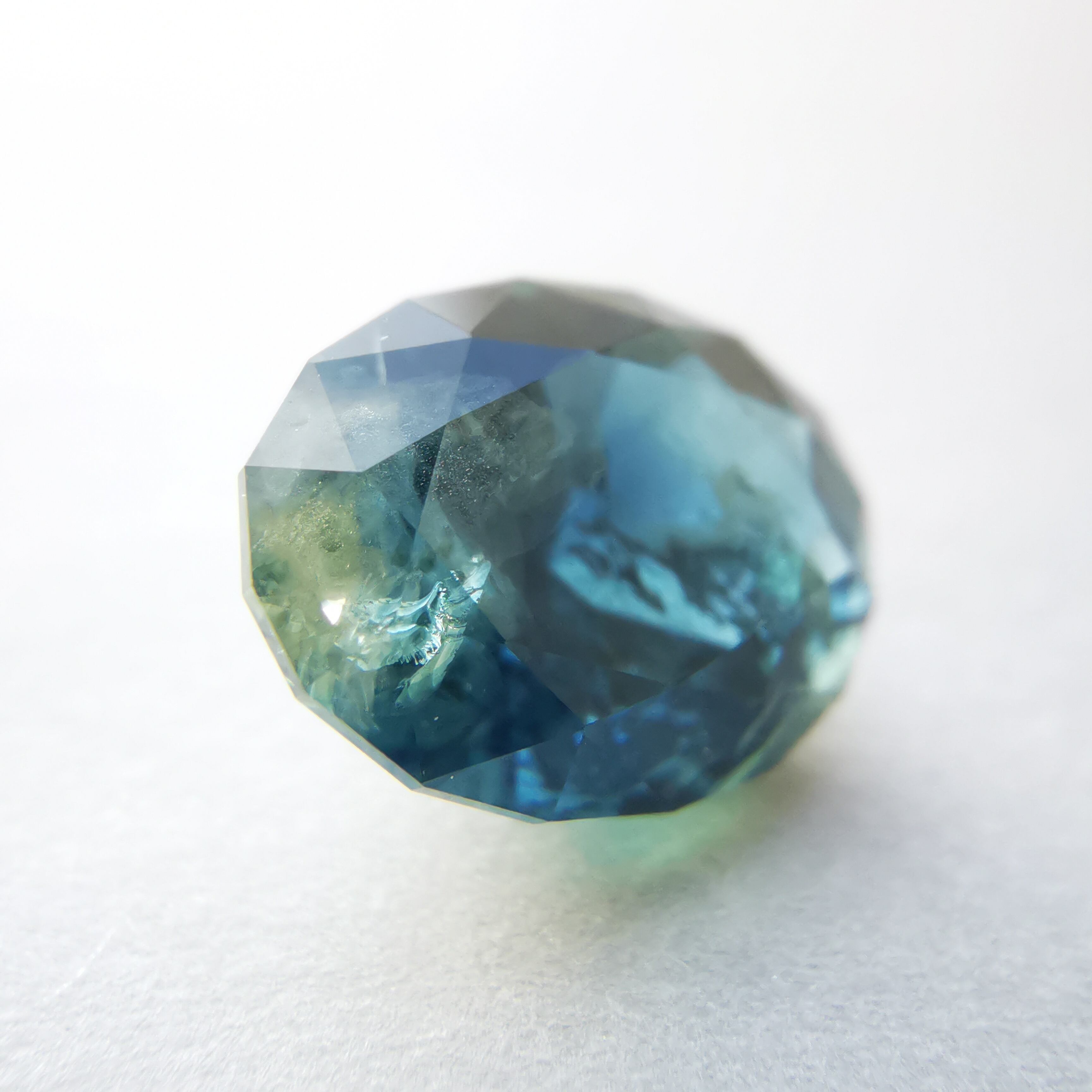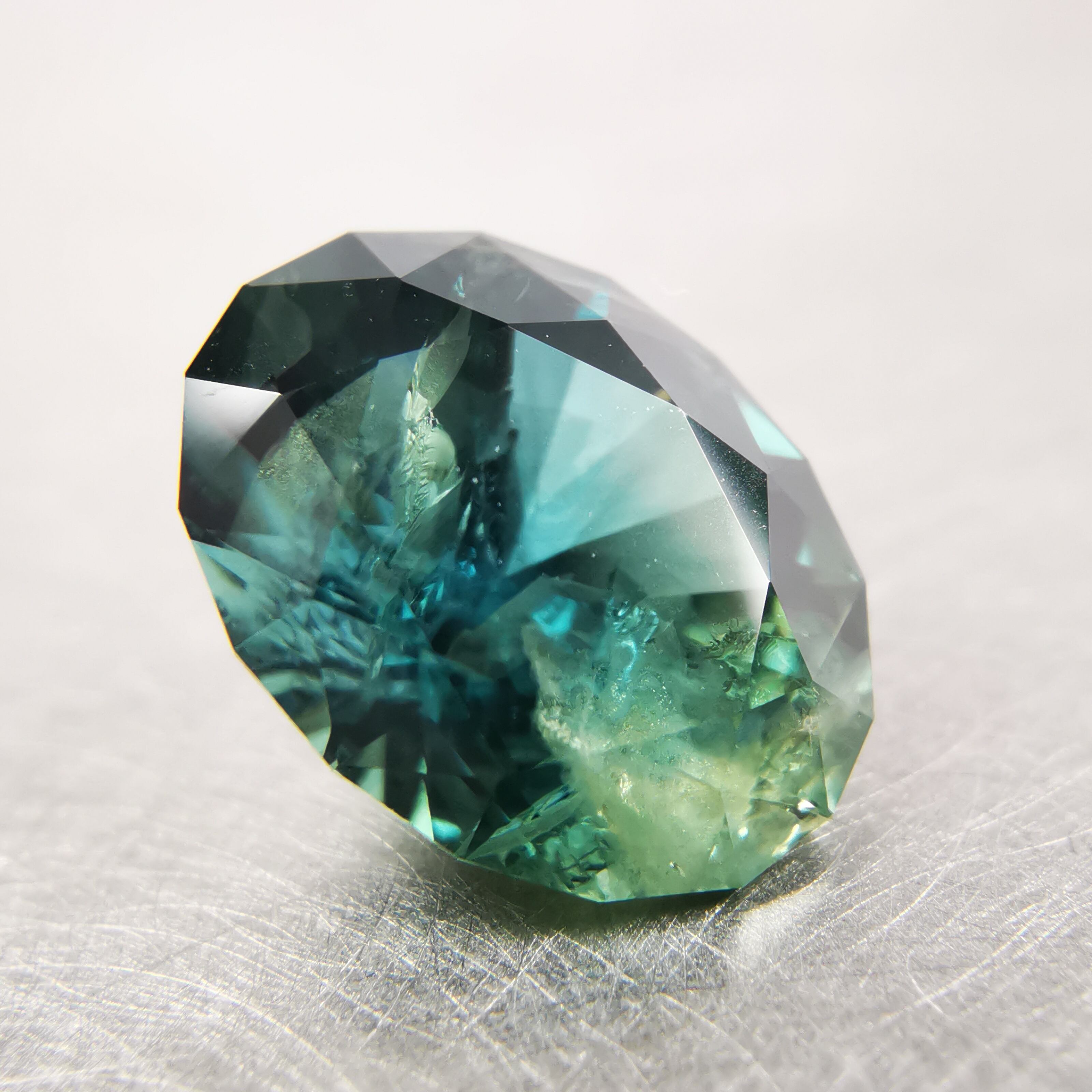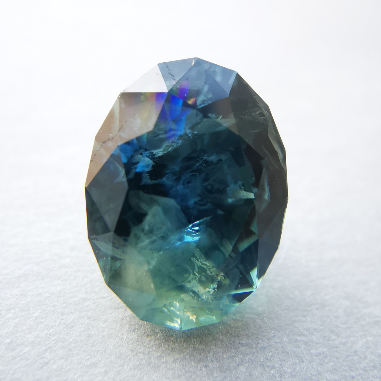 深いグリーンの中に、ブルー、イエローが混在し、内包物とクラックがたっぷり入ったサファイアです。