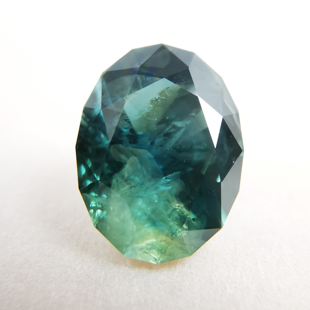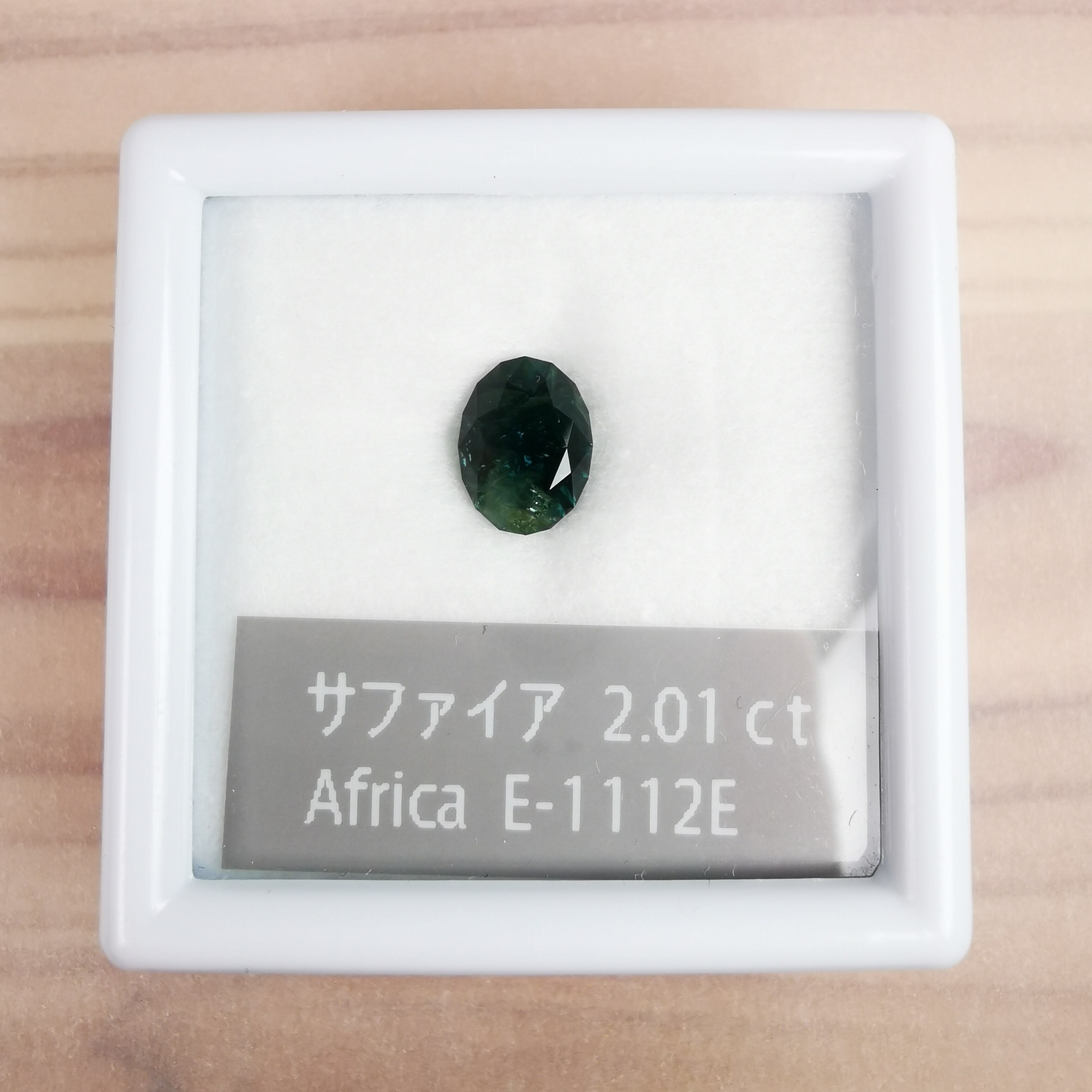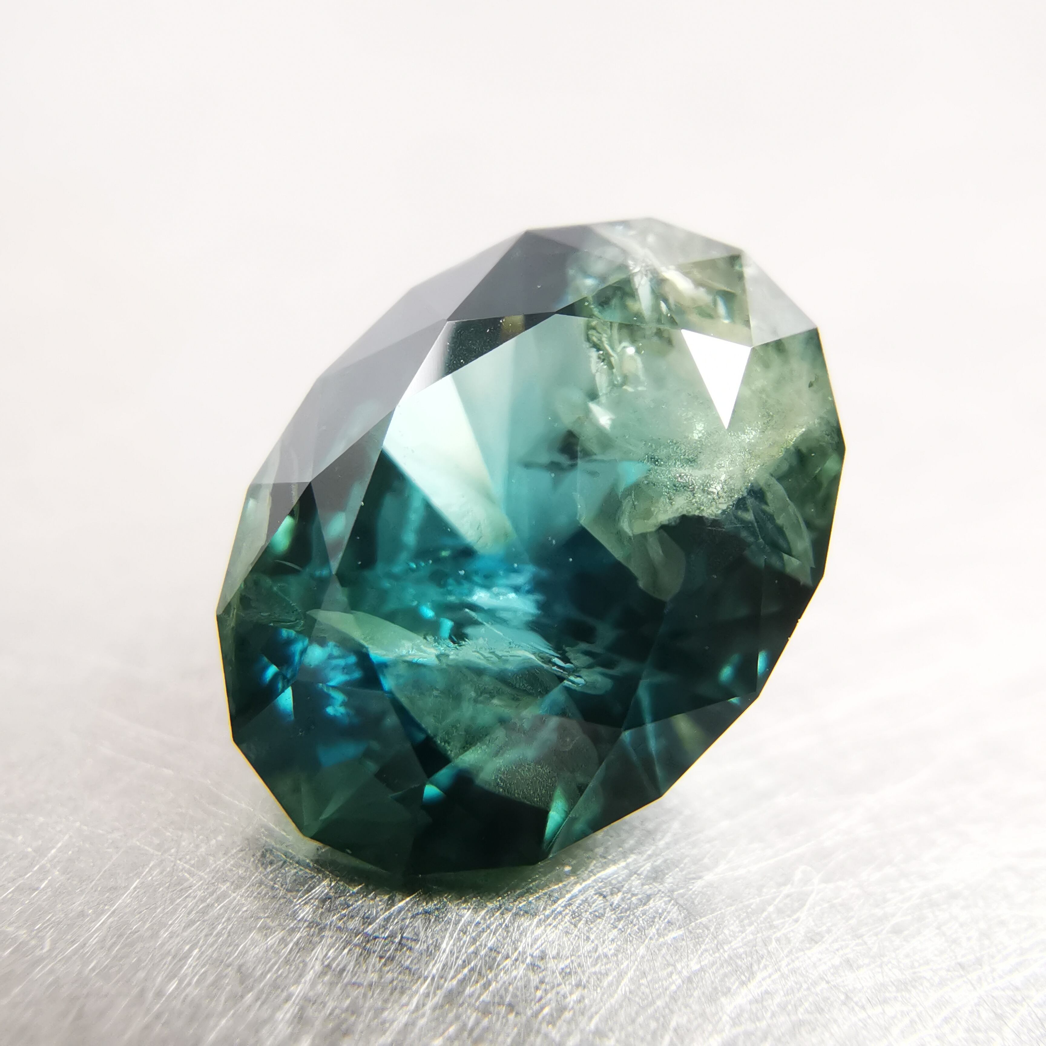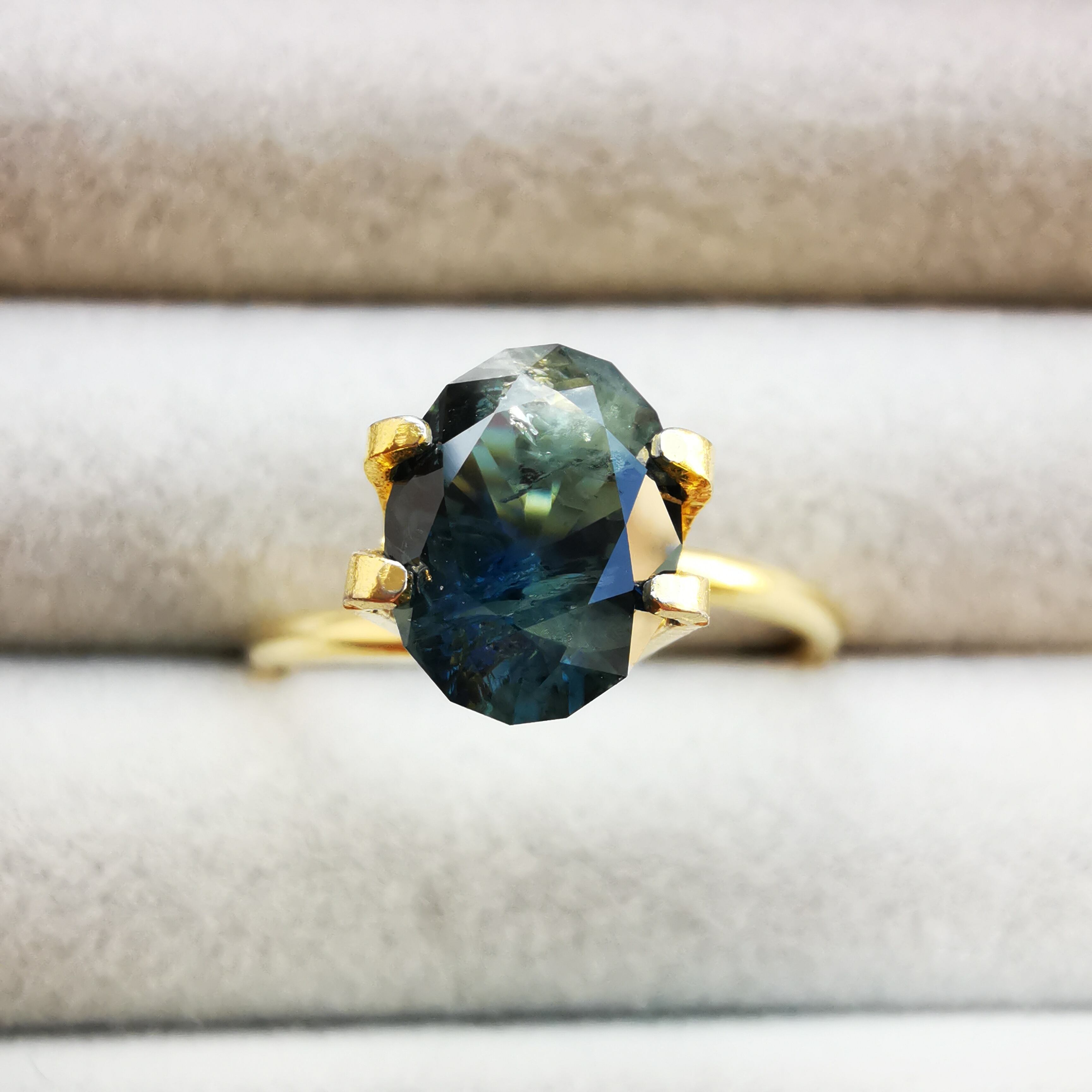 深いグリーンの中に、ブルー、イエローが混在し、内包物とクラックがたっぷり入ったサファイアです。
