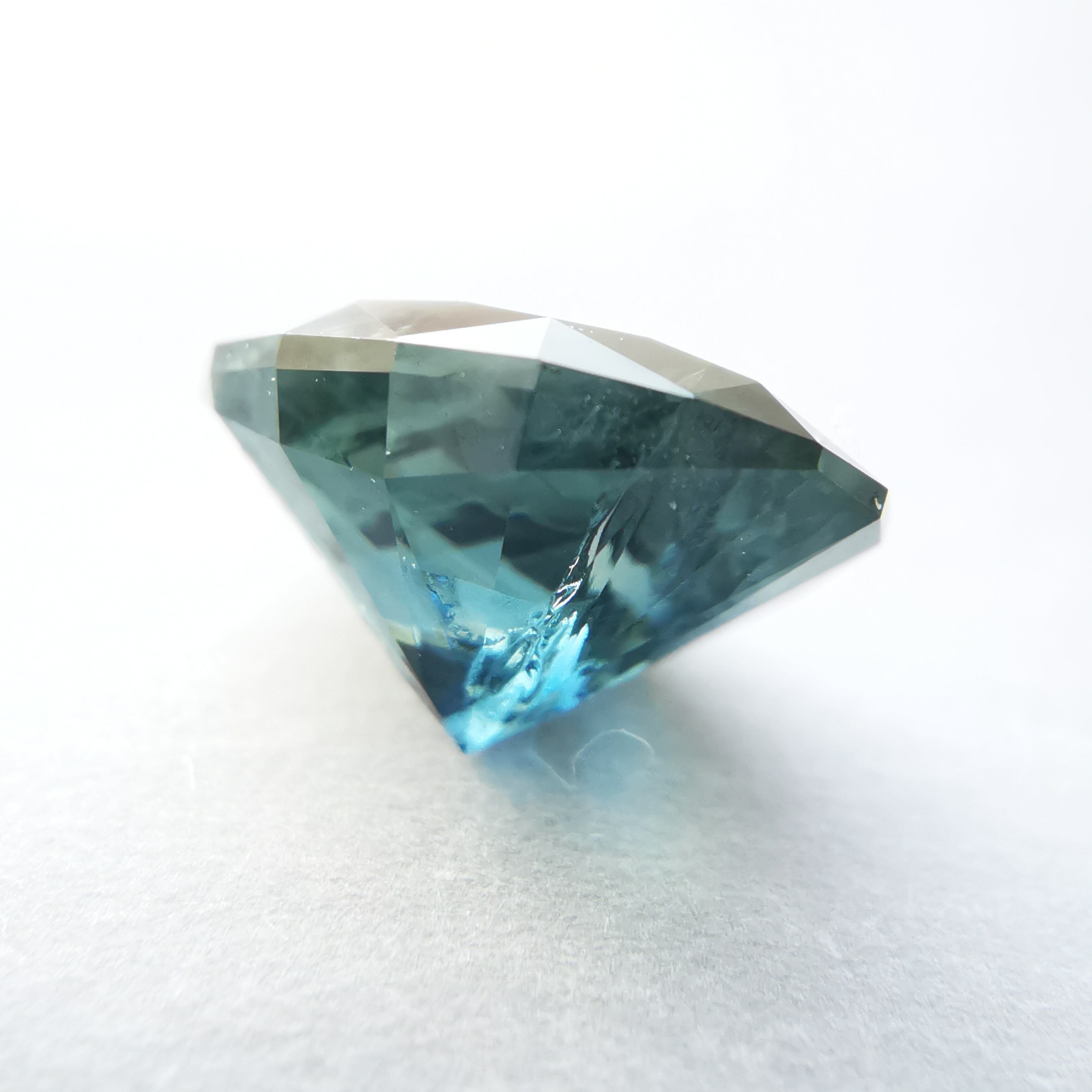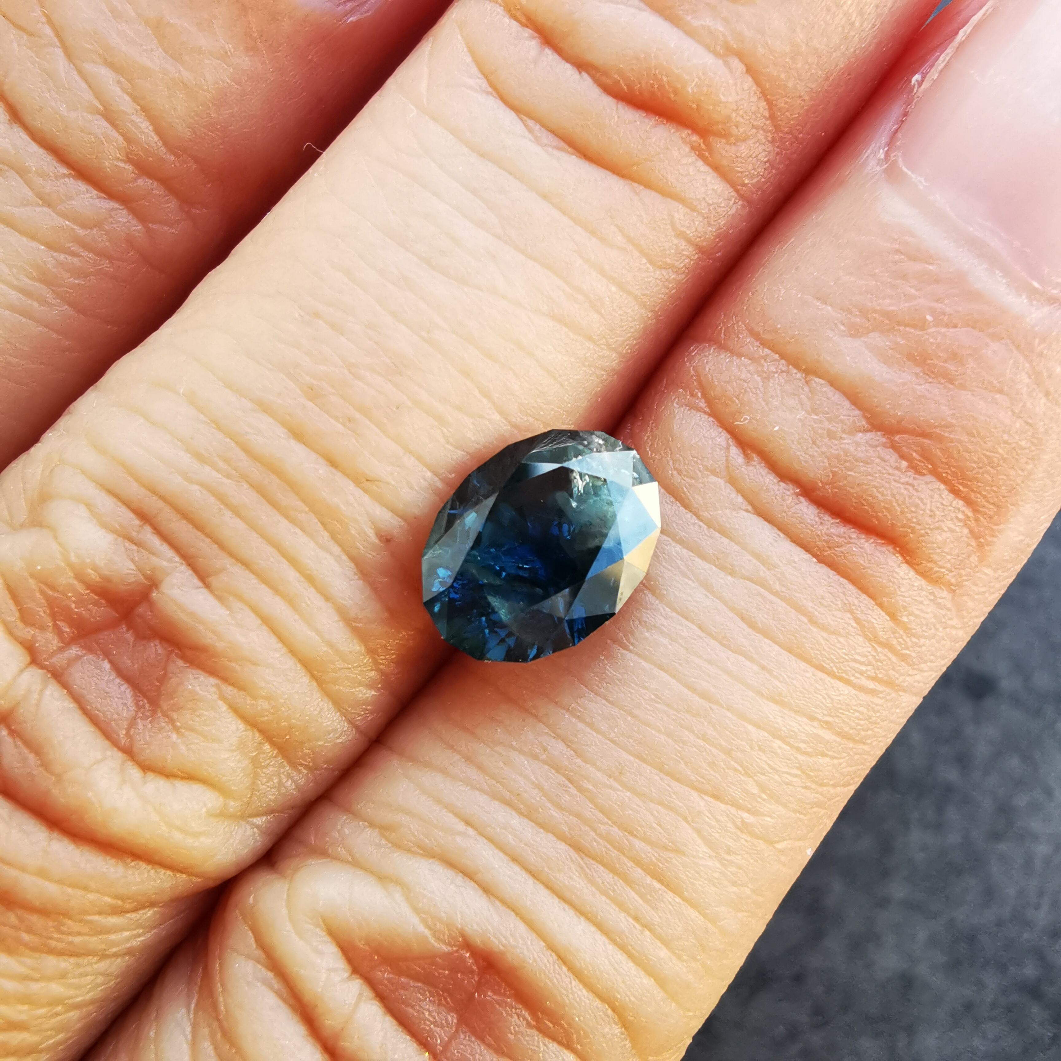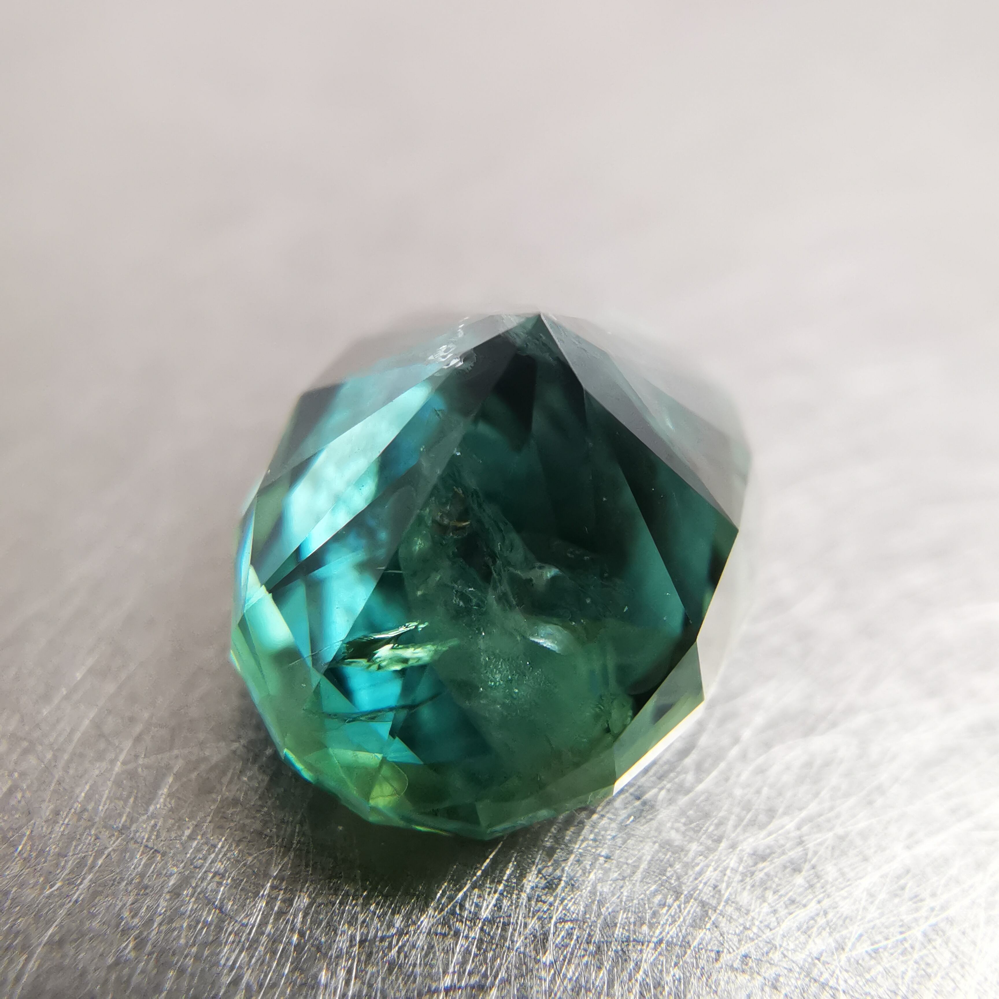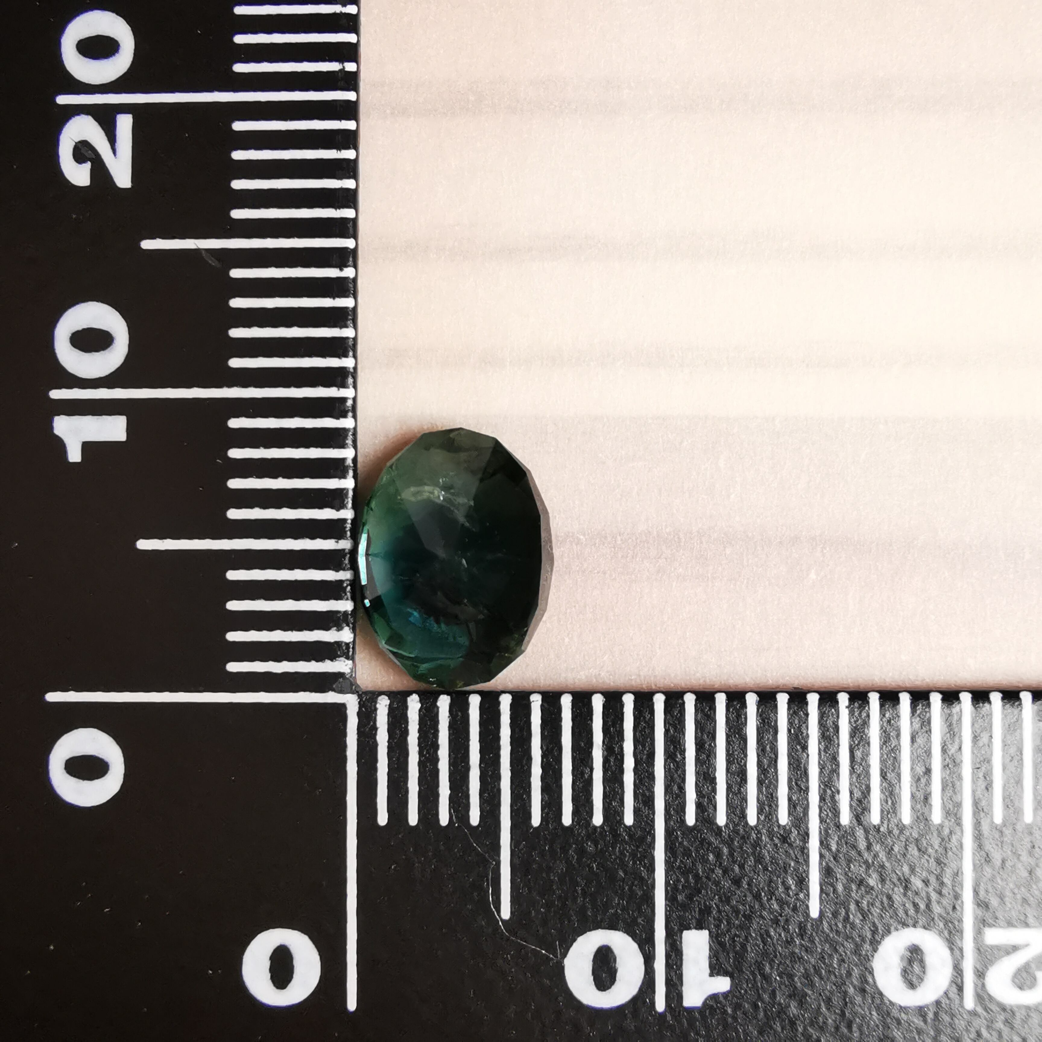 深いグリーンの中に、ブルー、イエローが混在し、内包物とクラックがたっぷり入ったサファイアです。