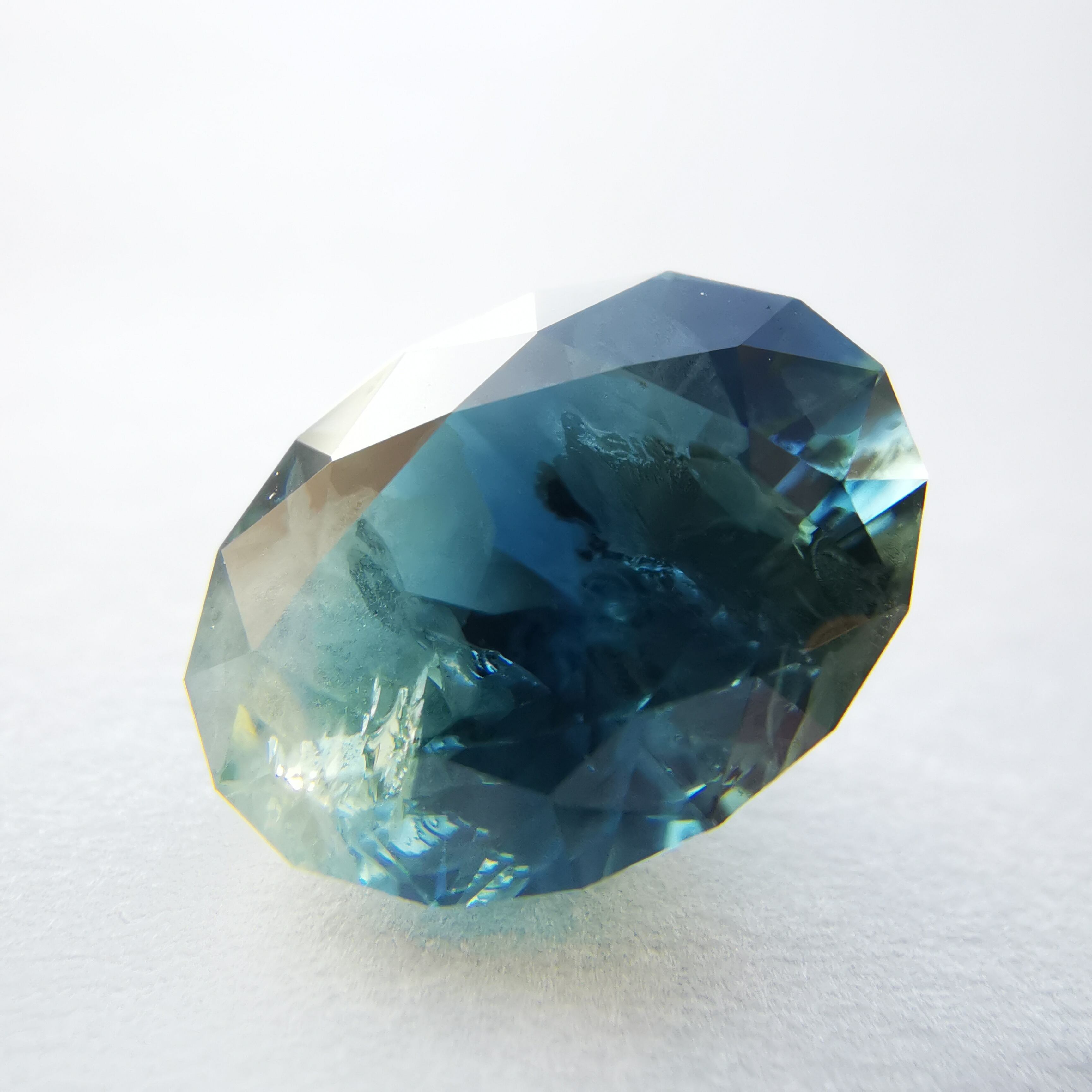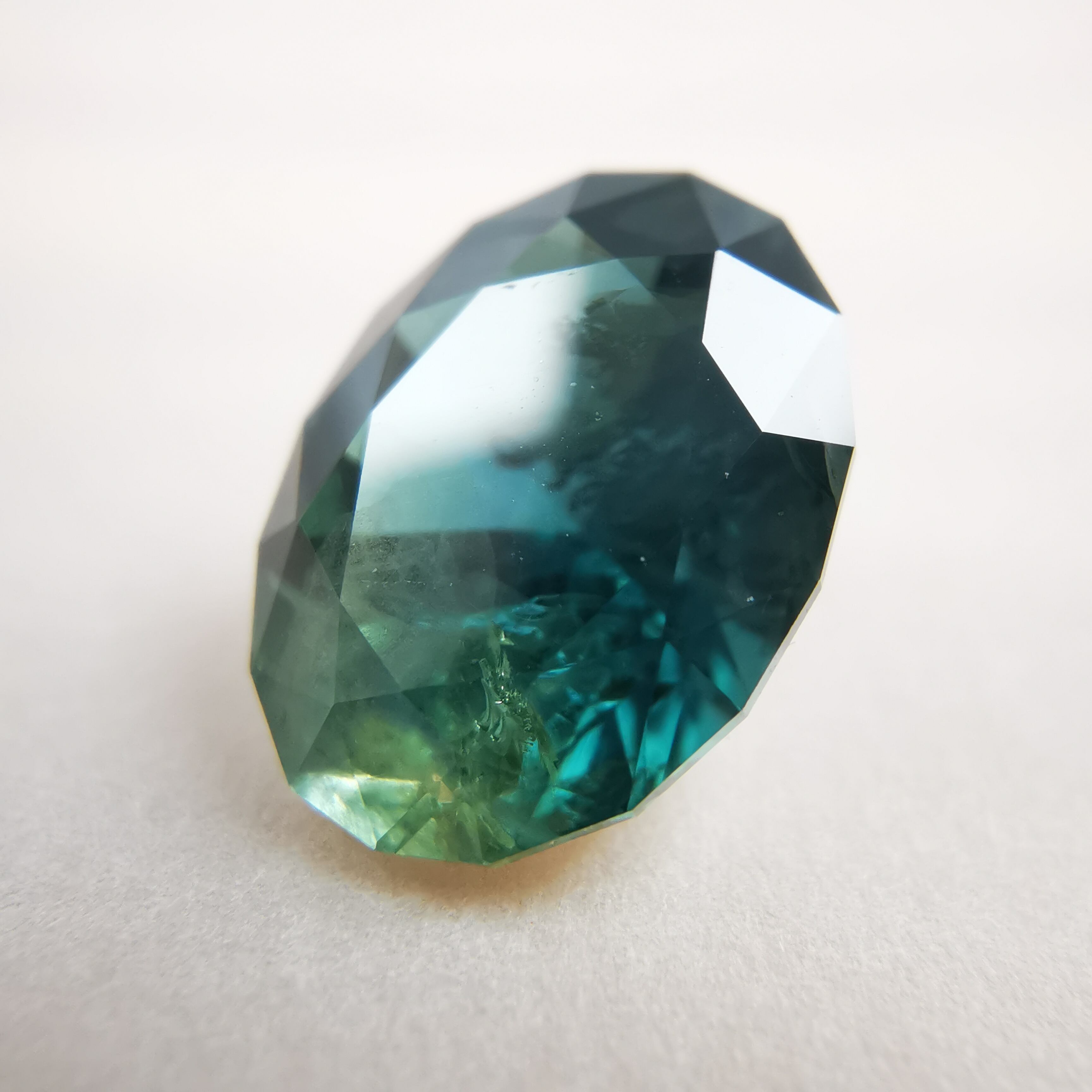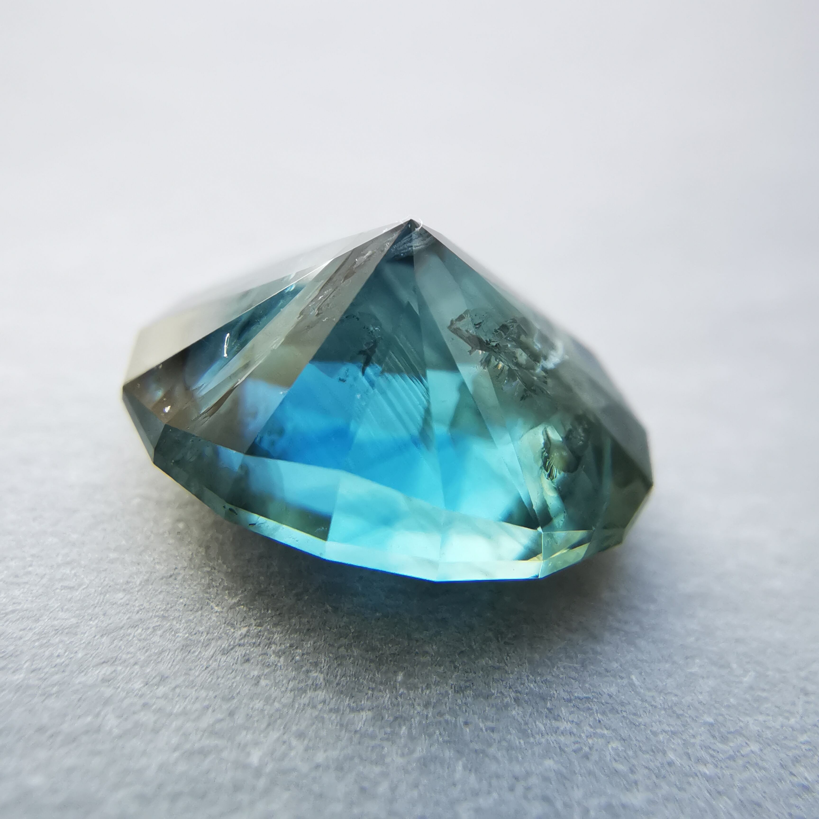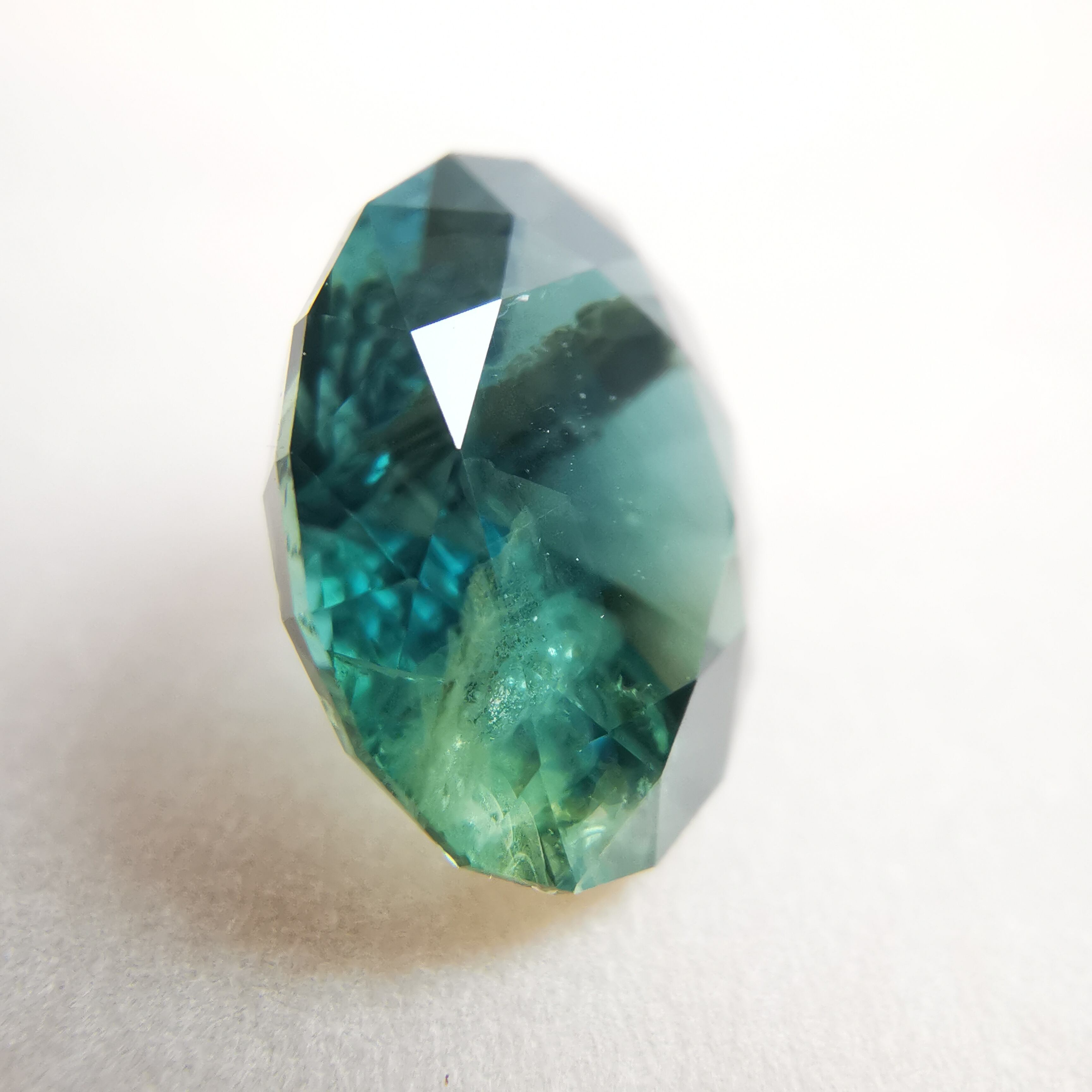 深いグリーンの中に、ブルー、イエローが混在し、内包物とクラックがたっぷり入ったサファイアです。