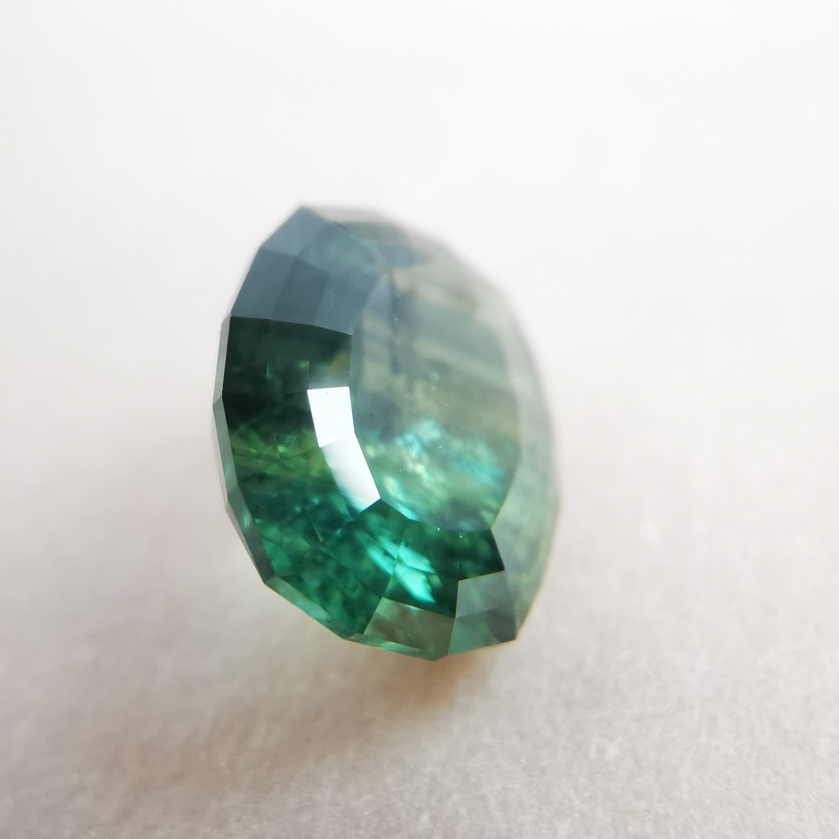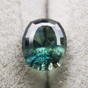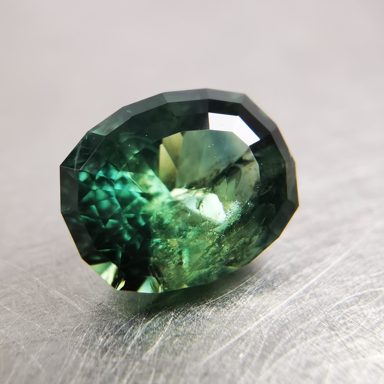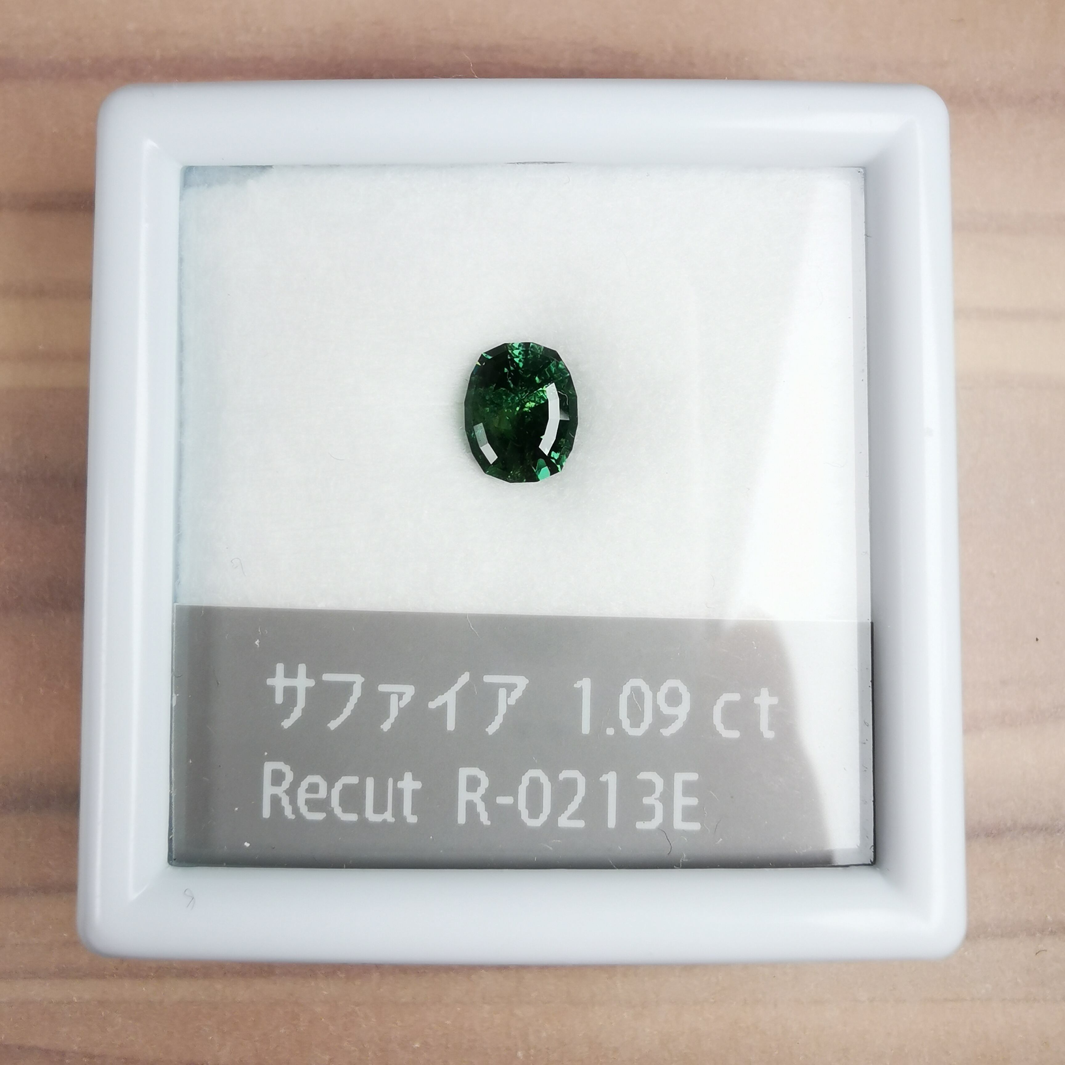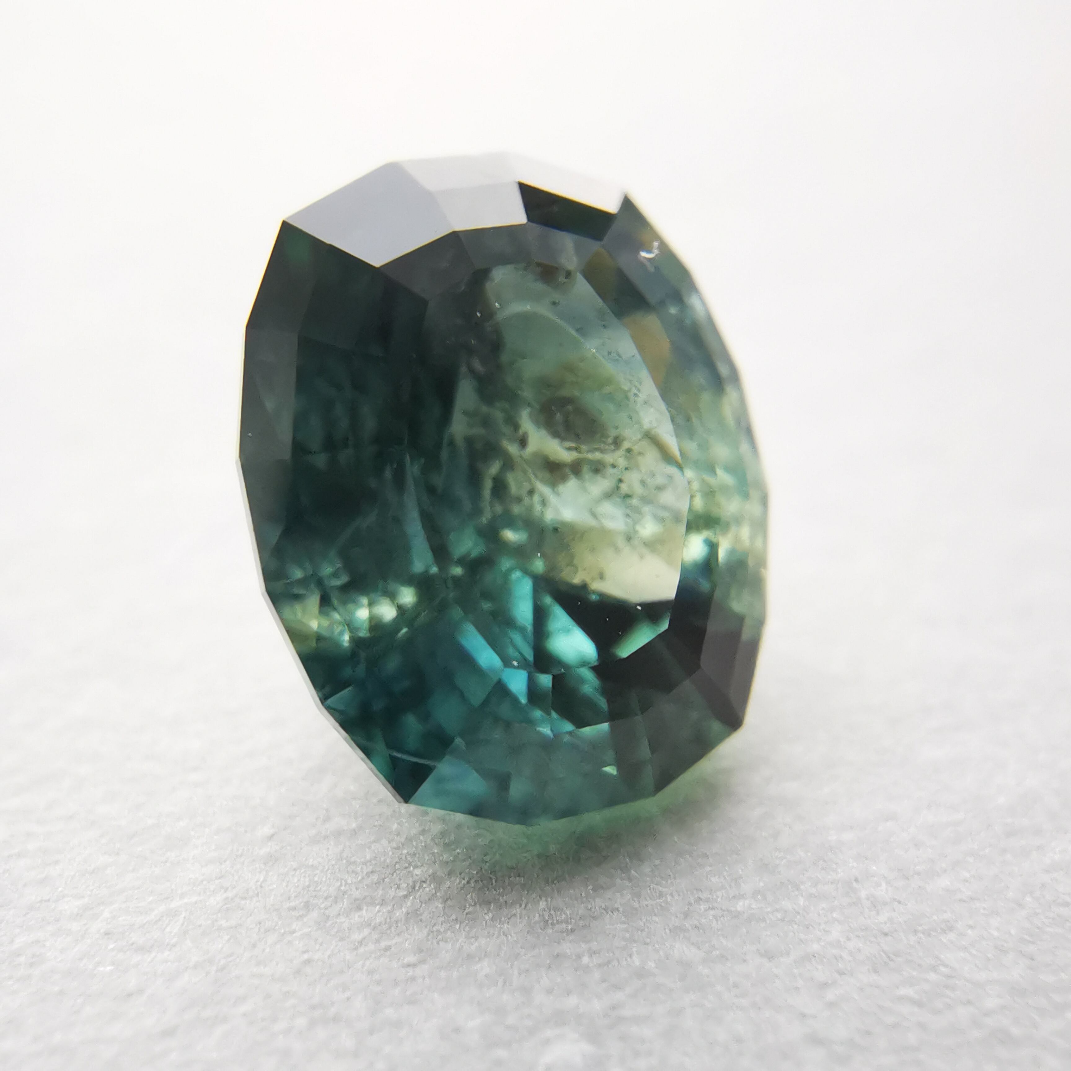 照明の下では深いグリーン、自然光ではグリーンの中にわずかにブルーを感じさせるサファイアです。