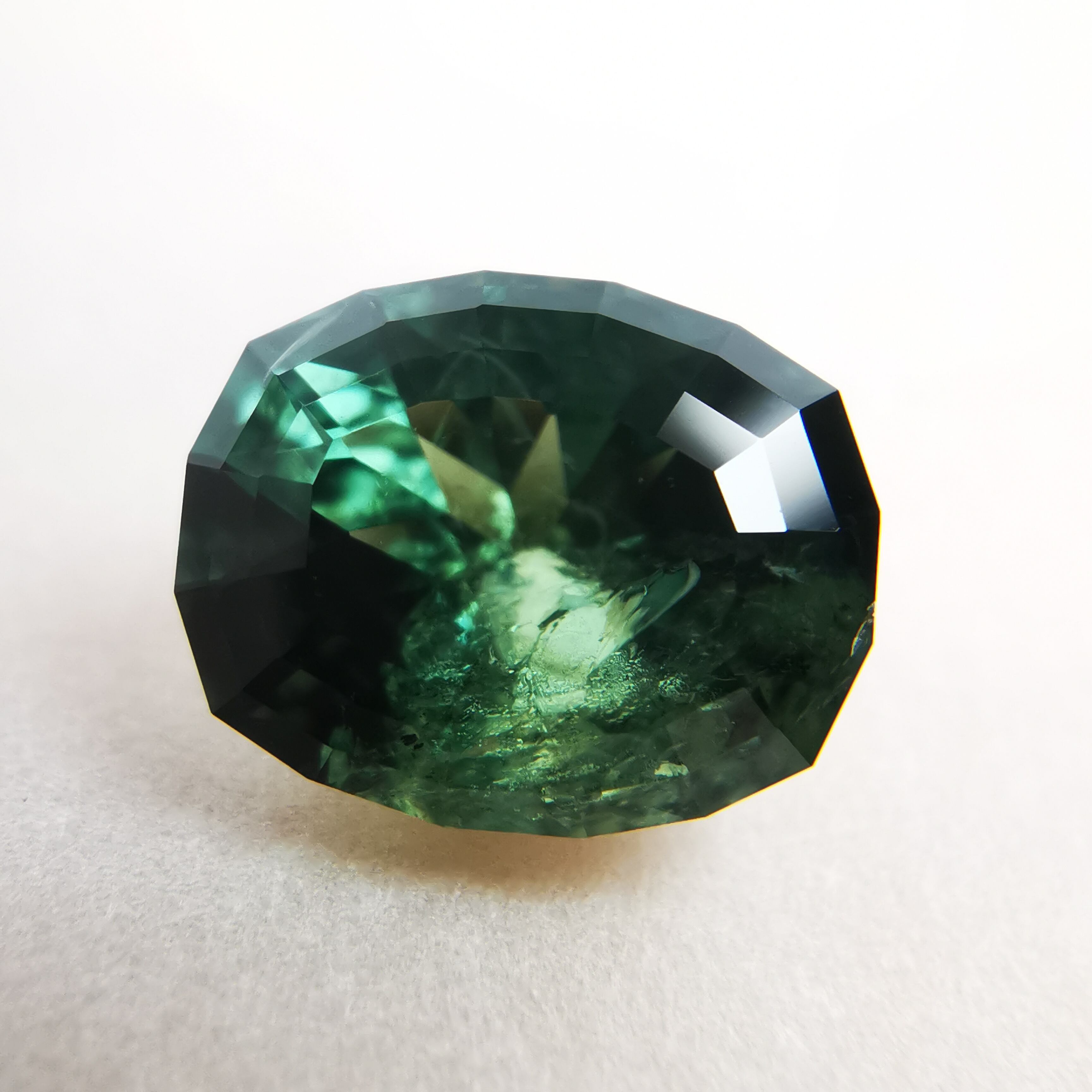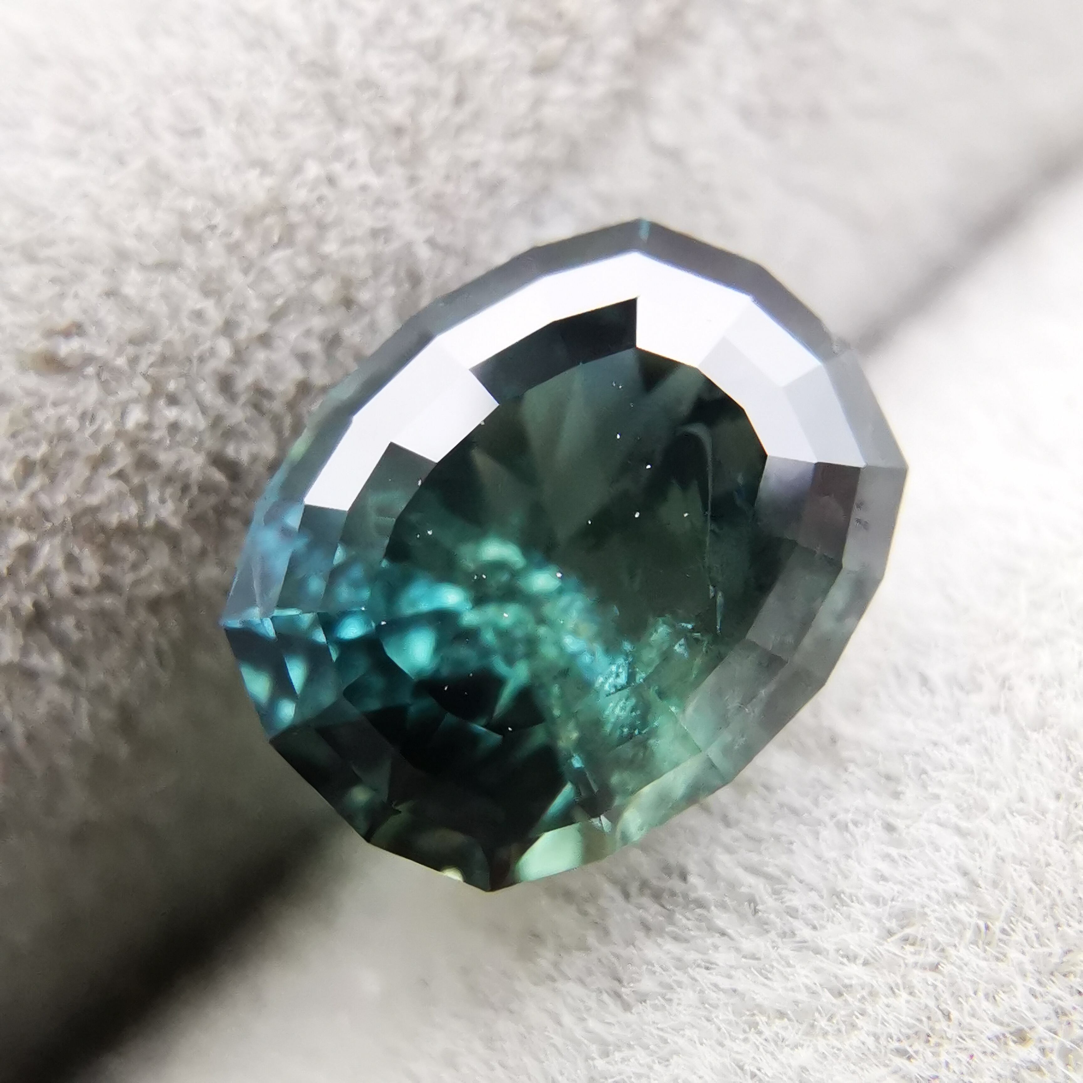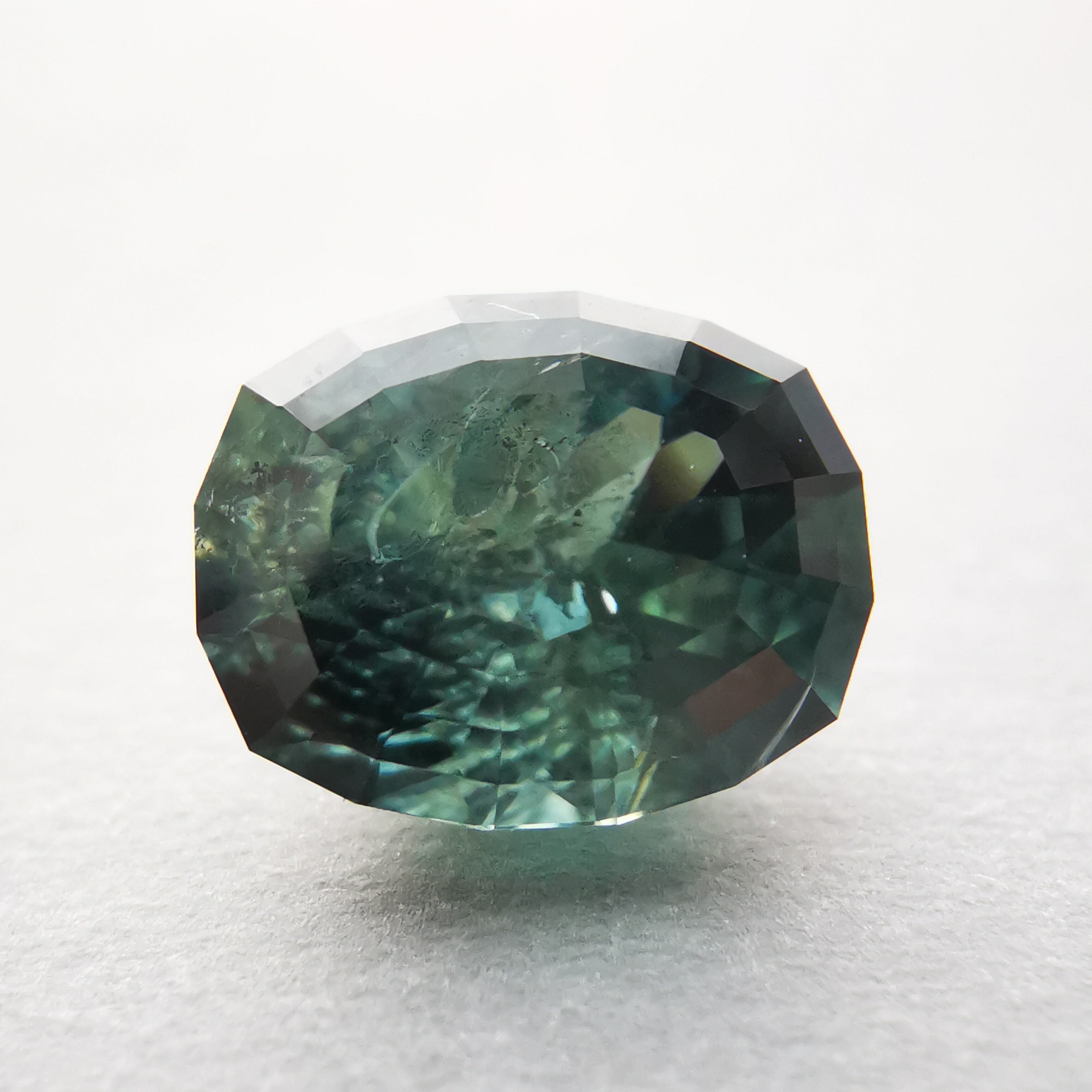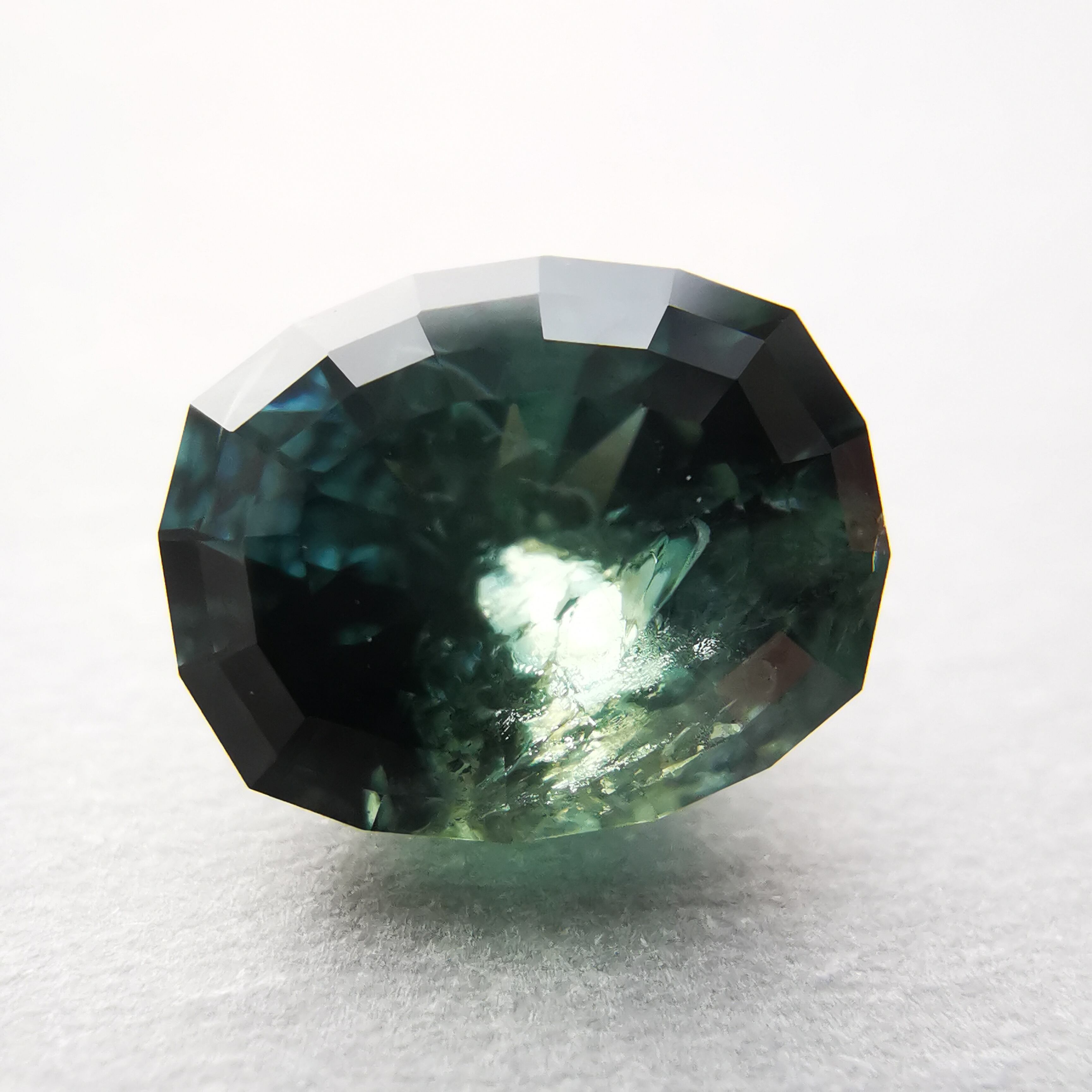 照明の下では深いグリーン、自然光ではグリーンの中にわずかにブルーを感じさせるサファイアです。