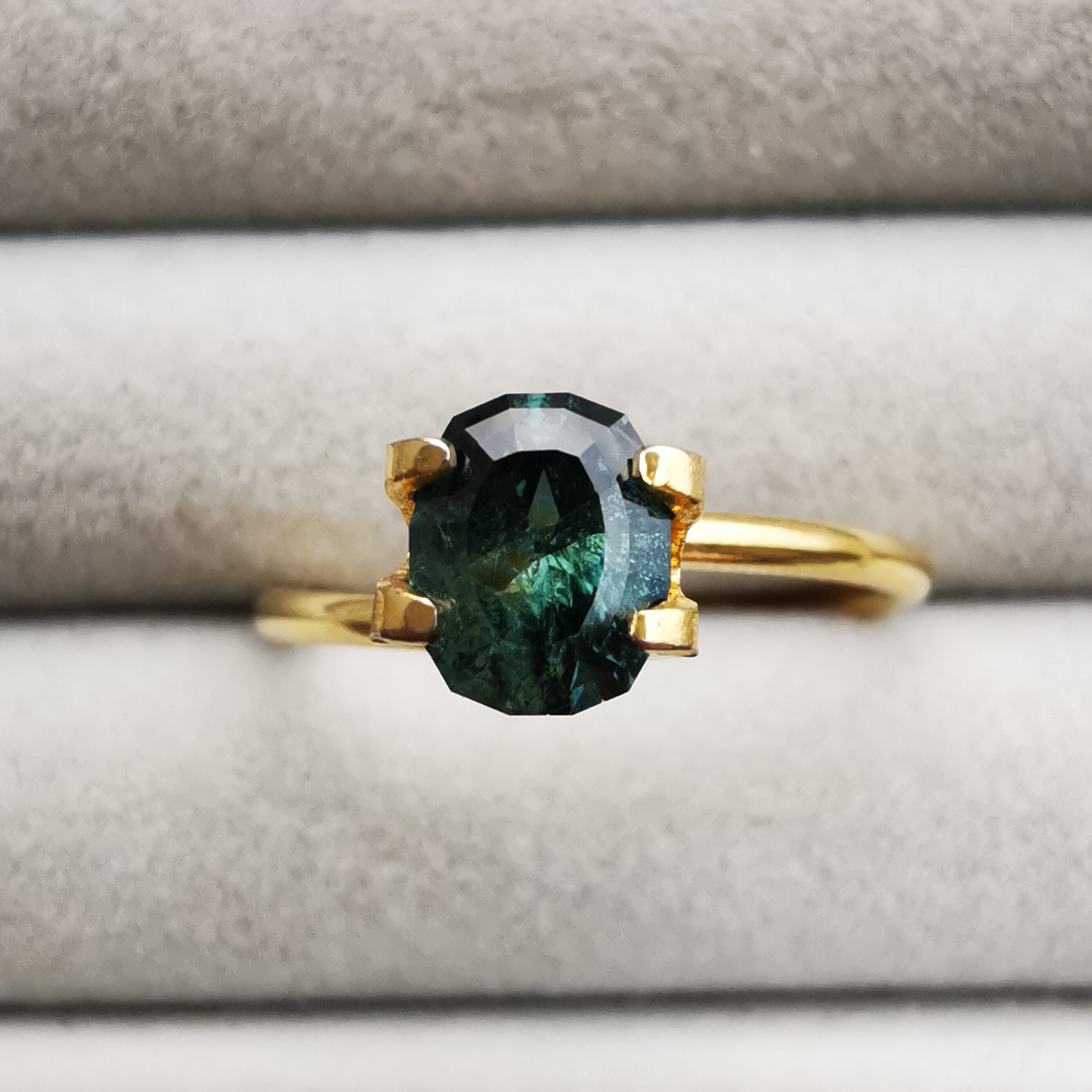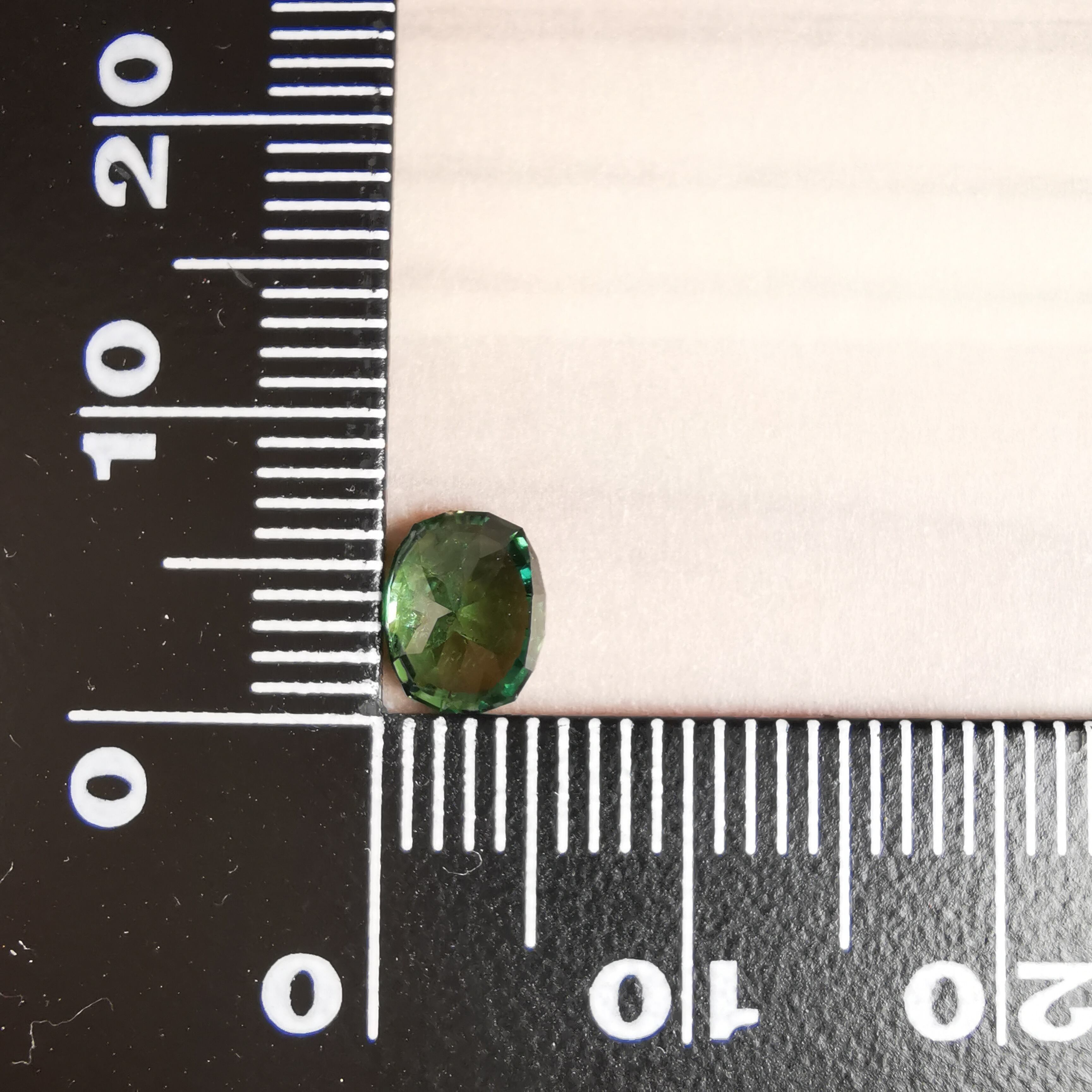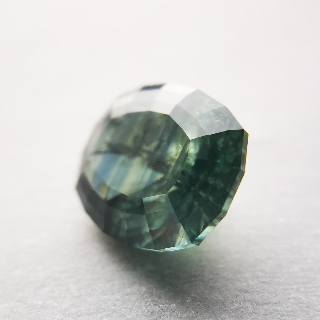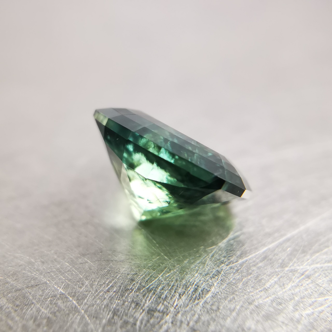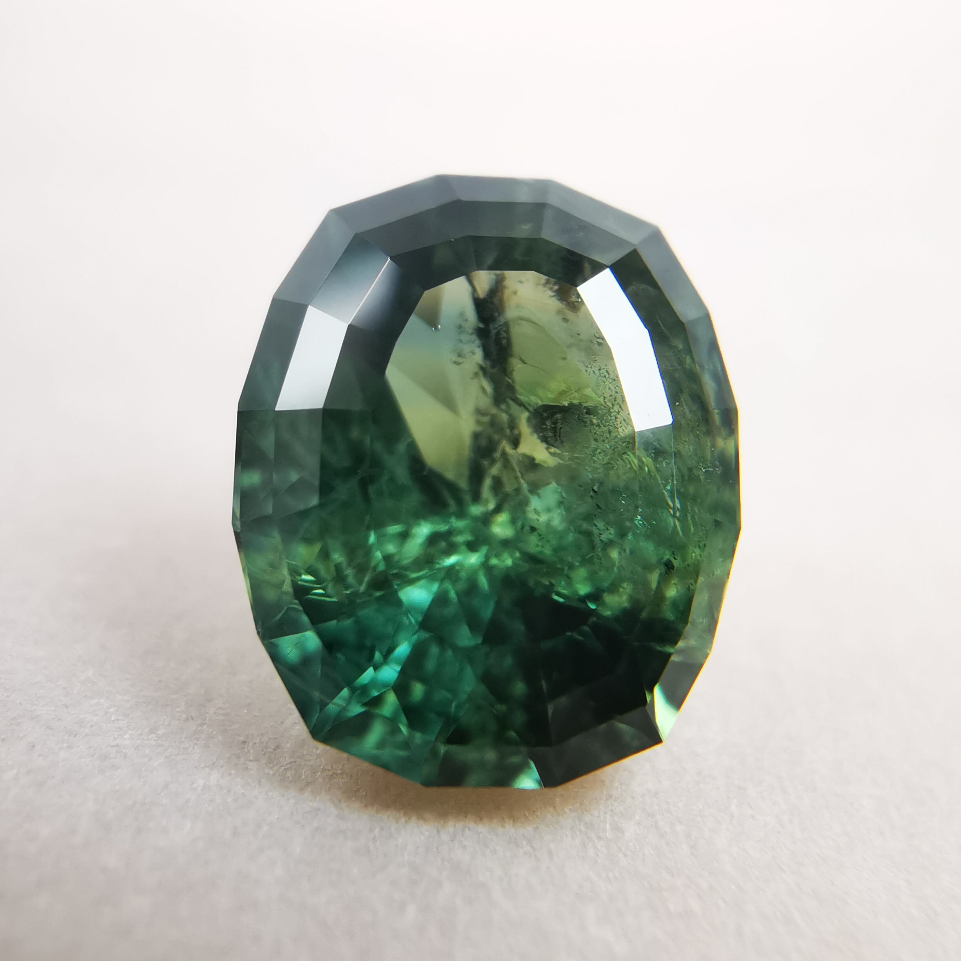 照明の下では深いグリーン、自然光ではグリーンの中にわずかにブルーを感じさせるサファイアです。