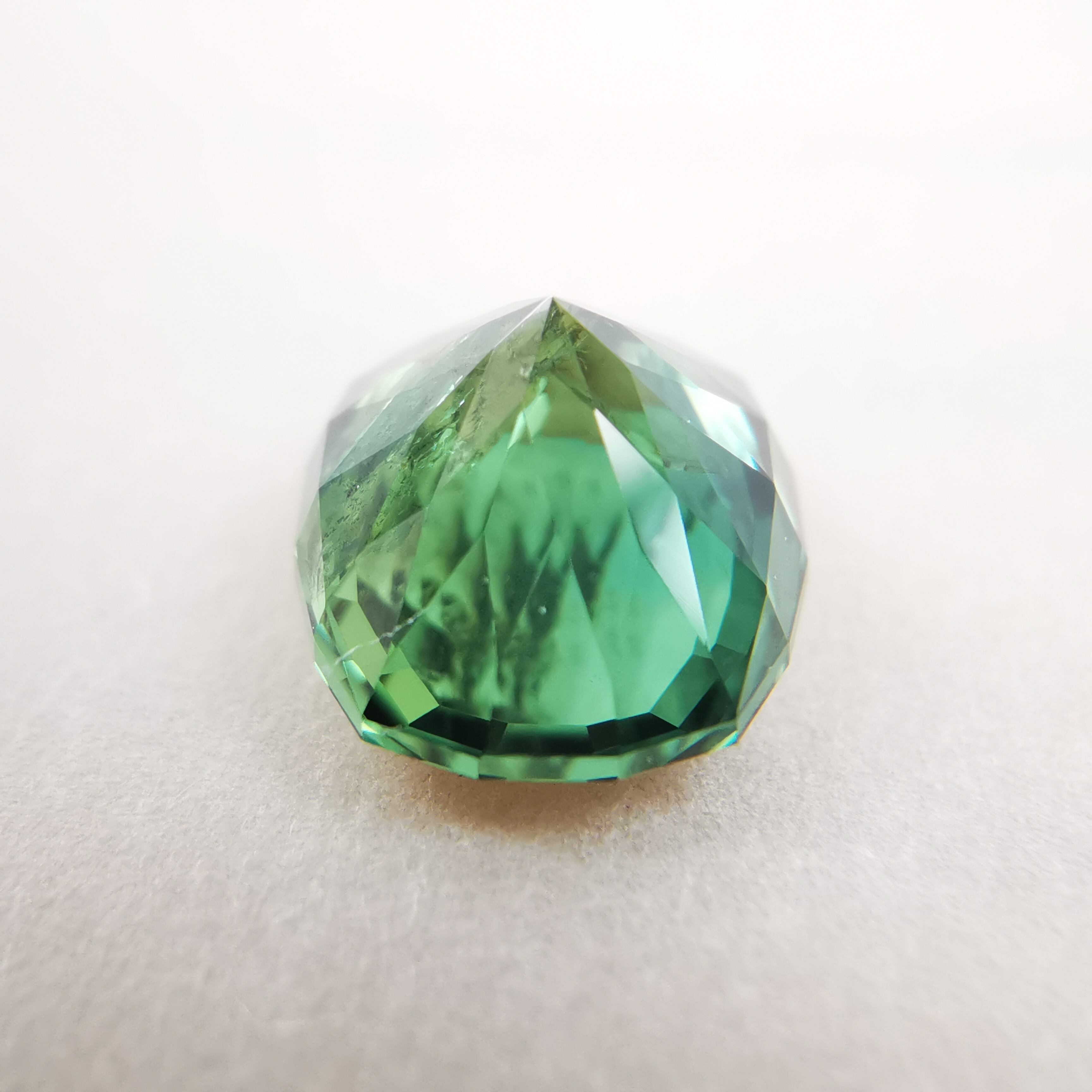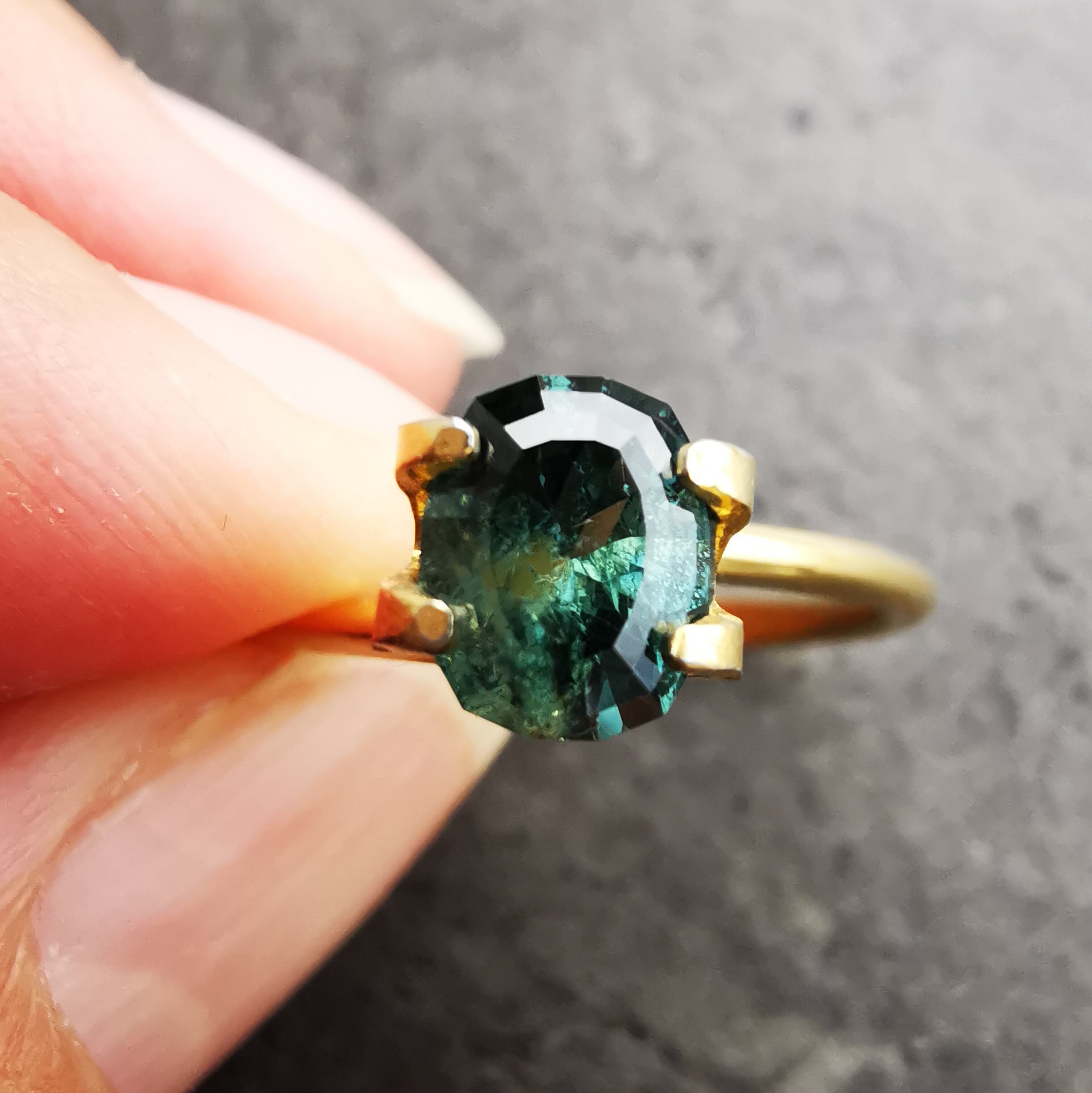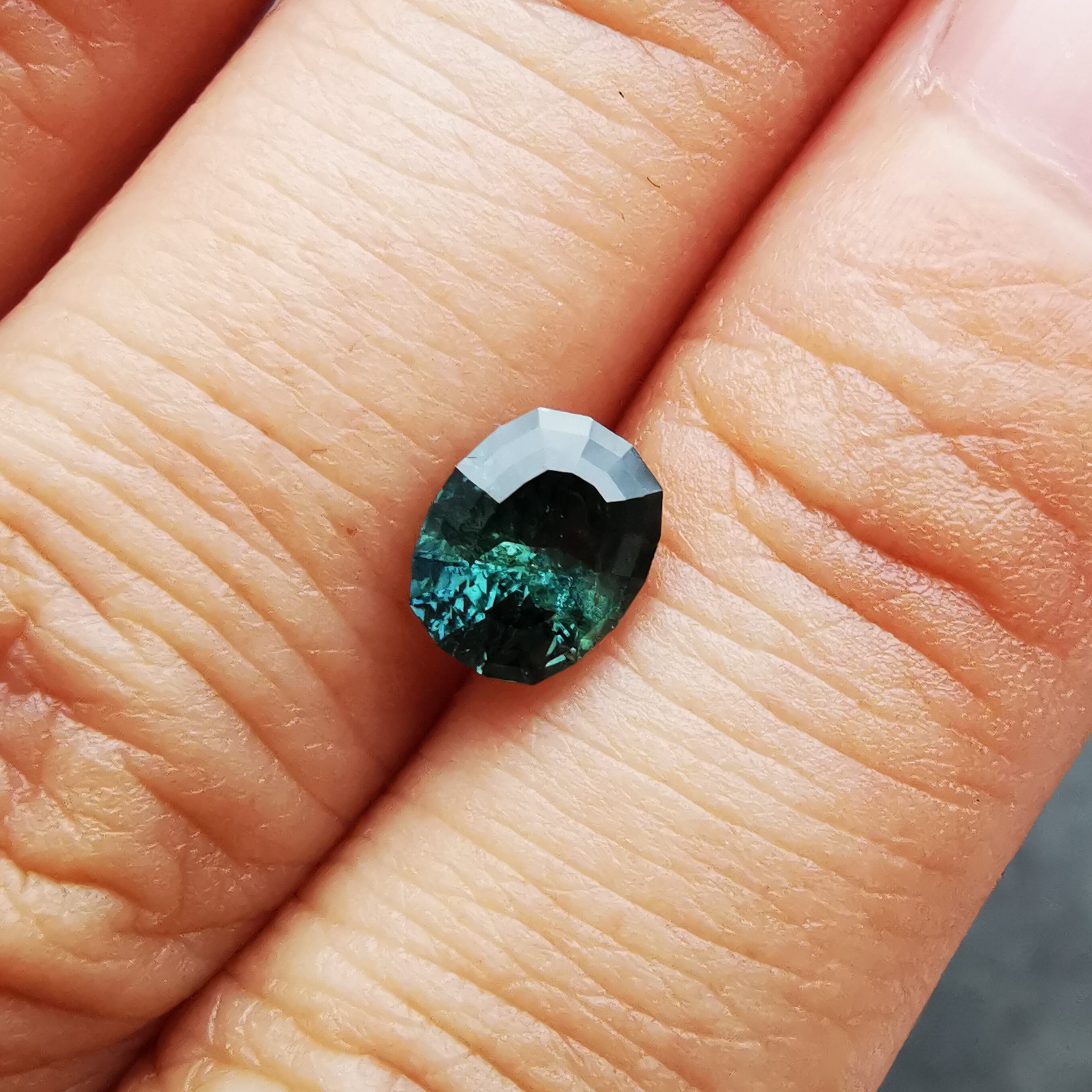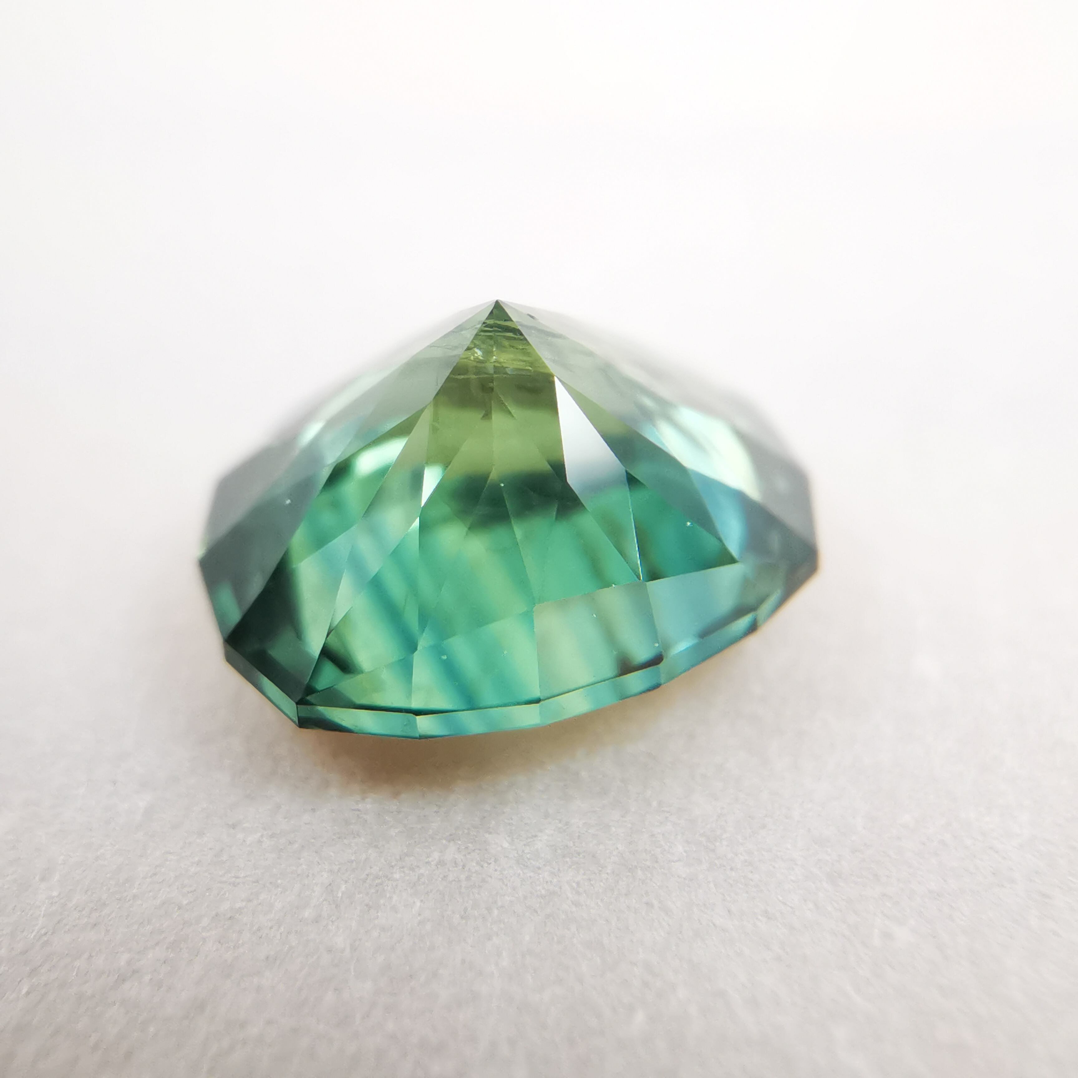 照明の下では深いグリーン、自然光ではグリーンの中にわずかにブルーを感じさせるサファイアです。