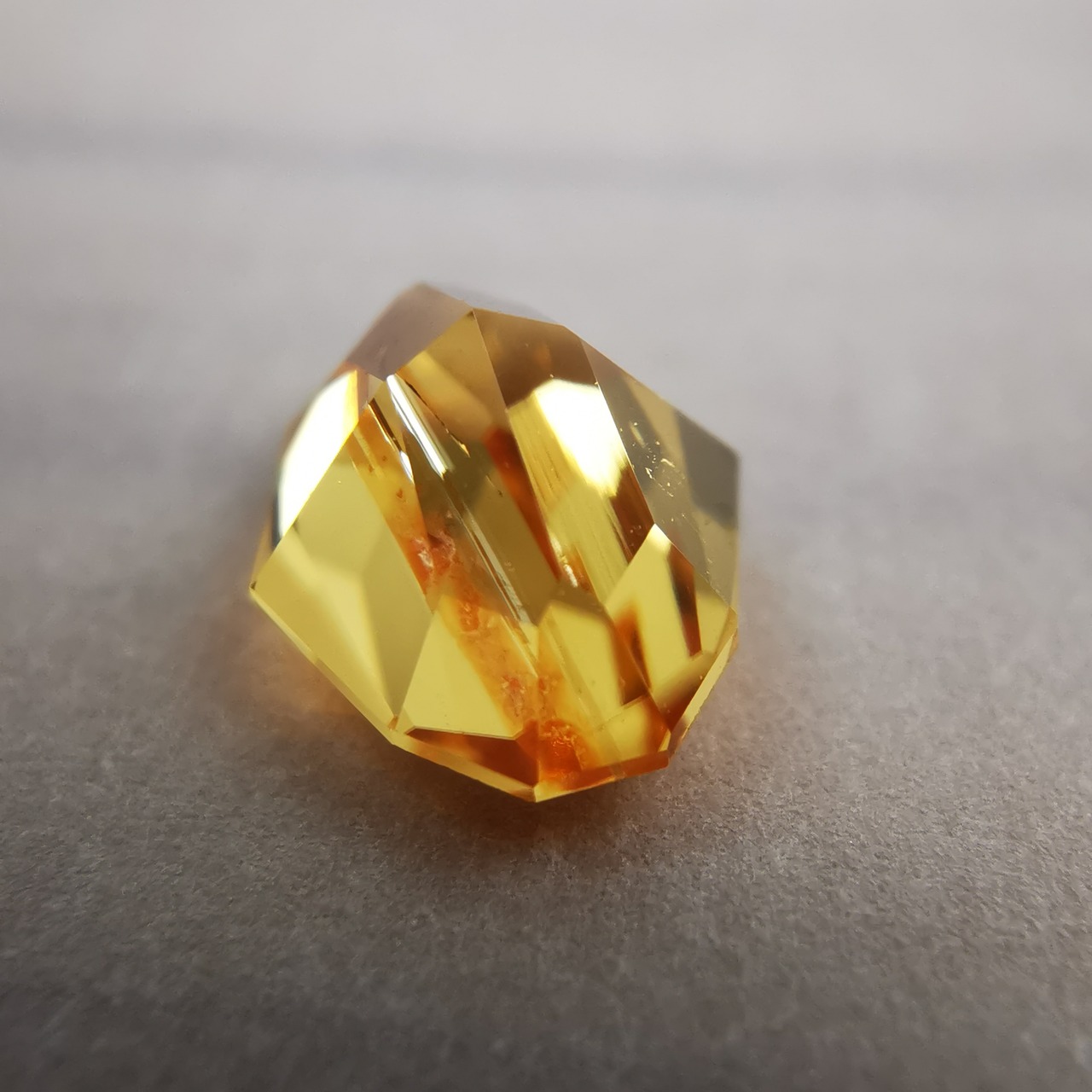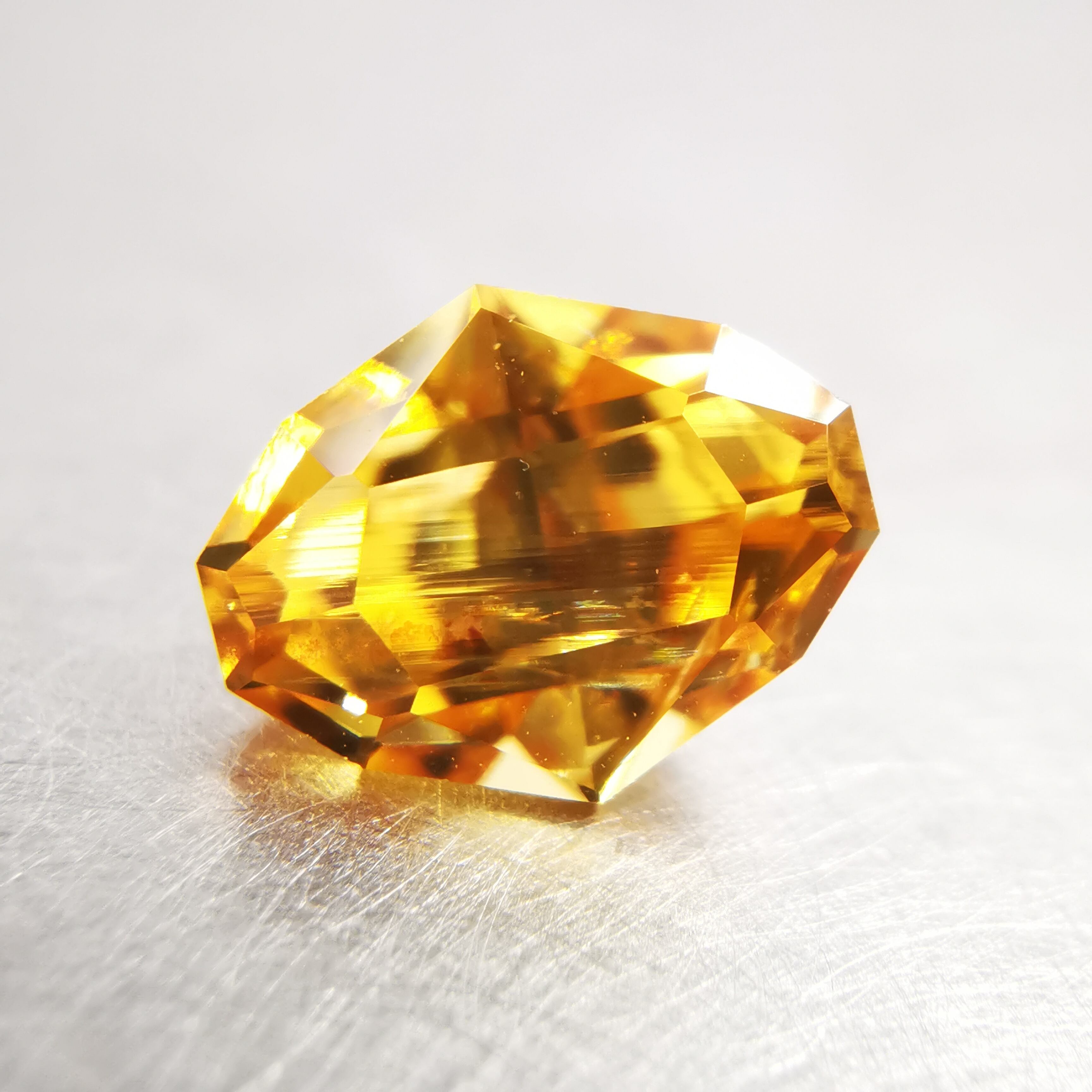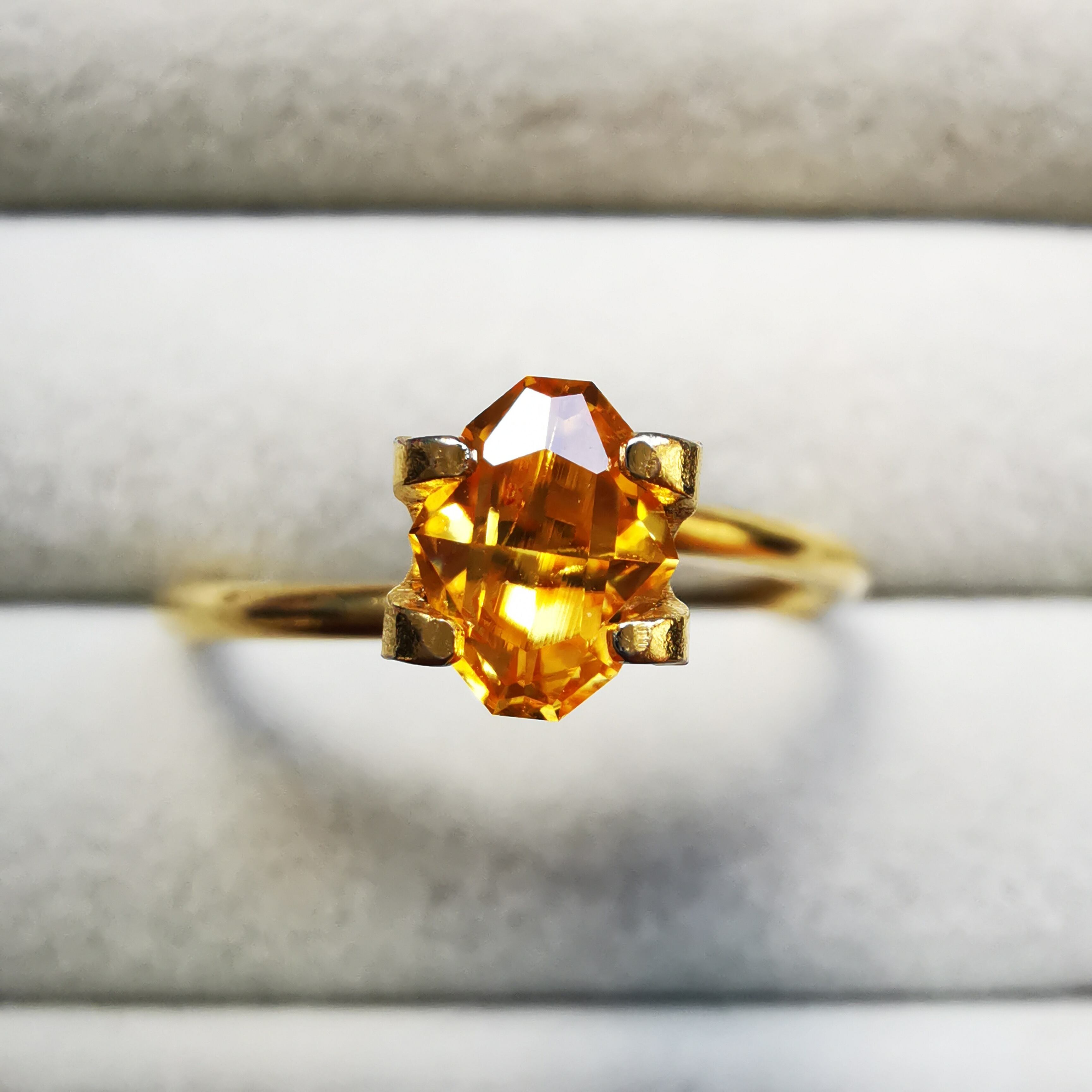 イエローの中に、オレンジ色の帯状のインクルージョンが大きく入り、太陽の光をその暖かさごとギュッと凝縮したような独特の色になりました。