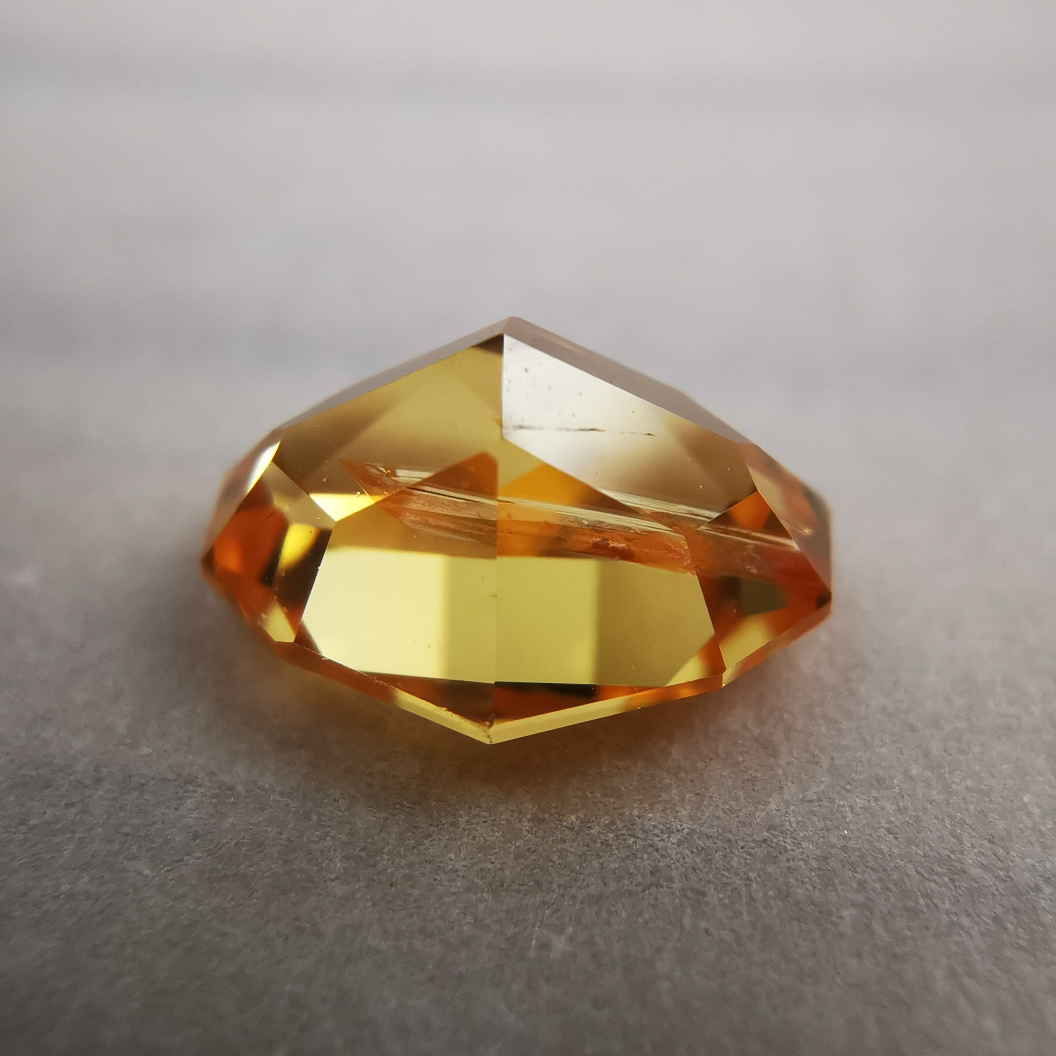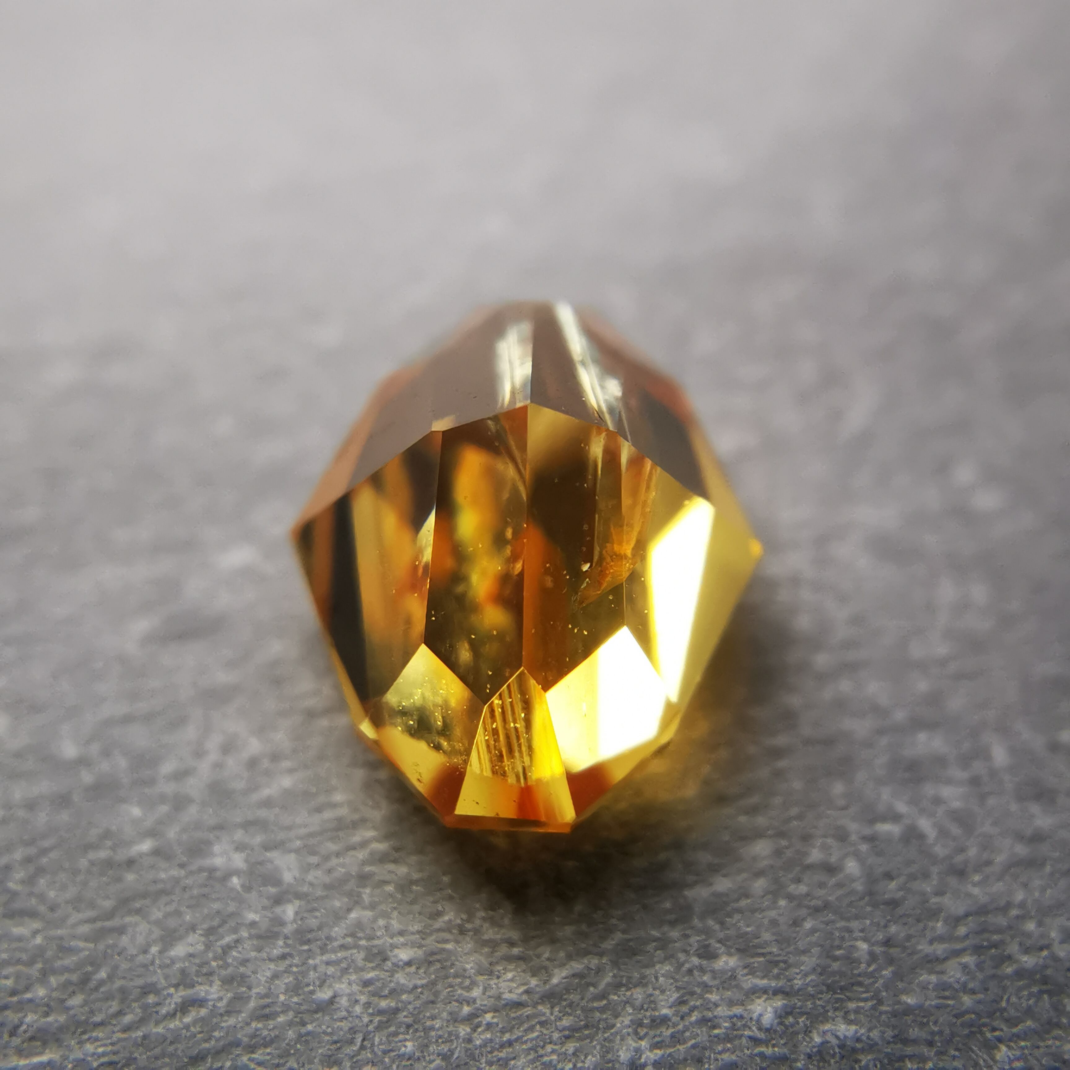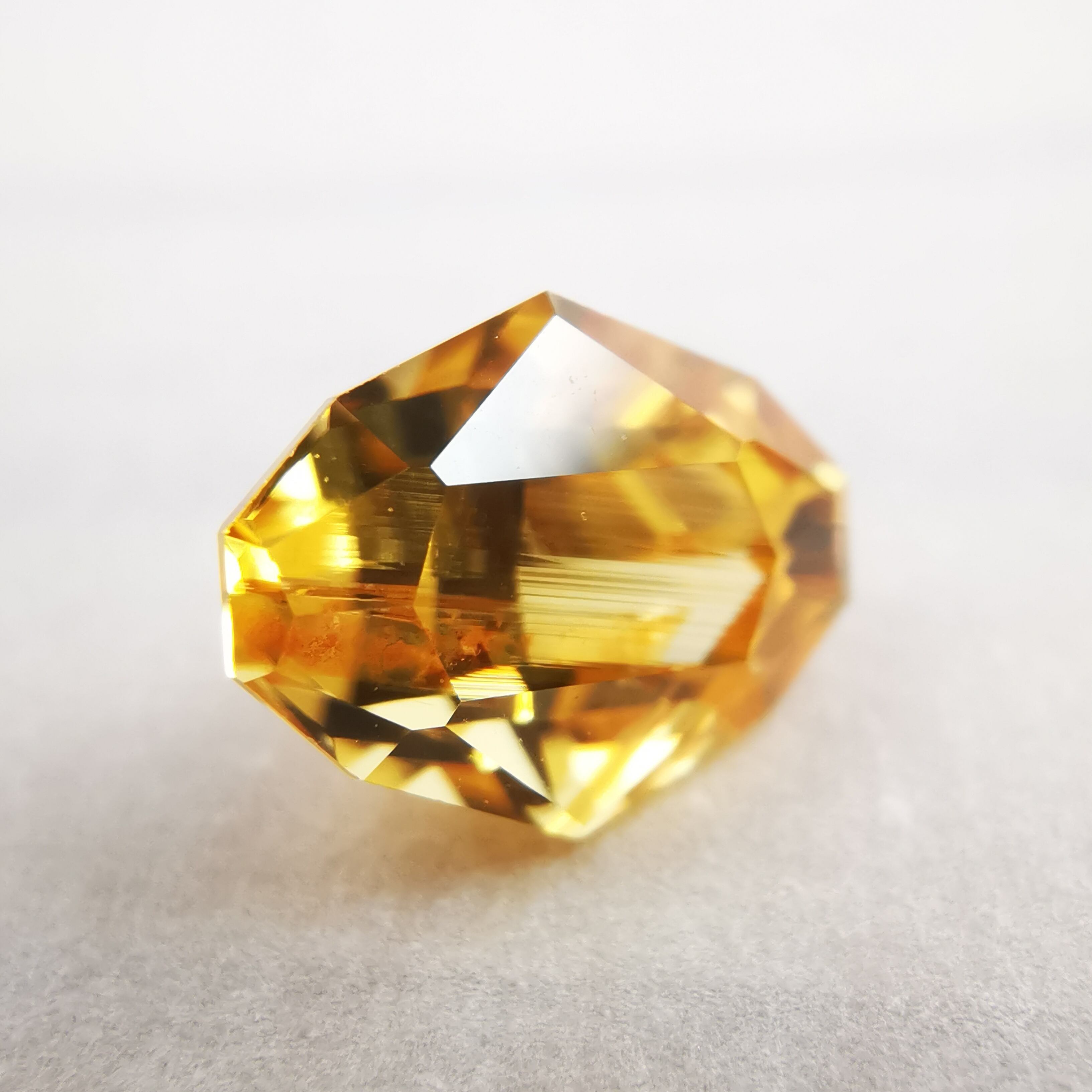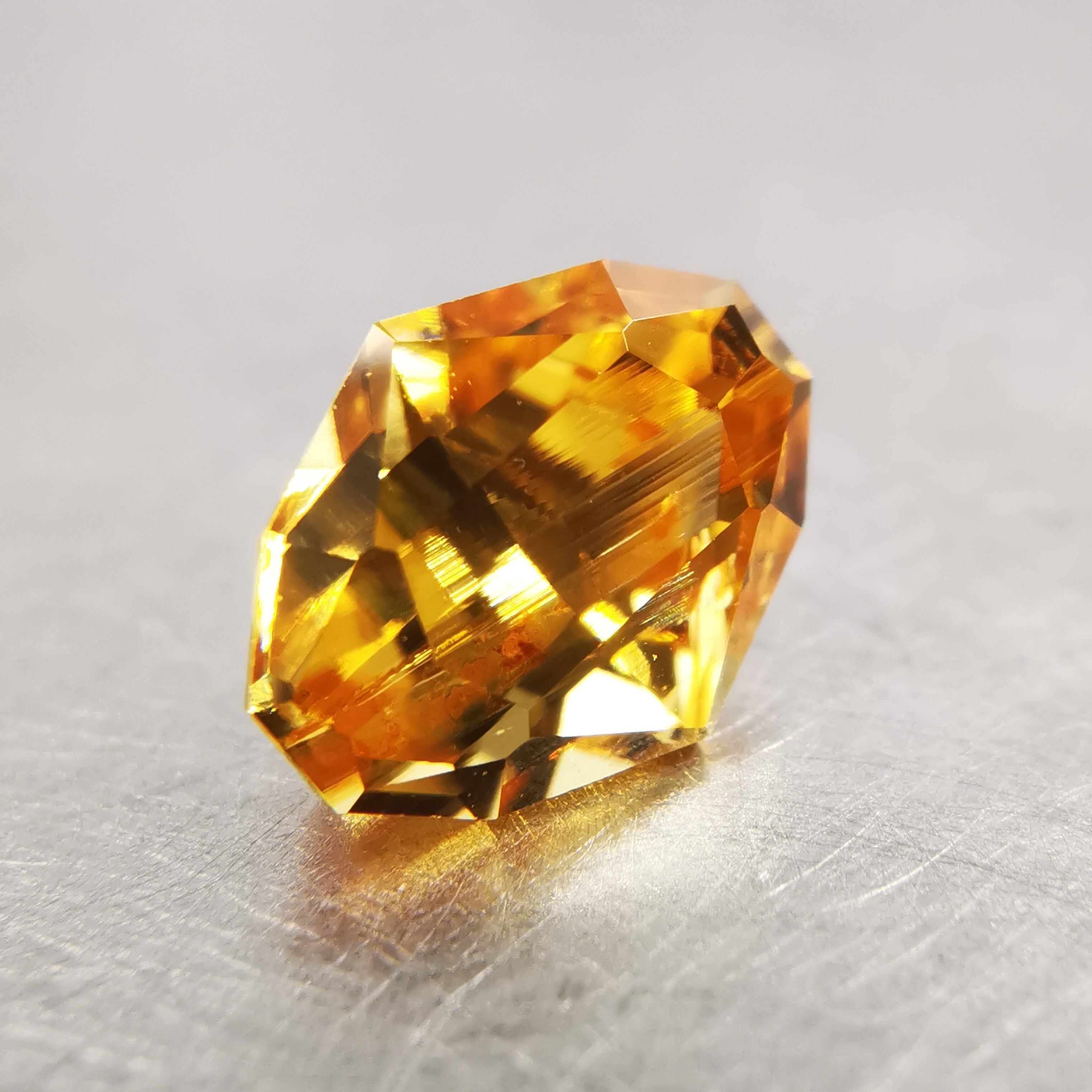 イエローの中に、オレンジ色の帯状のインクルージョンが大きく入り、太陽の光をその暖かさごとギュッと凝縮したような独特の色になりました。