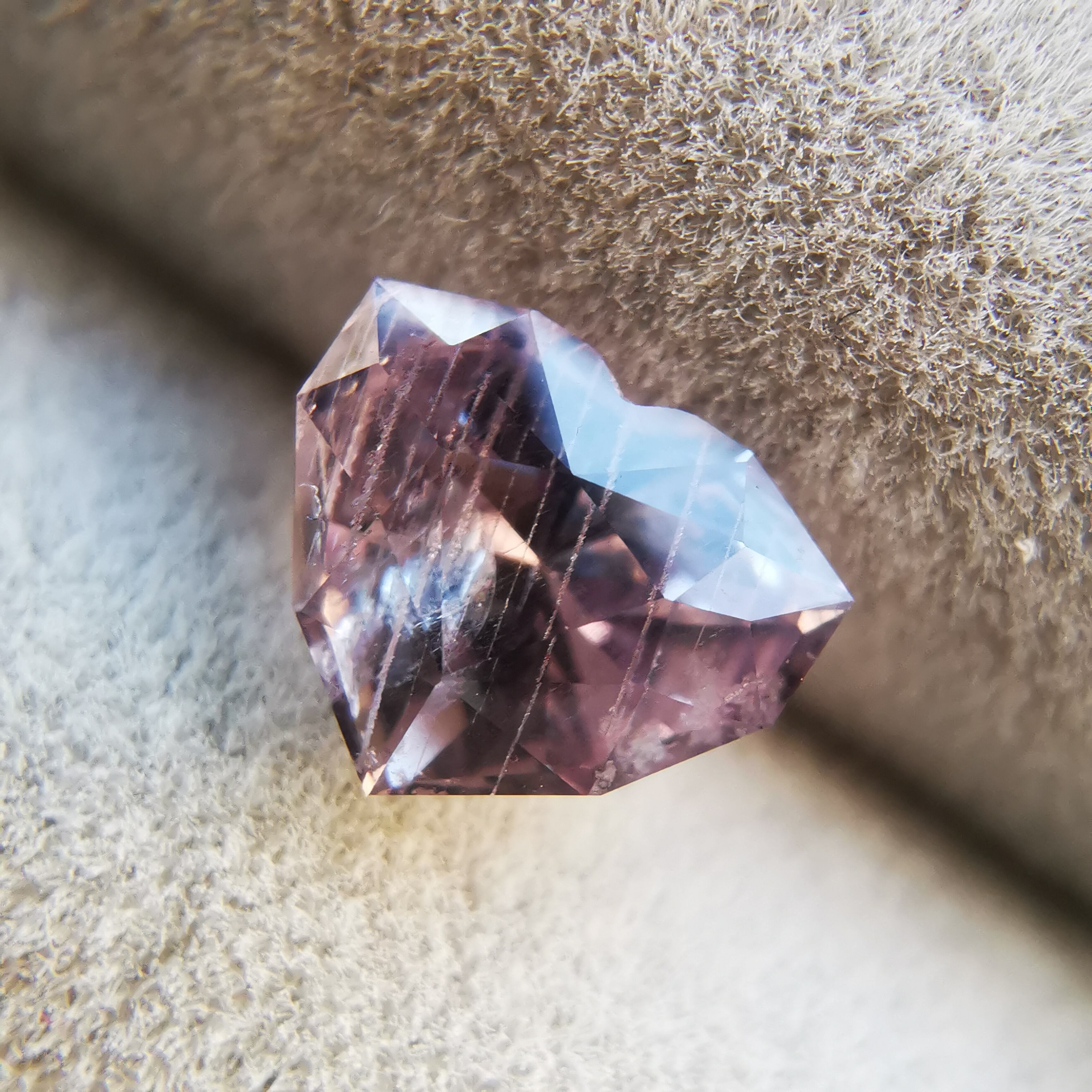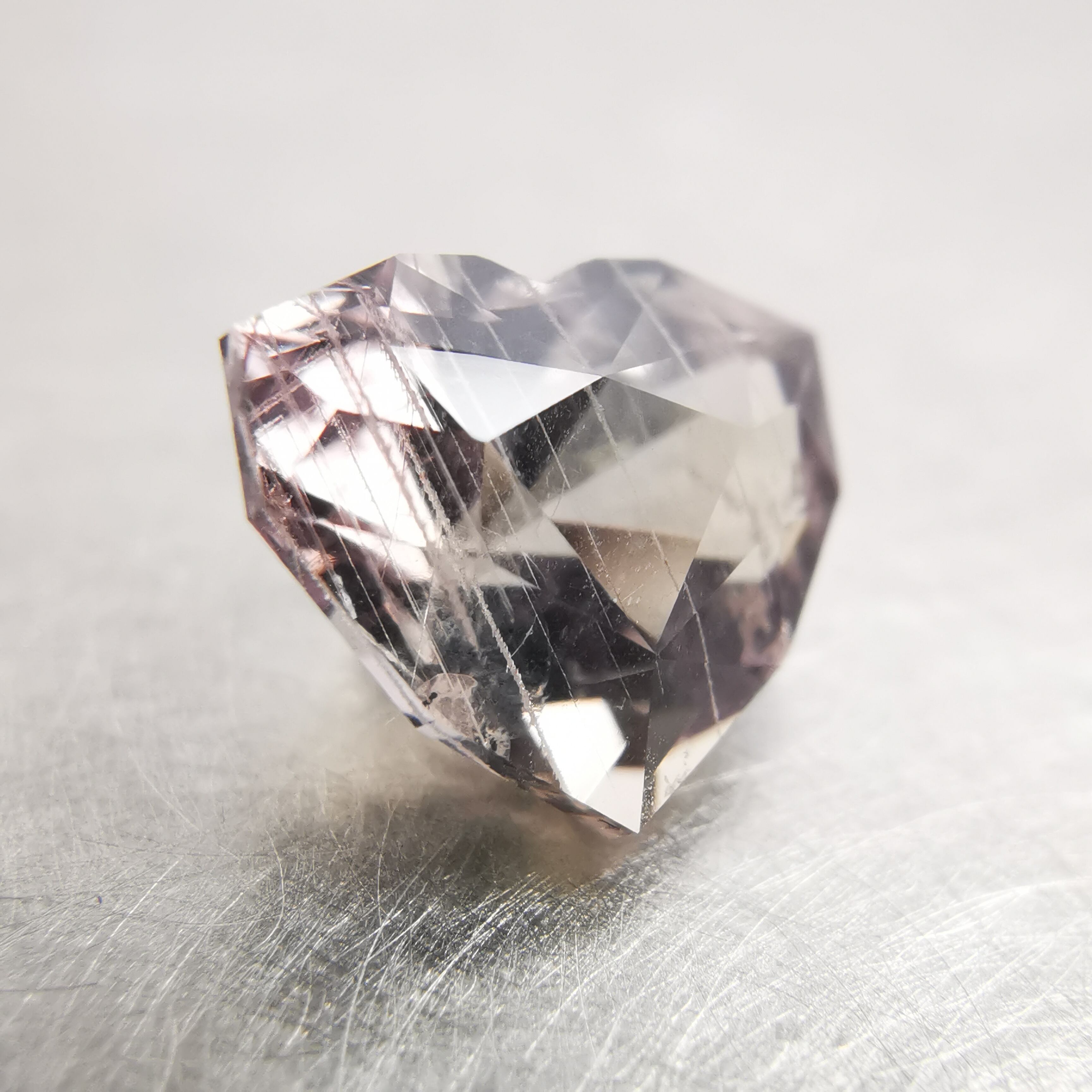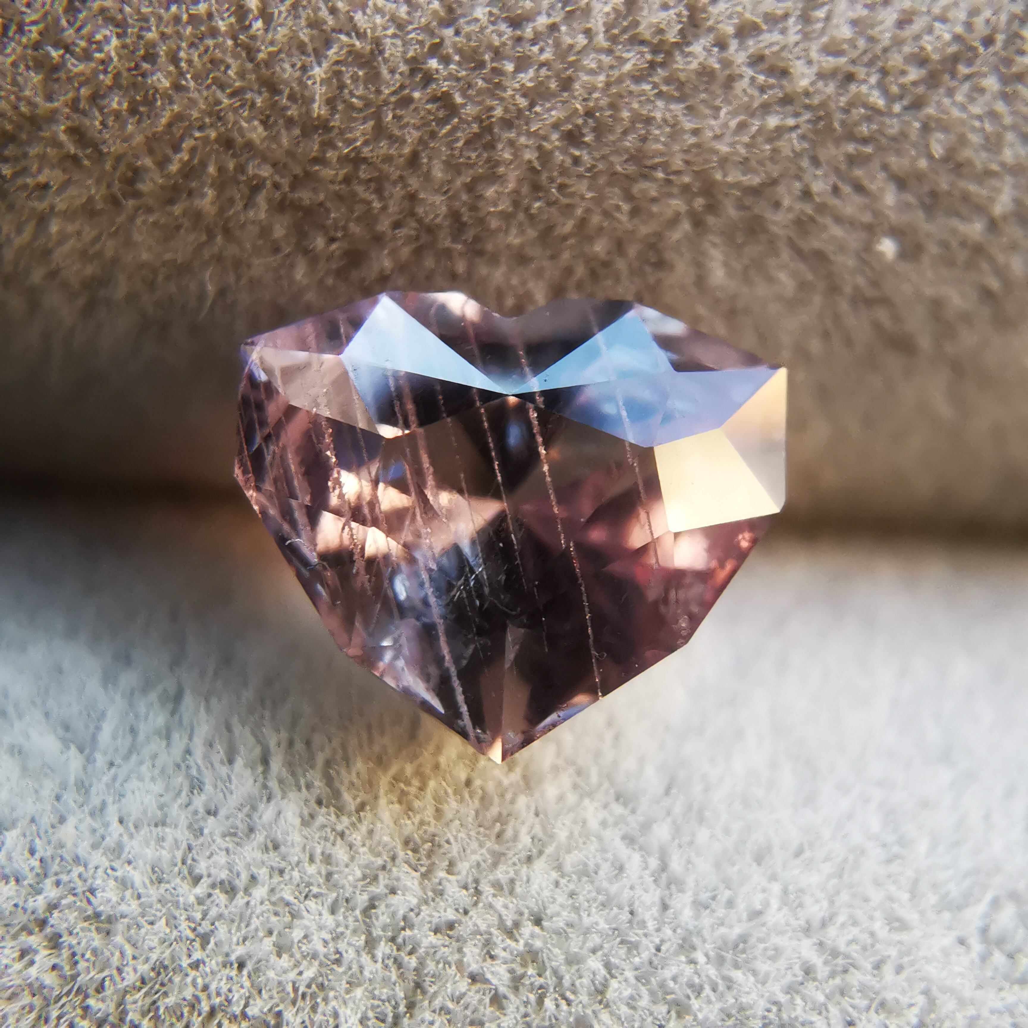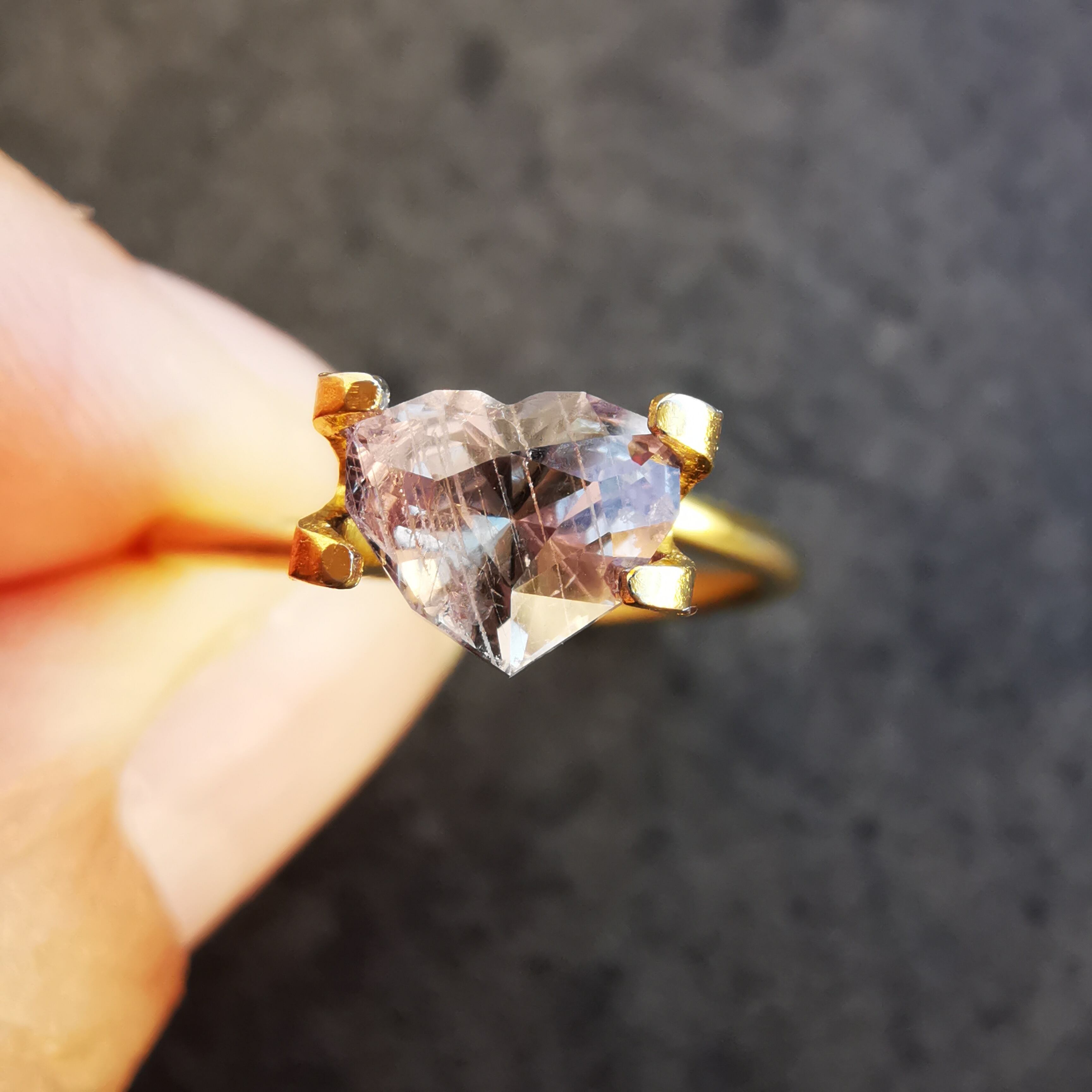 降りしきる雨のような印象的な内包物と、尖ったハートカットで、甘さのない個性的な一石になりました。