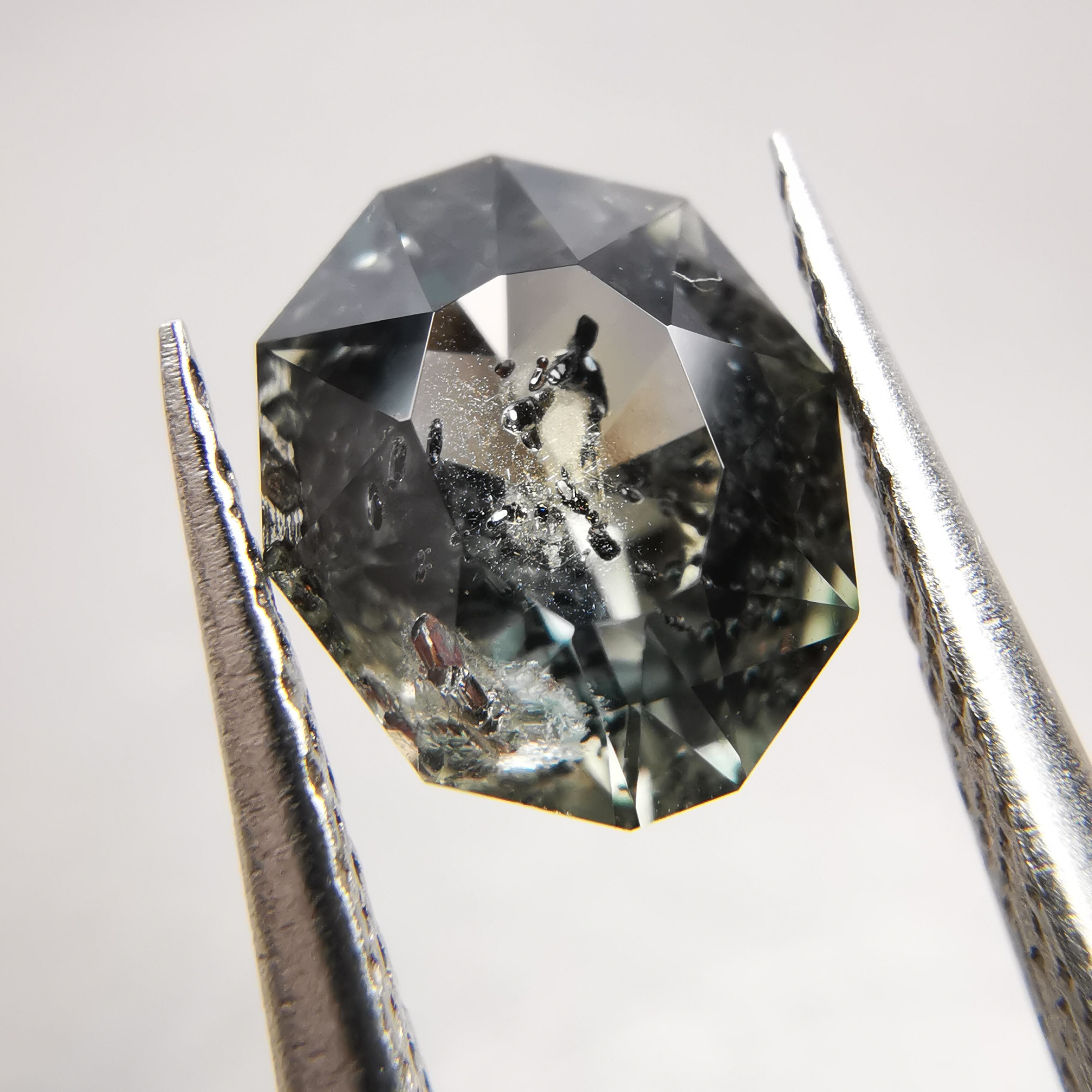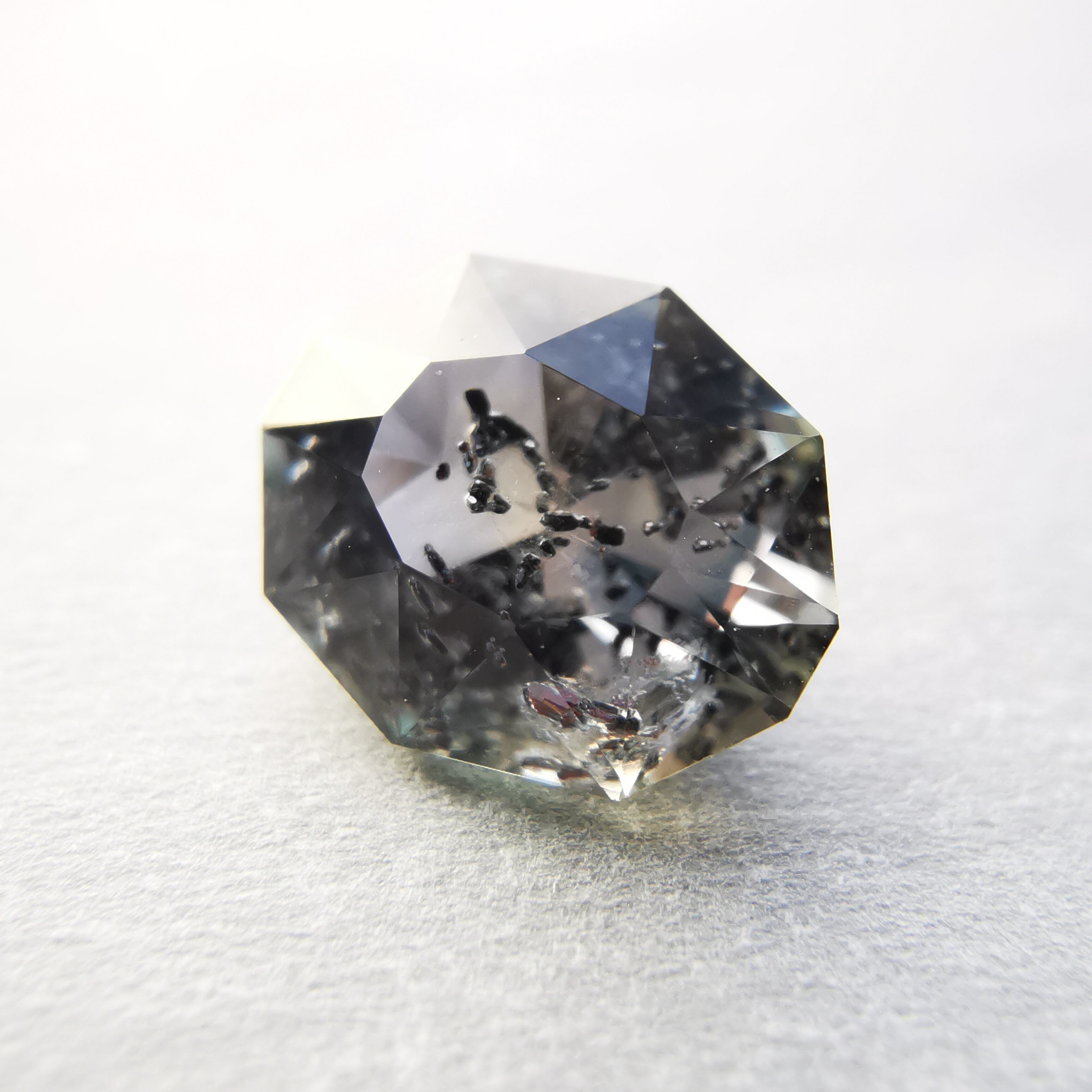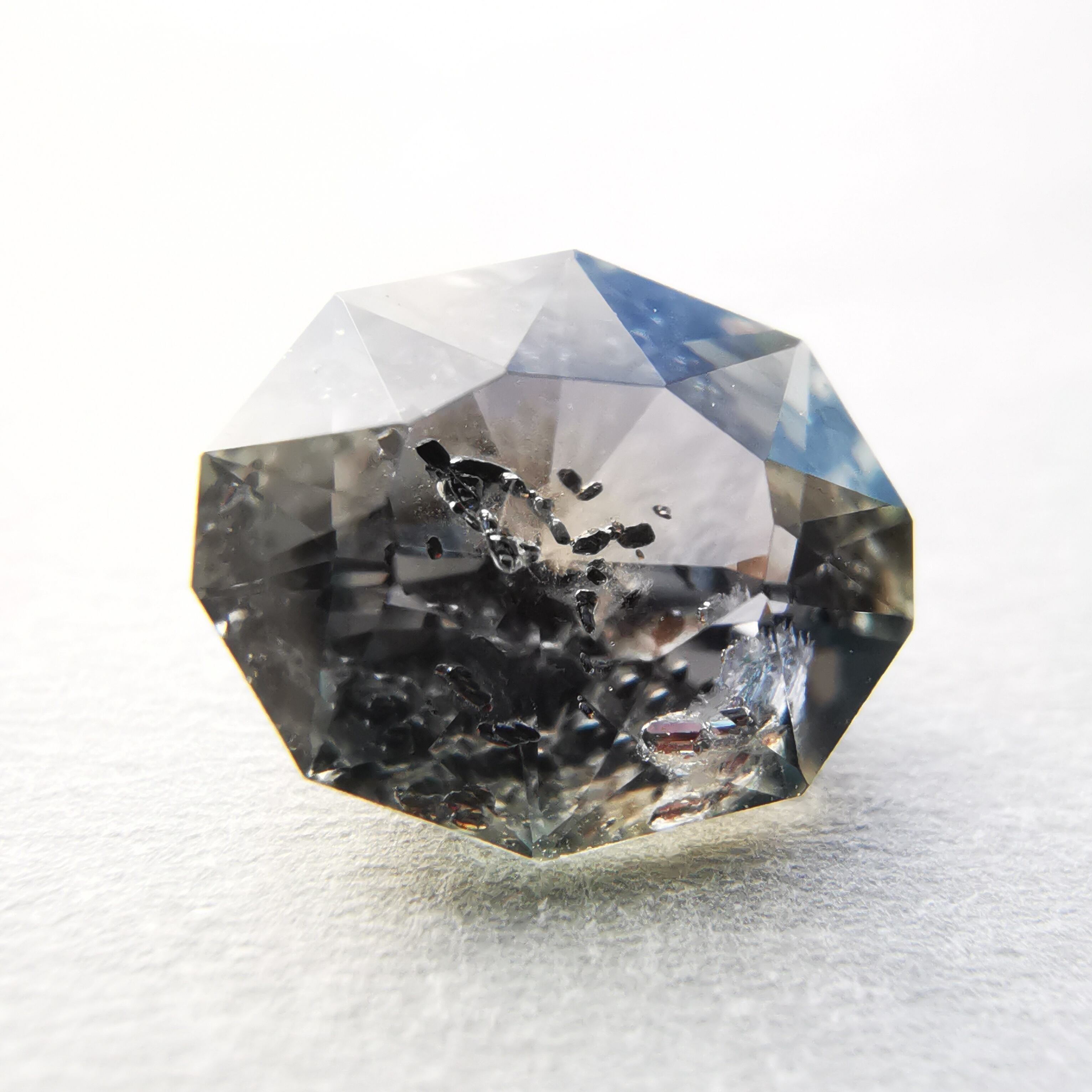 インクルージョンがとても個性的なサファイアで、黒と赤の内包物が、サファイアの中で楽しげに泳いでいるようです。