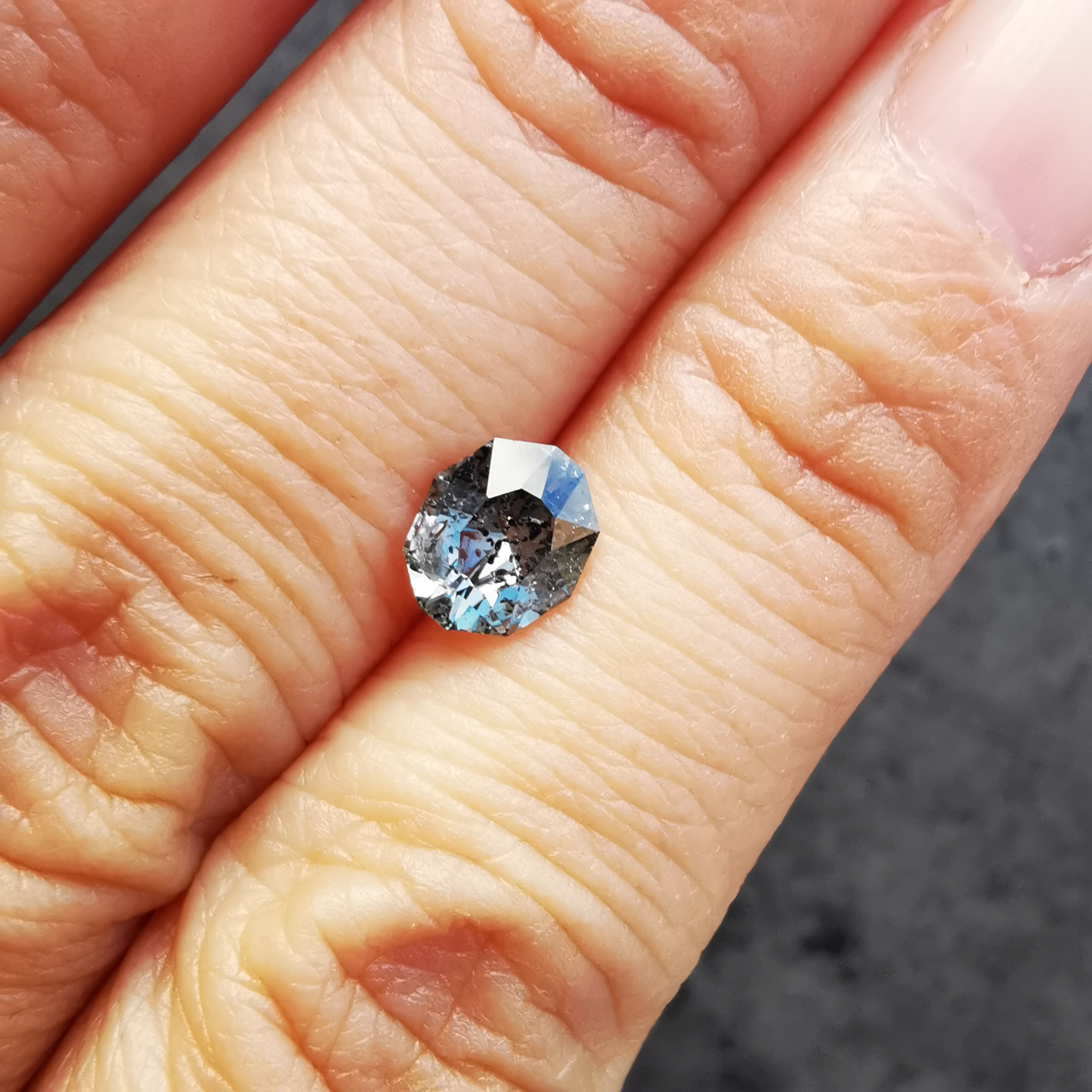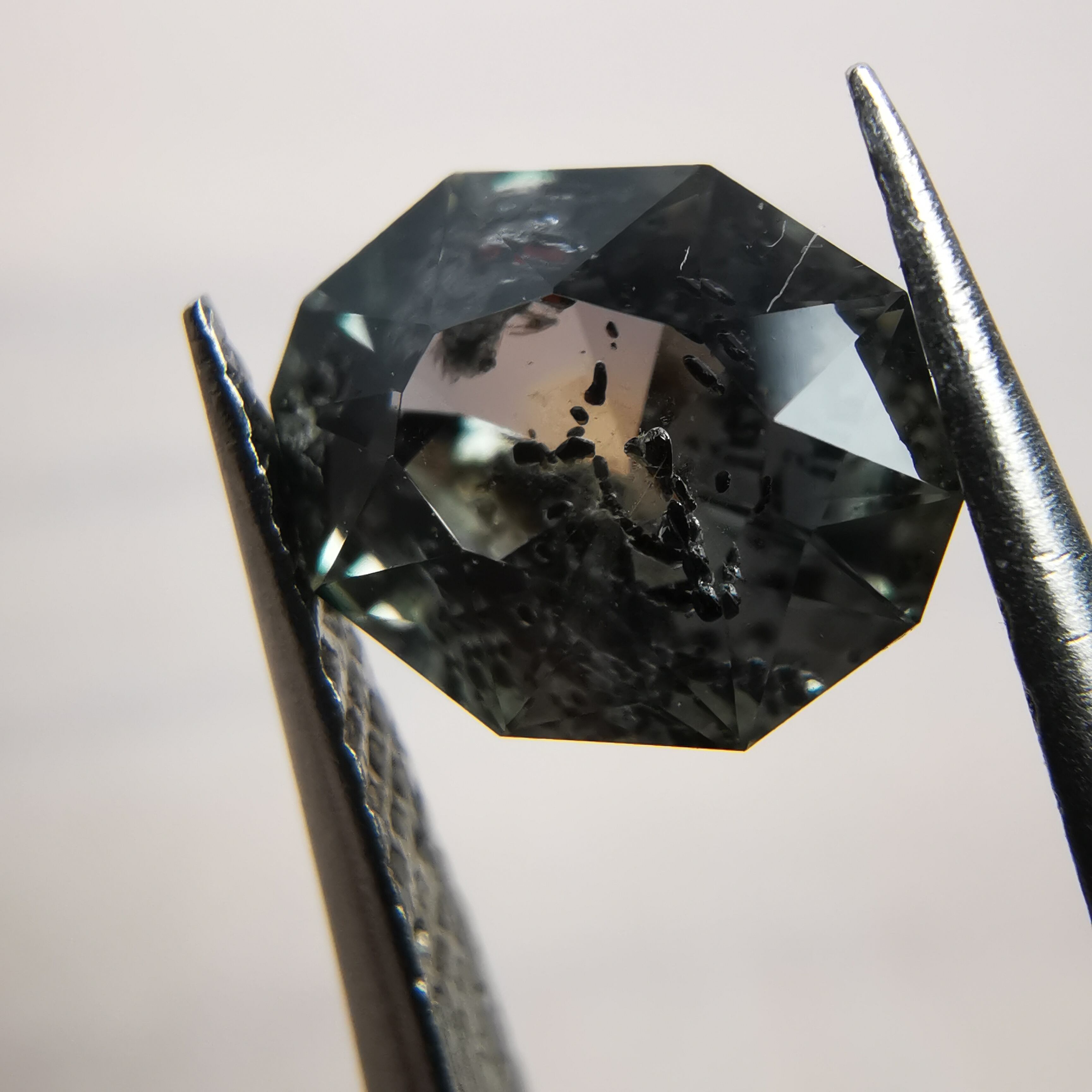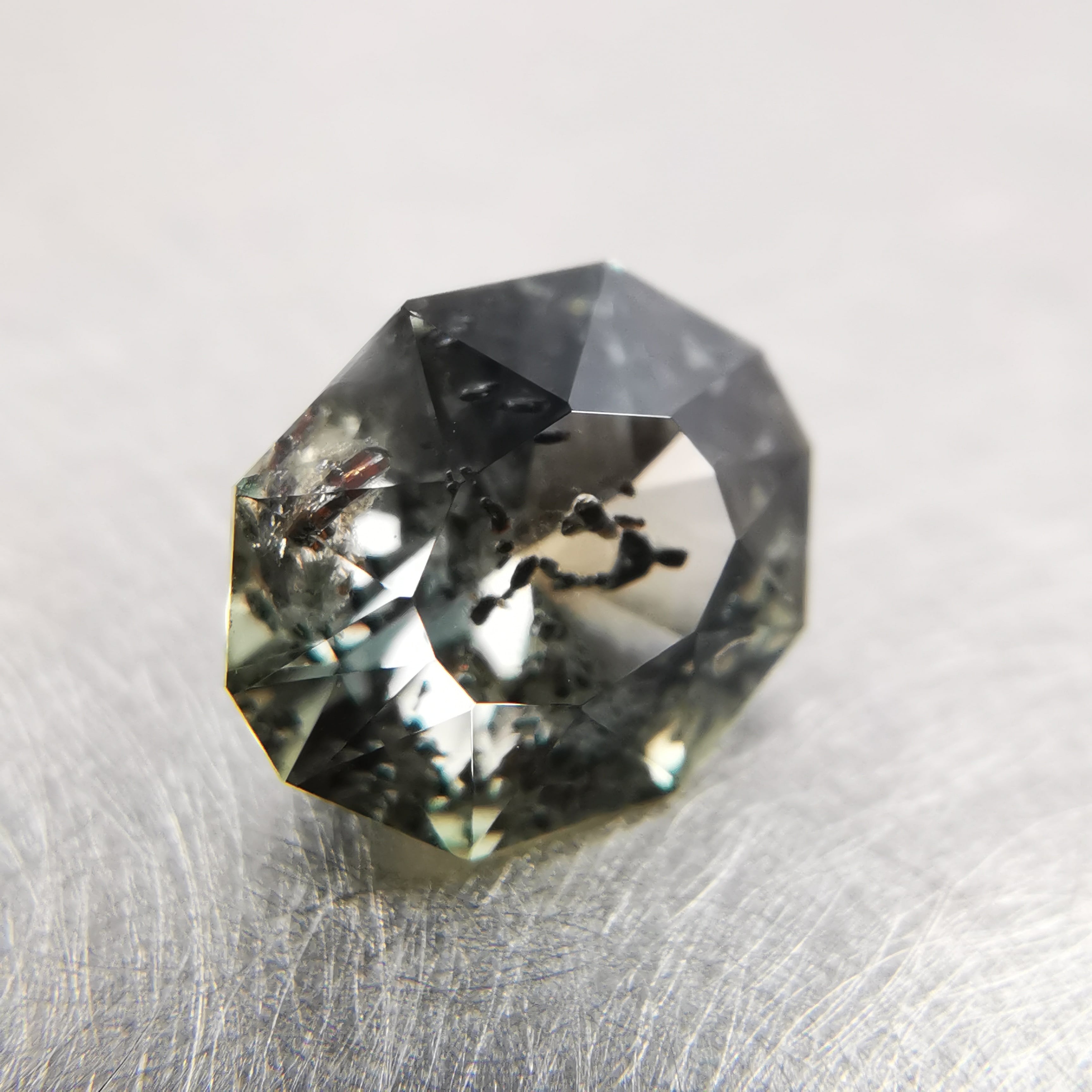 インクルージョンがとても個性的なサファイアで、黒と赤の内包物が、サファイアの中で楽しげに泳いでいるようです。