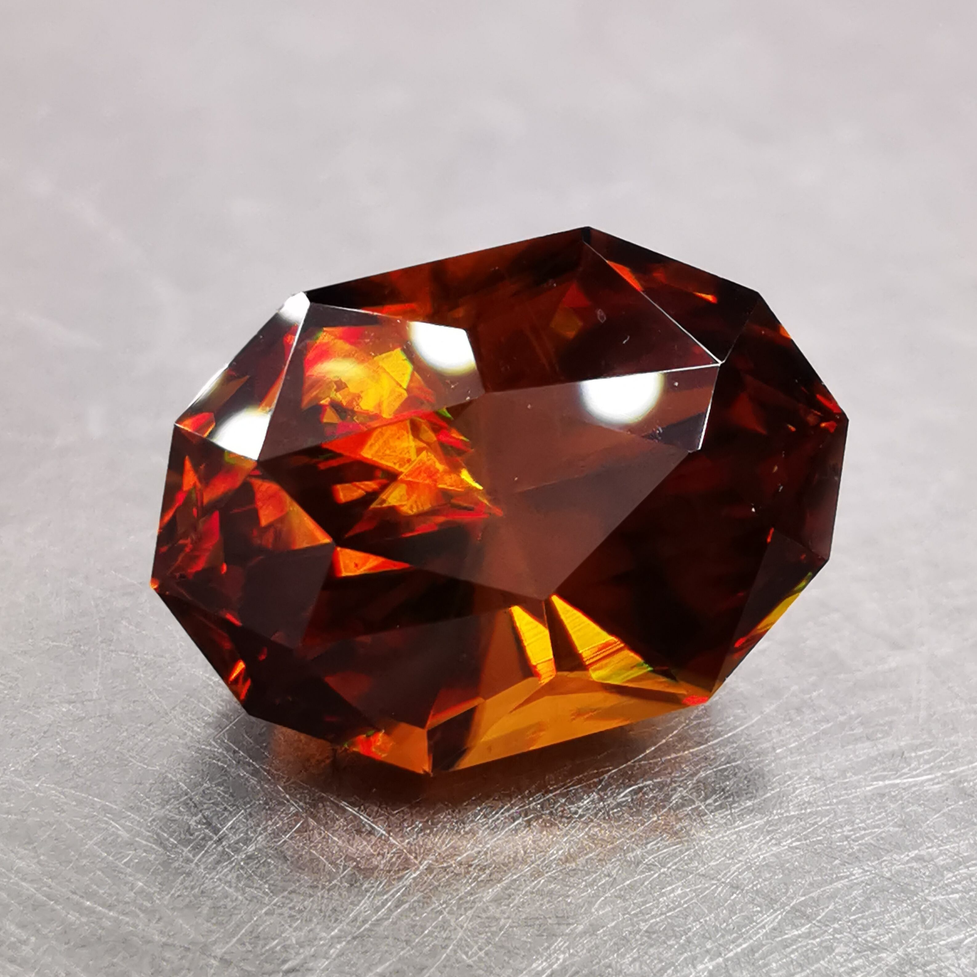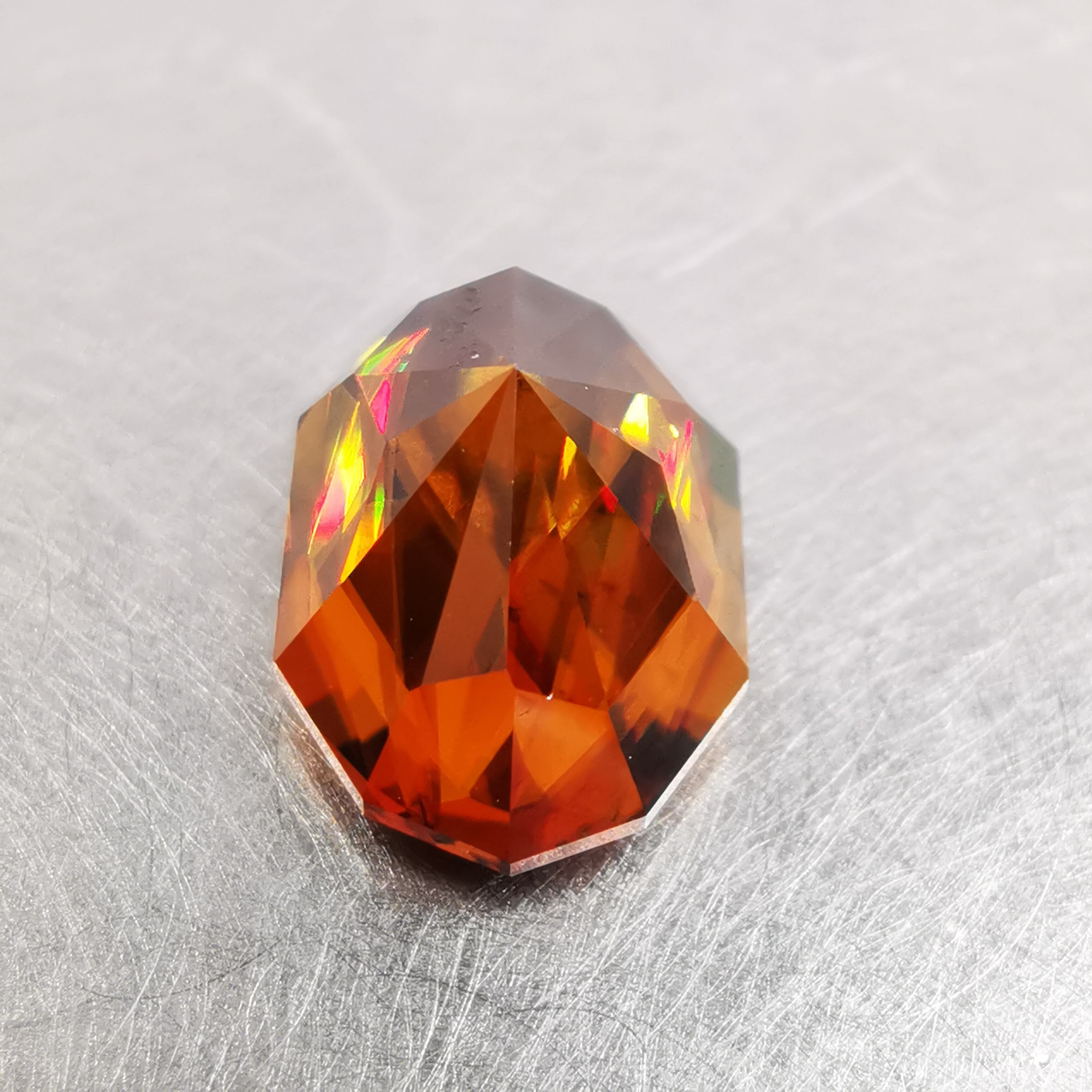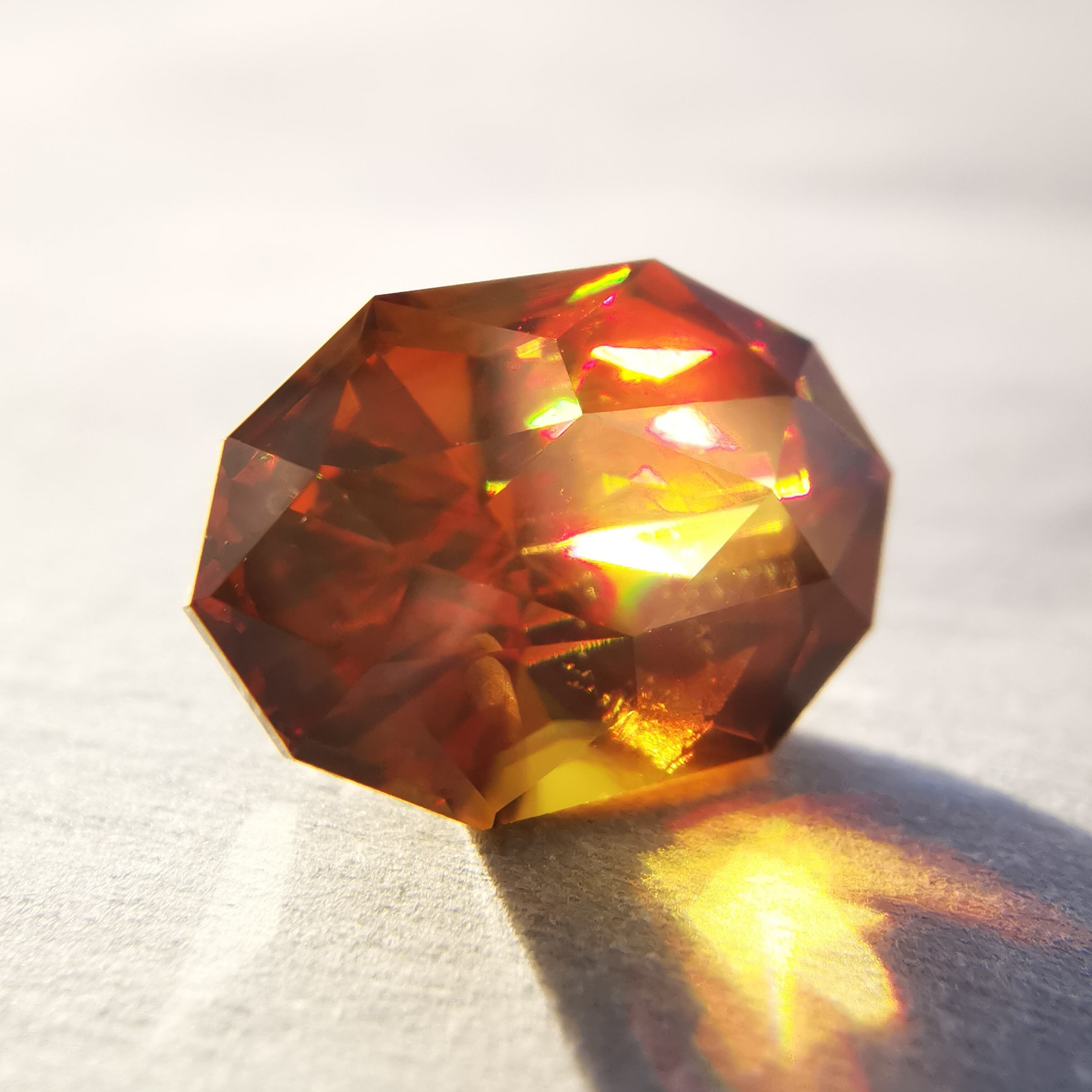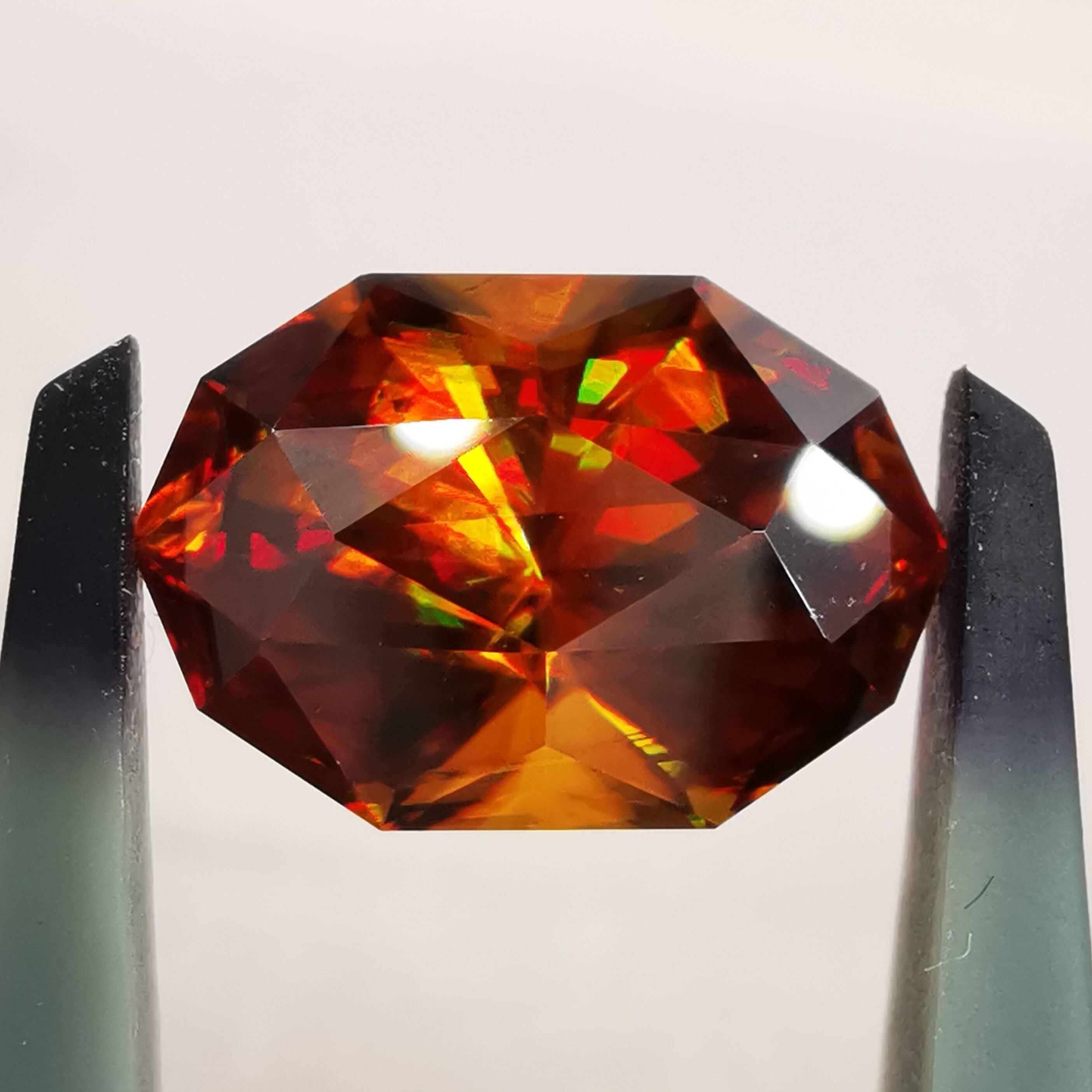 照明の下では、細かく虹色のファイアが輝き、太陽光の下では赤く力強く輝きます。