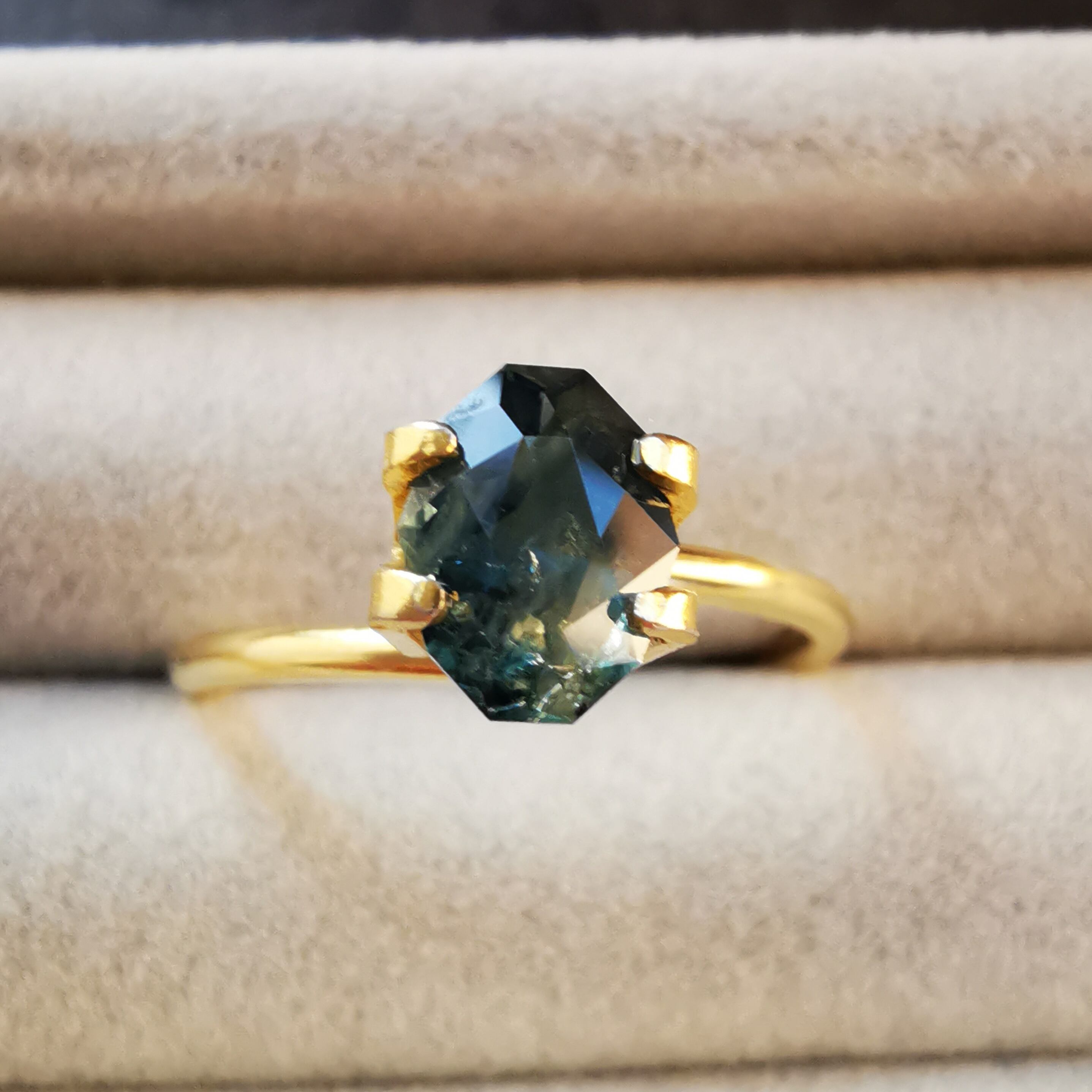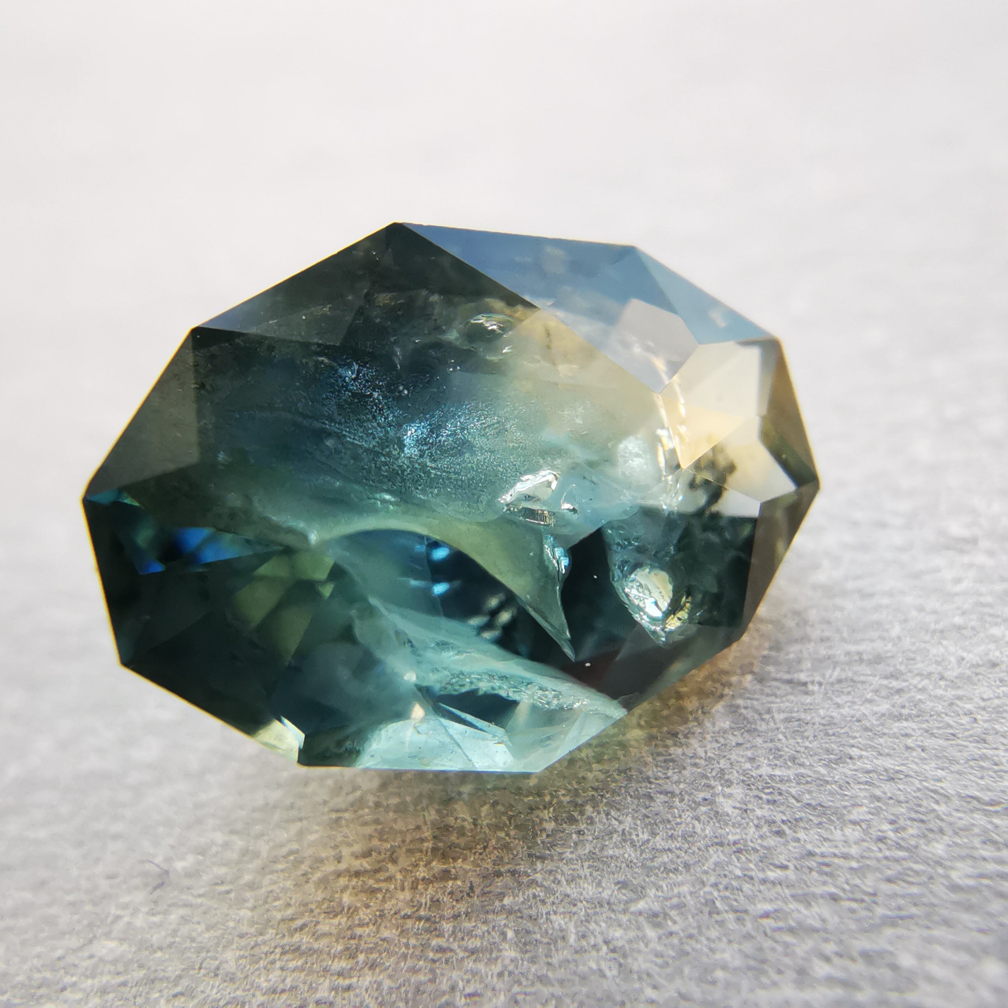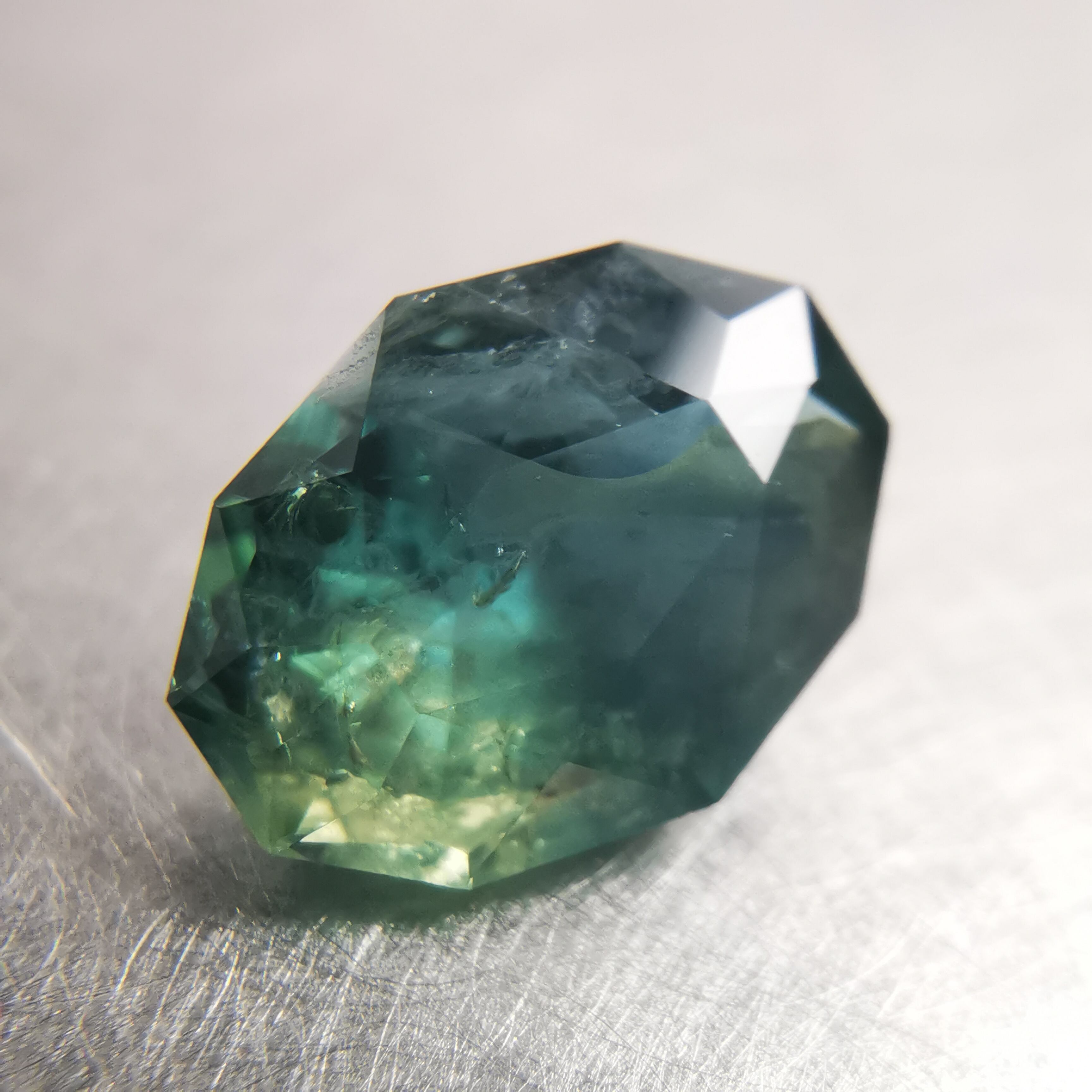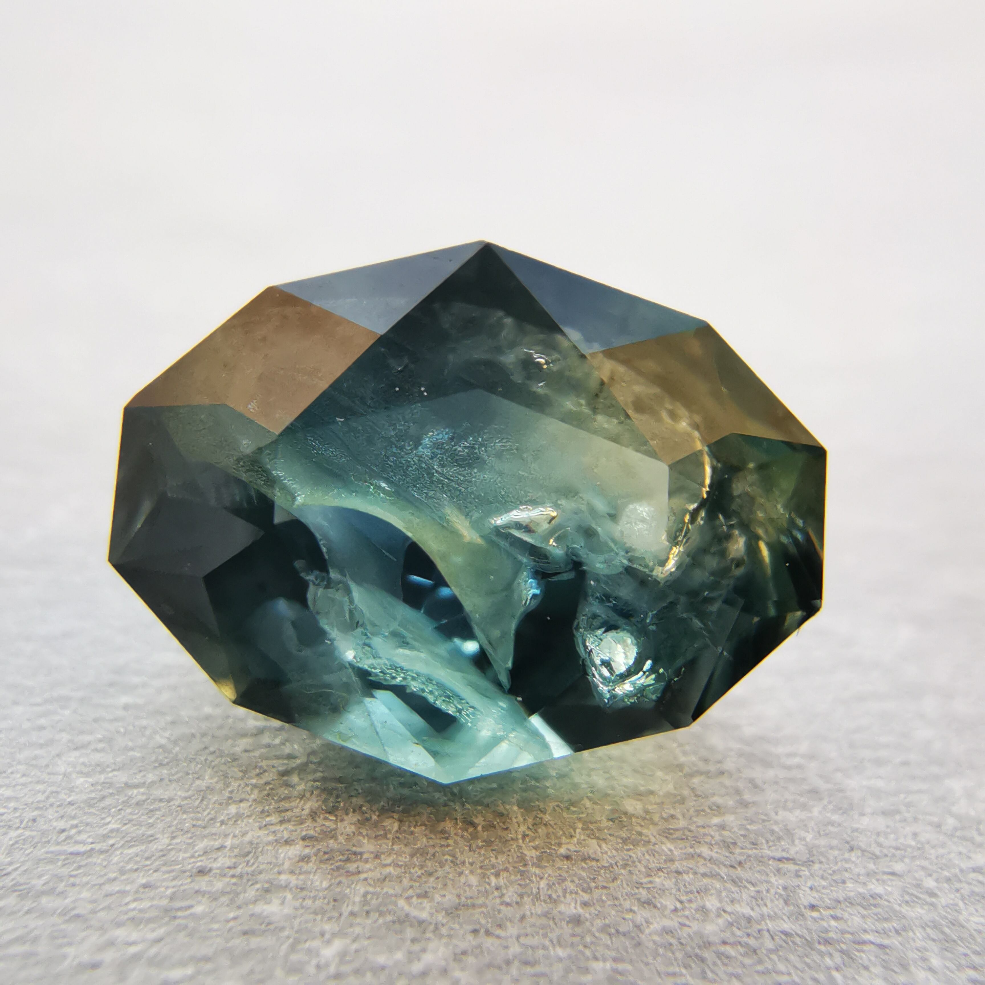 ブルーグリーンの石の一部がイエローに分かれたバイカラーのサファイアです。