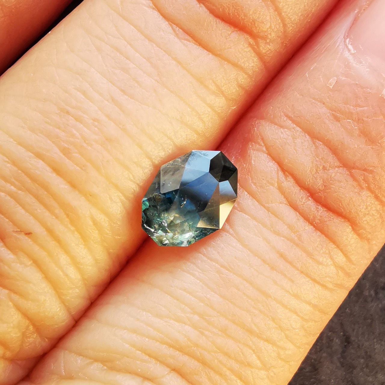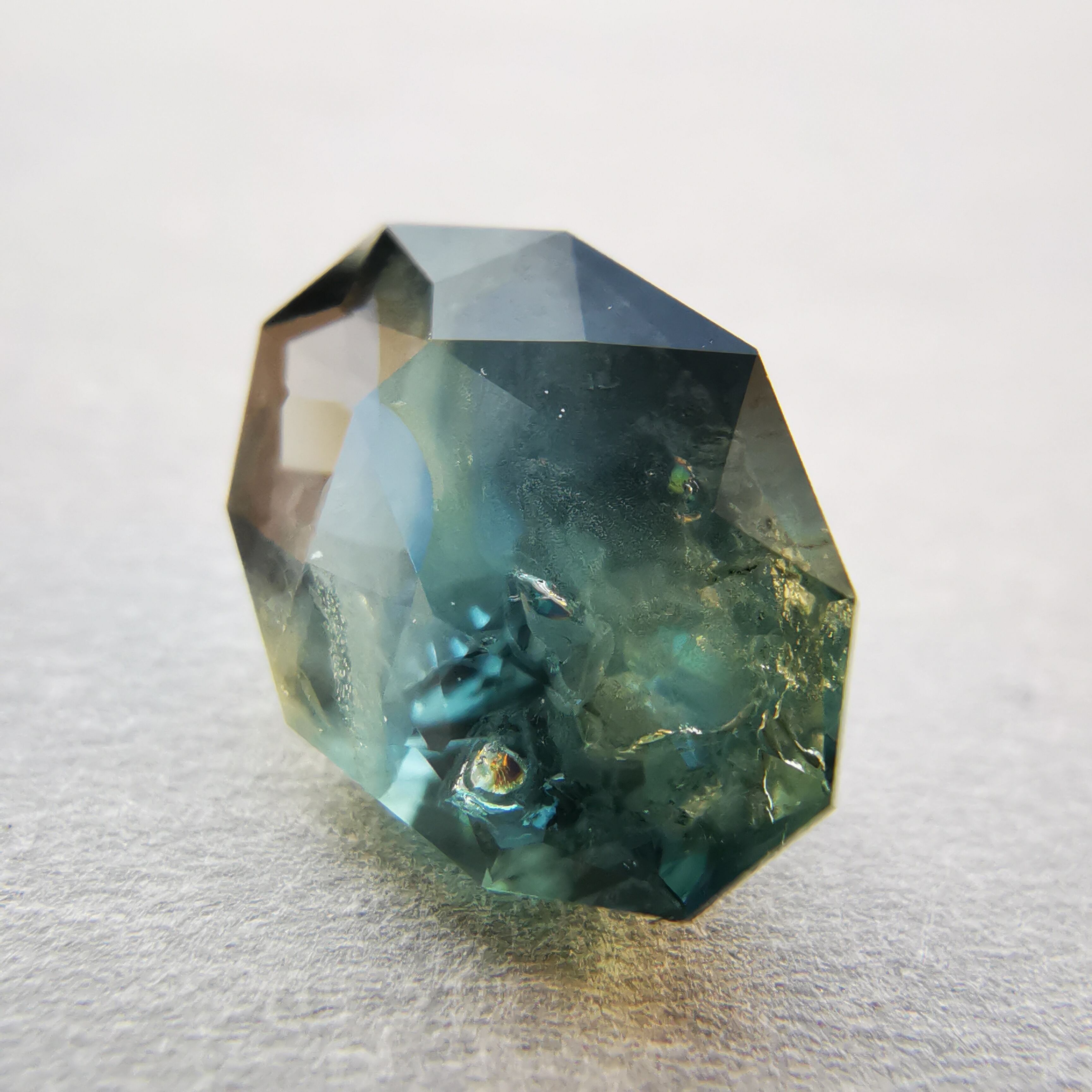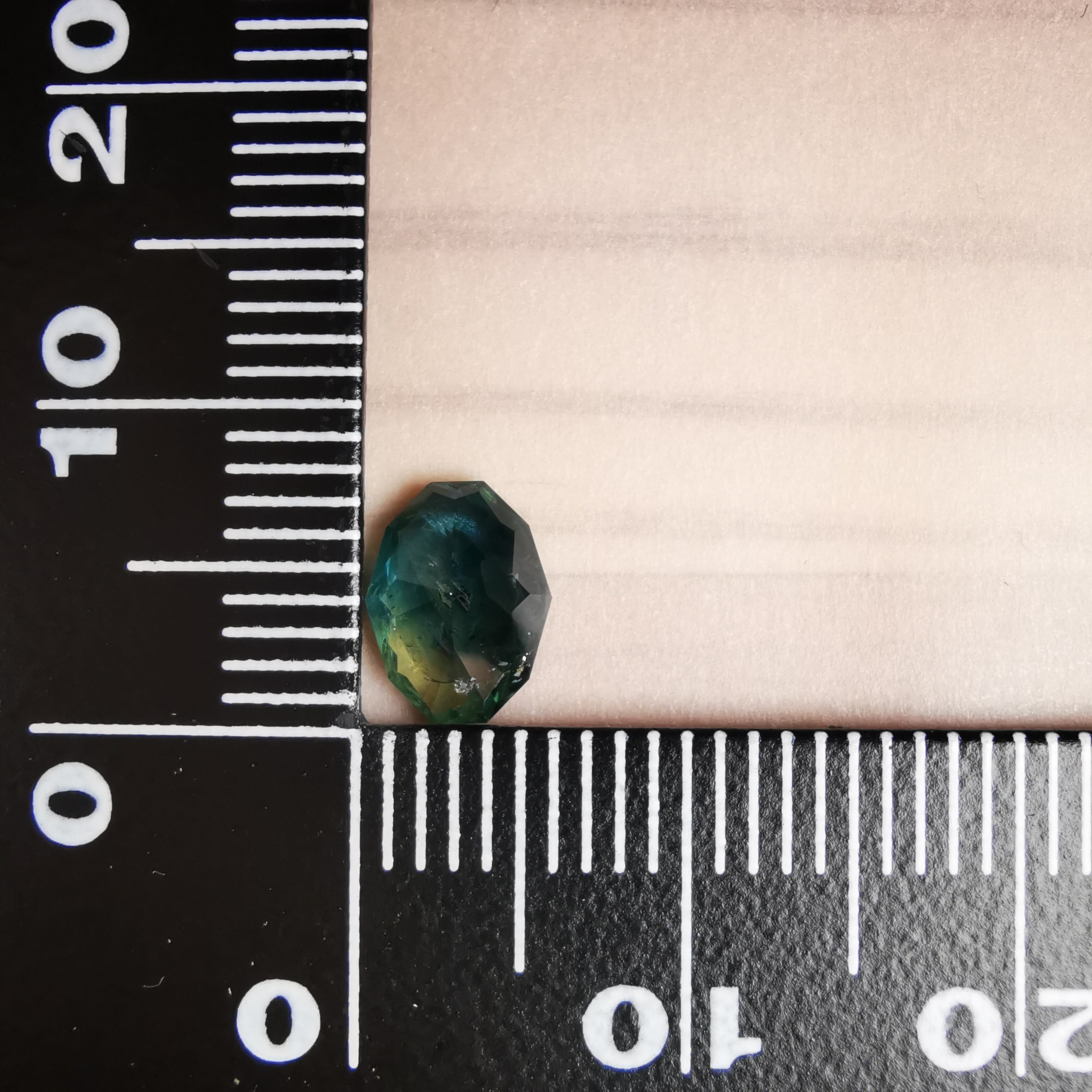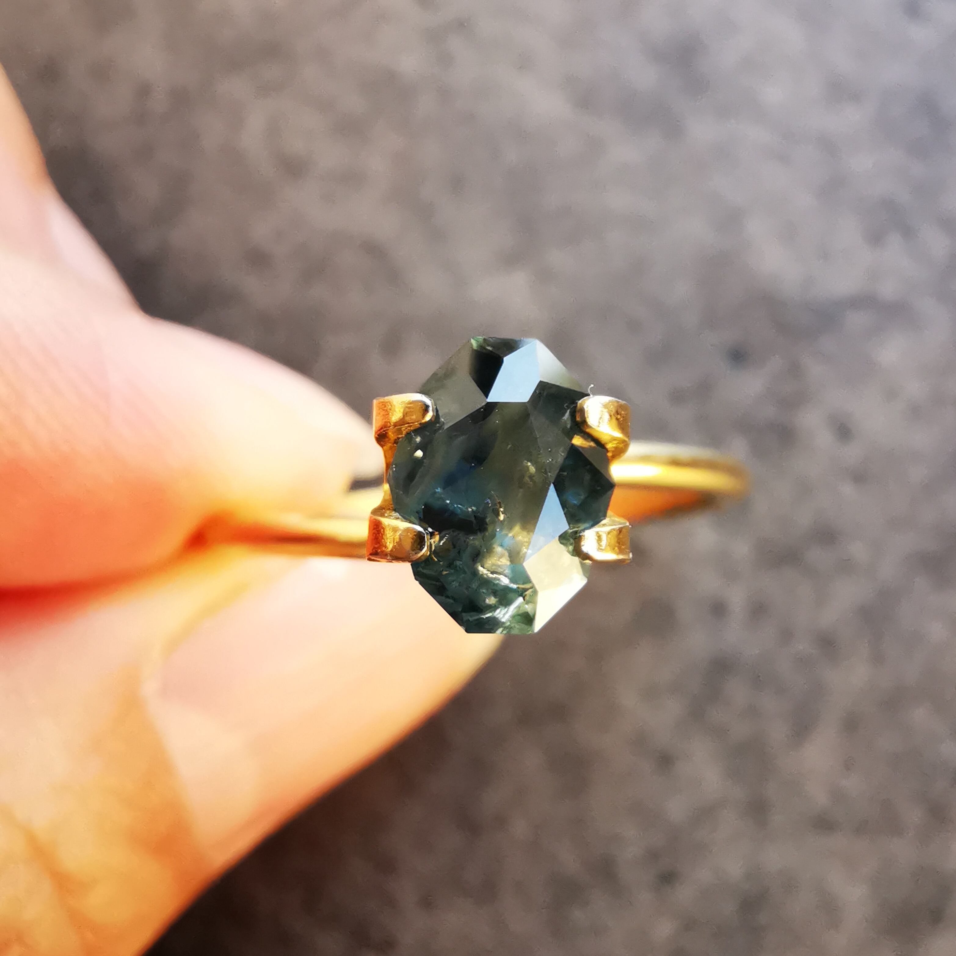 ブルーグリーンの石の一部がイエローに分かれたバイカラーのサファイアです。