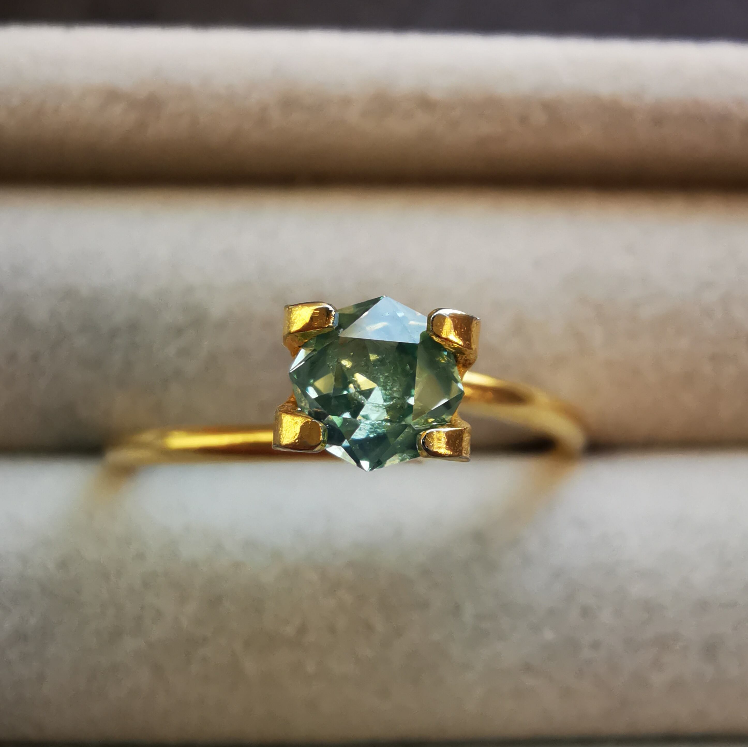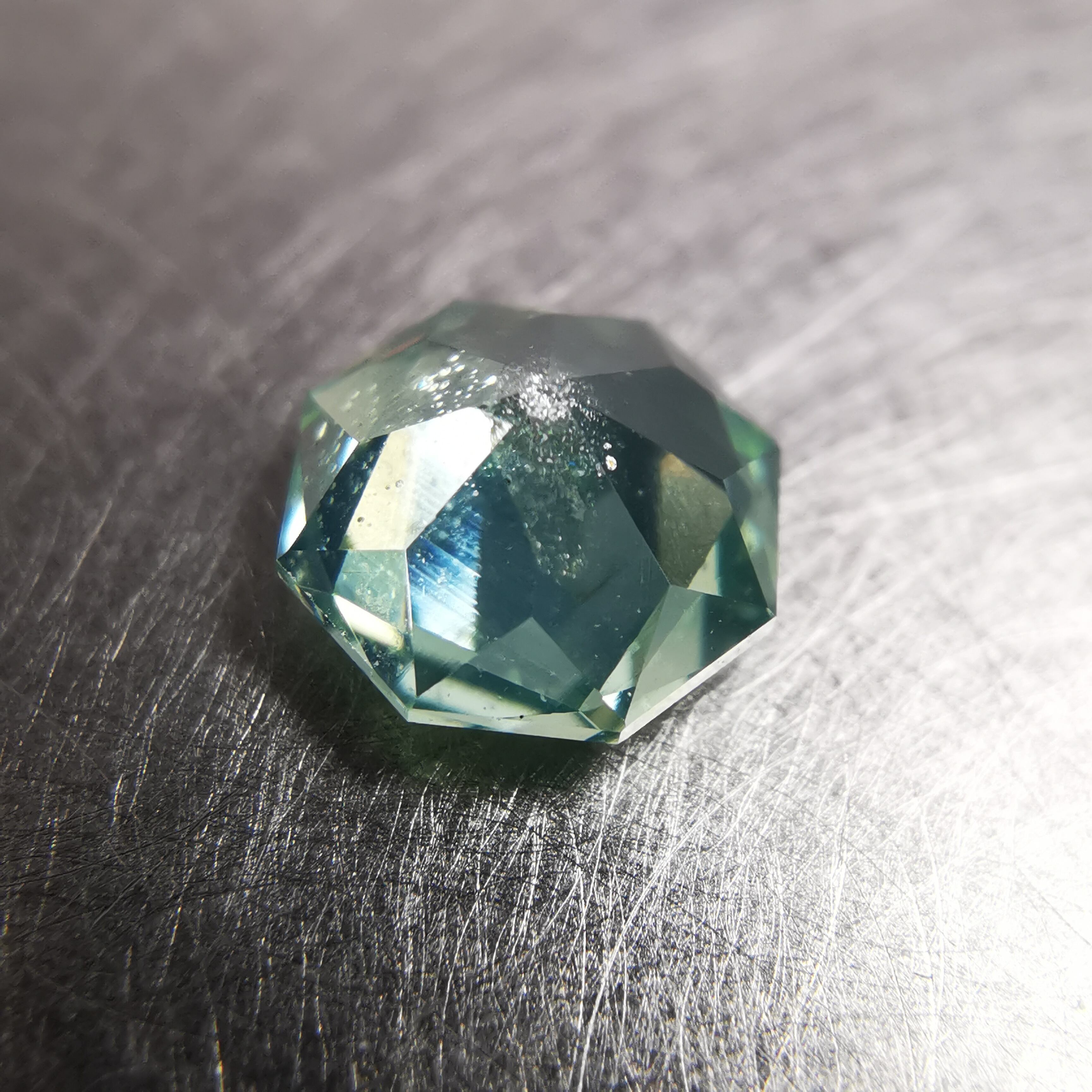 ただ、ブルージルコンとは全く違う輝きで、あえて言うなら、シルキーなグリーンサファイアのような、ややメタリックな輝きです。