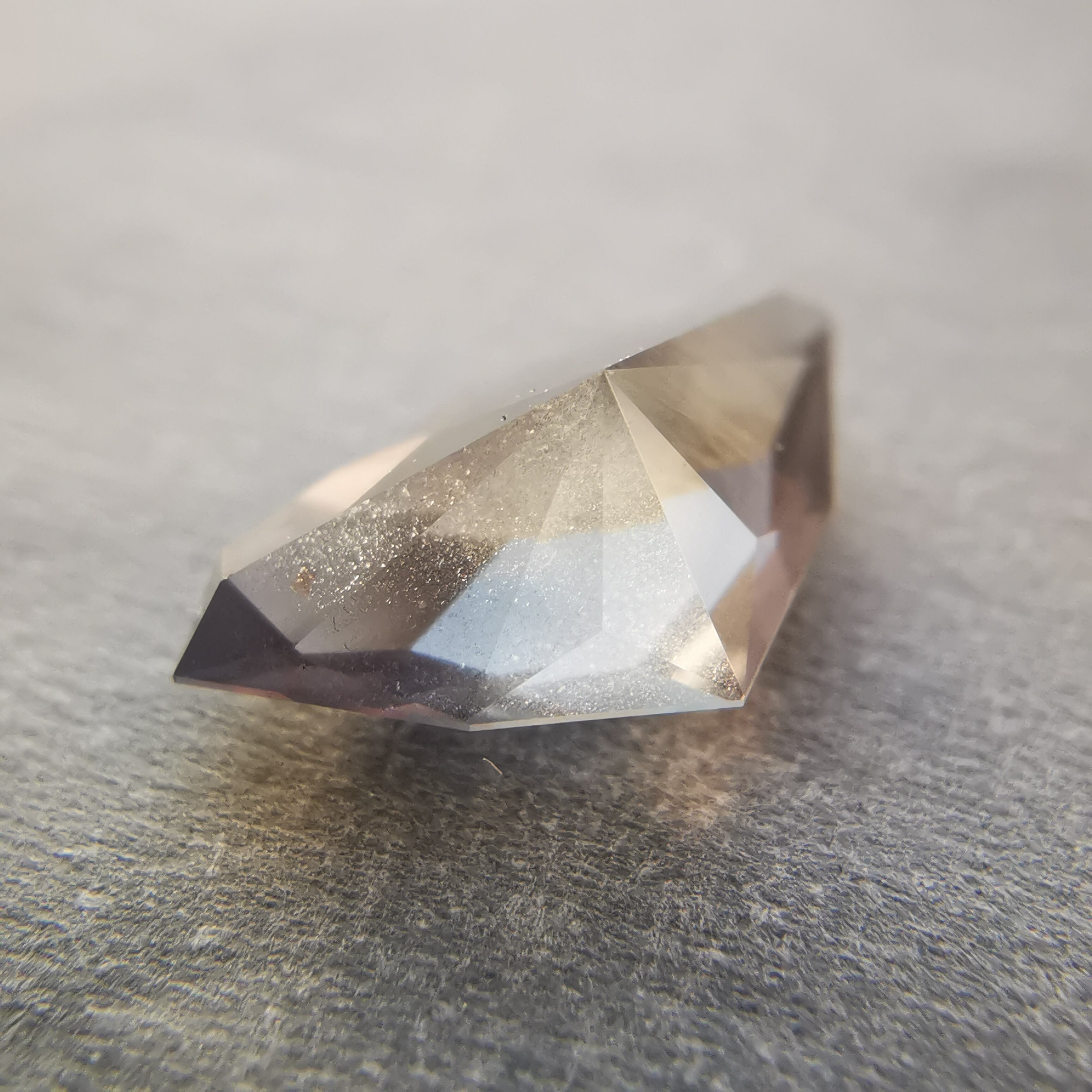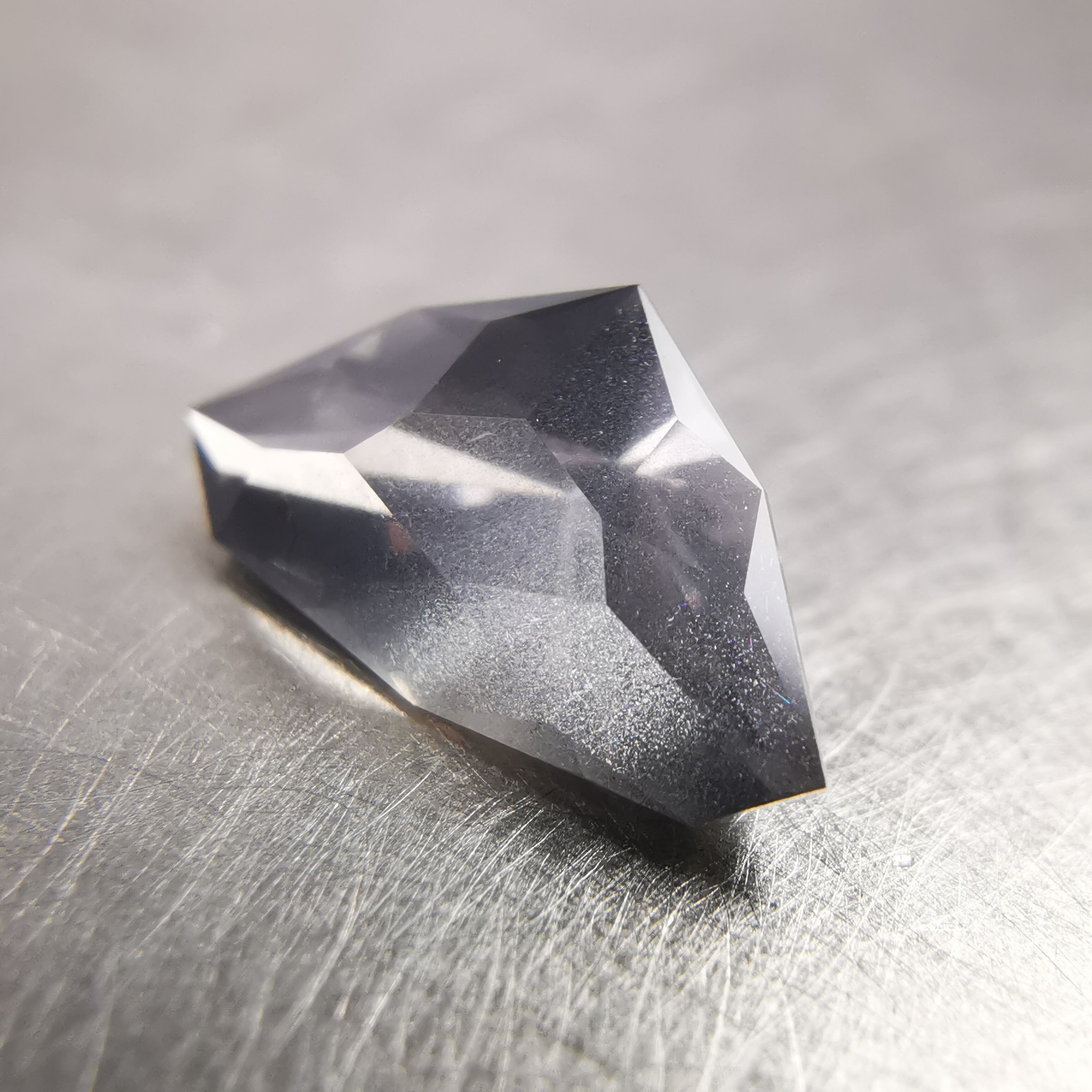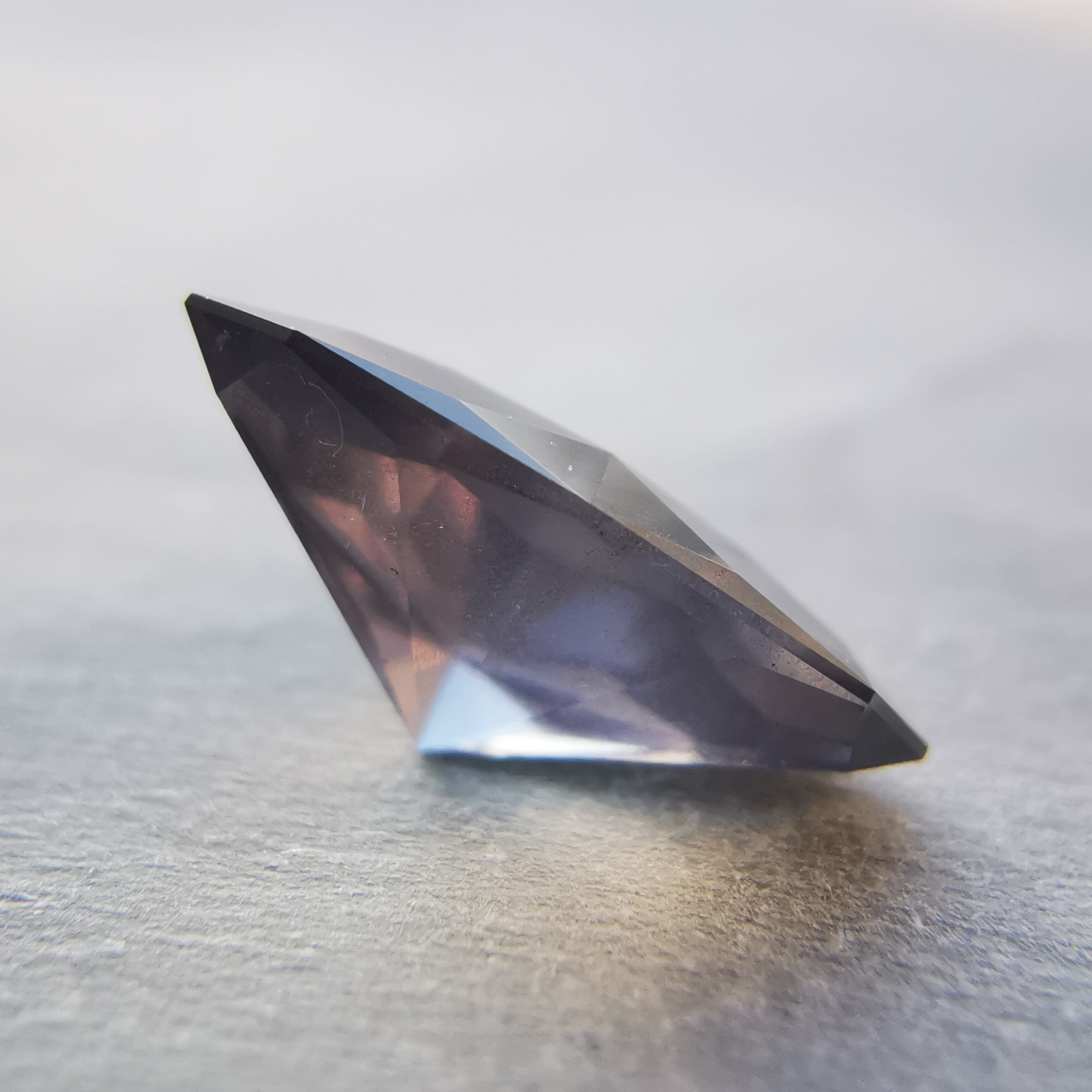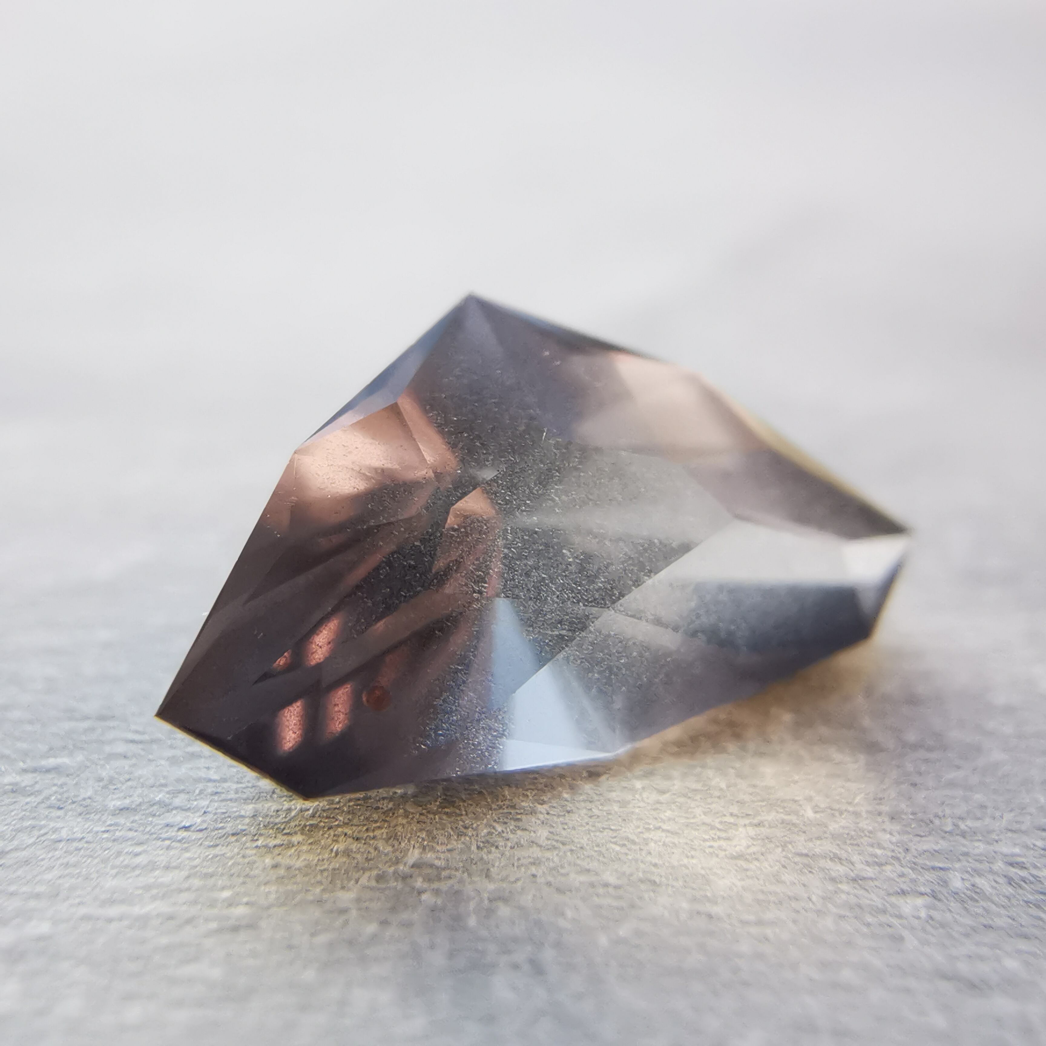 照明の下ではメタリックなグレー、太陽光の下ではややピンクみを帯びて、シルキーなインクルージョンがチラチラと輝きます。