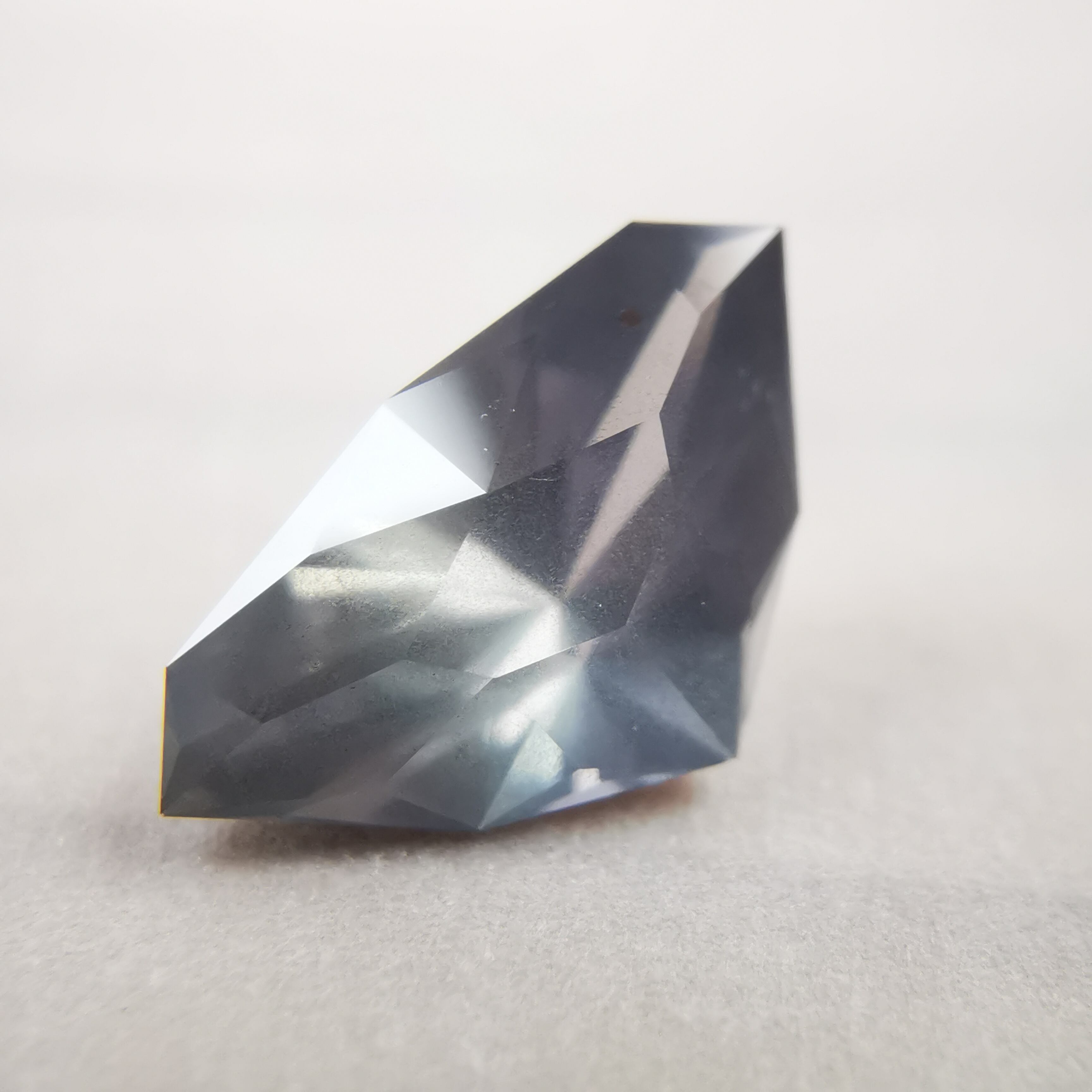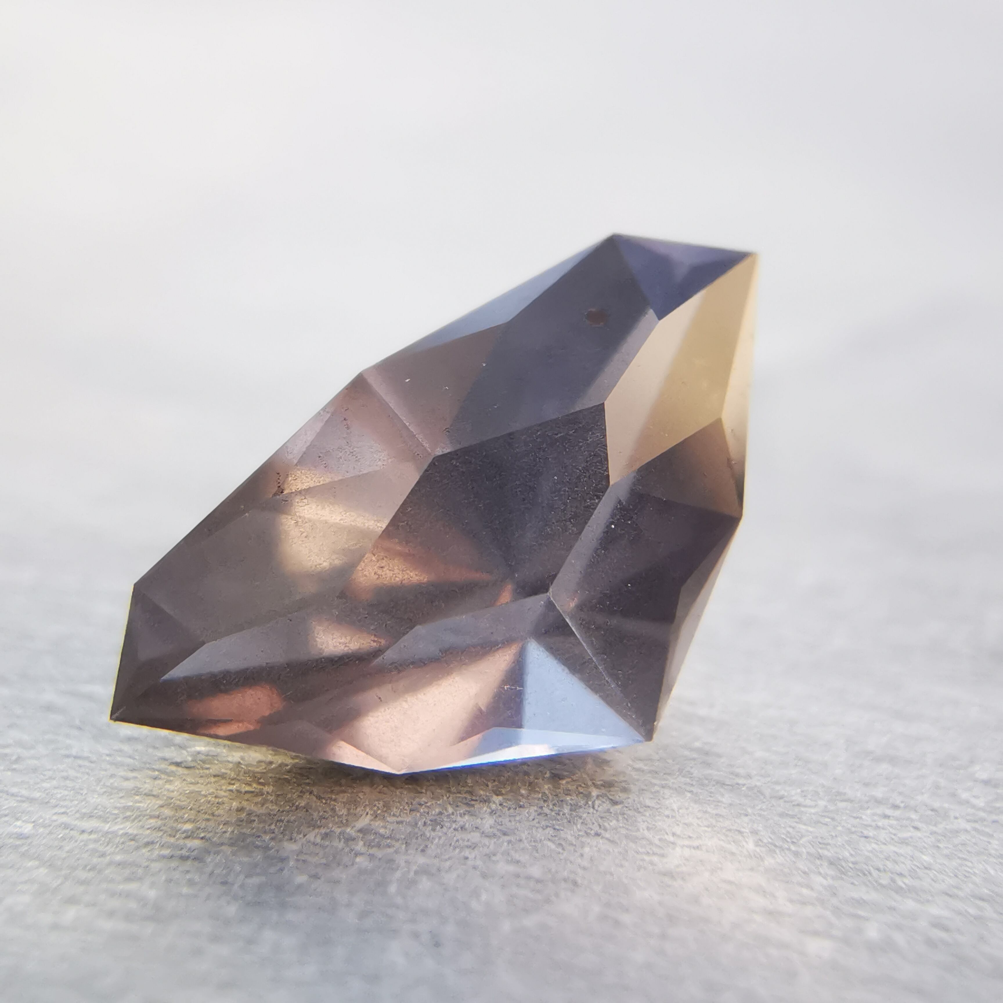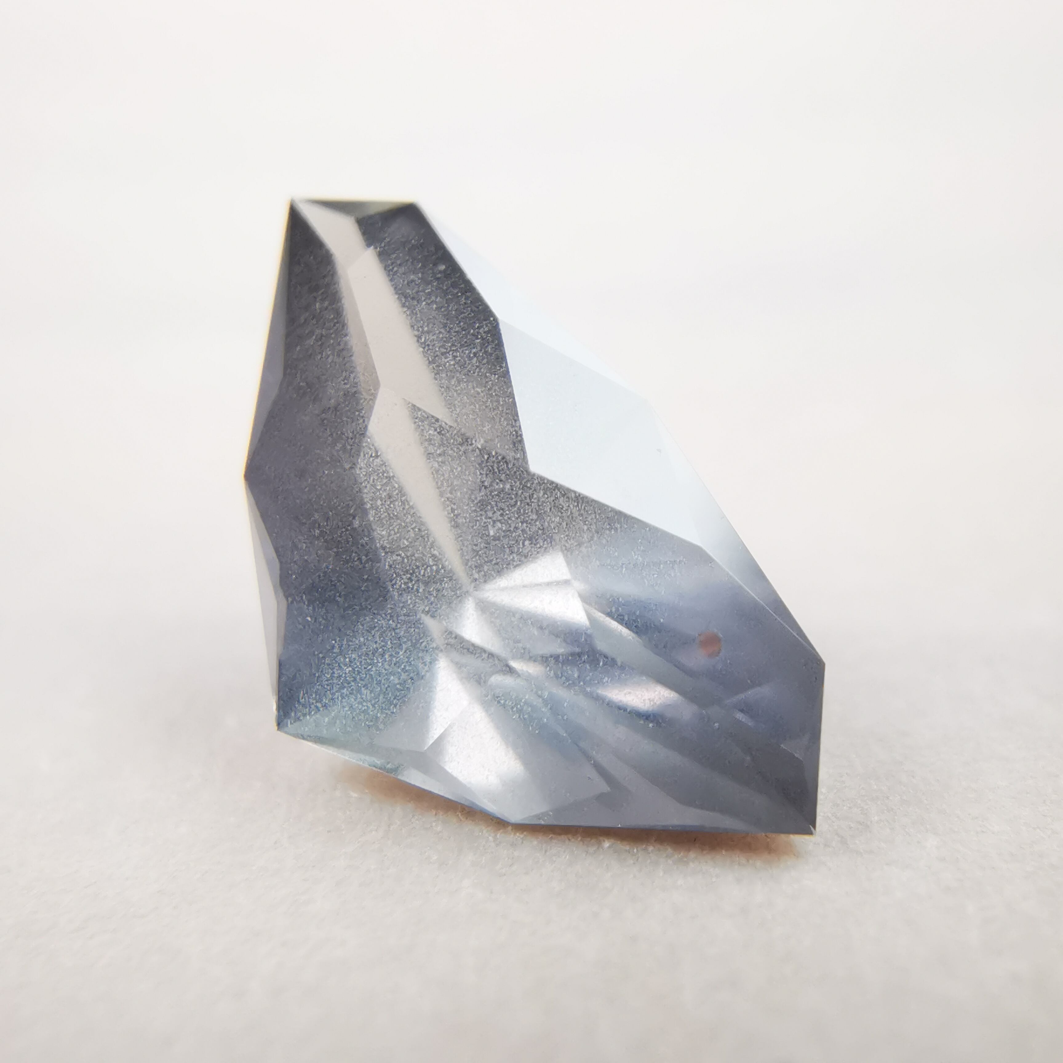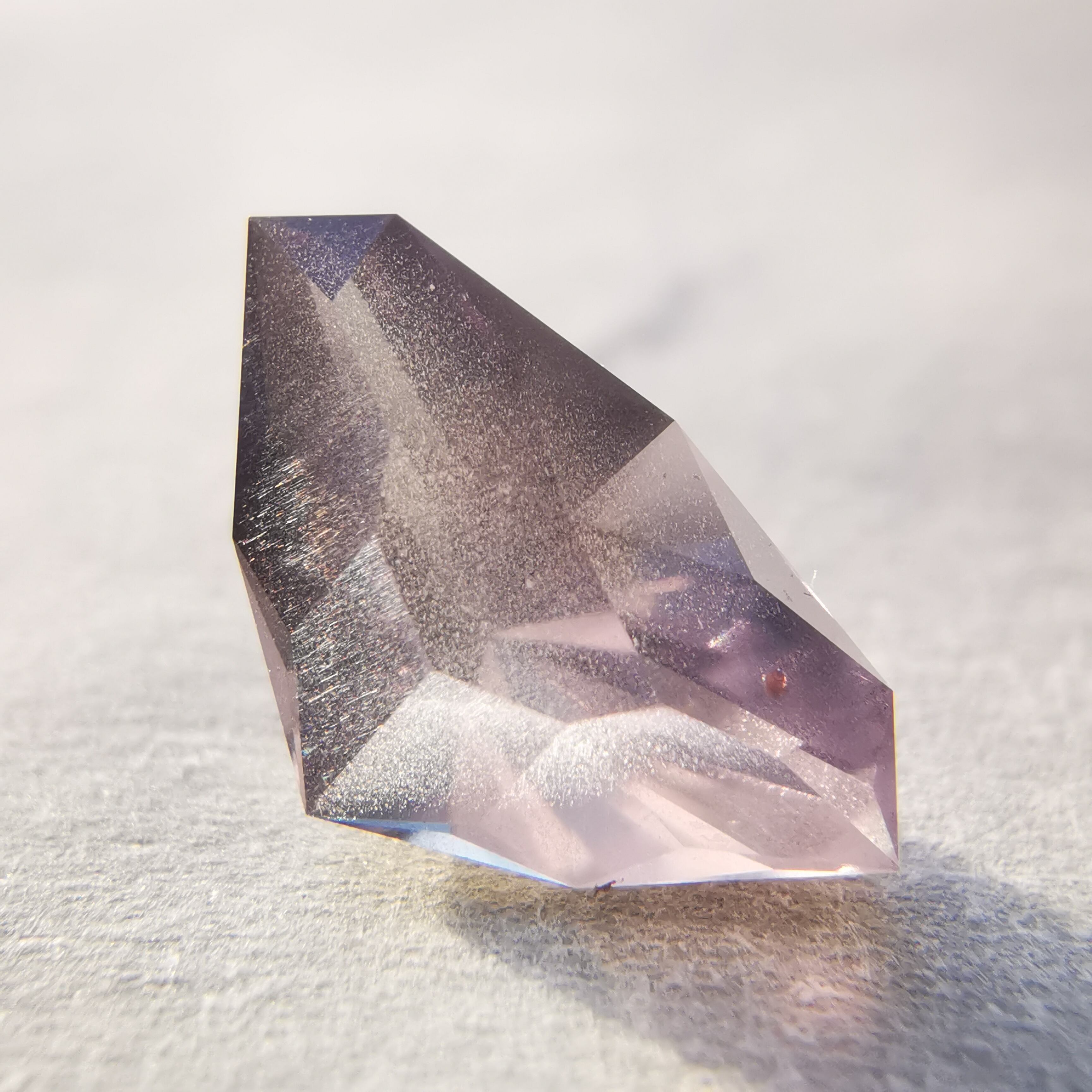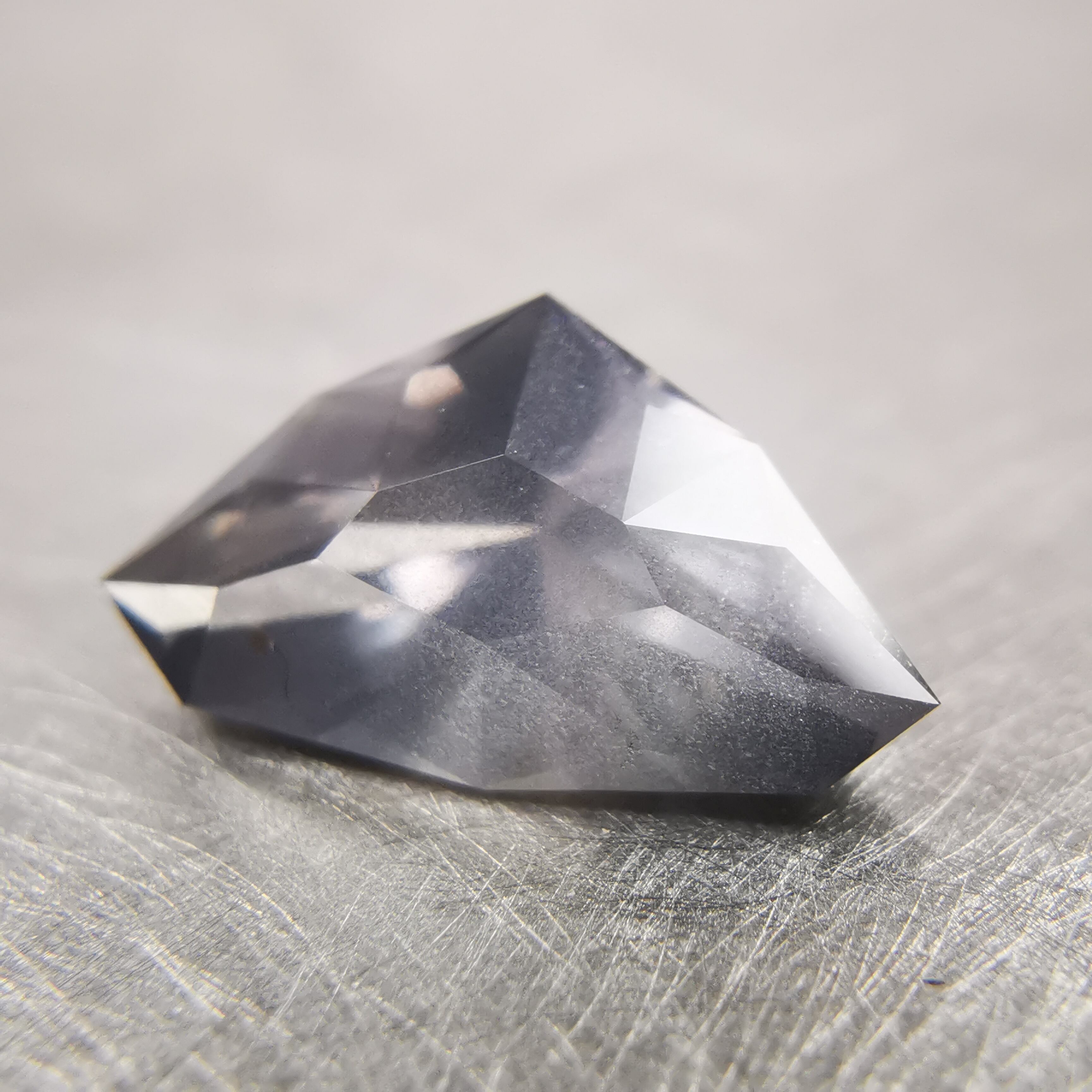 照明の下ではメタリックなグレー、太陽光の下ではややピンクみを帯びて、シルキーなインクルージョンがチラチラと輝きます。