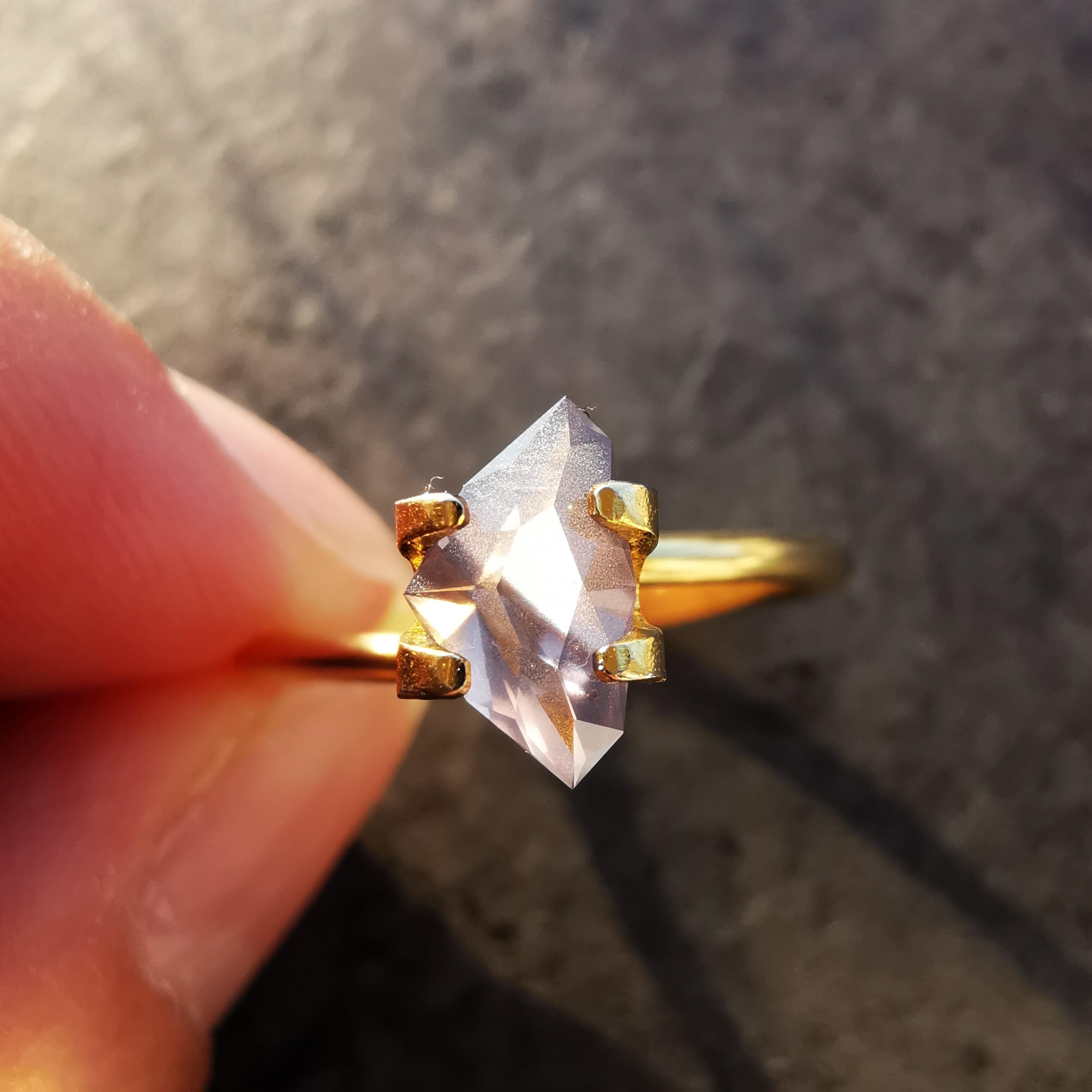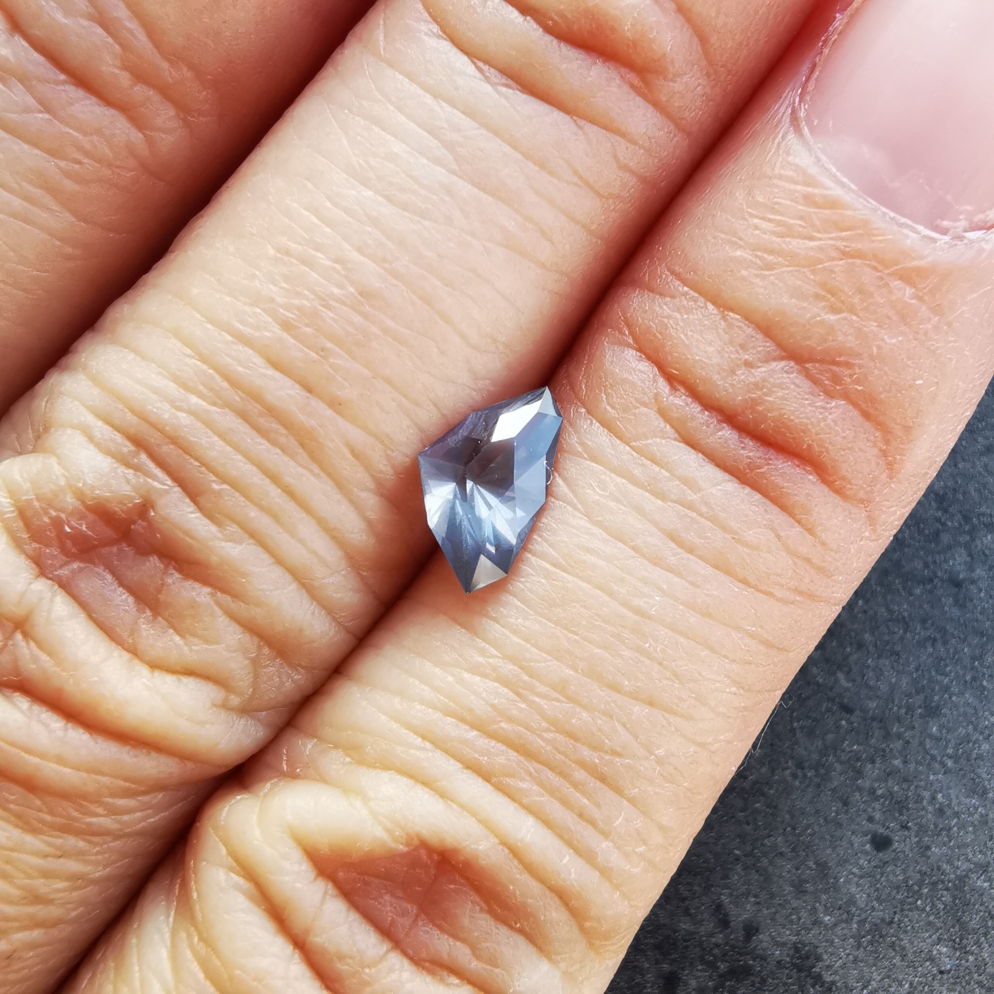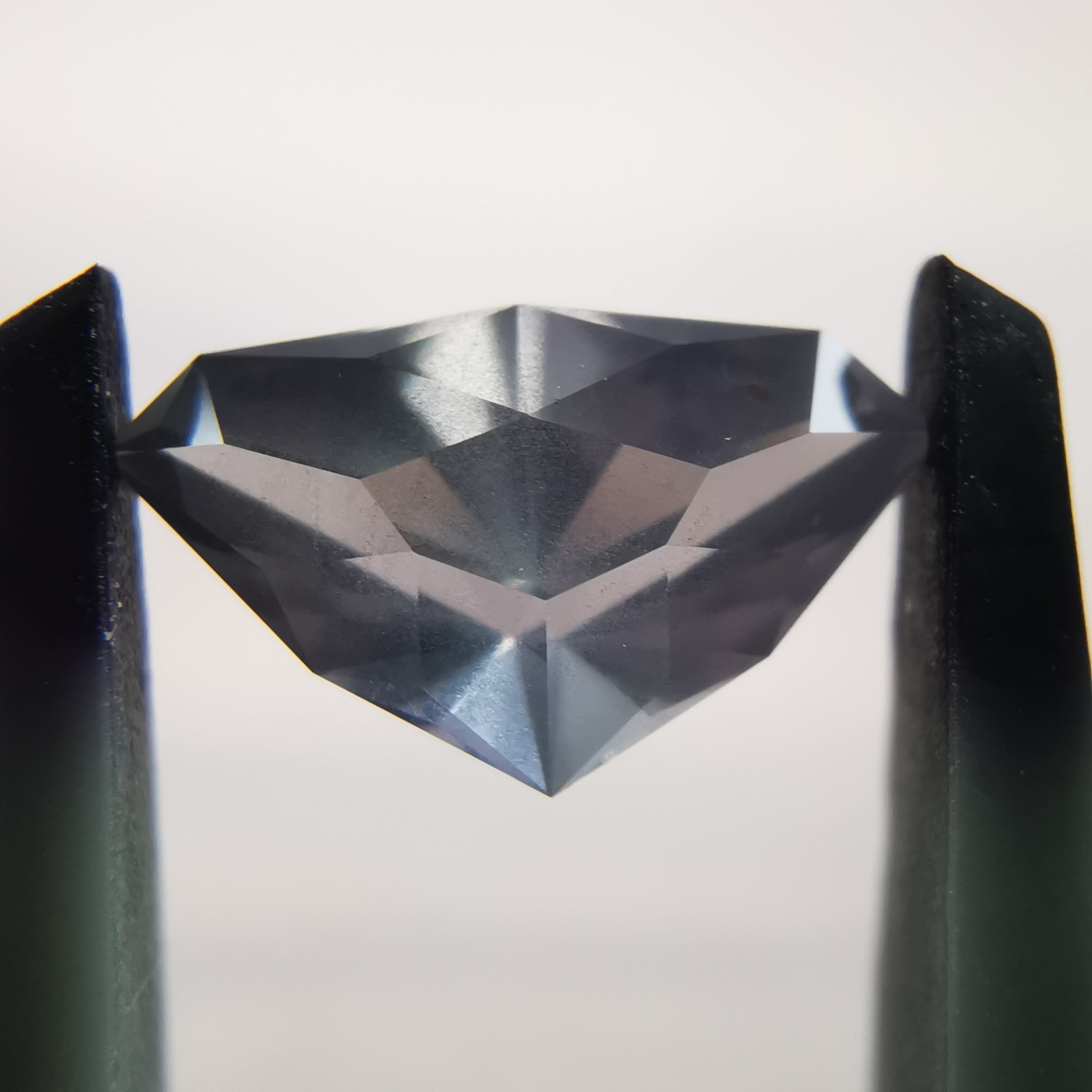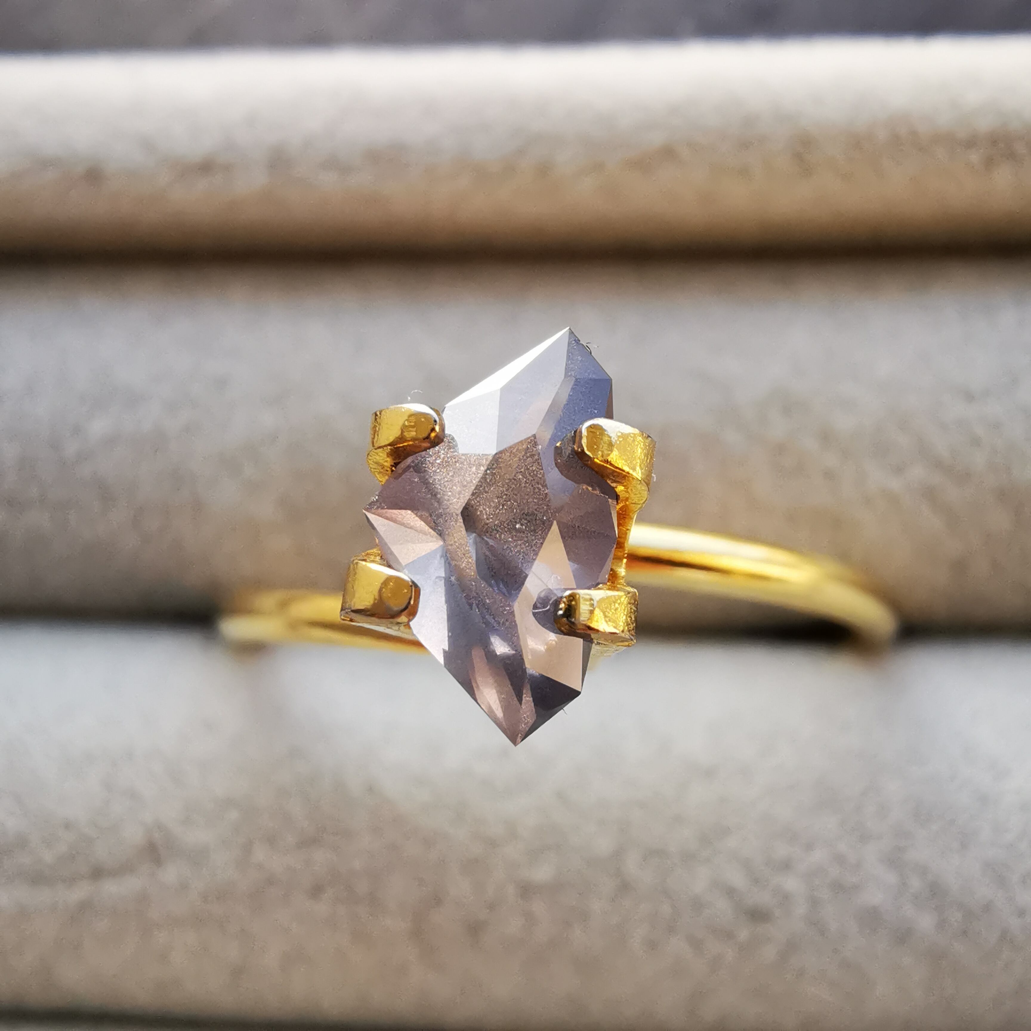 照明の下ではメタリックなグレー、太陽光の下ではややピンクみを帯びて、シルキーなインクルージョンがチラチラと輝きます。