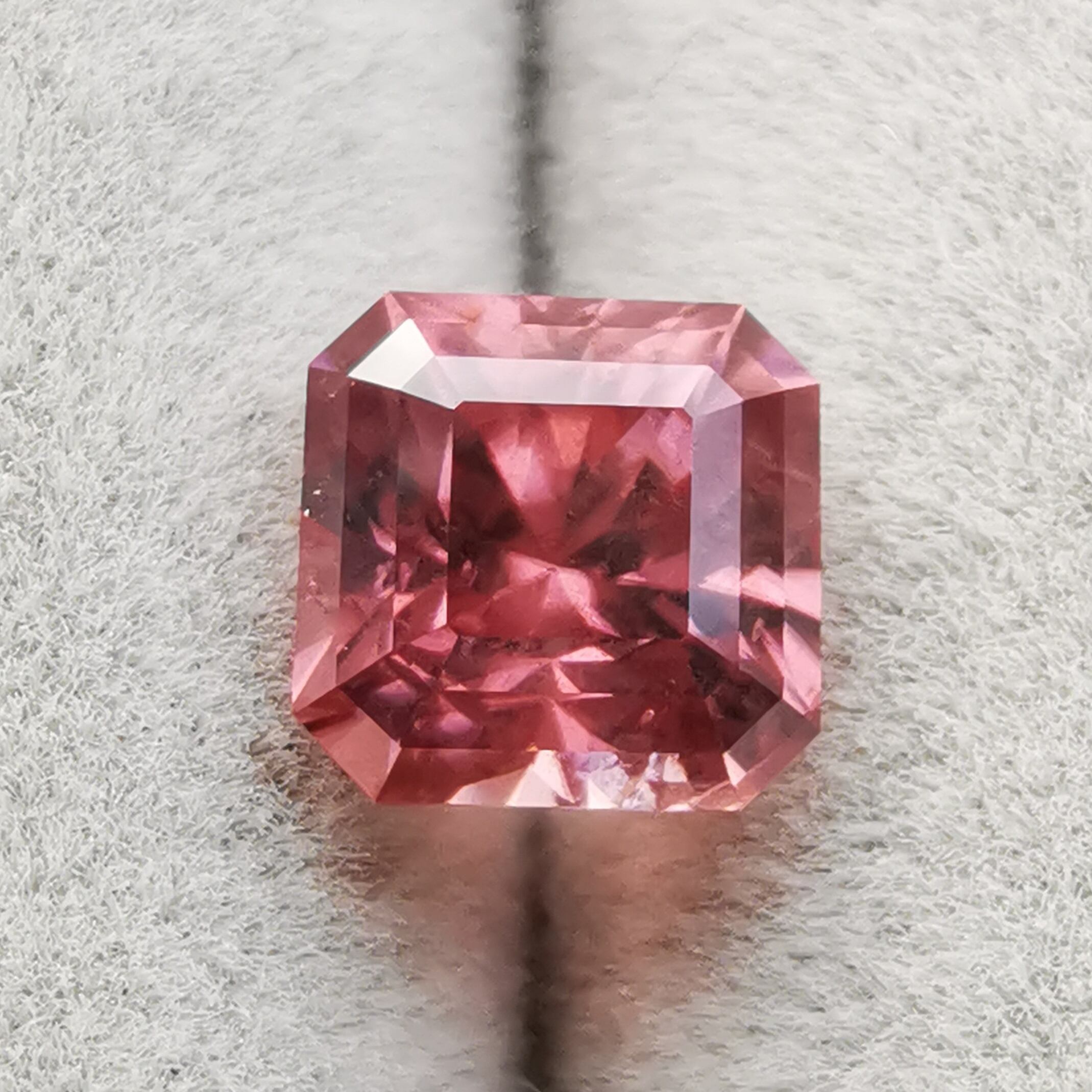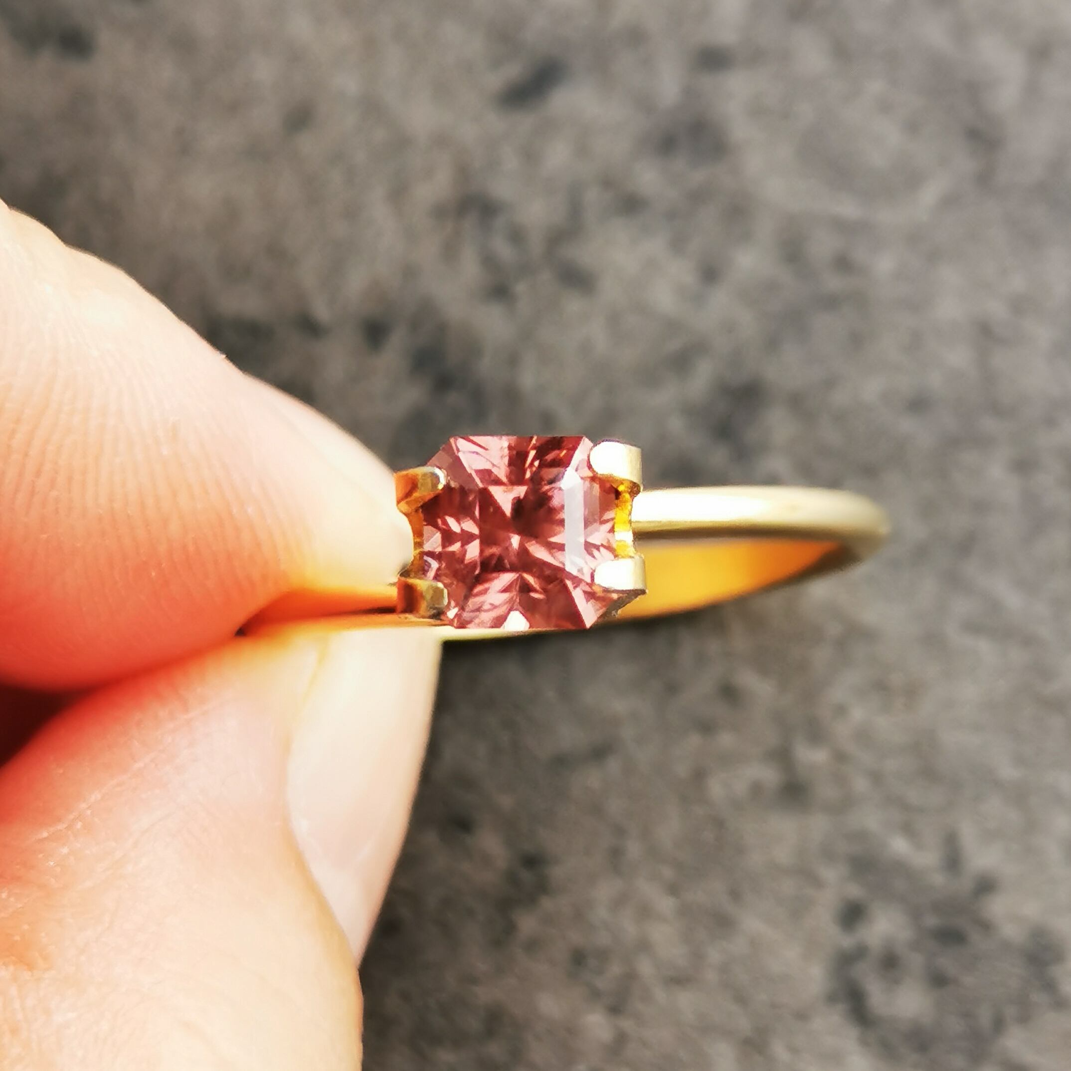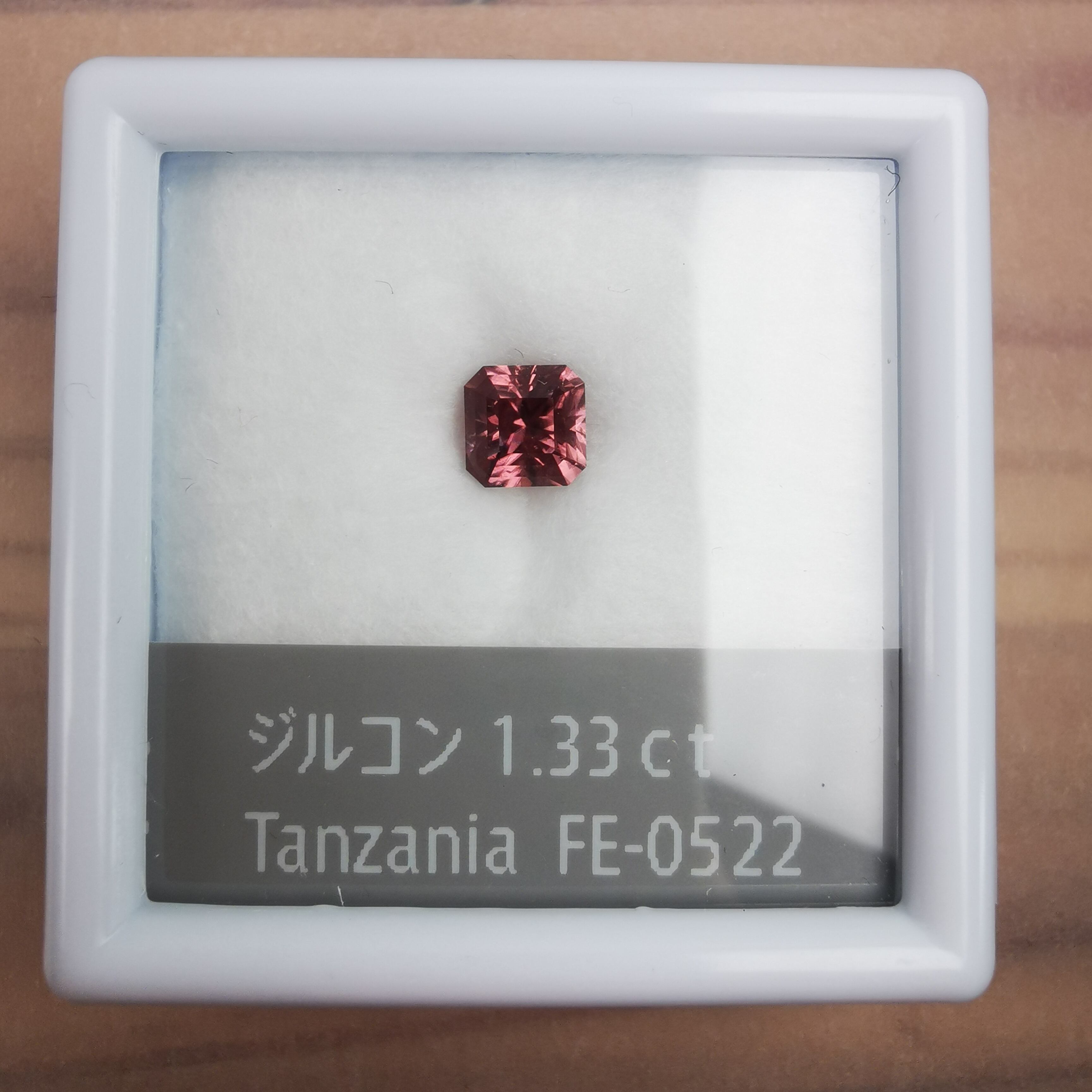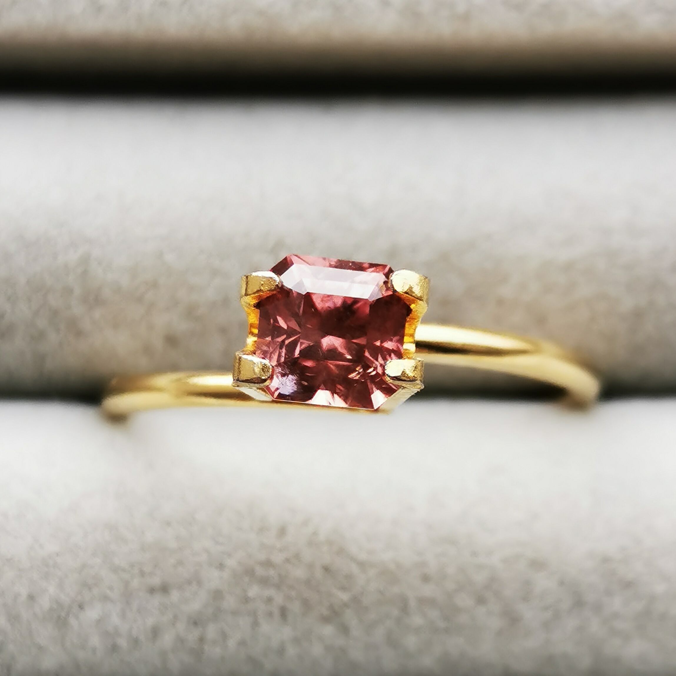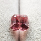 落ち着いたピンク色、今様色と表現したくなるようなピンクジルコンで、赤いきらめきが印象的です。