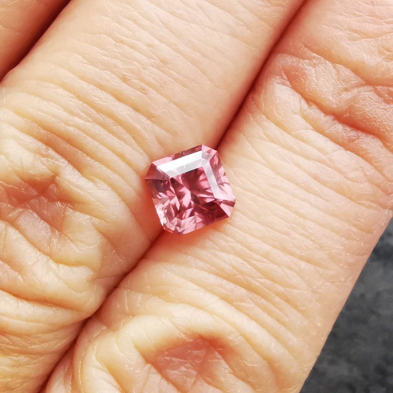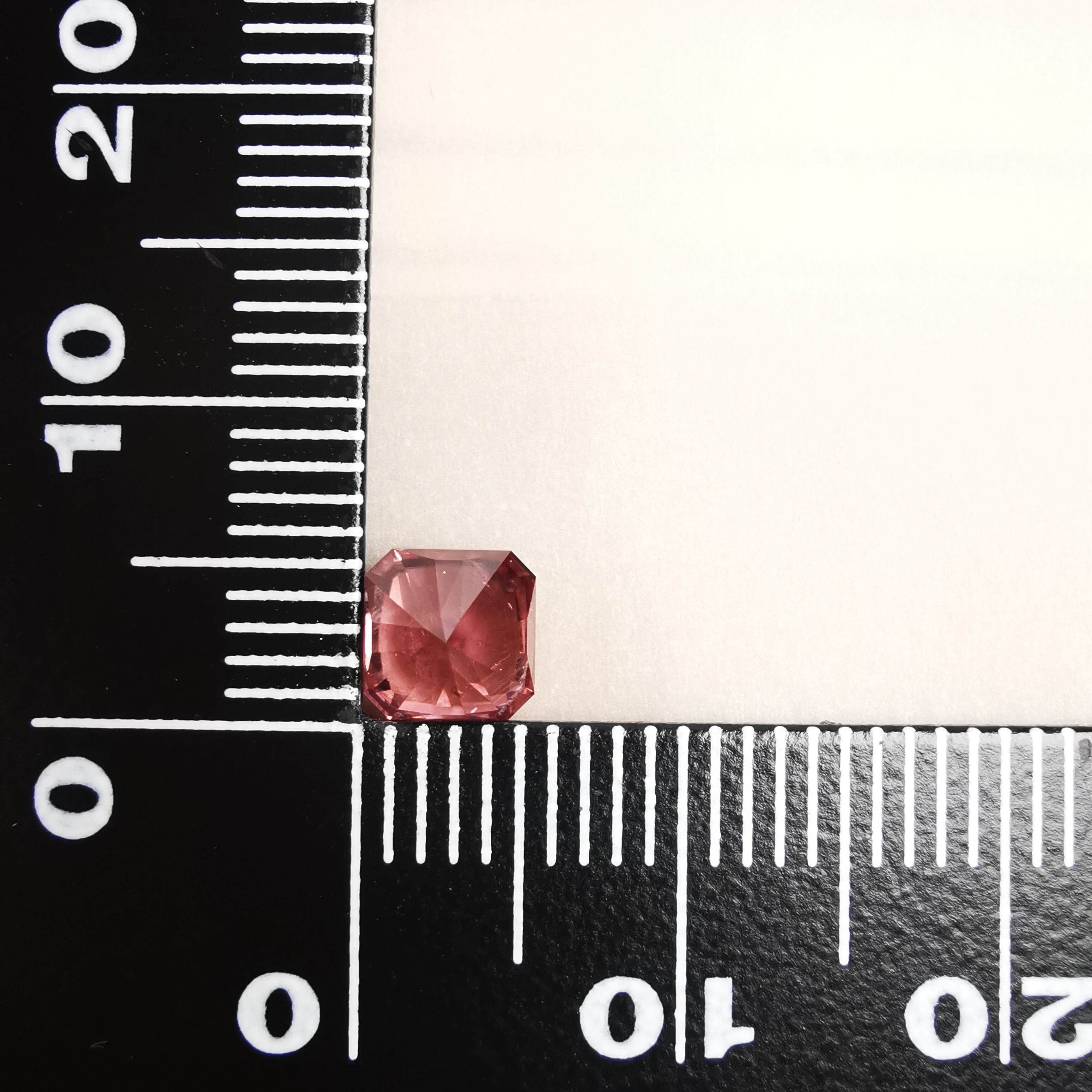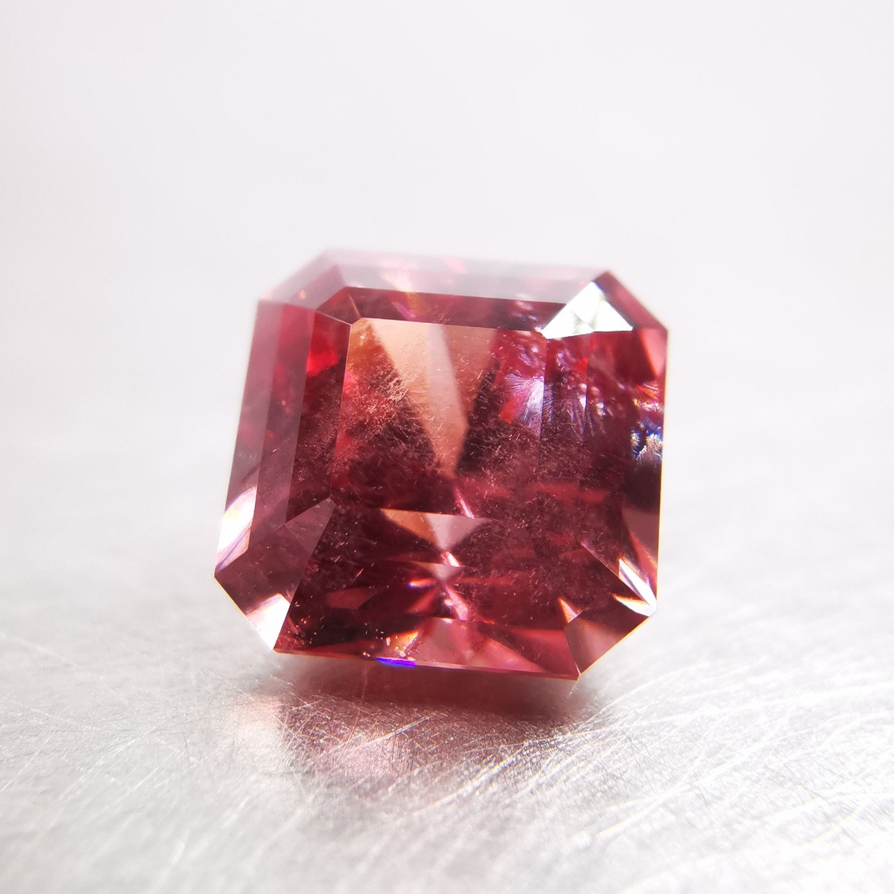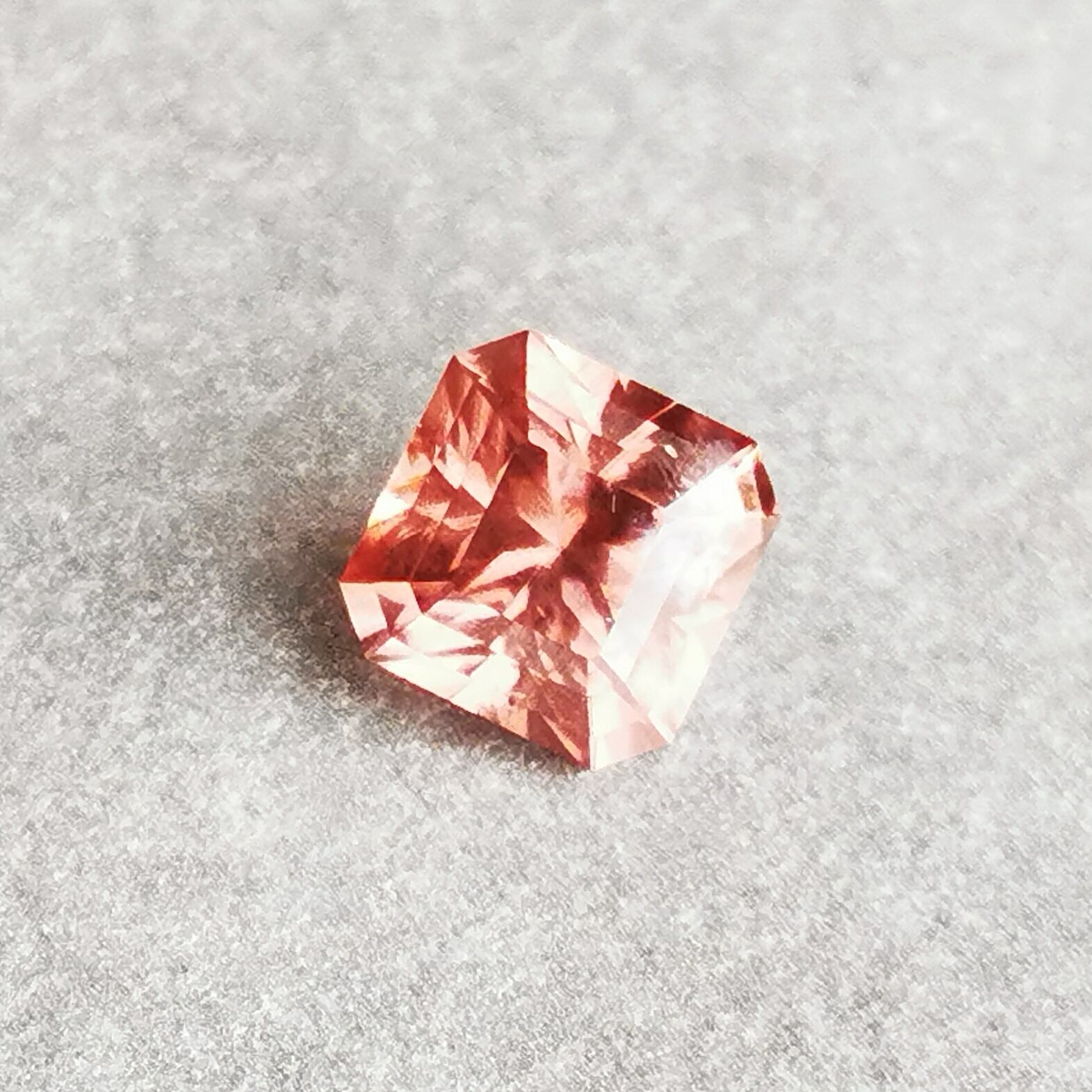 落ち着いたピンク色、今様色と表現したくなるようなピンクジルコンで、赤いきらめきが印象的です。