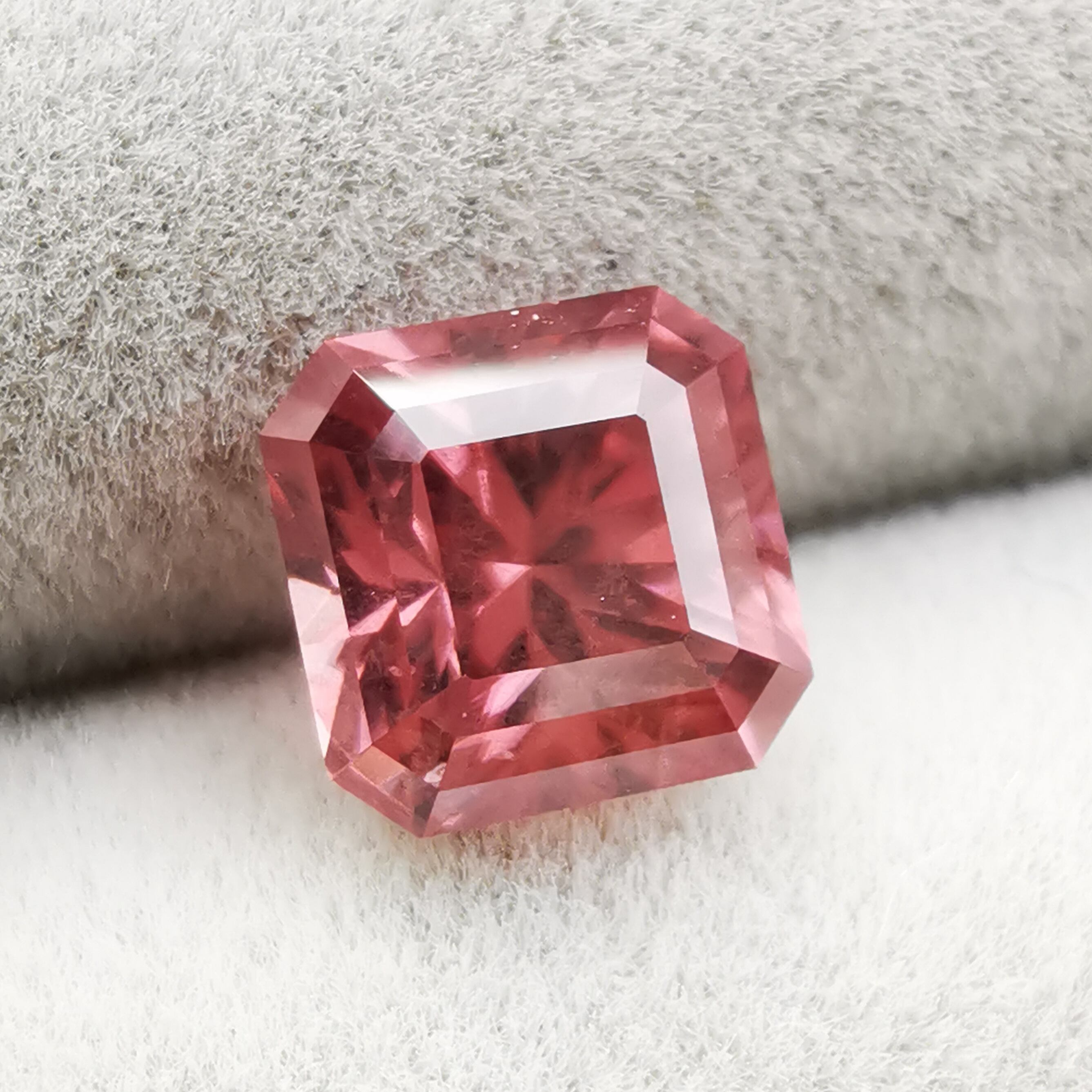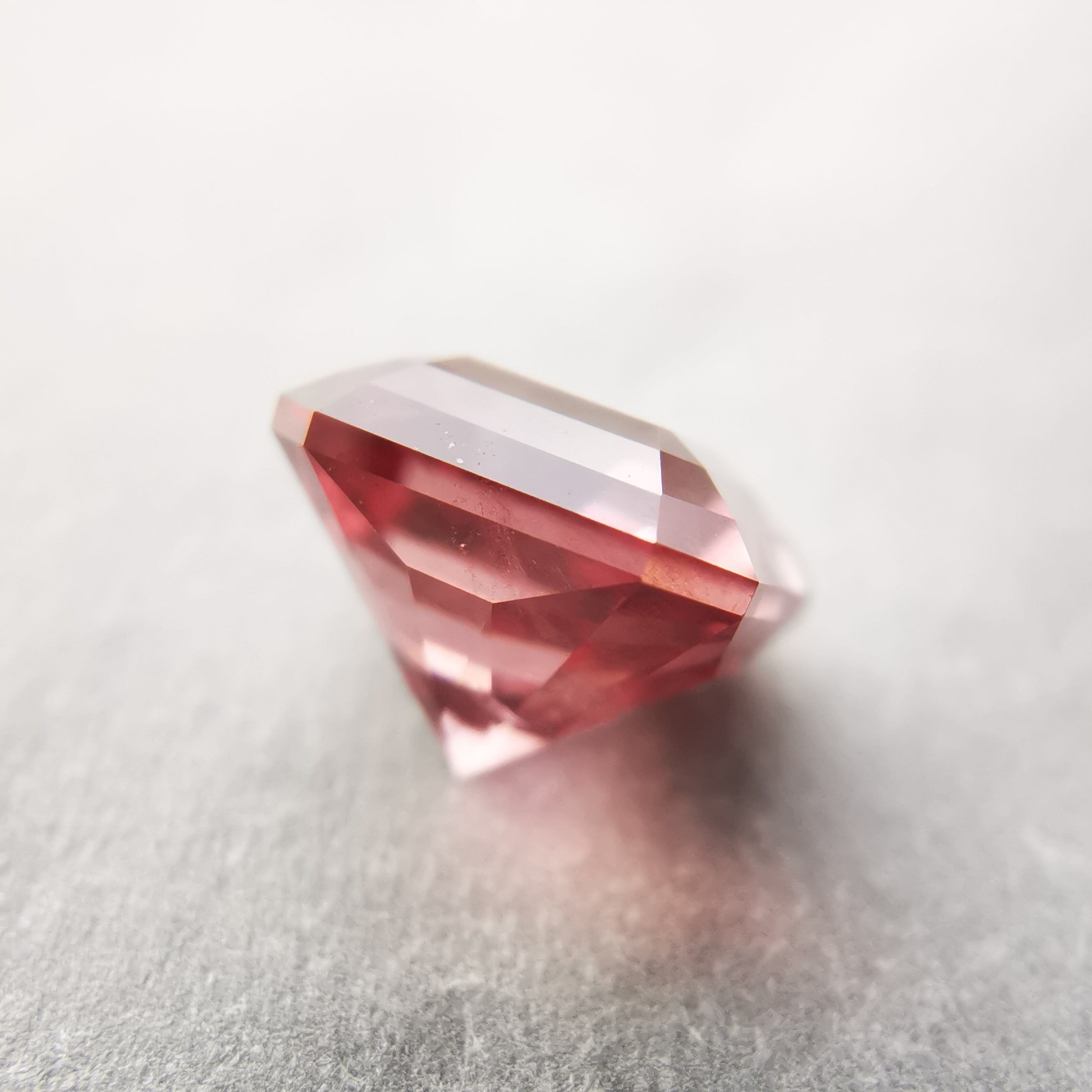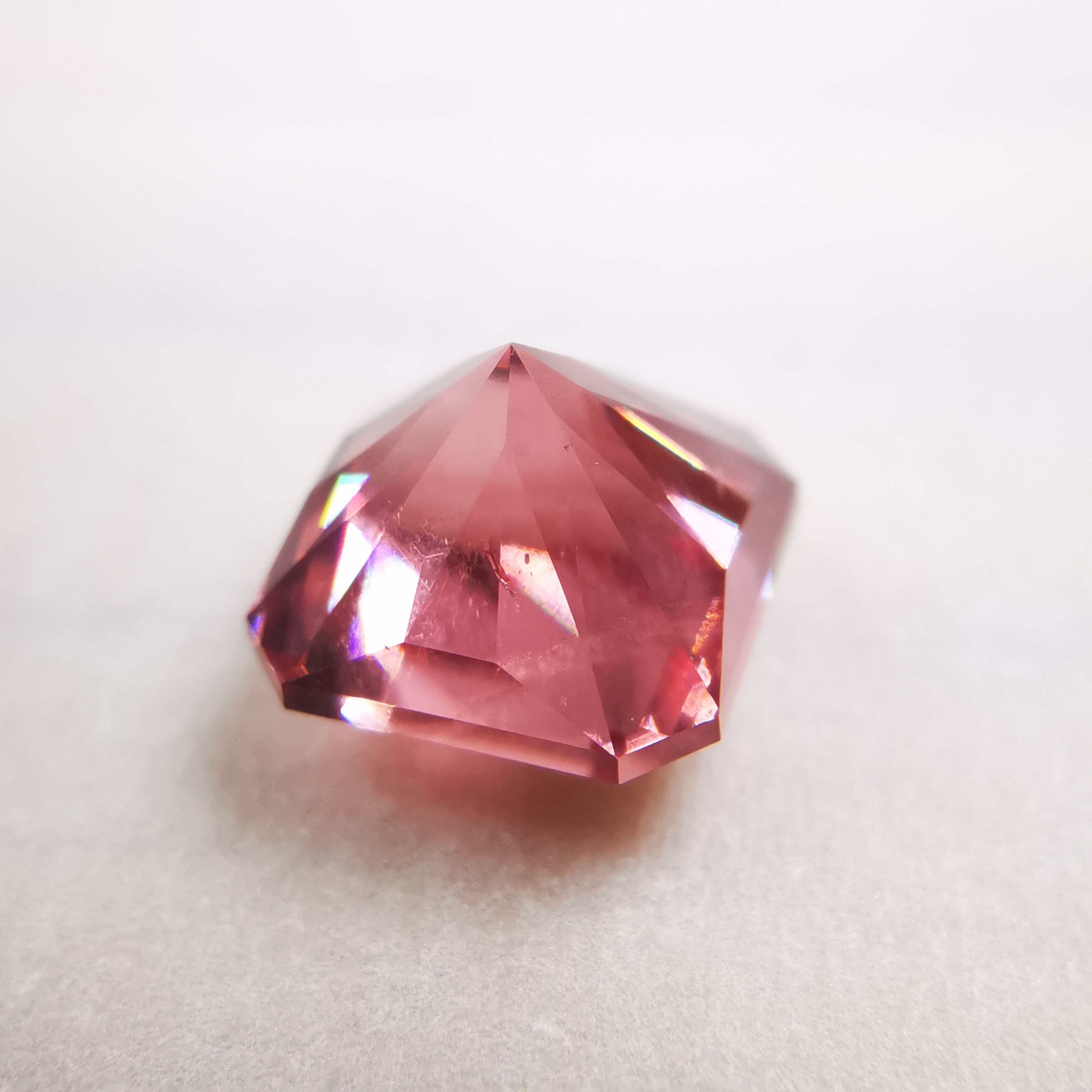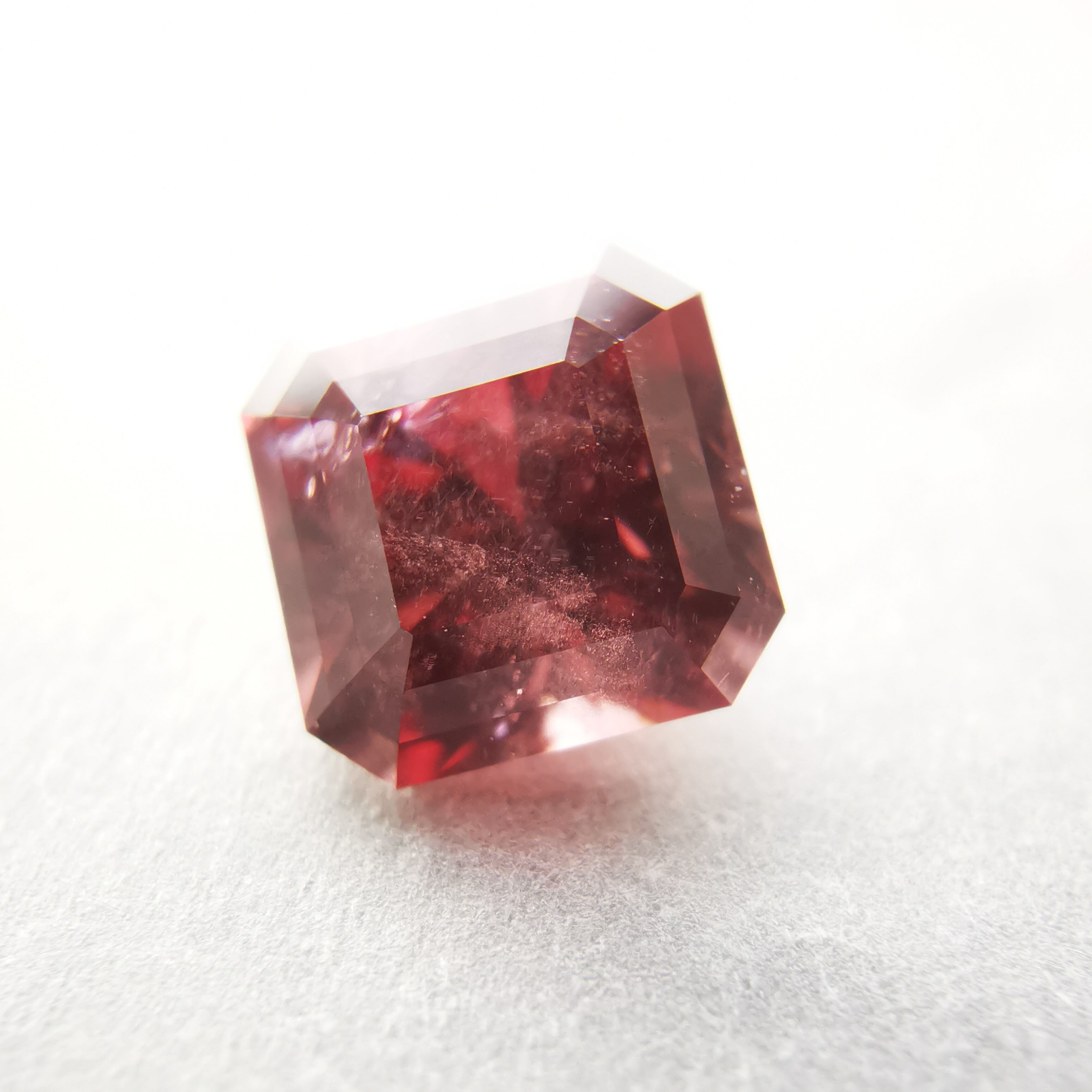 落ち着いたピンク色、今様色と表現したくなるようなピンクジルコンで、赤いきらめきが印象的です。