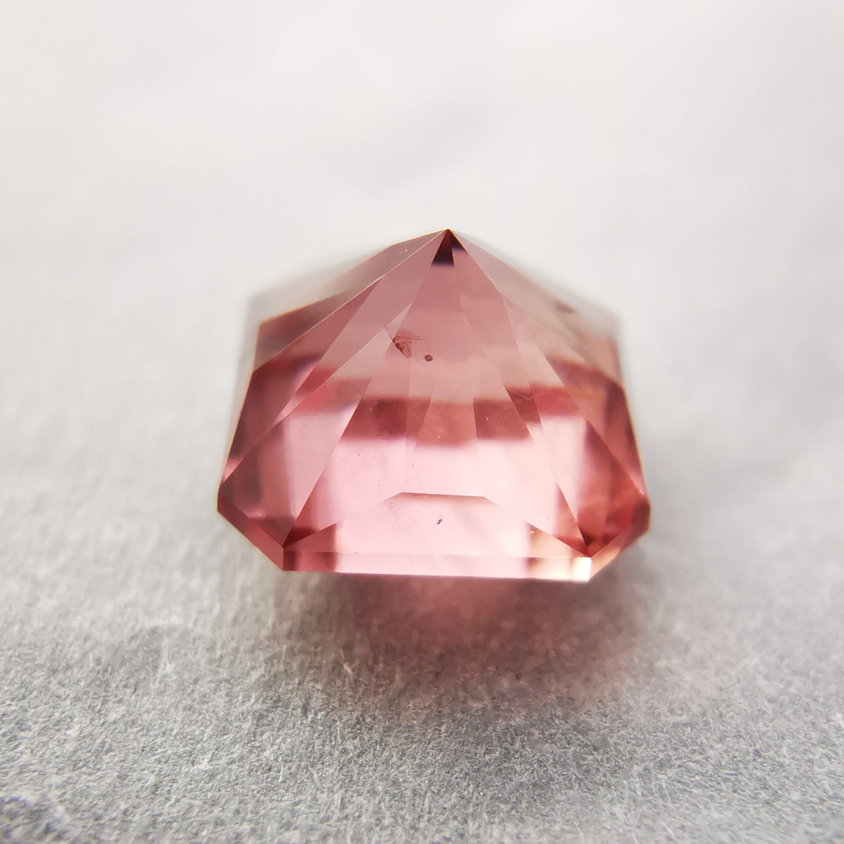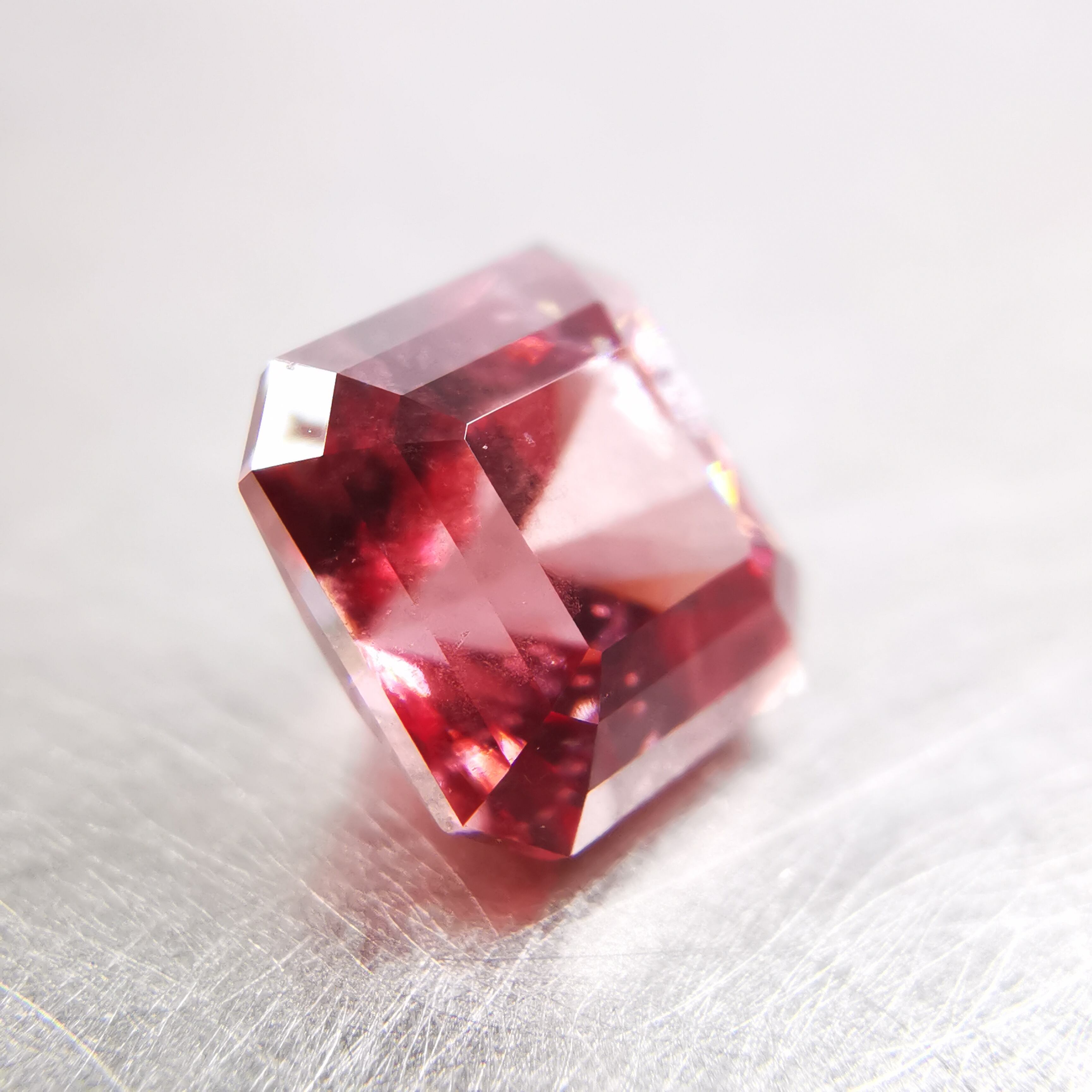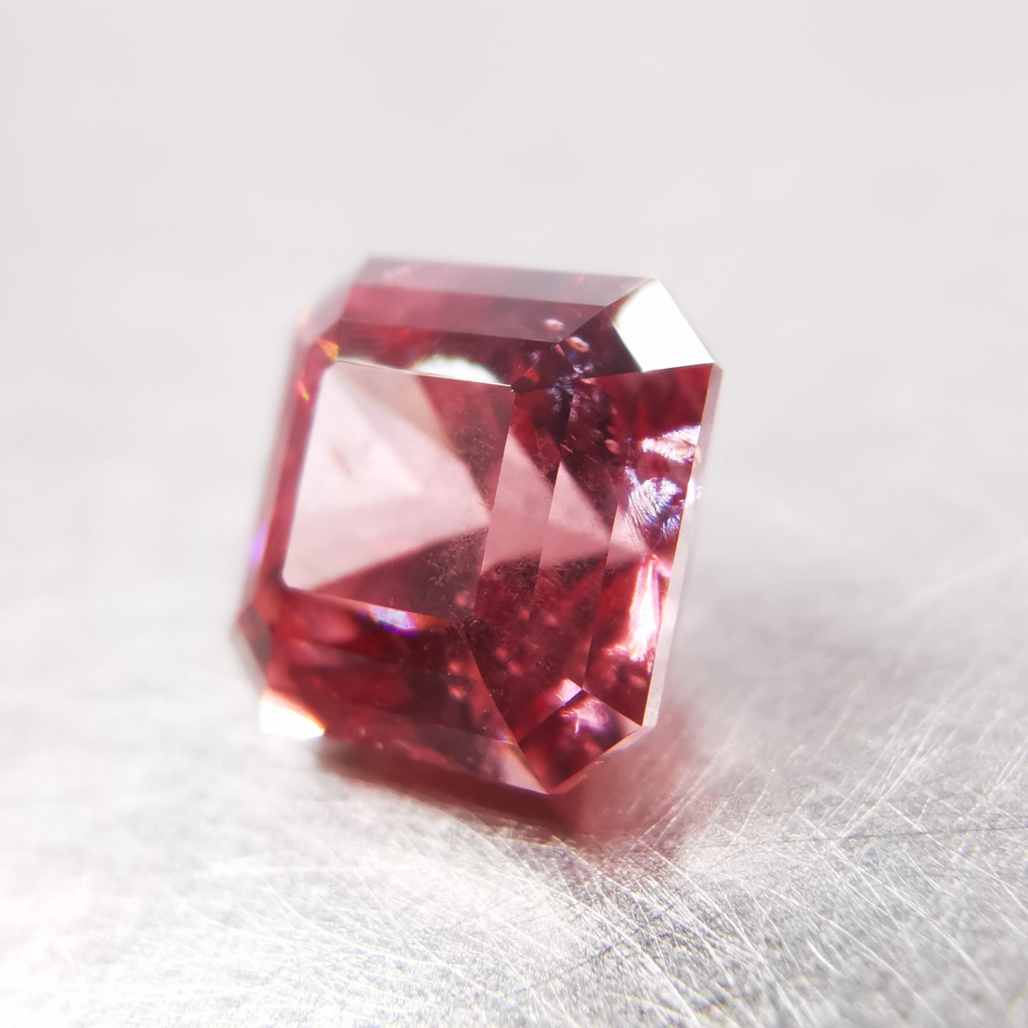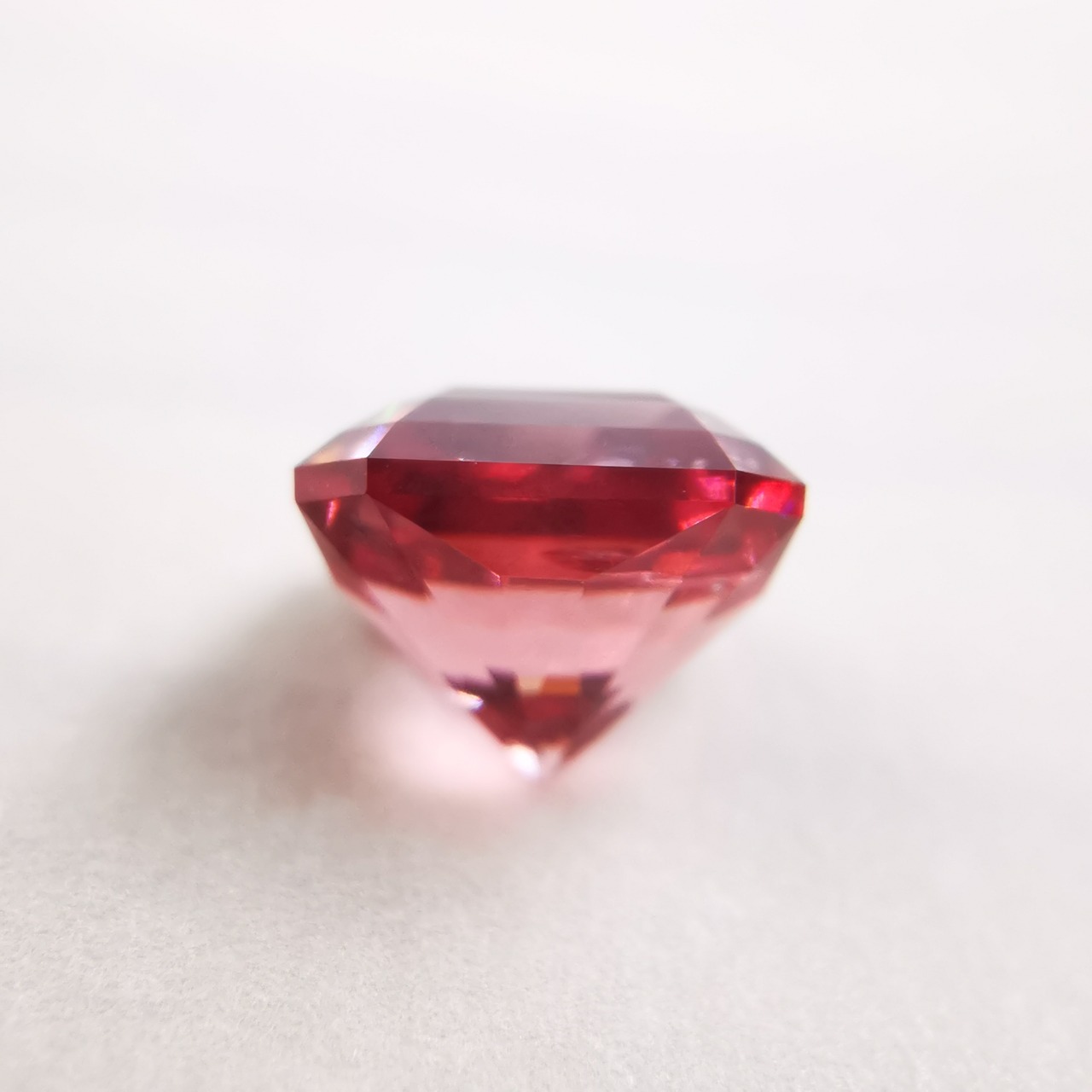 落ち着いたピンク色、今様色と表現したくなるようなピンクジルコンで、赤いきらめきが印象的です。