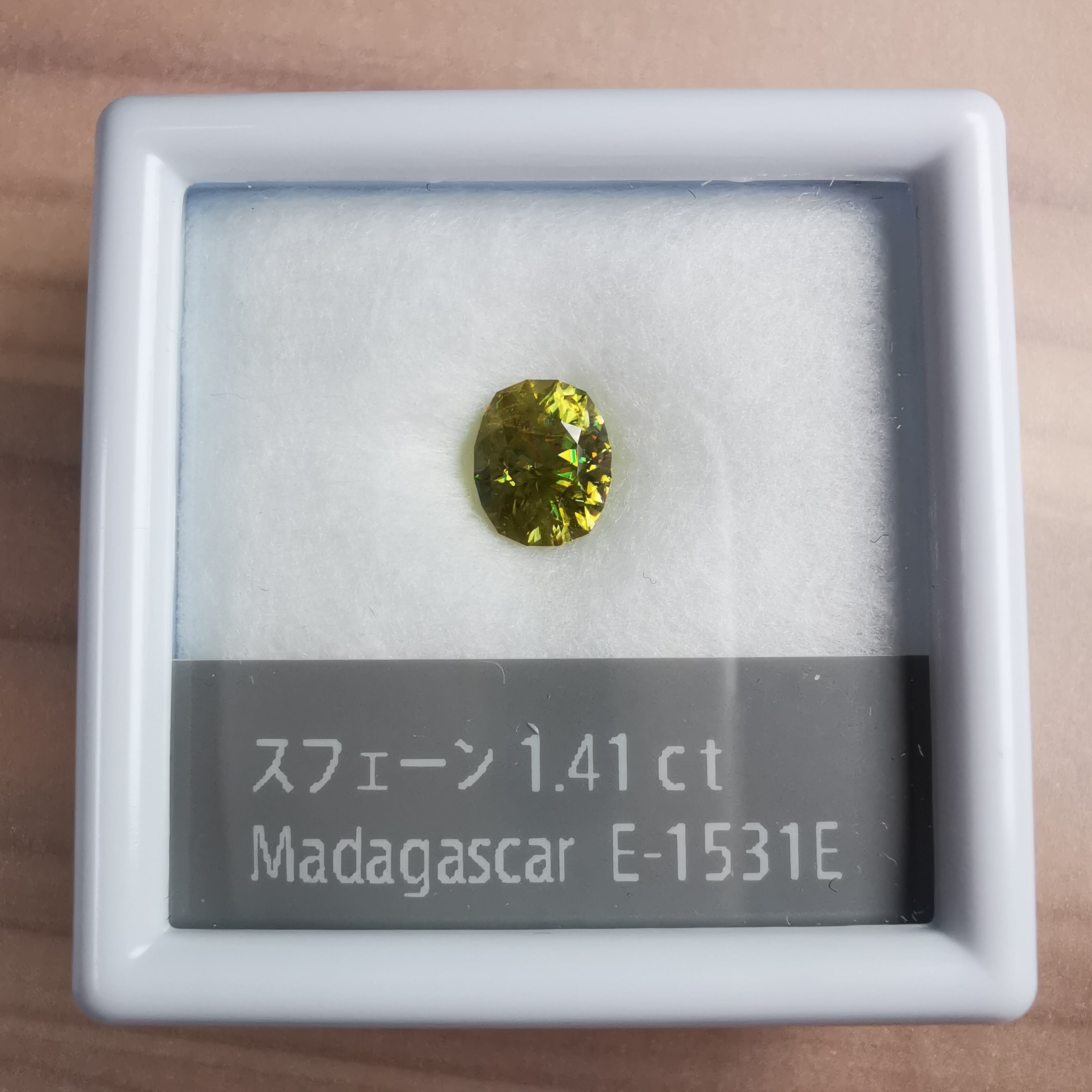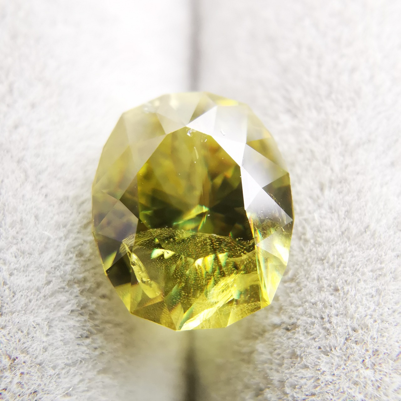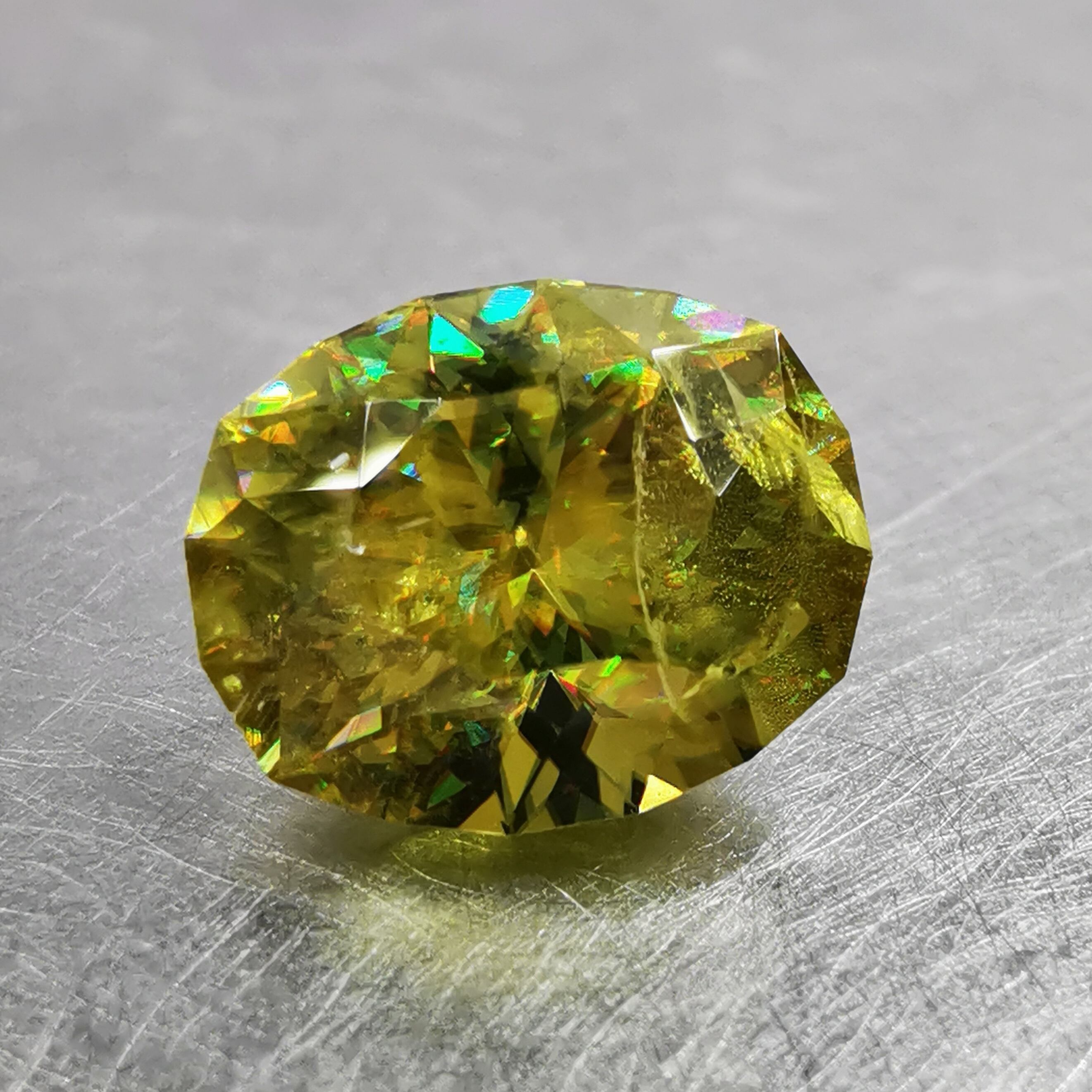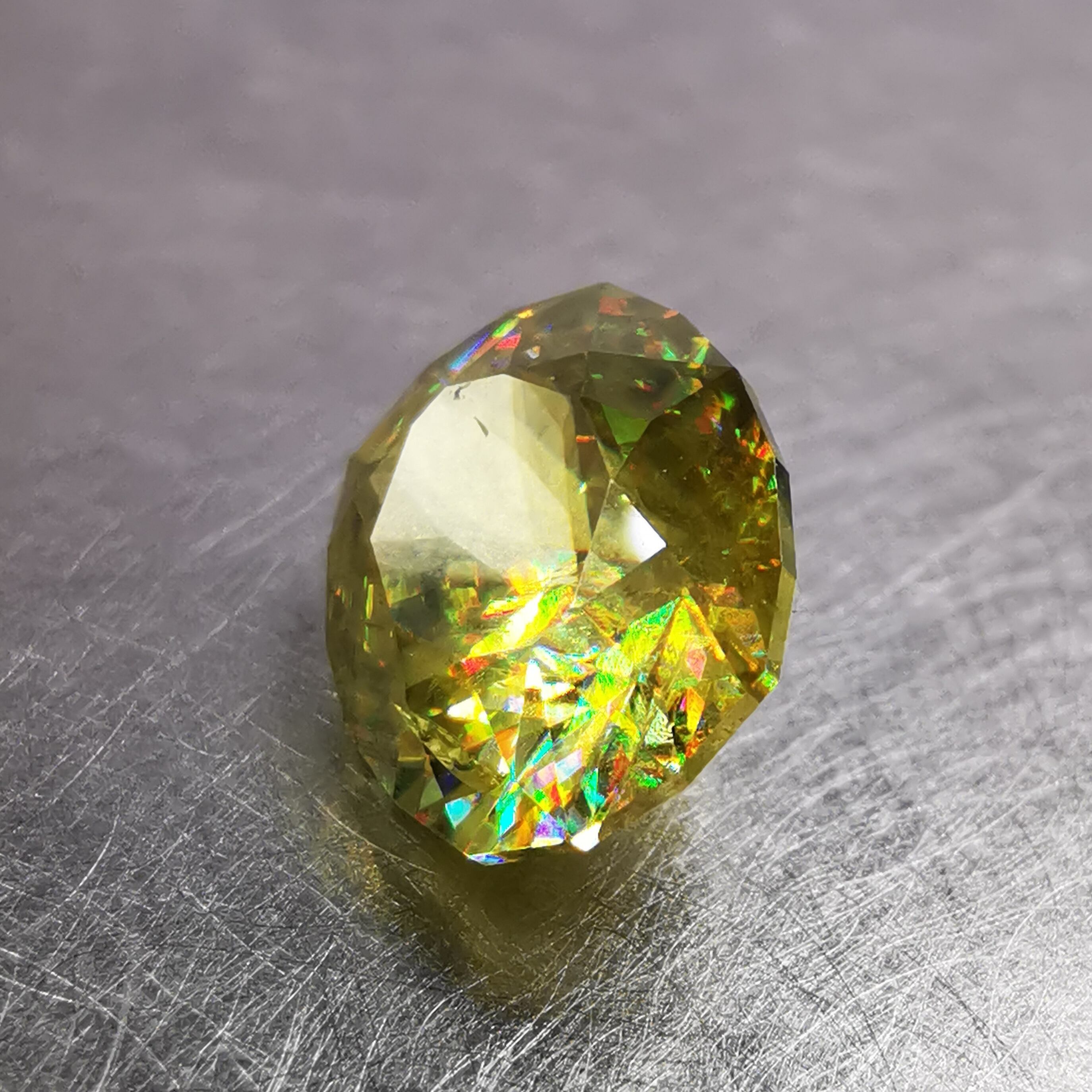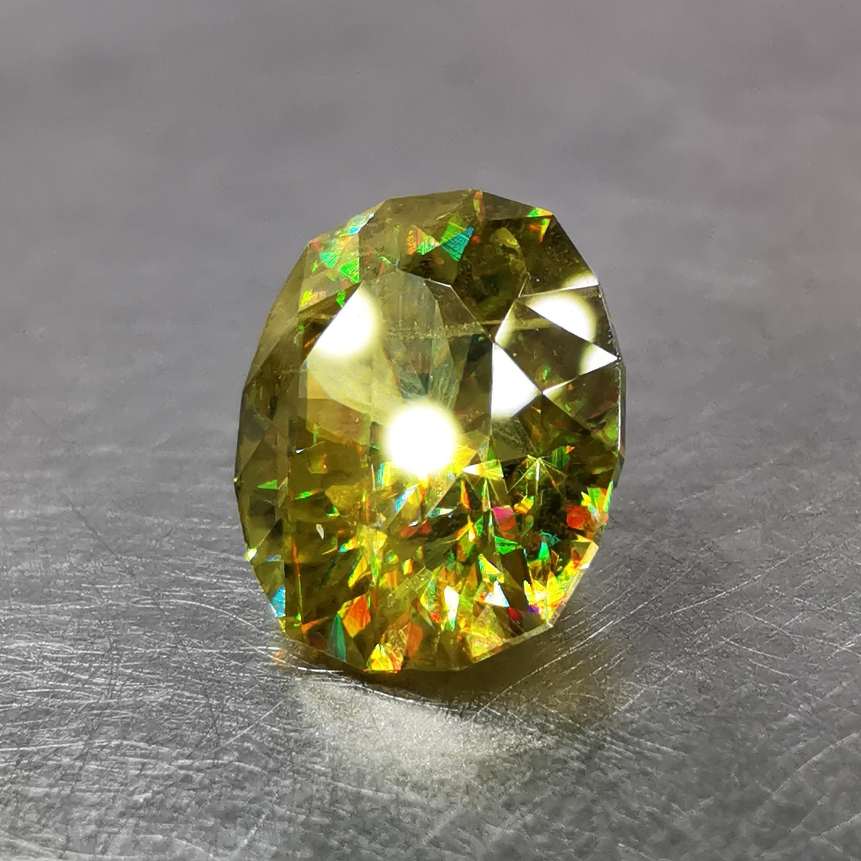 明るく鮮やかな黄緑色から、カラフルなファイアがイルミネーションのように瞬くスフェーンです。