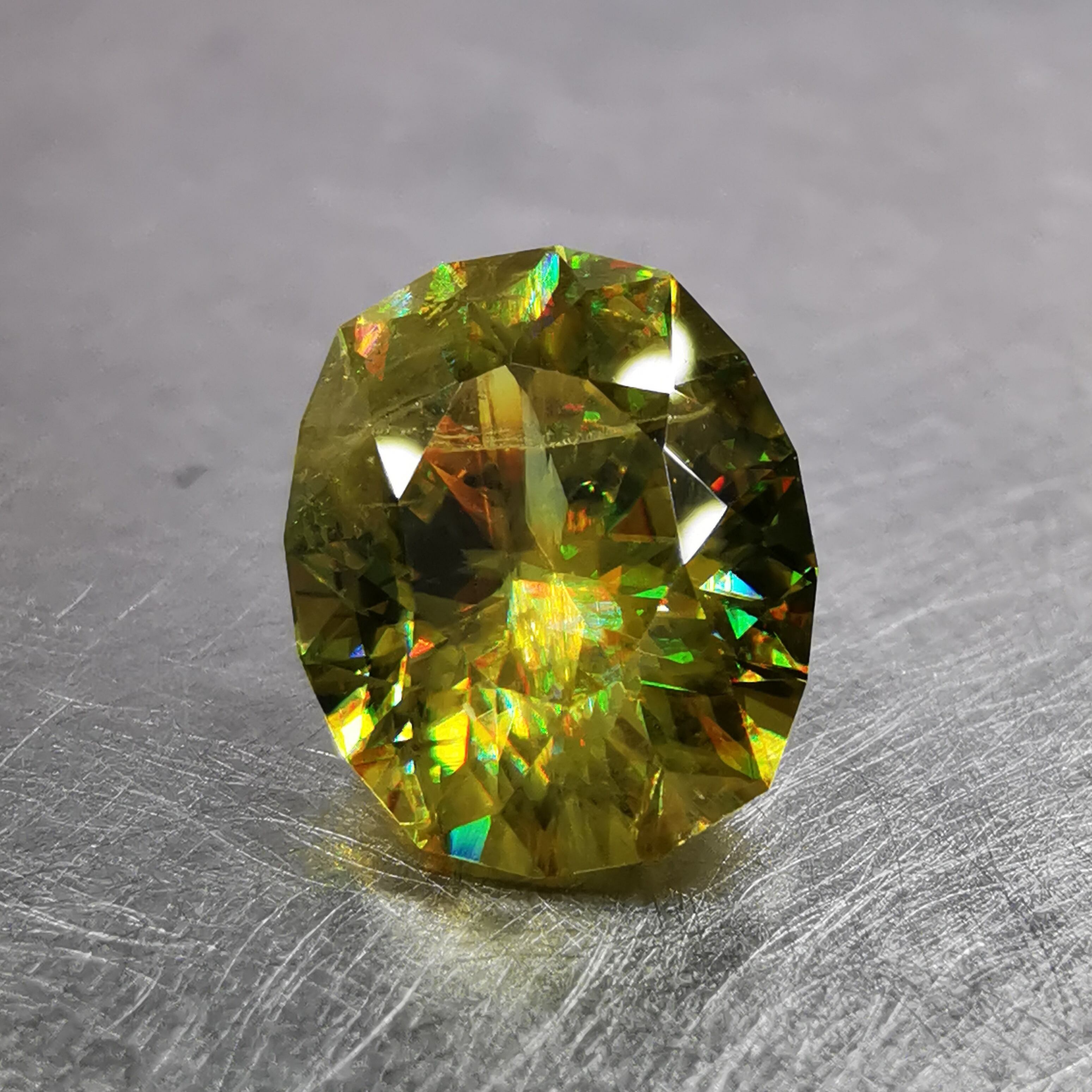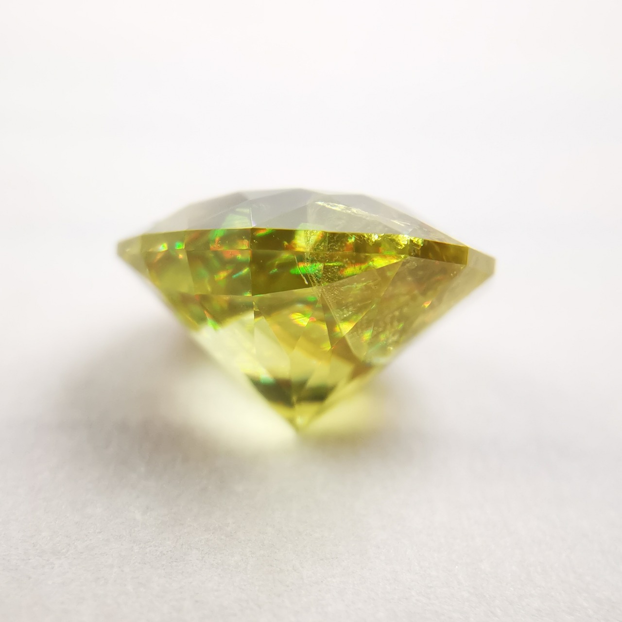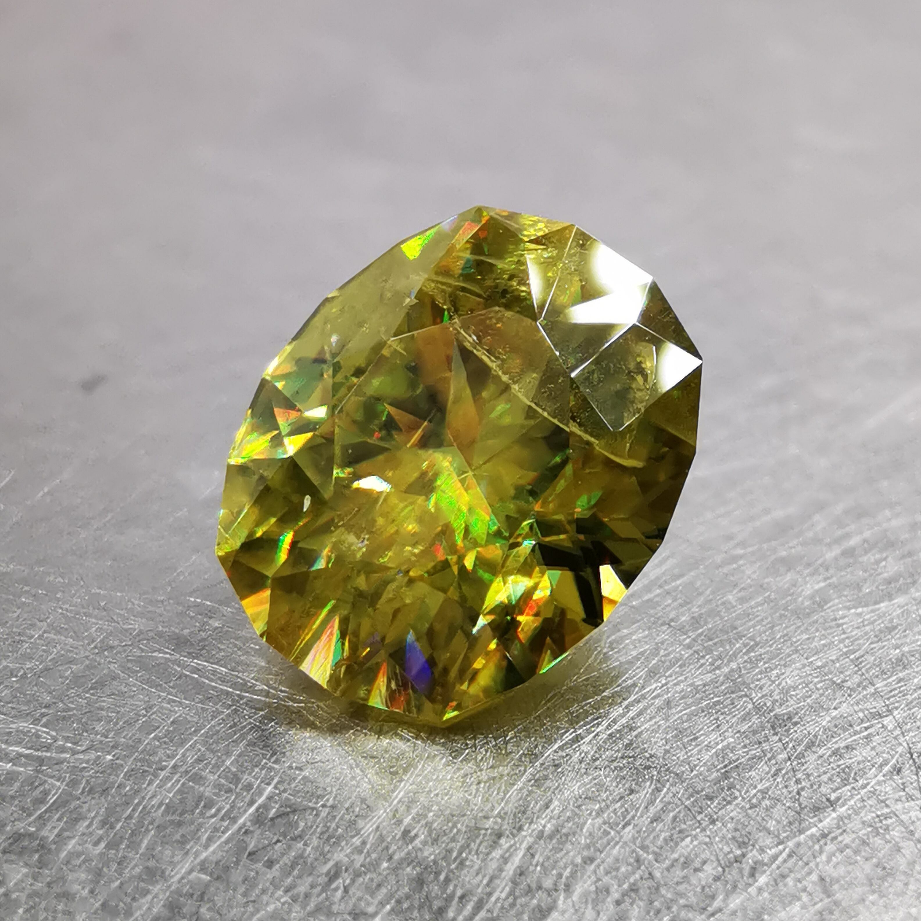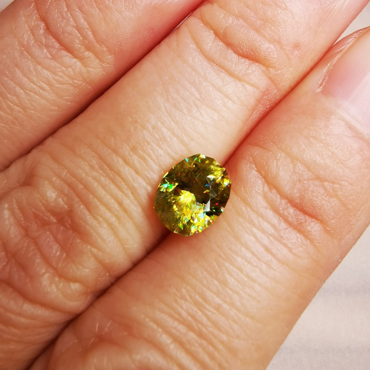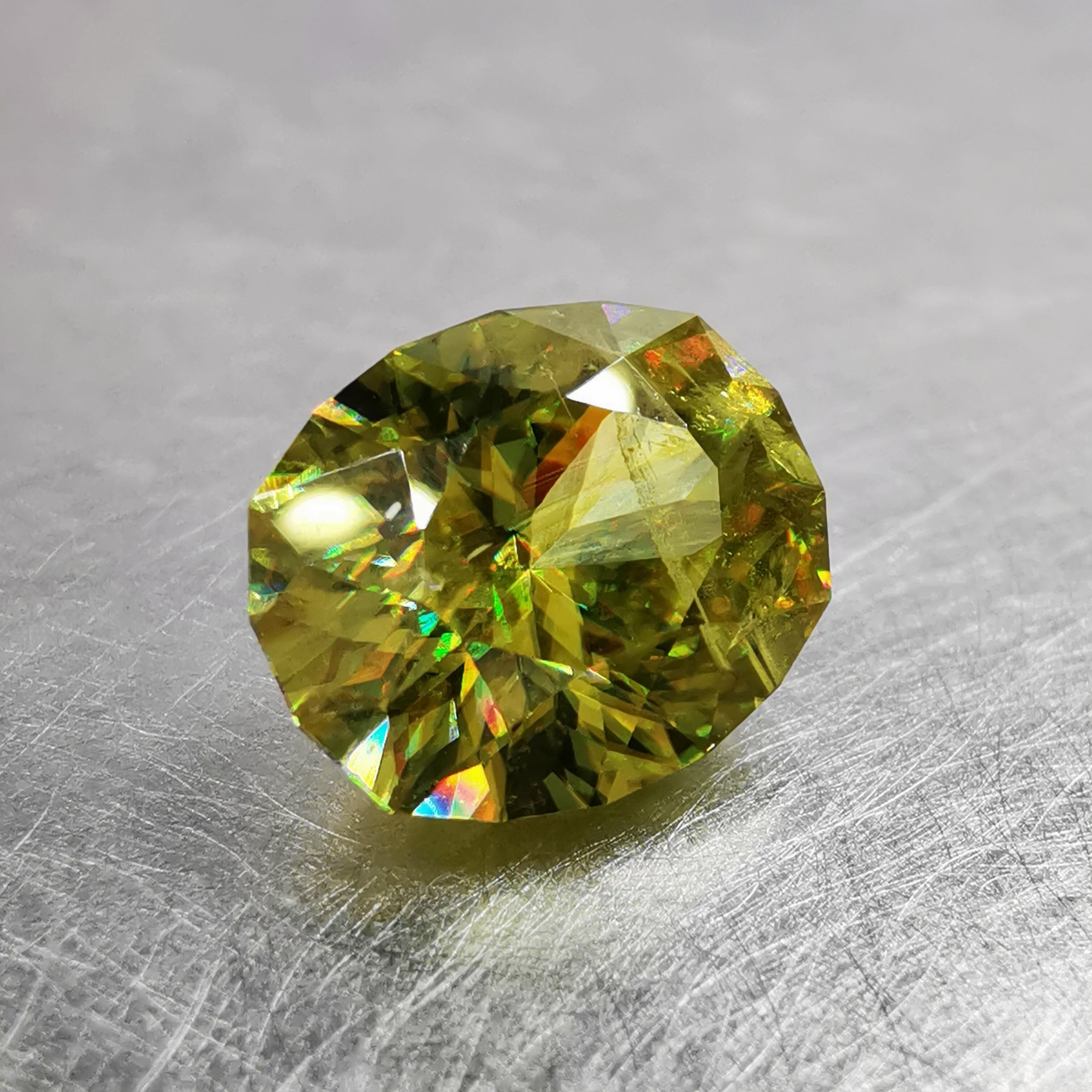 明るく鮮やかな黄緑色から、カラフルなファイアがイルミネーションのように瞬くスフェーンです。
