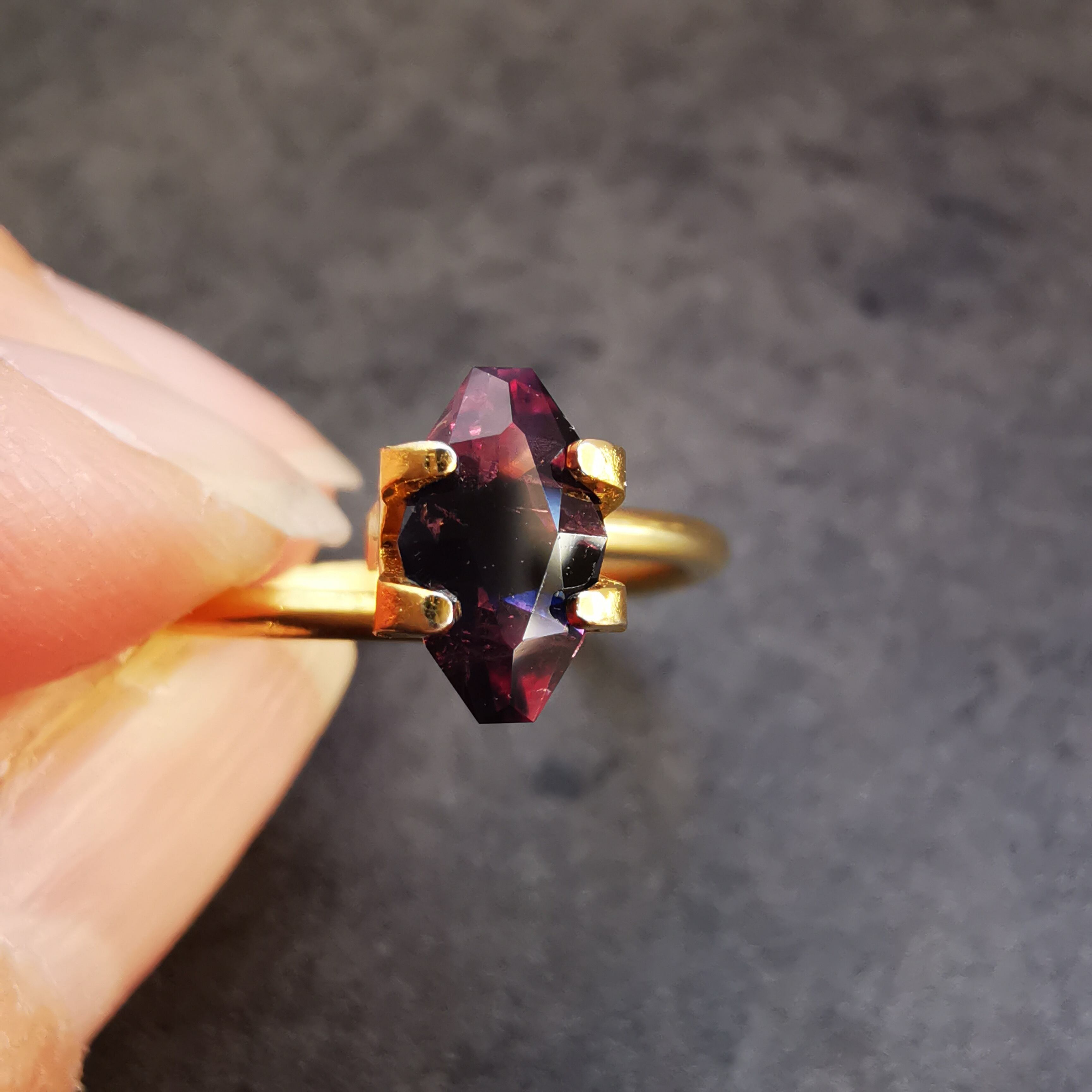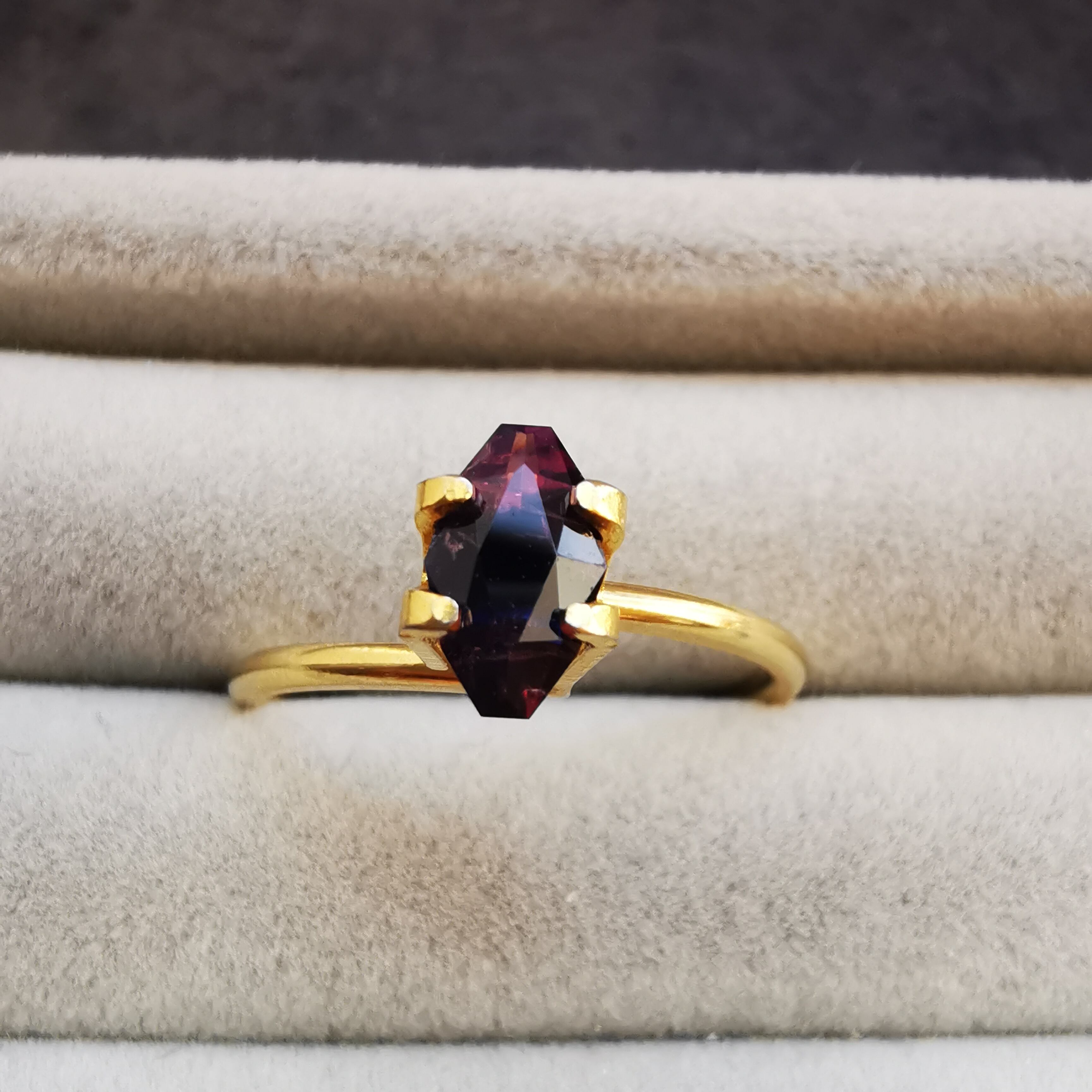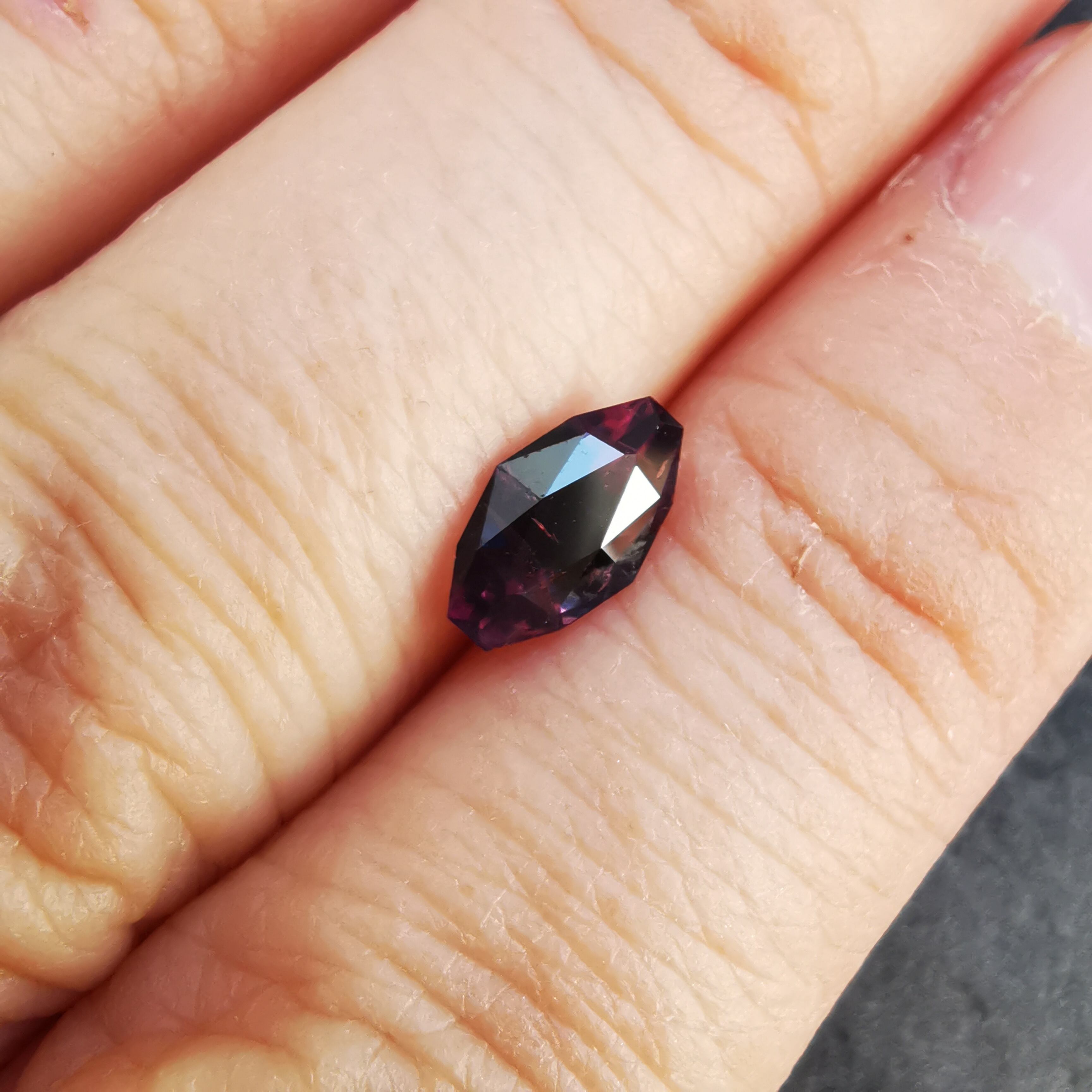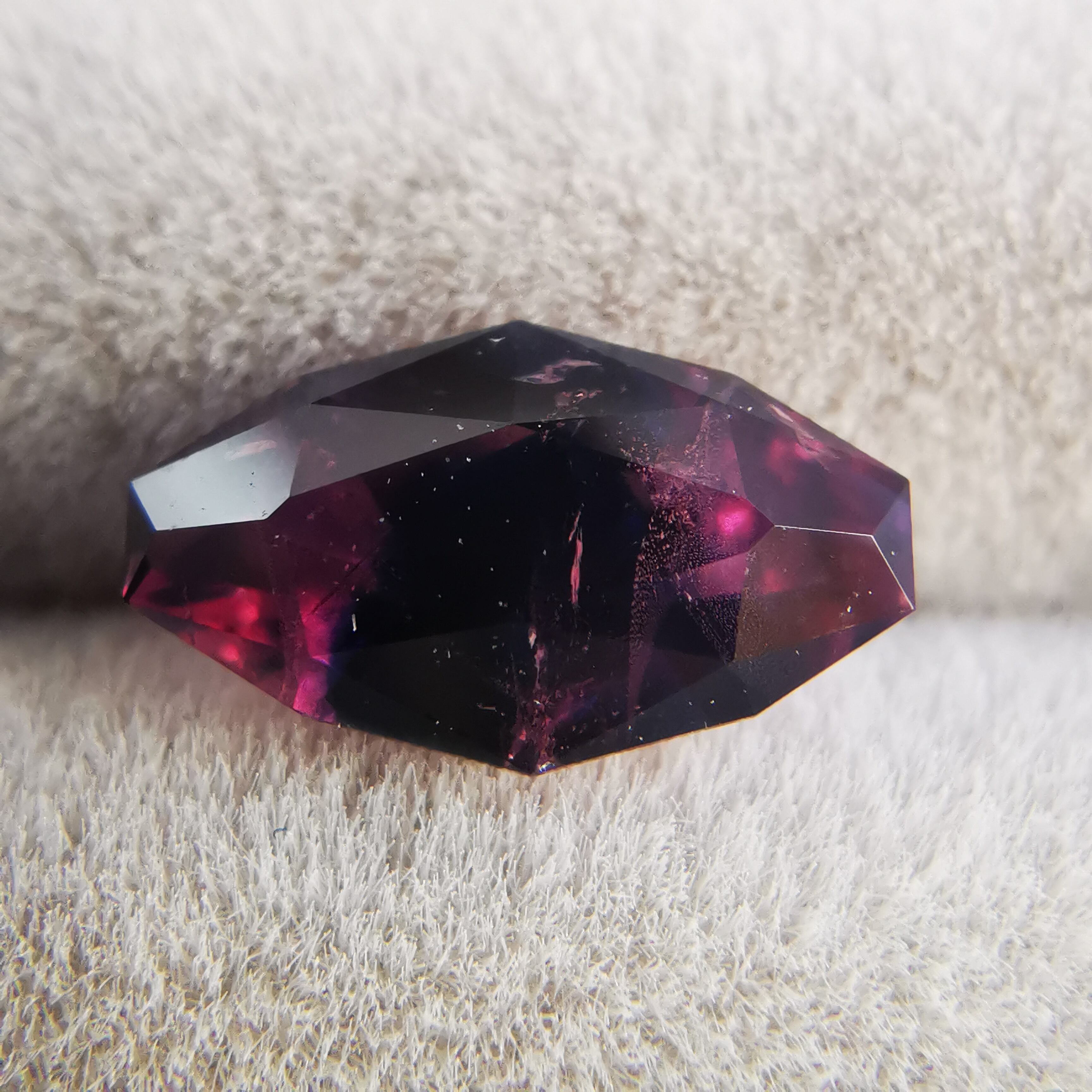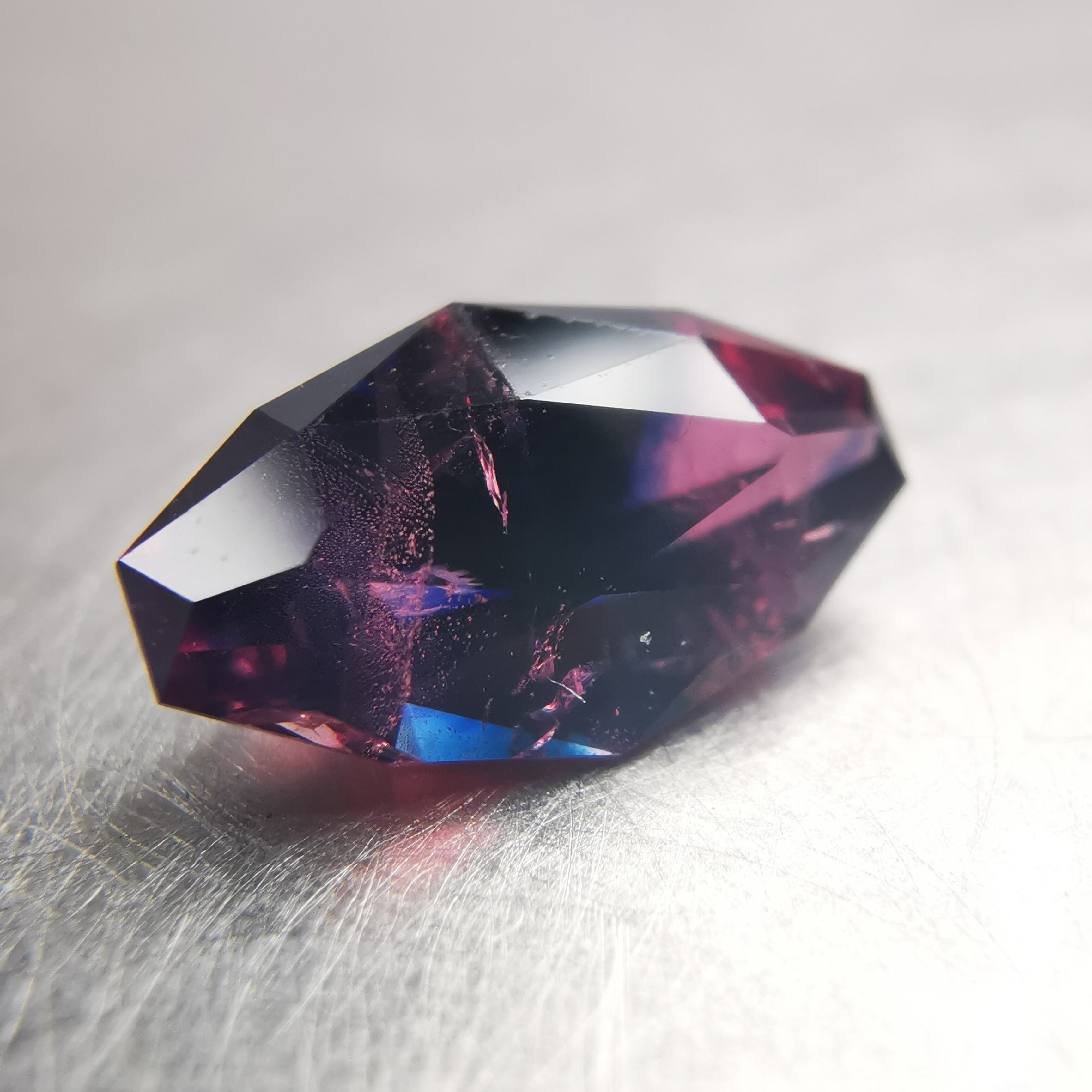 正面からはかなりダークな印象ですが、傾けると、胸を打つようなビビットなピンクと、ハッとするような濃厚なブルーが時おり垣間見えます。