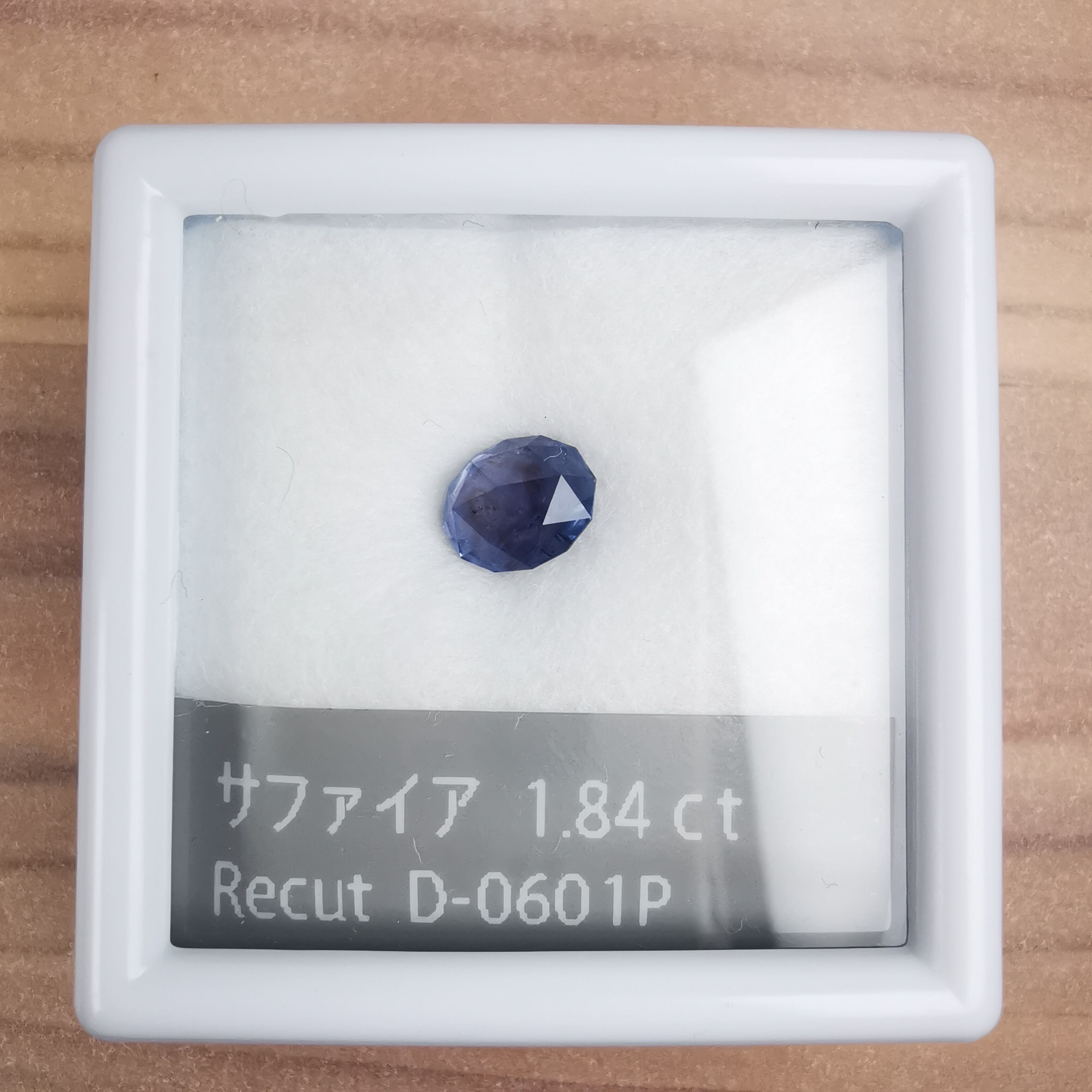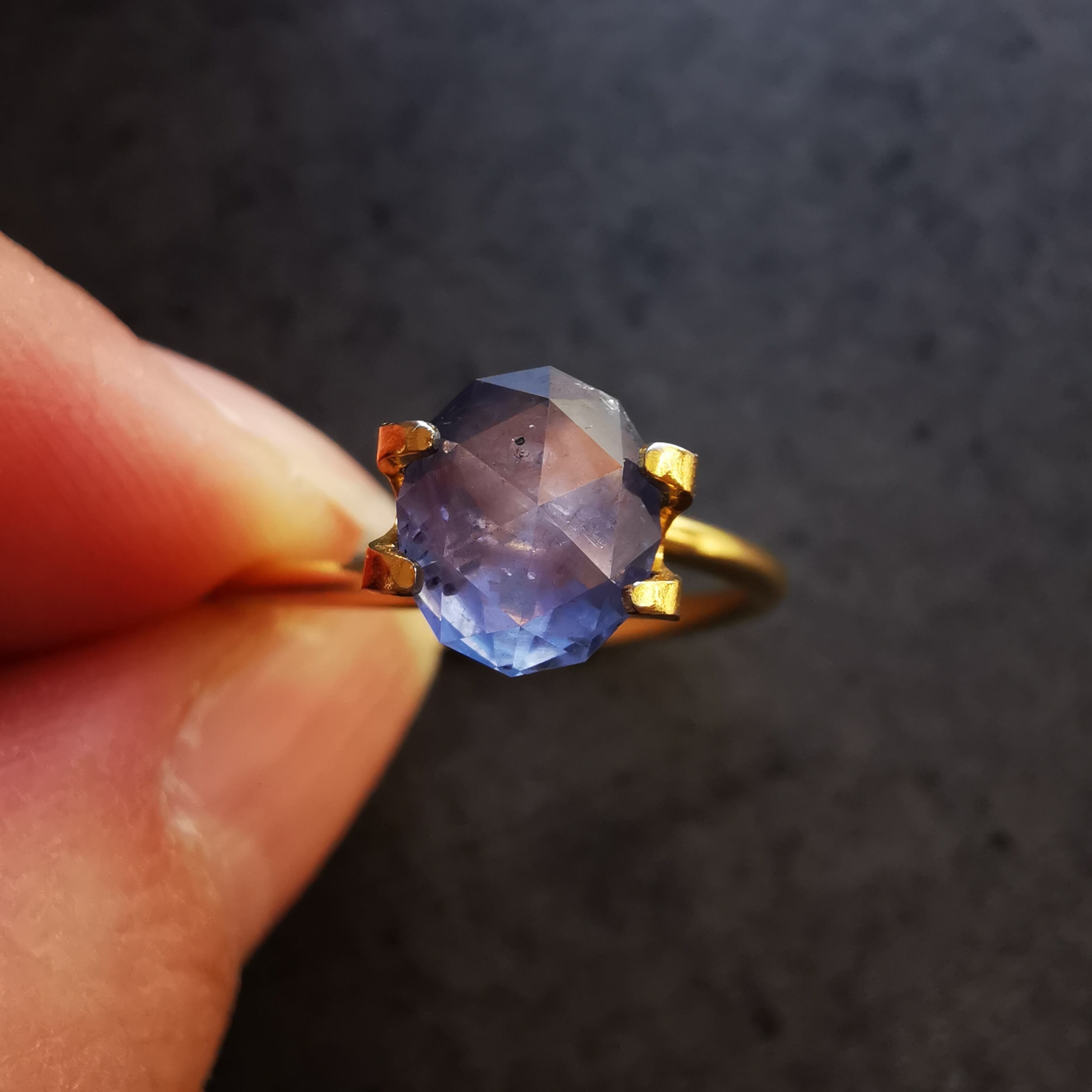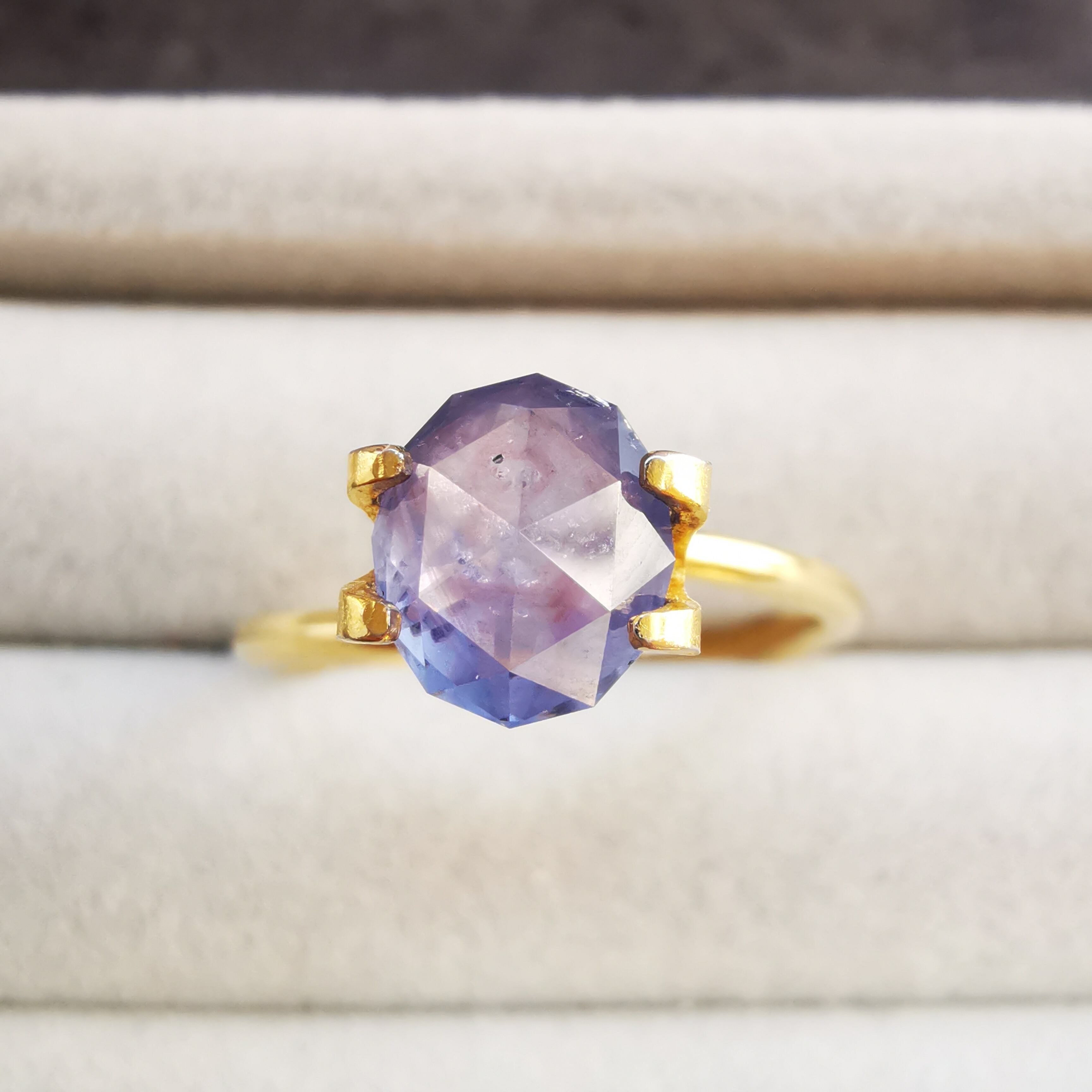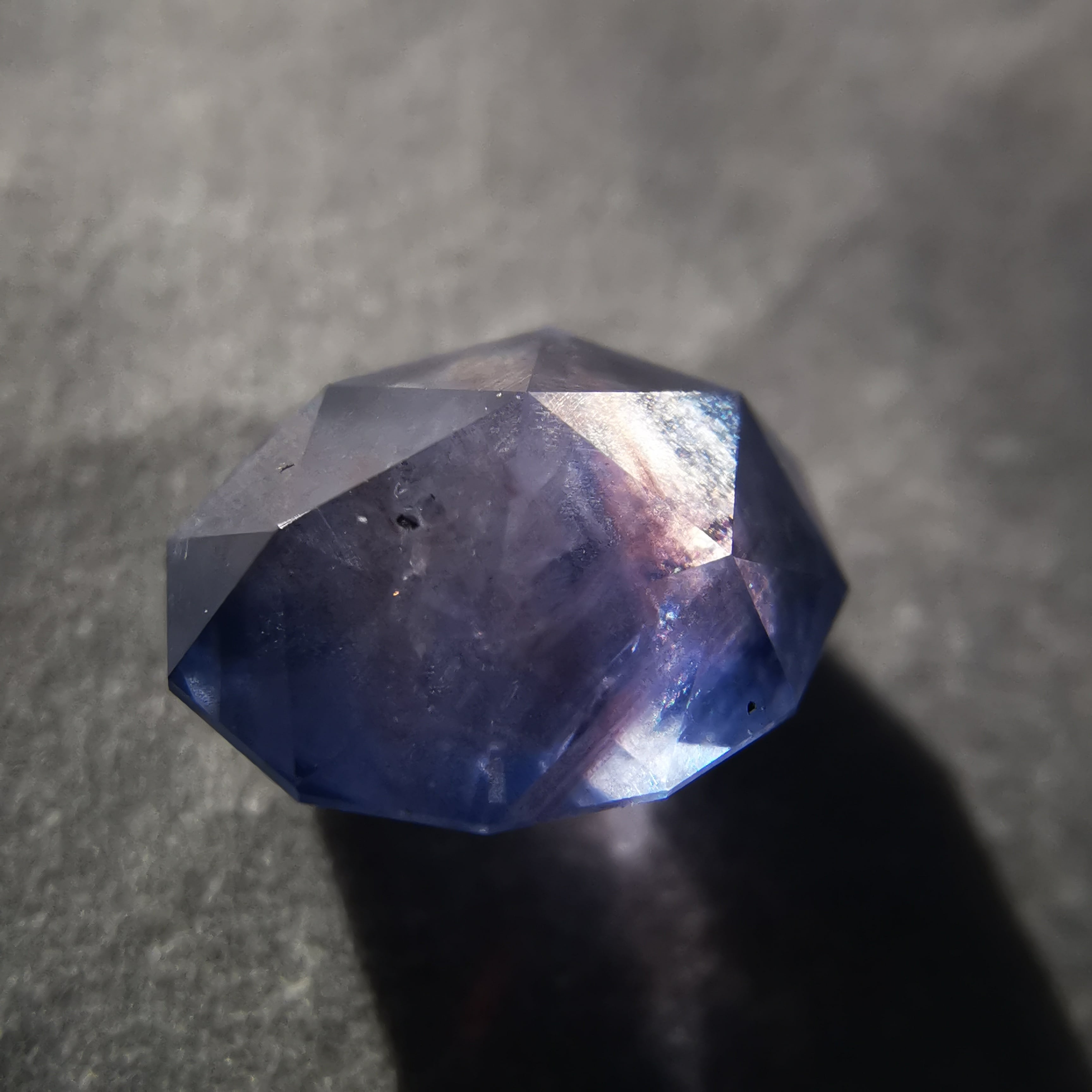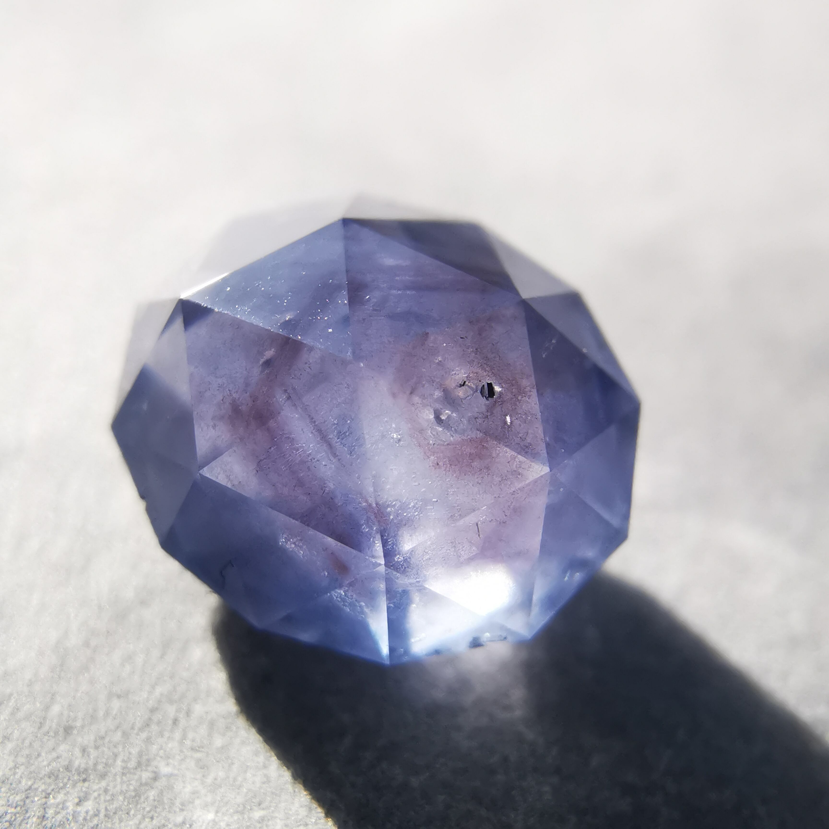 スターサファイアをリカットしたので、シルキーなインクルージョンがたっぷりと入り、光が当たるとキラキラと面で輝きます。