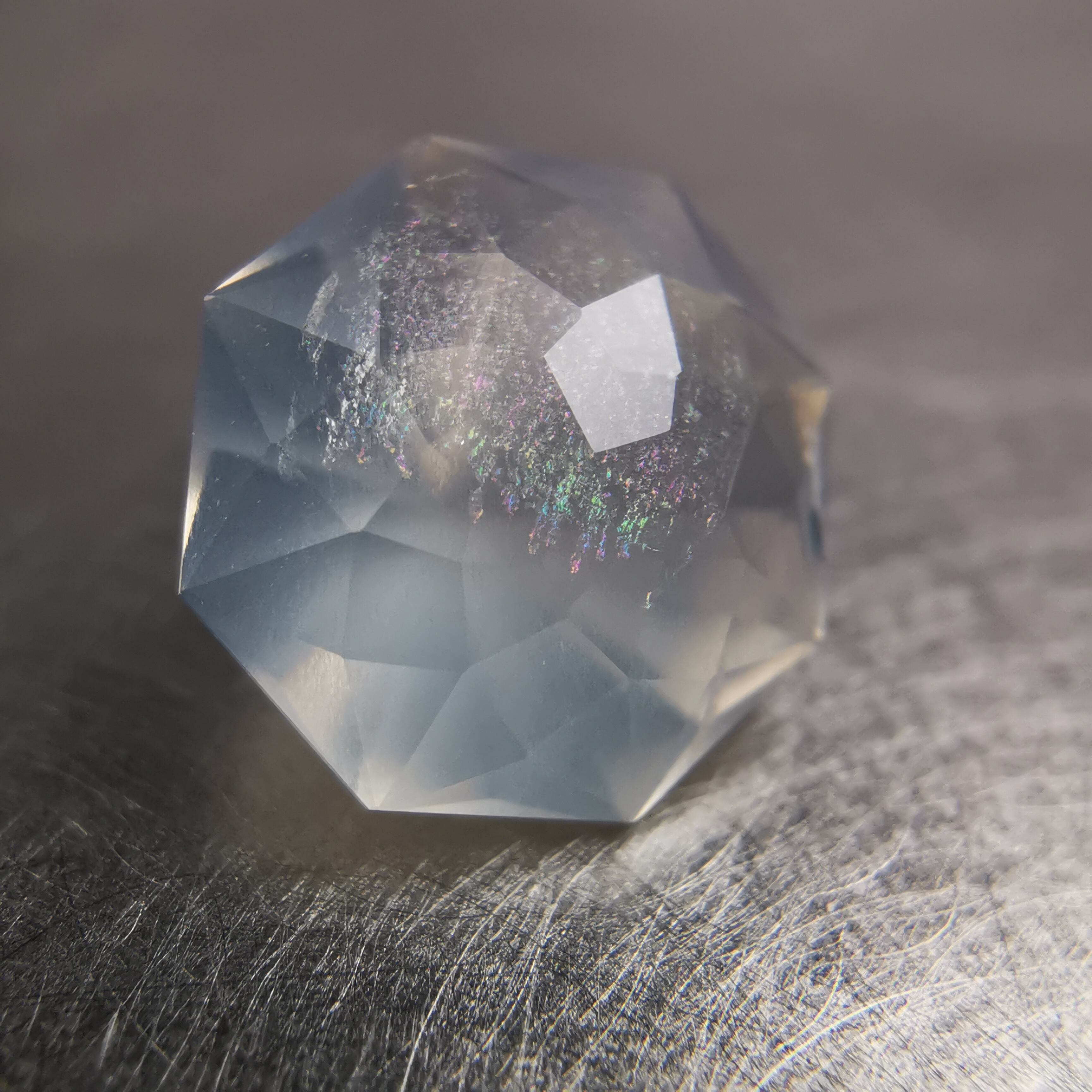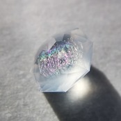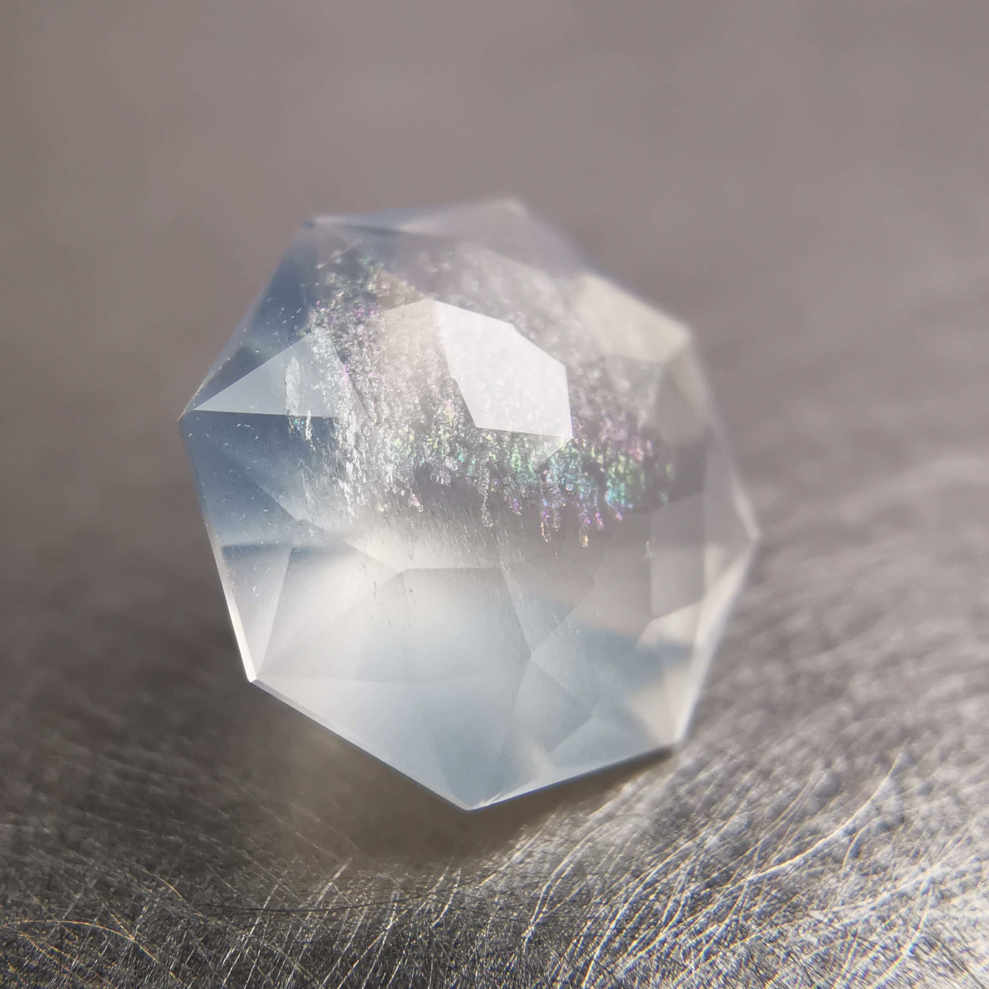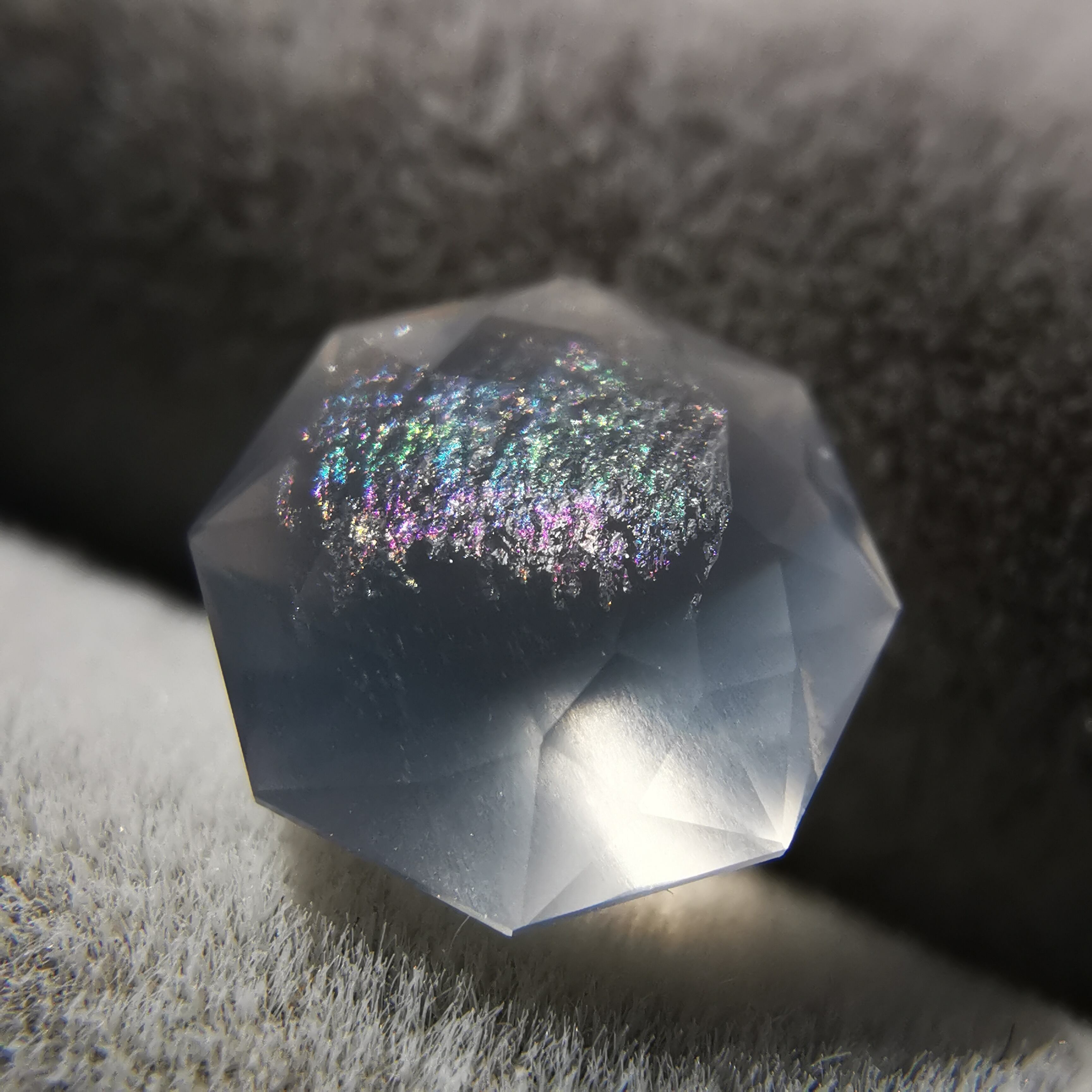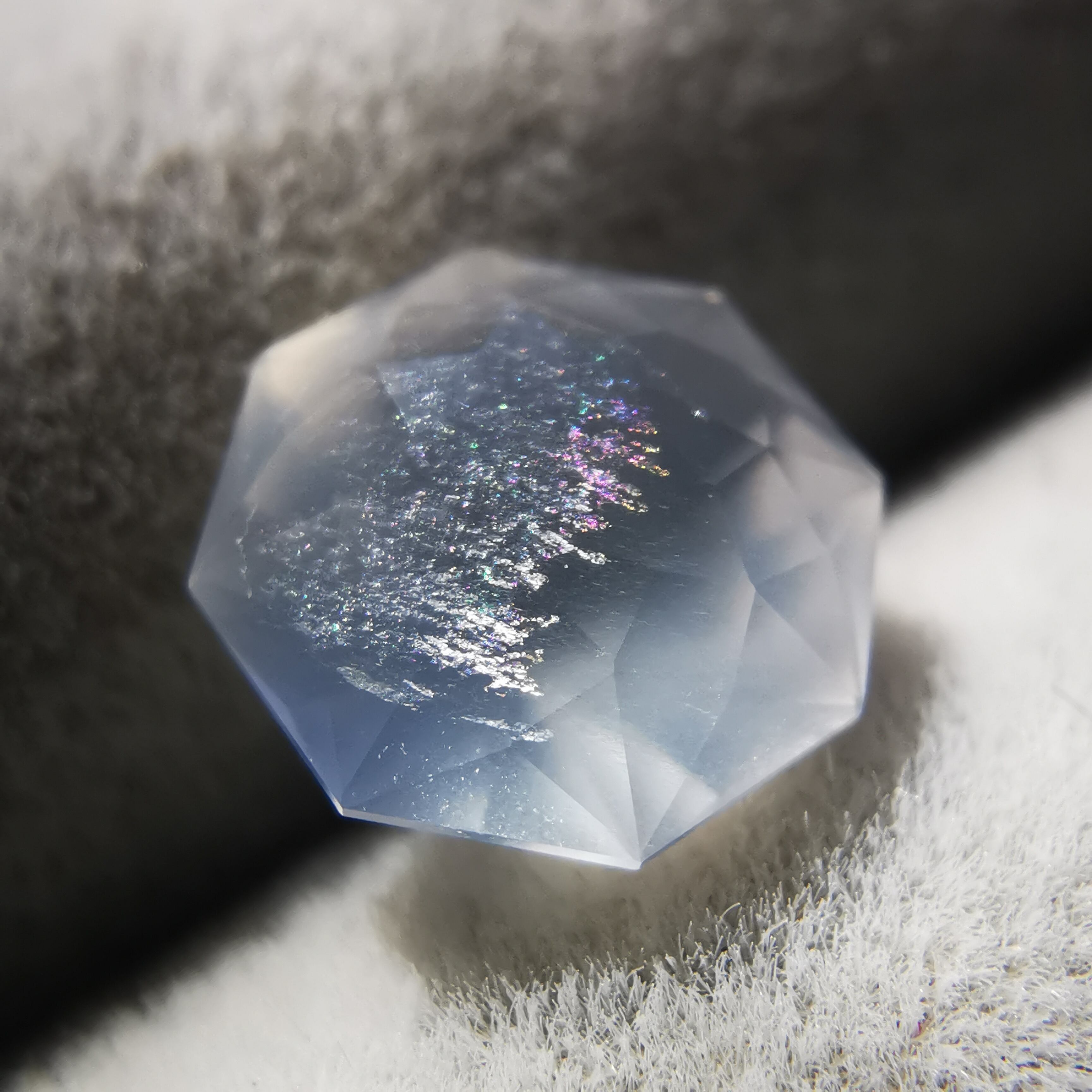 フェイスの近いところに入った吹雪のようなインクルージョンが、光が当たると虹色に光ります。