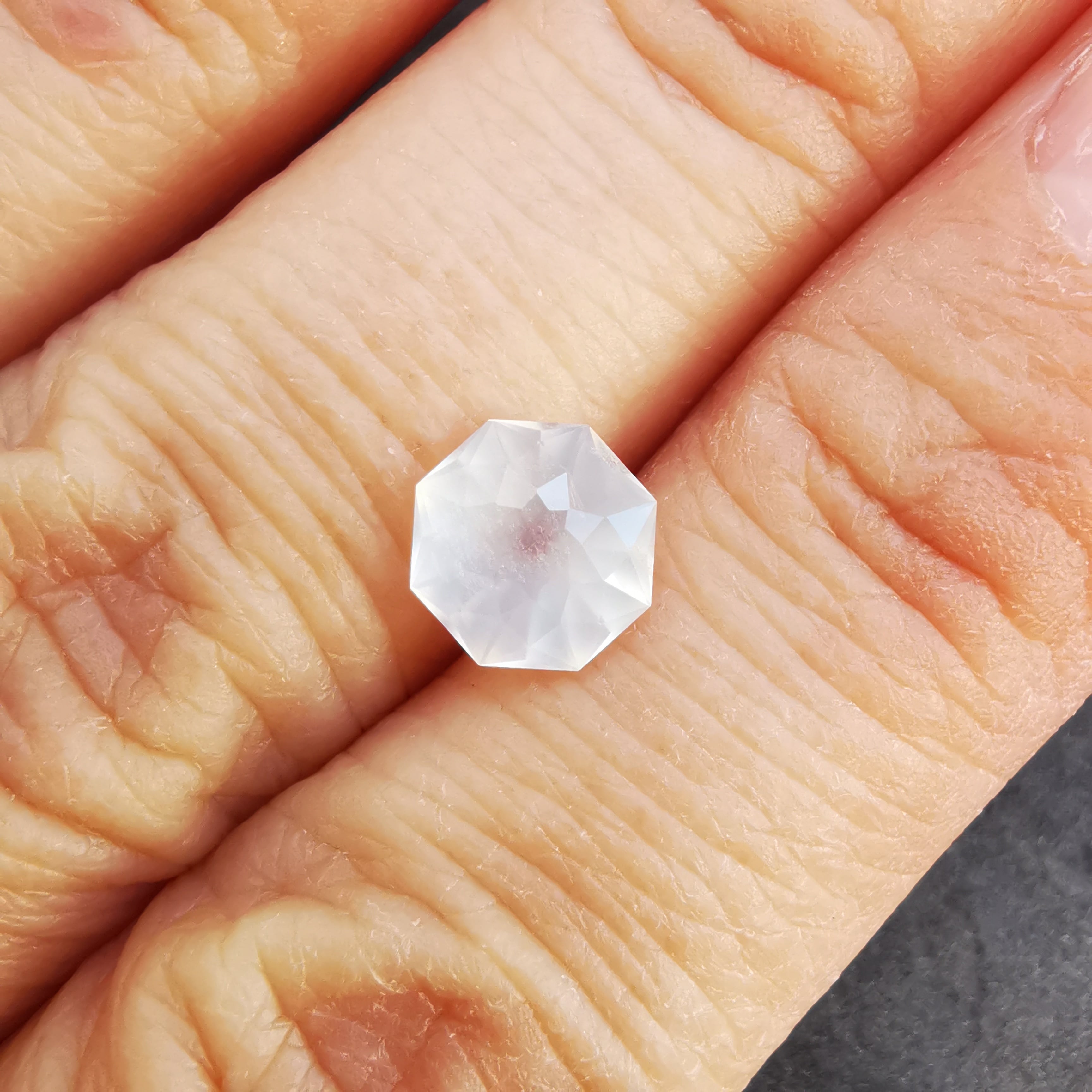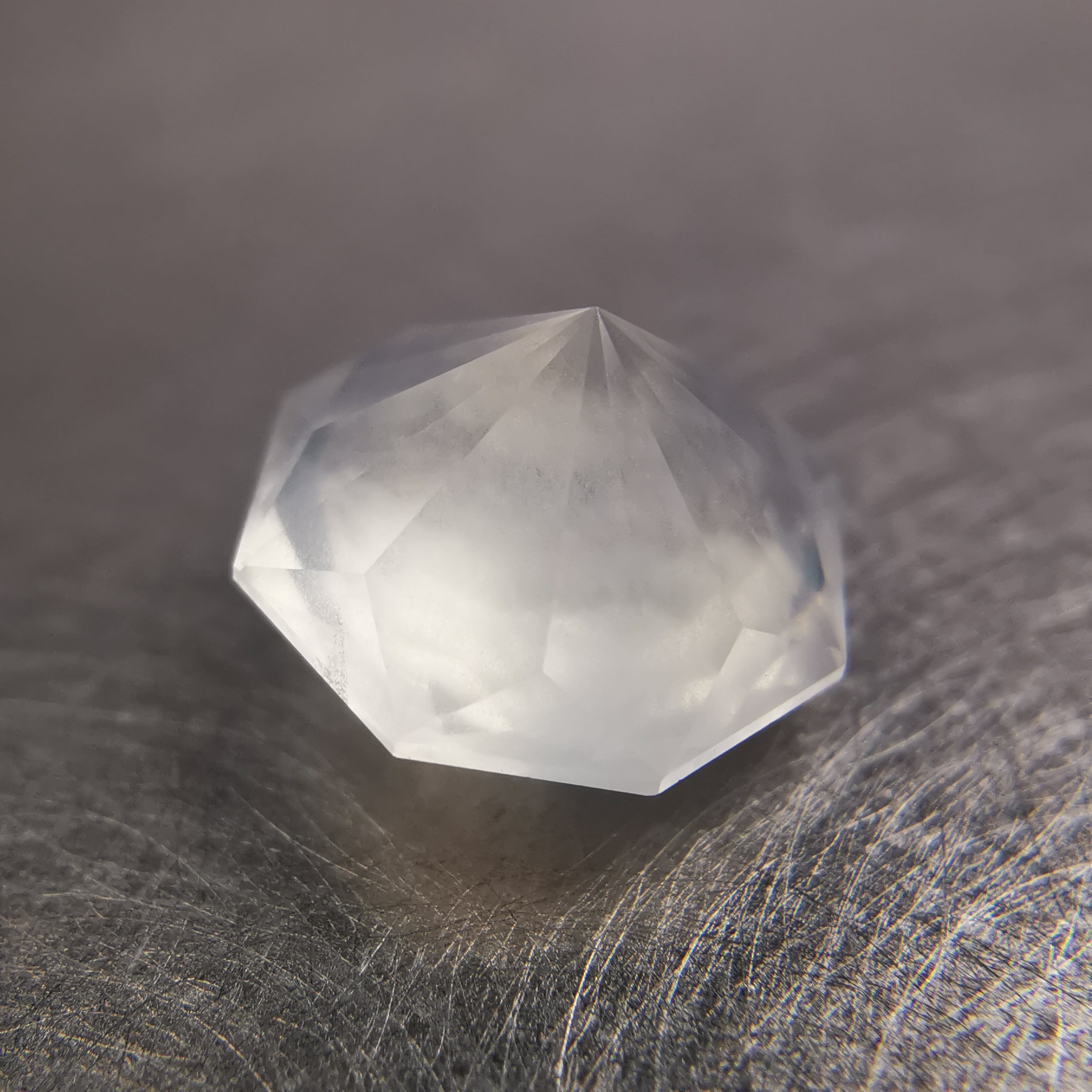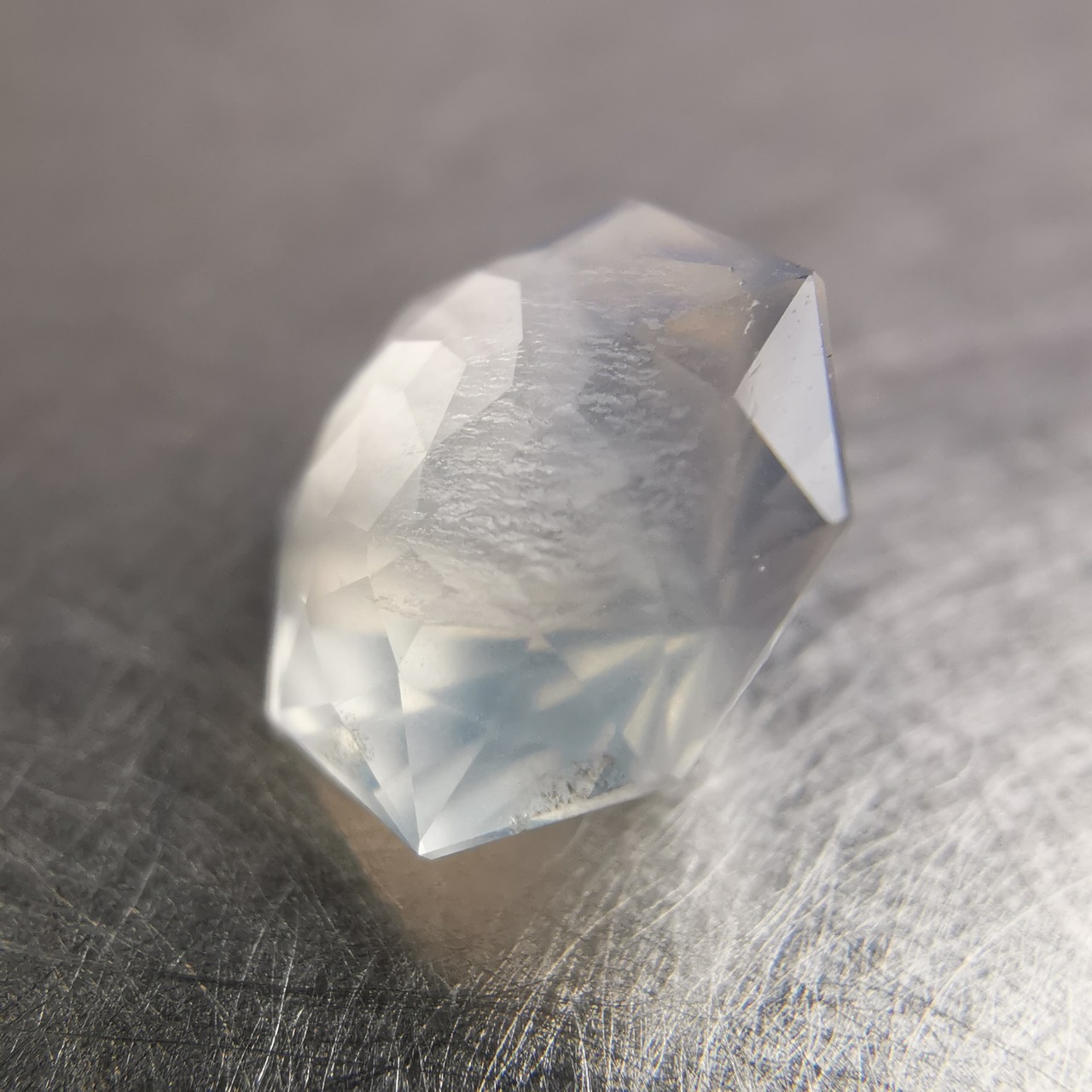 フェイスの近いところに入った吹雪のようなインクルージョンが、光が当たると虹色に光ります。