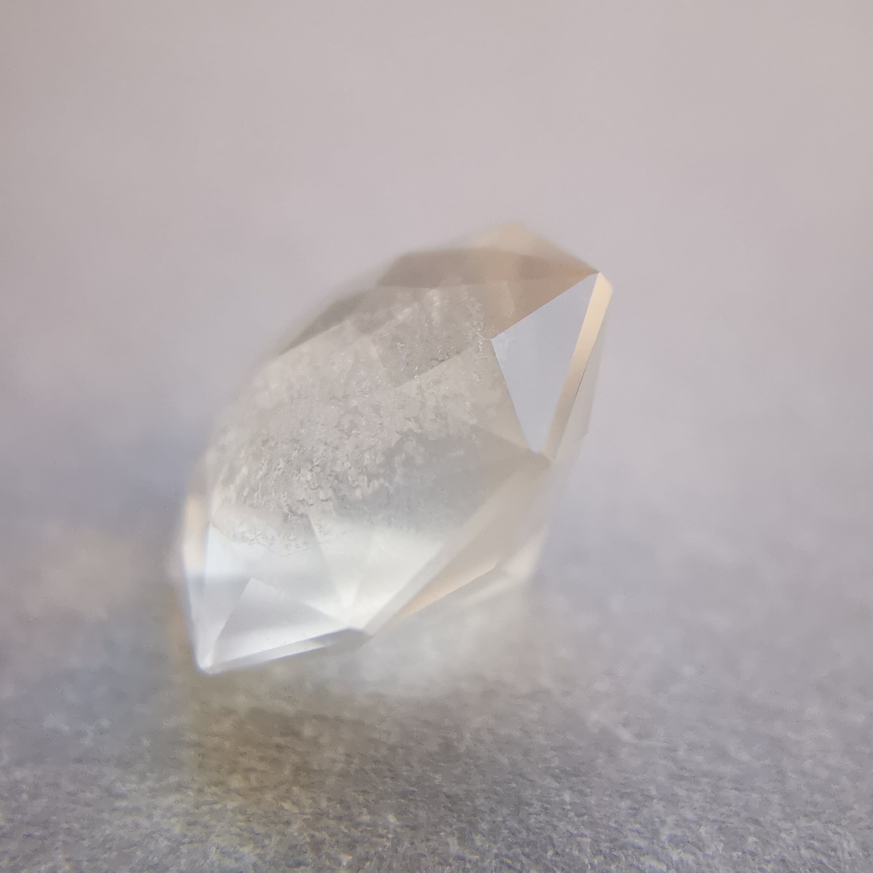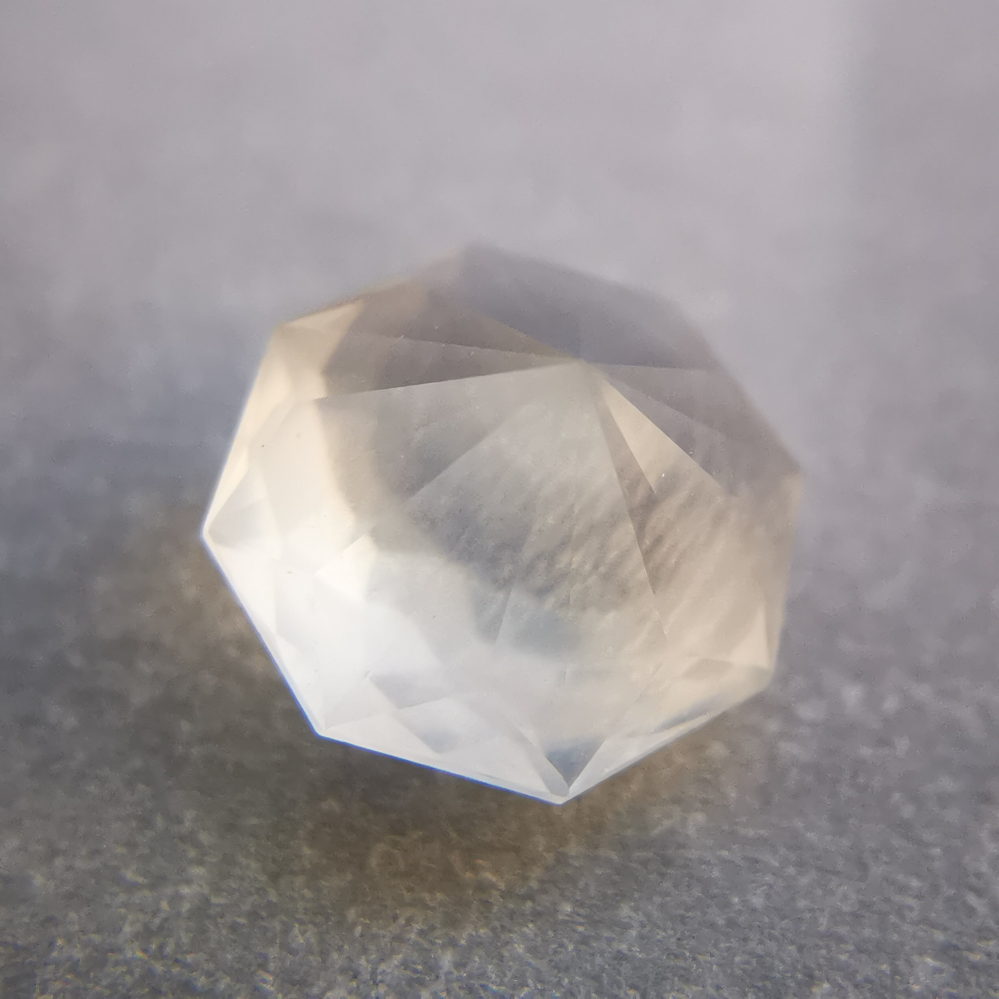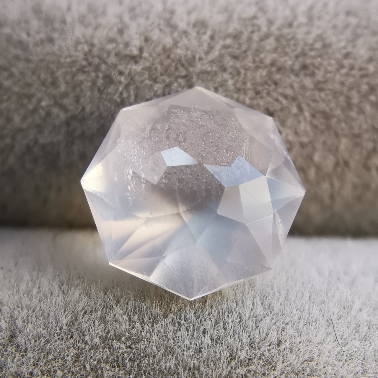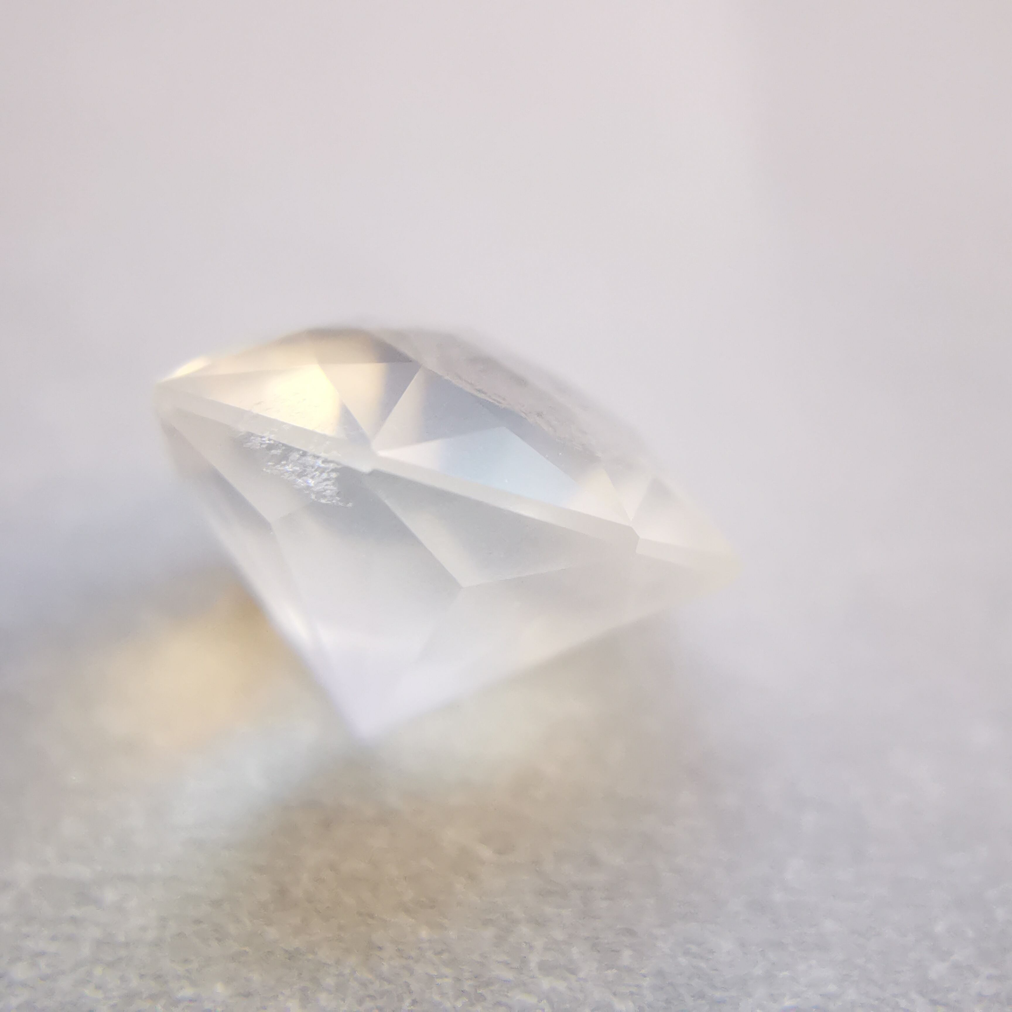 フェイスの近いところに入った吹雪のようなインクルージョンが、光が当たると虹色に光ります。