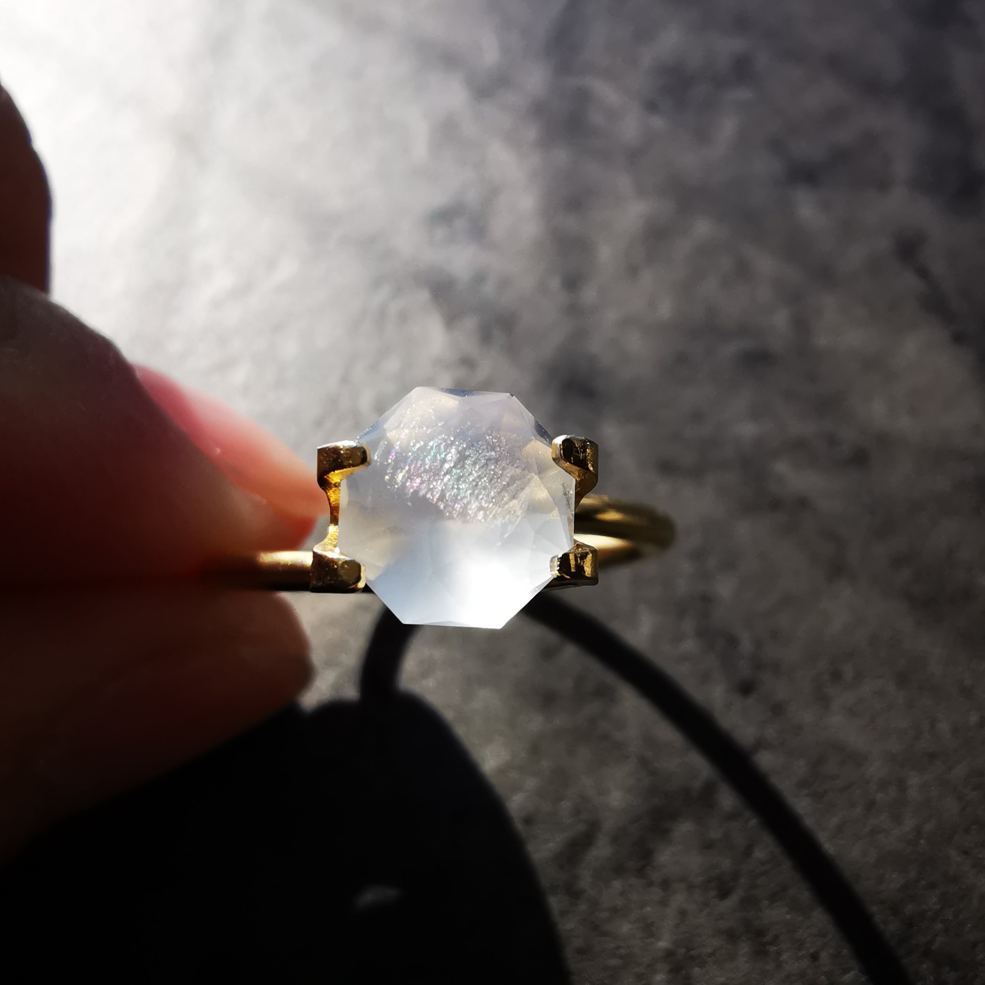 このように虹色に光るインクルージョンが印象的なムーンストーンは今までに見たことがありません。
