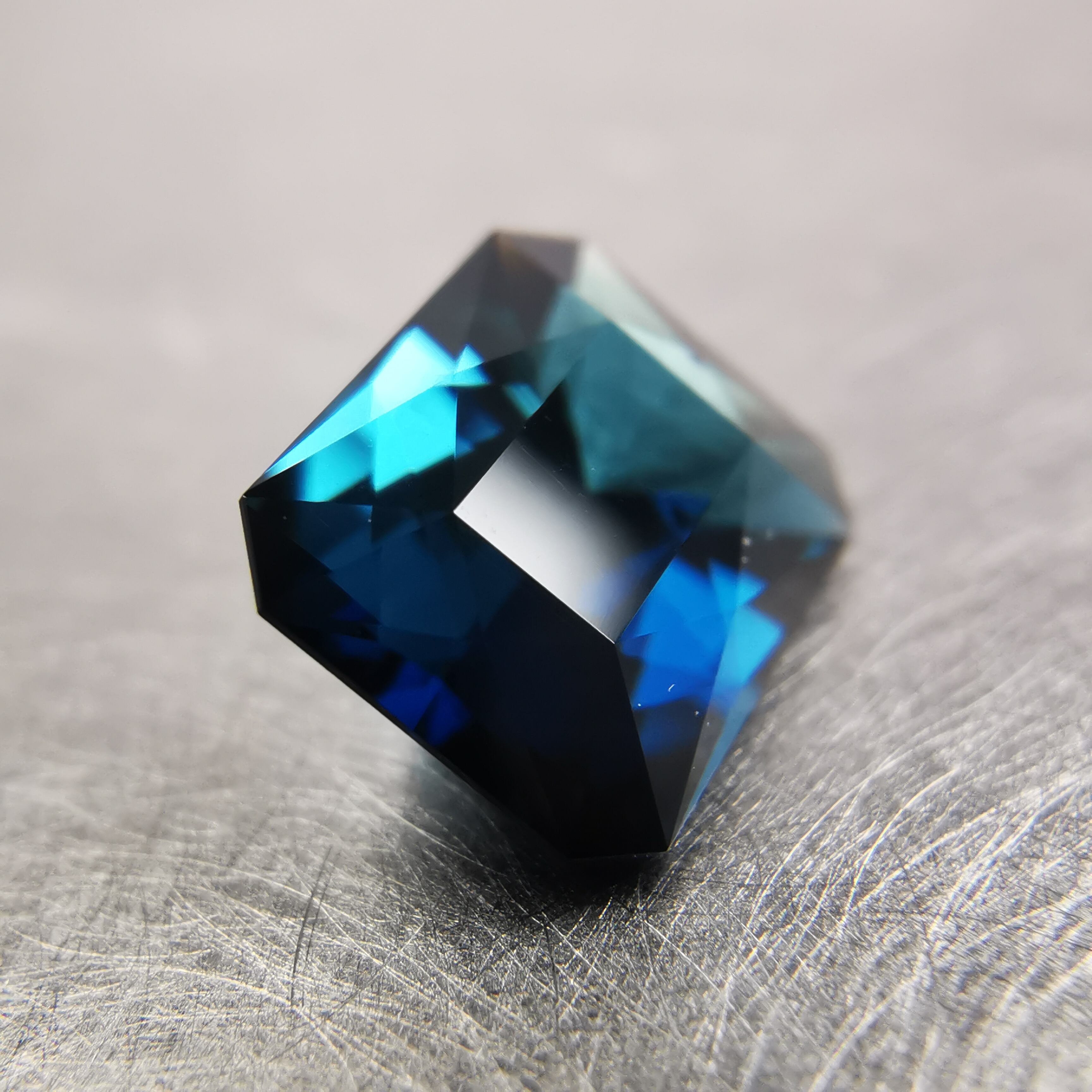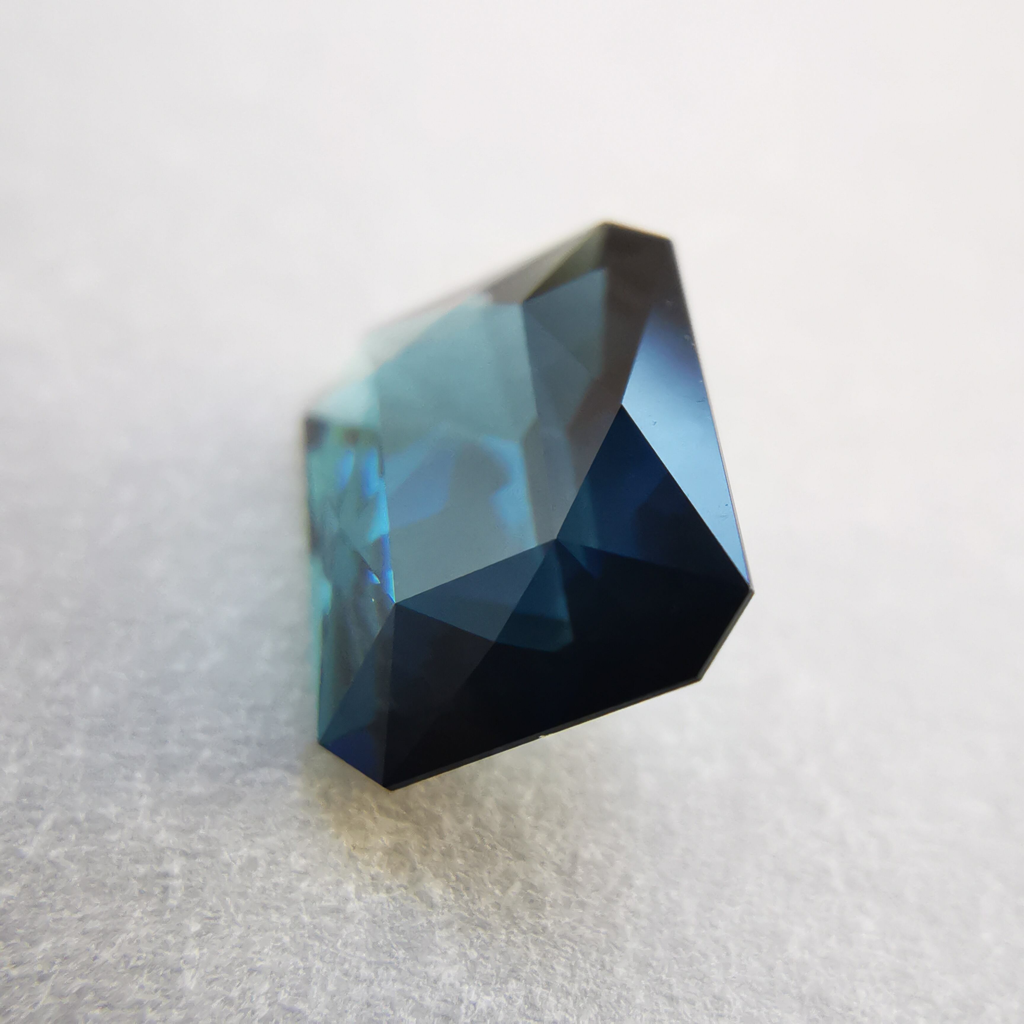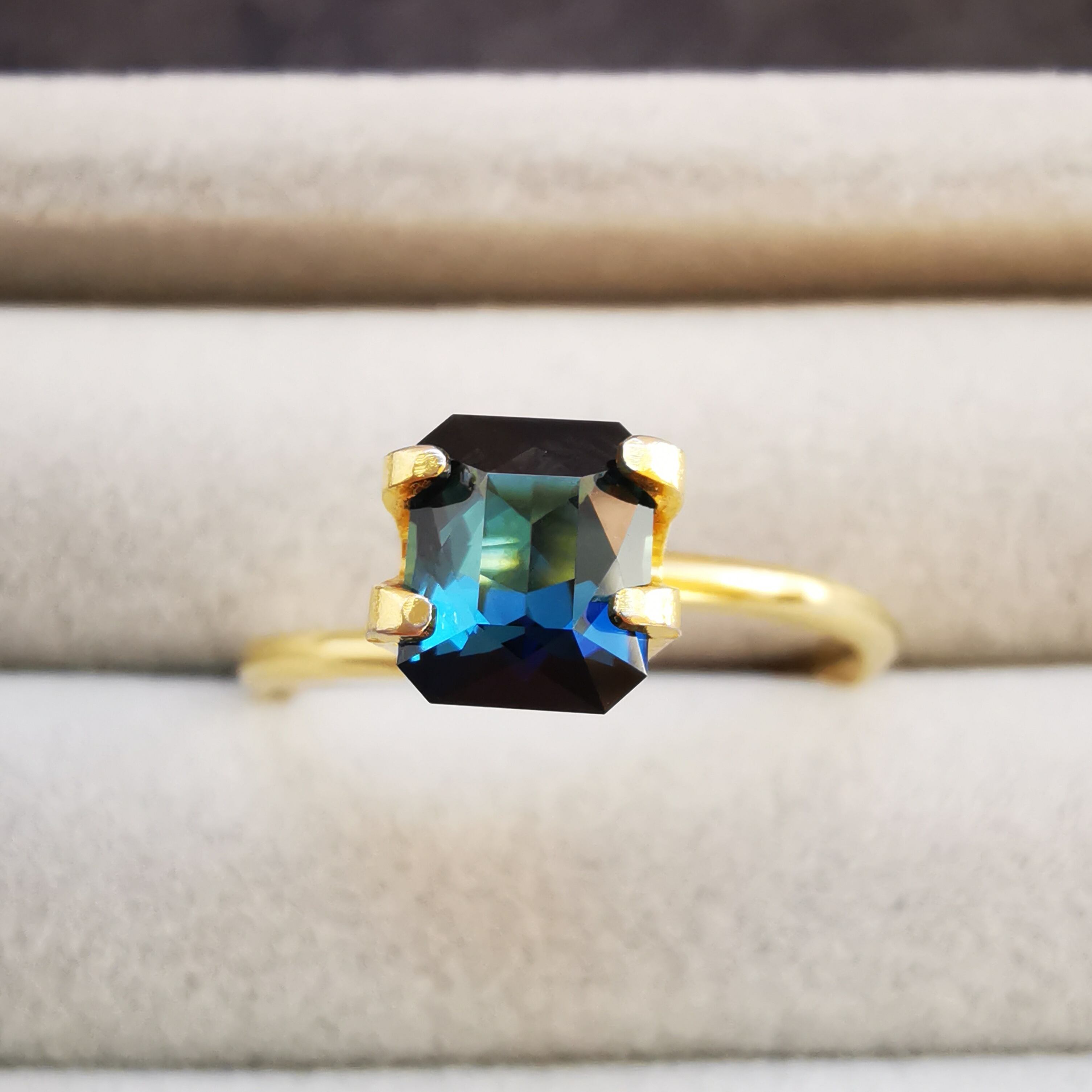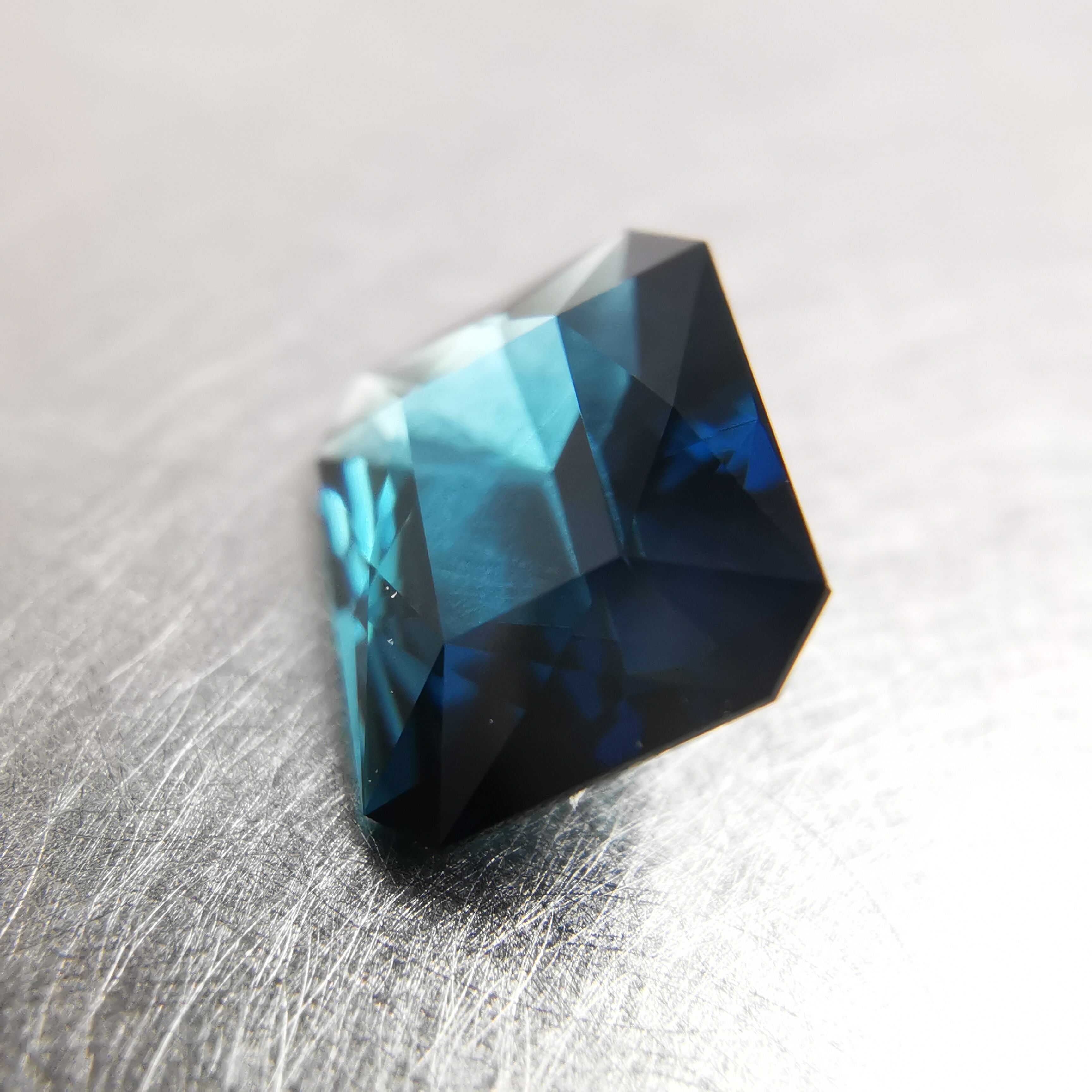 正面からはダークなインディゴブルー、傾けると暗い中に鮮やかなブルーと明るいブルーグリーンがチラチラときらめきだします。