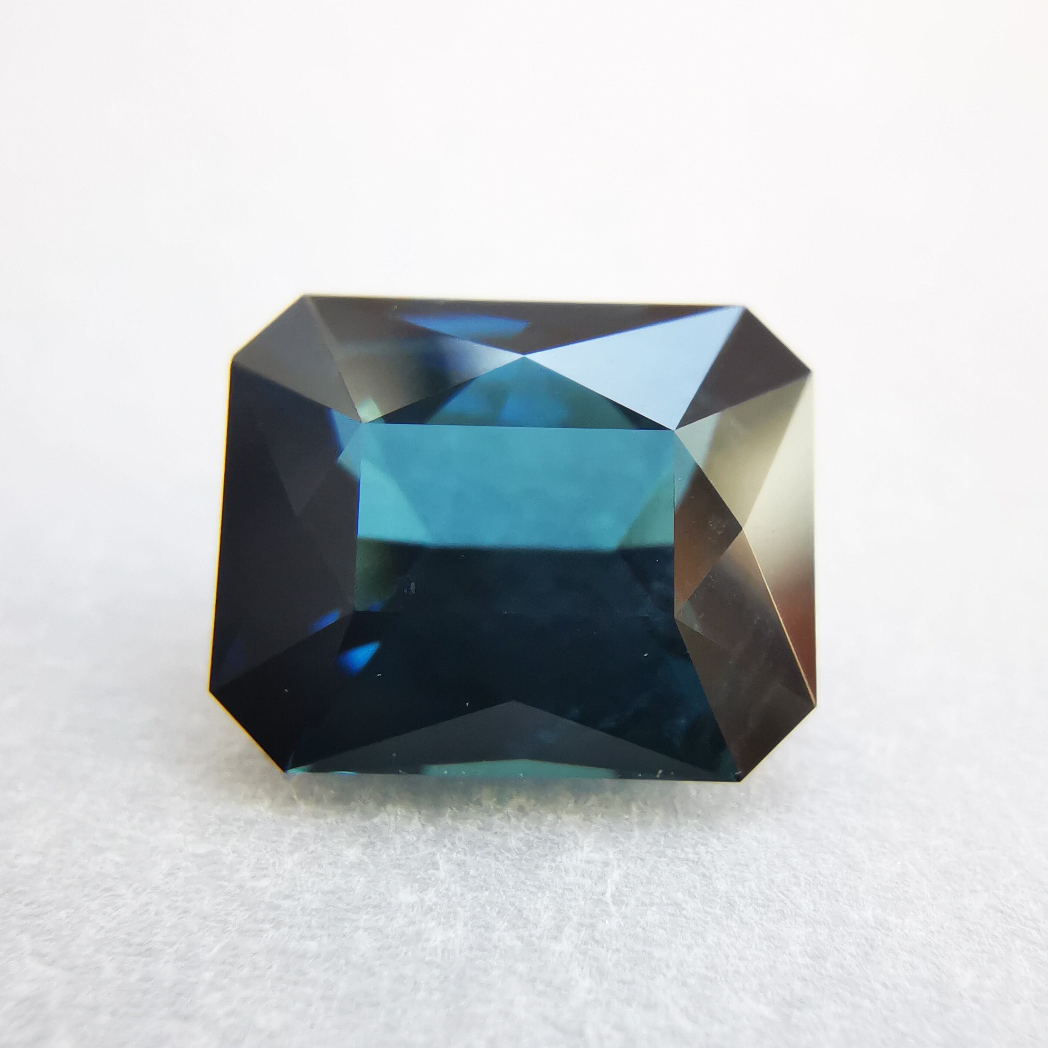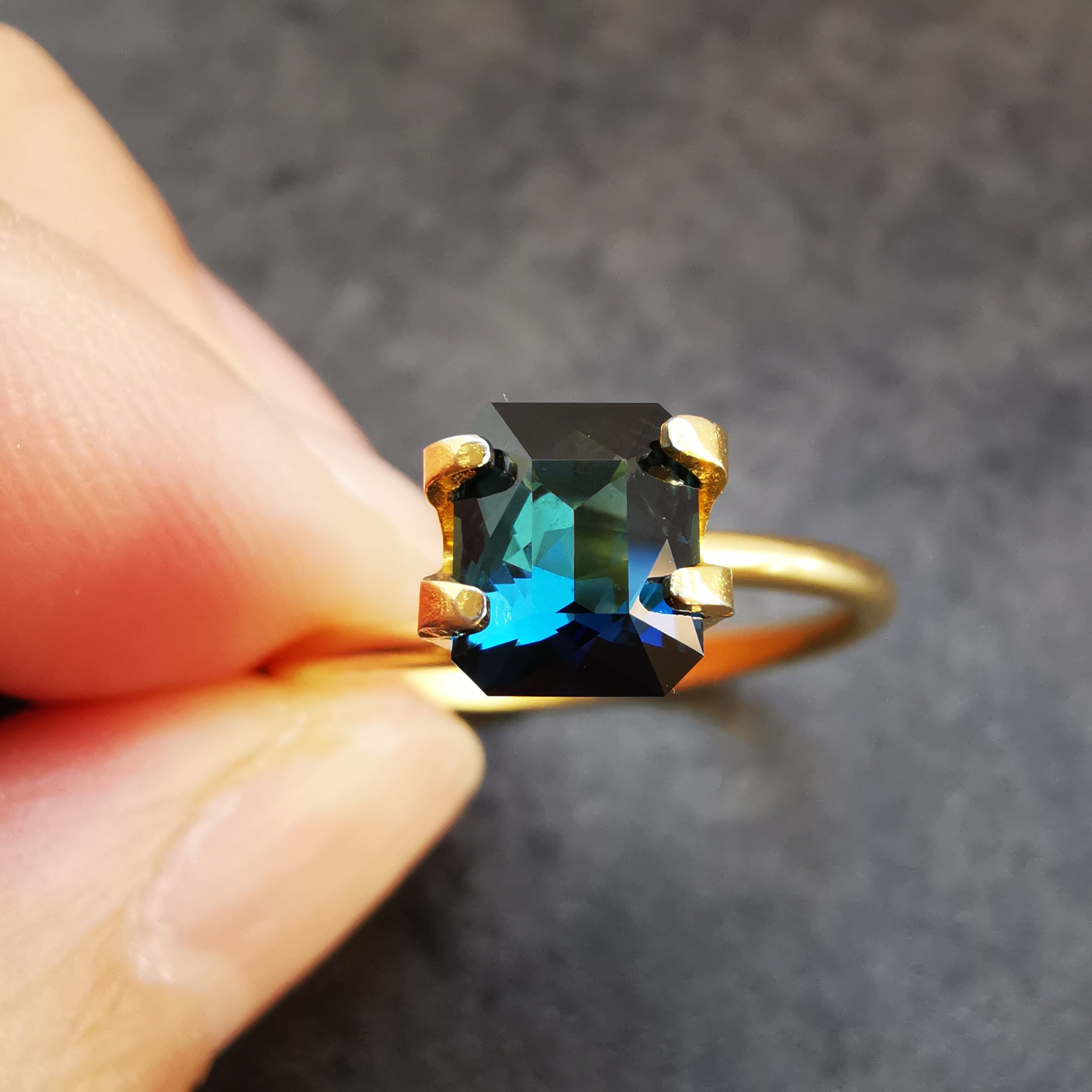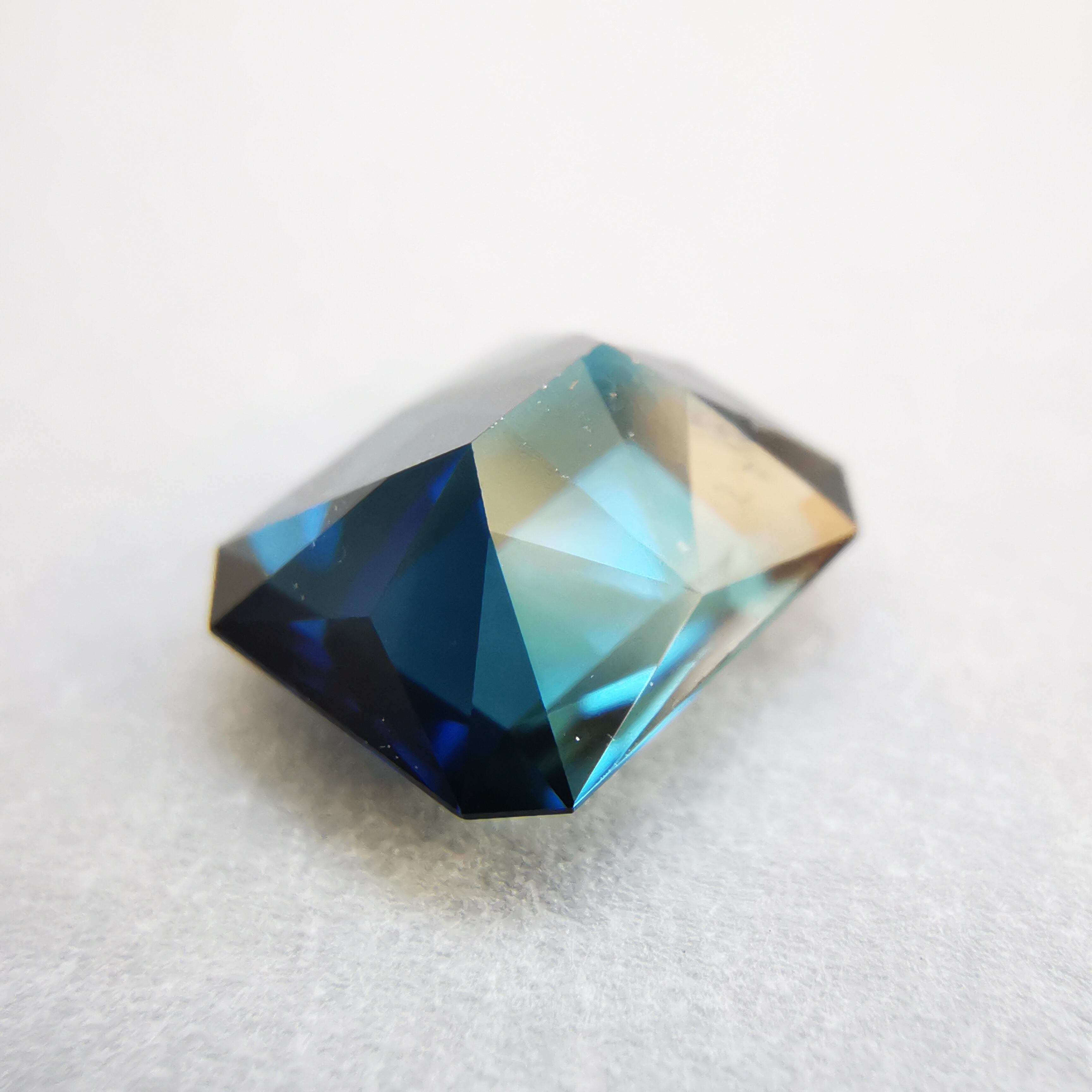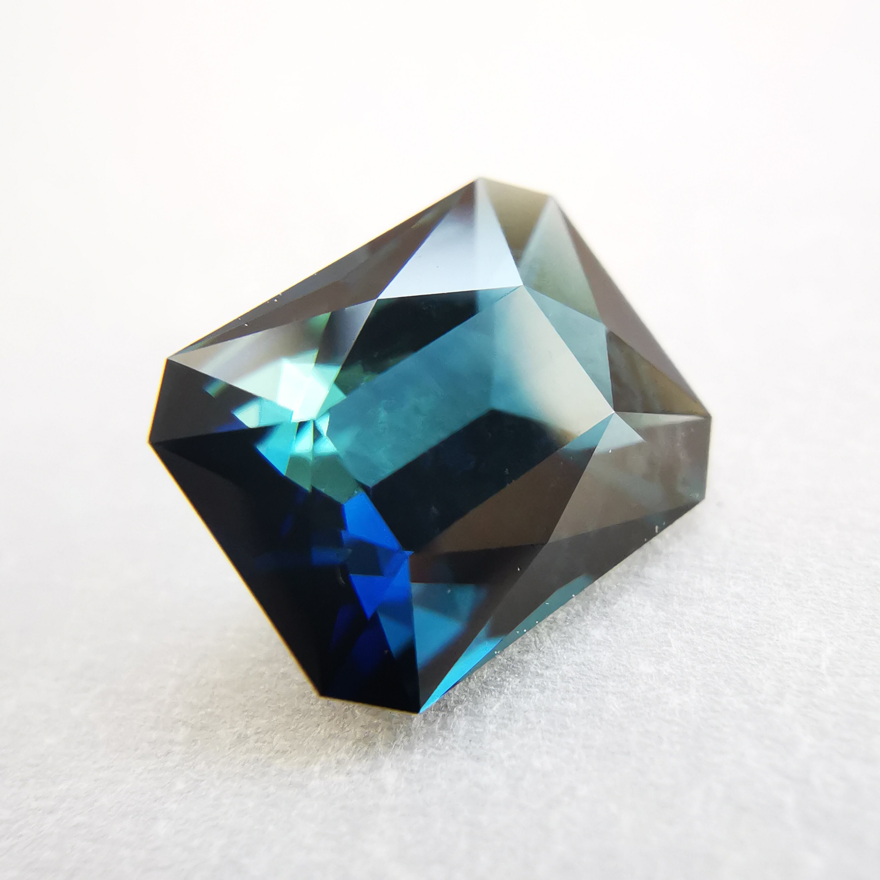 正面からはダークなインディゴブルー、傾けると暗い中に鮮やかなブルーと明るいブルーグリーンがチラチラときらめきだします。