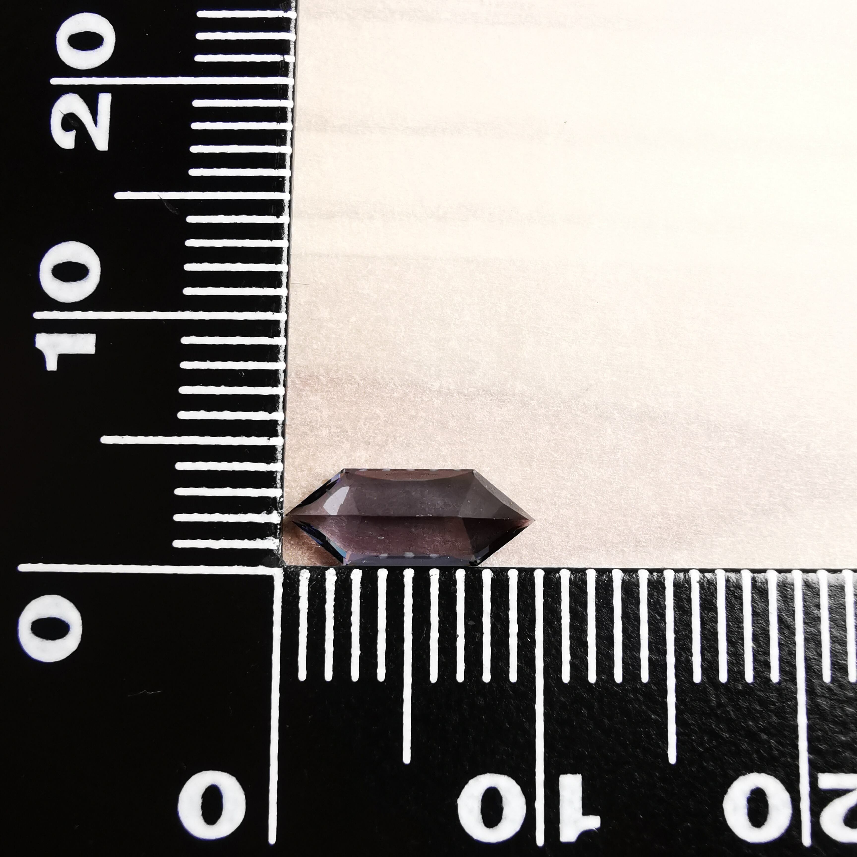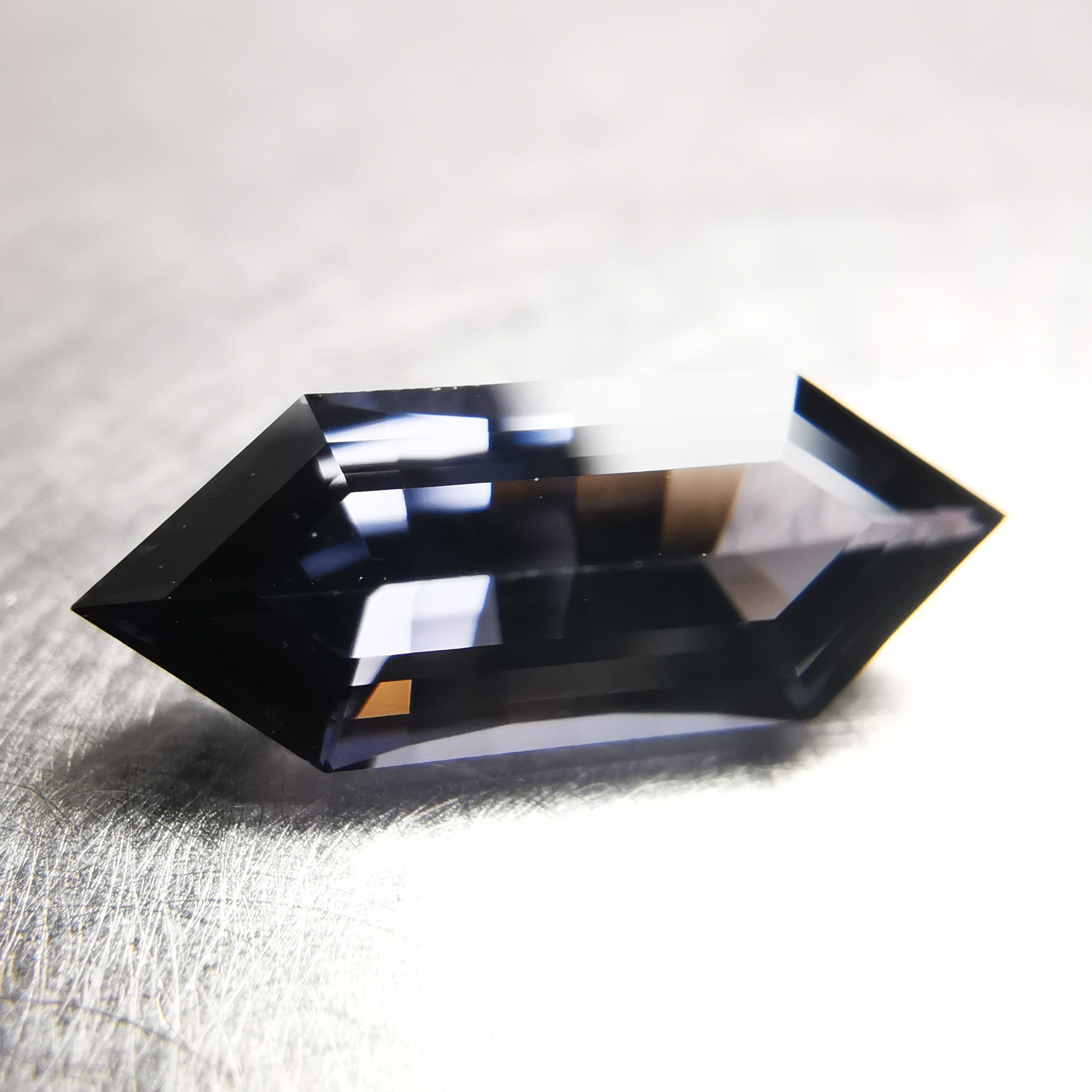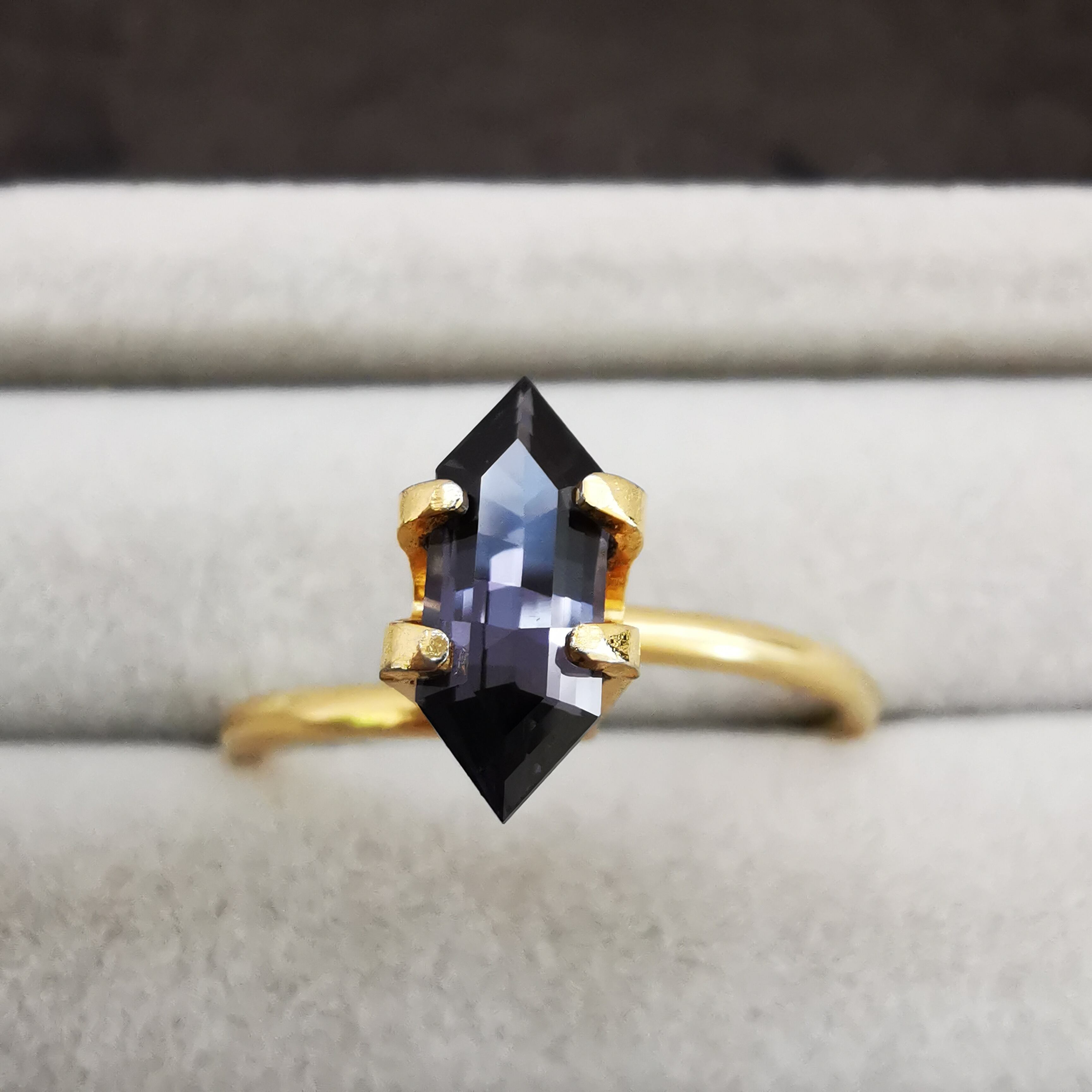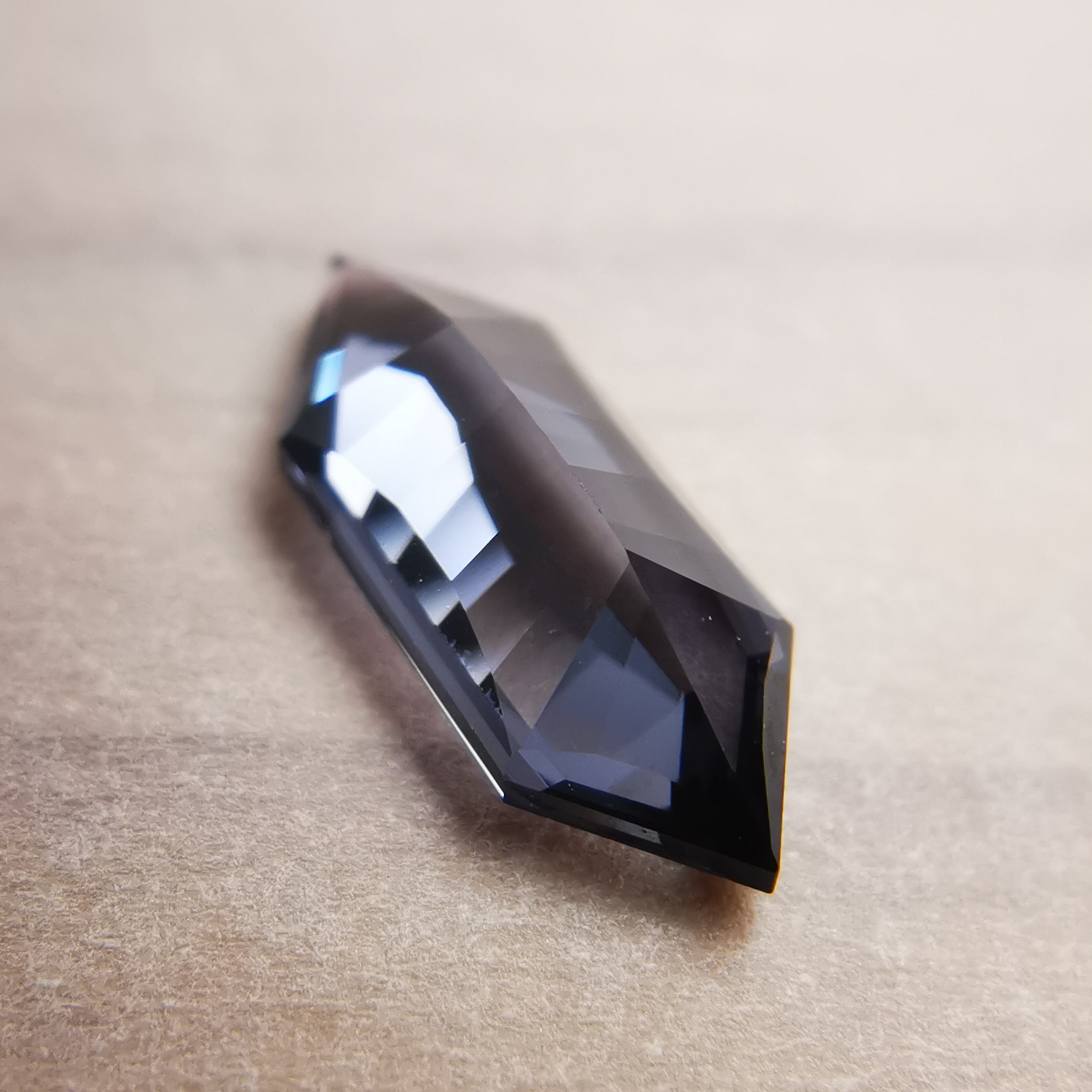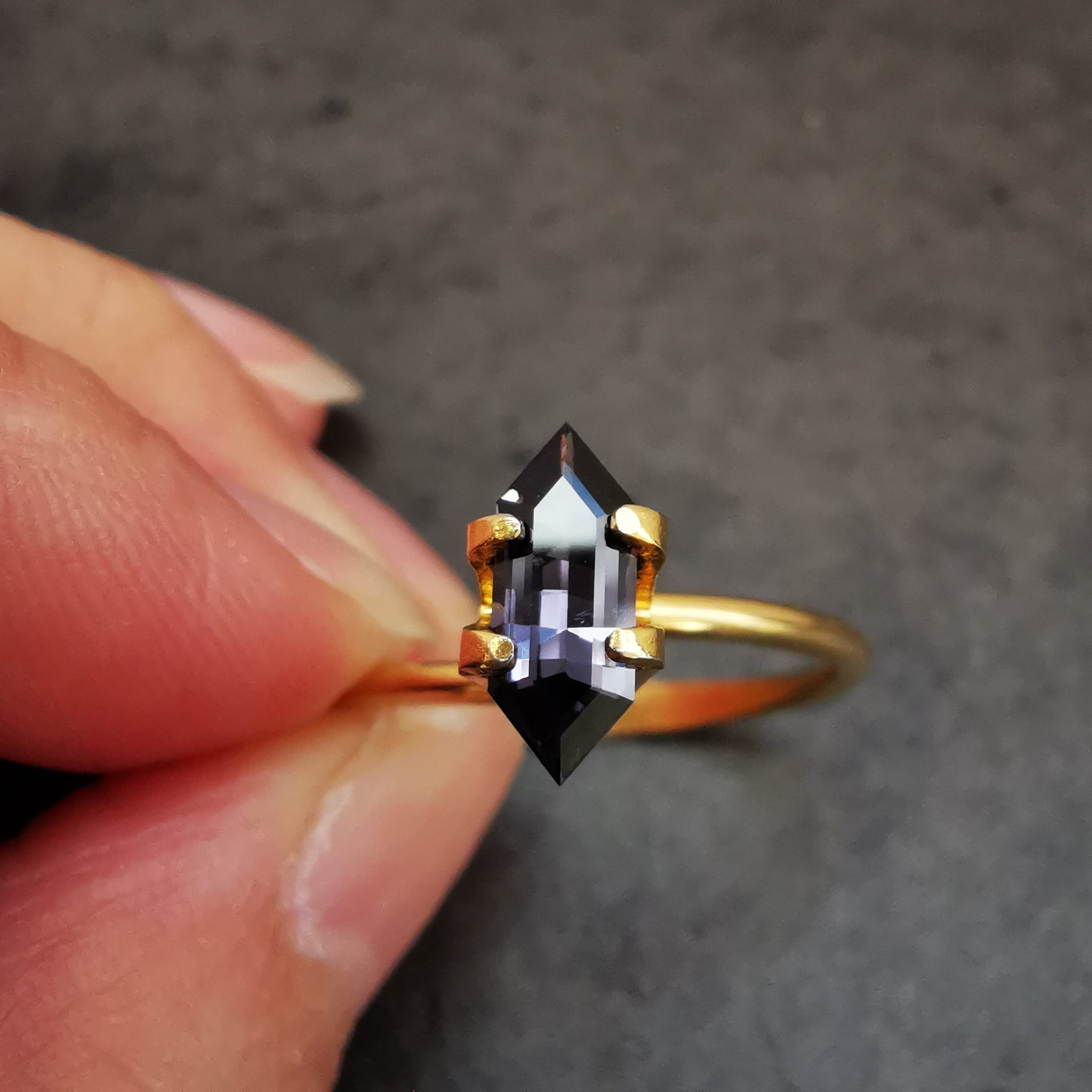 黒に近いダークなグレーの中から、淡いパープルグレーのきらめきが冴える、スピネルらしいカラーの一石です。