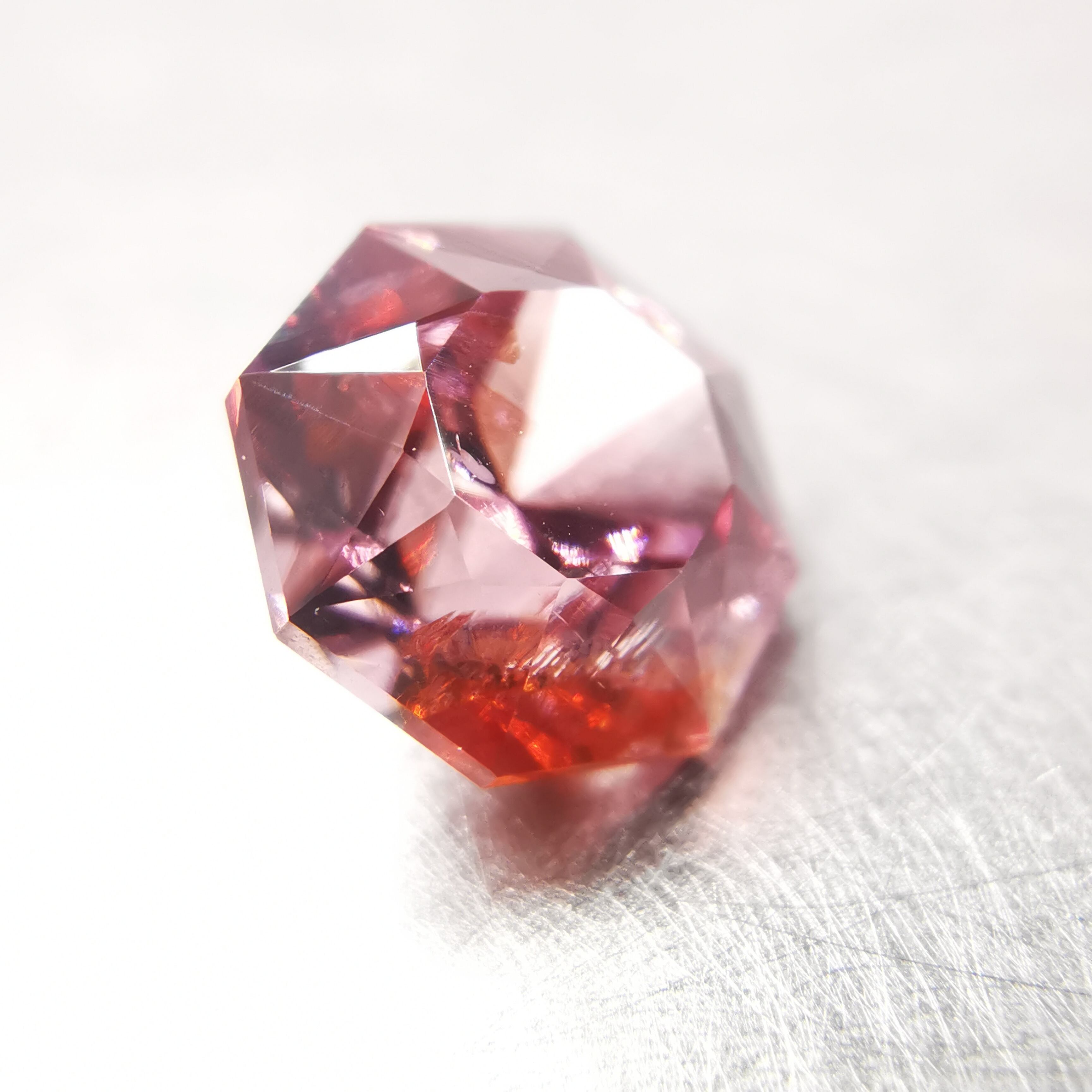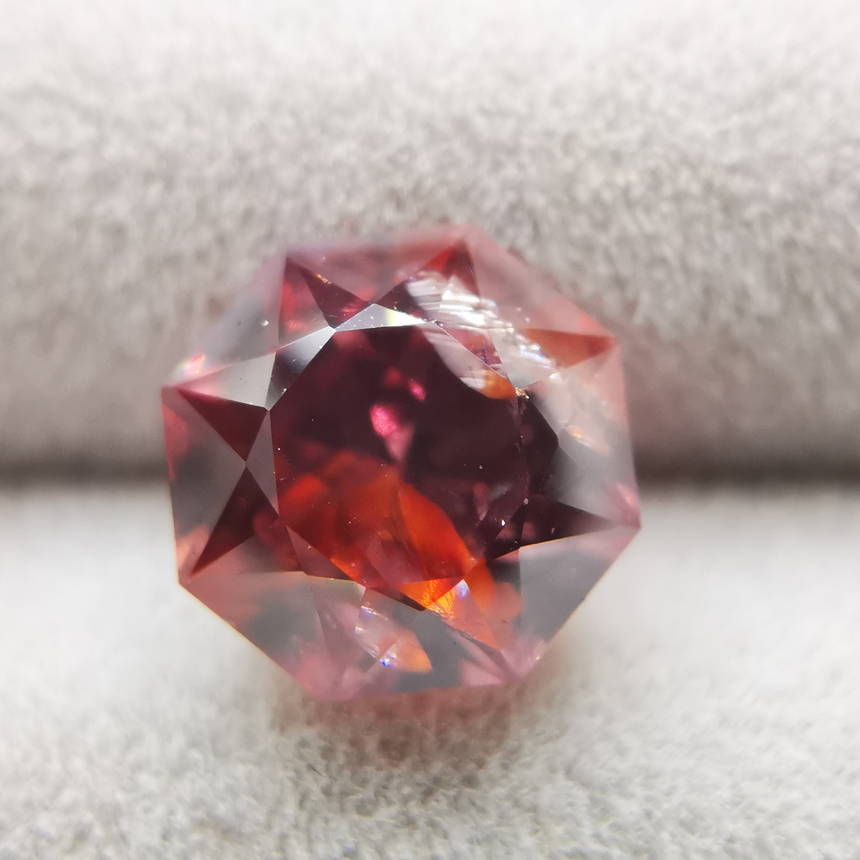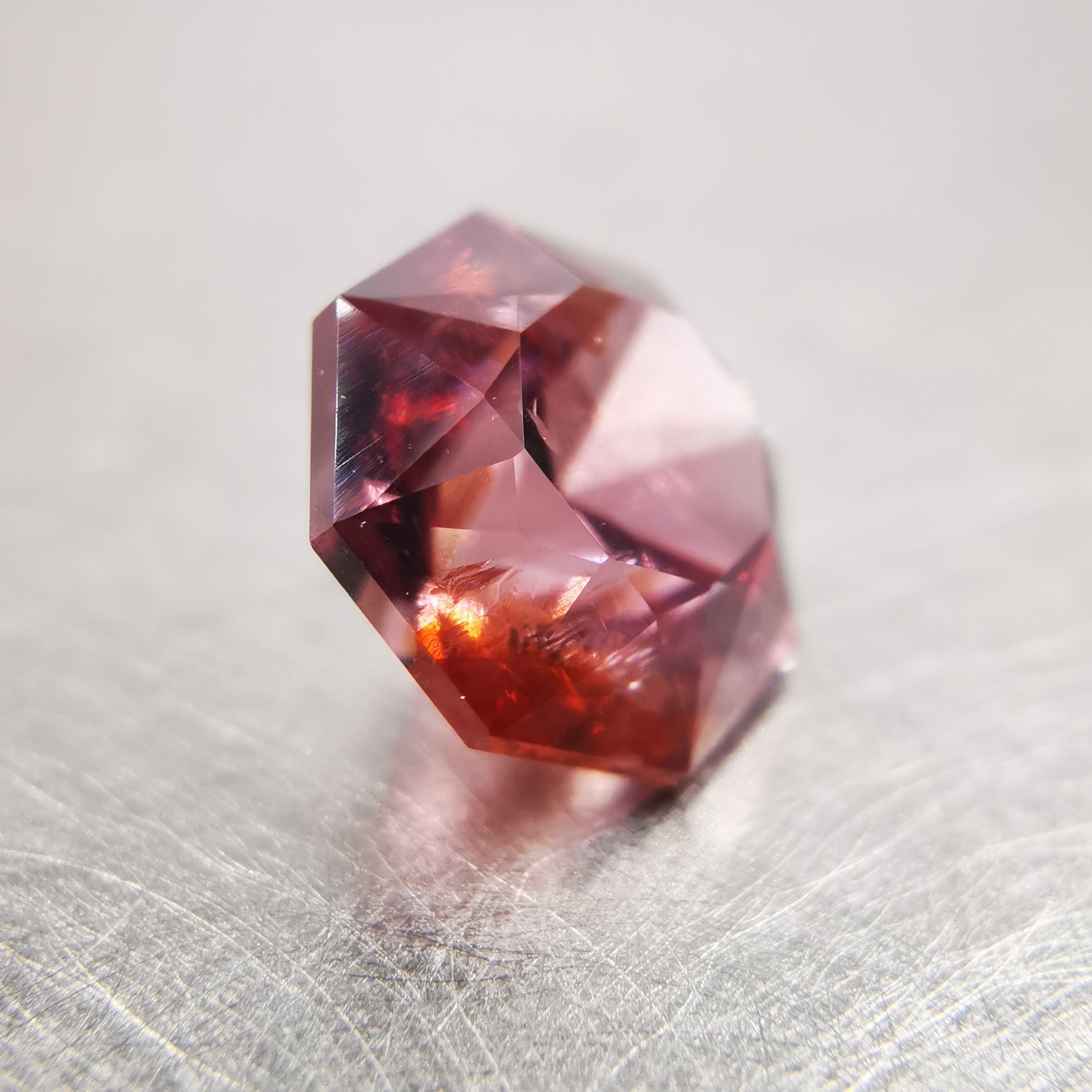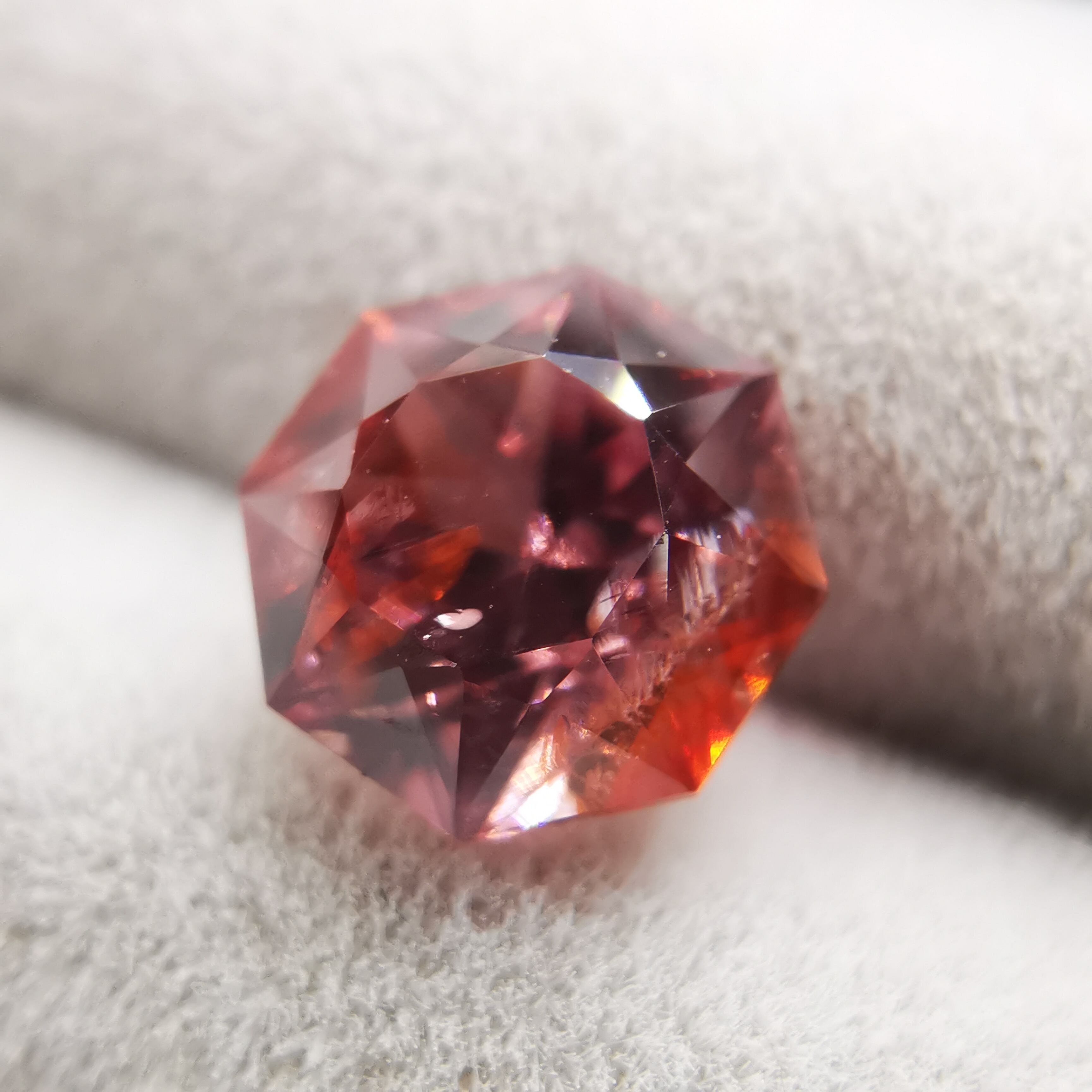 ピックレッドのジルコンの中から、オレンジ色のインクルージョンが鮮やかにきらめく印象的な一石です。